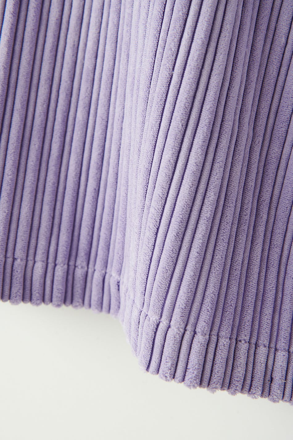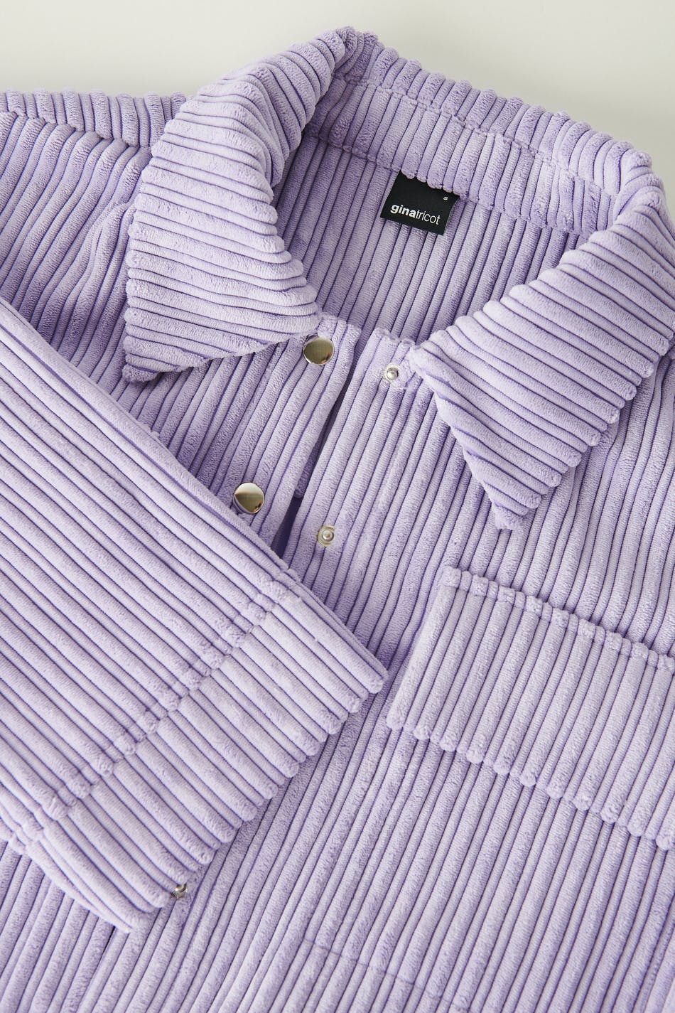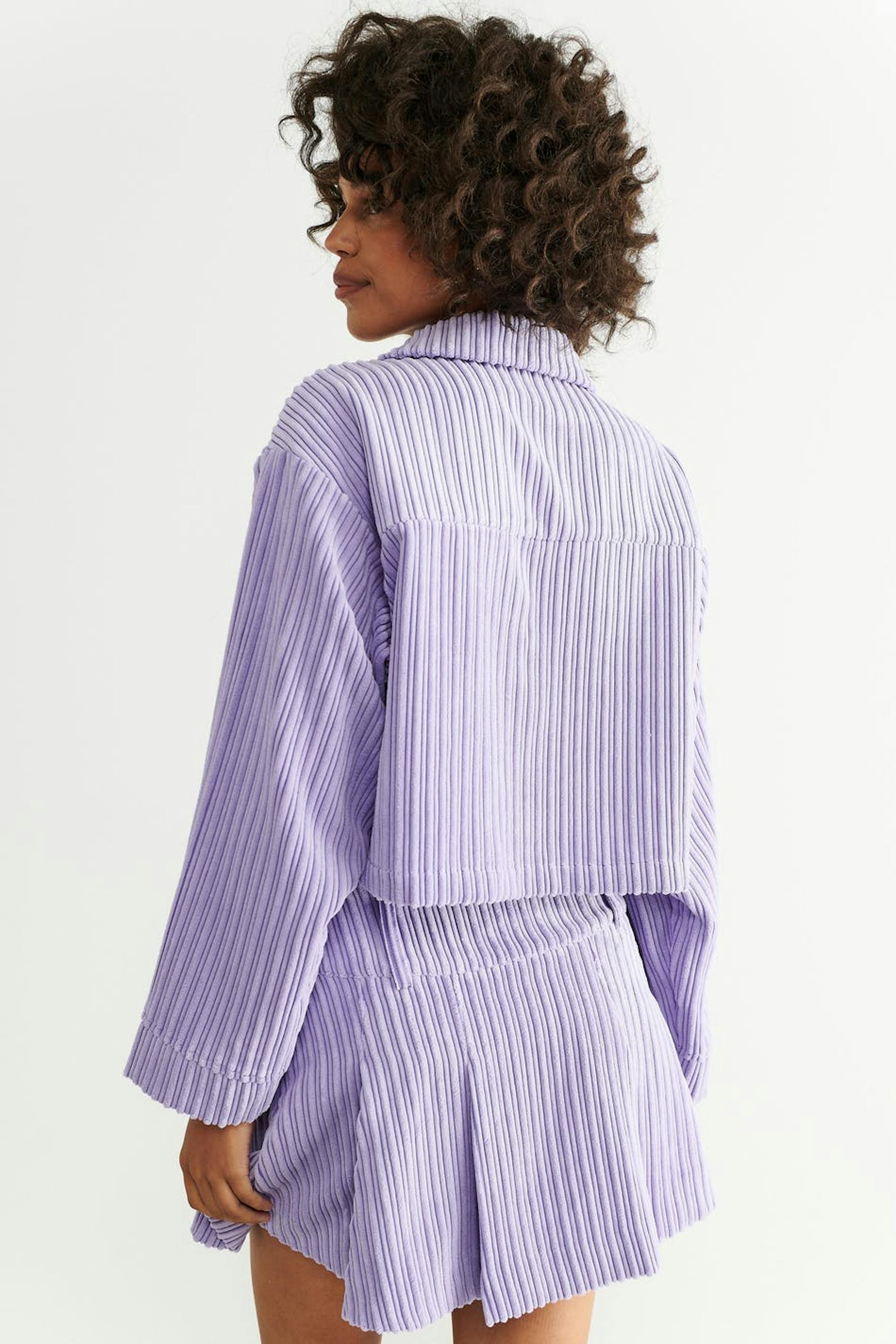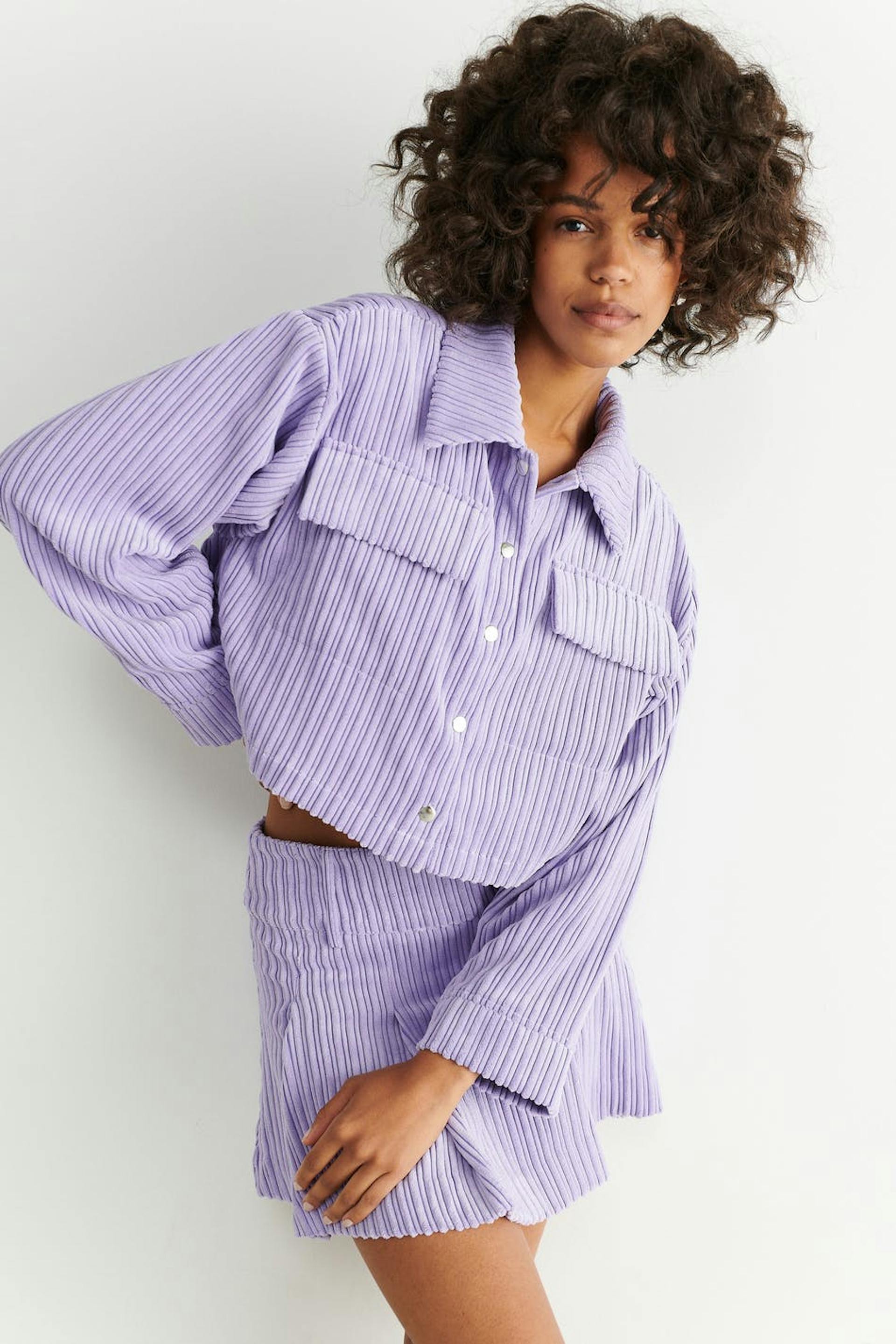 Cropped corduroy shirt with an oversize fit. The shirt is purple and has button placket in front. It has collar and flap pockets at the front.