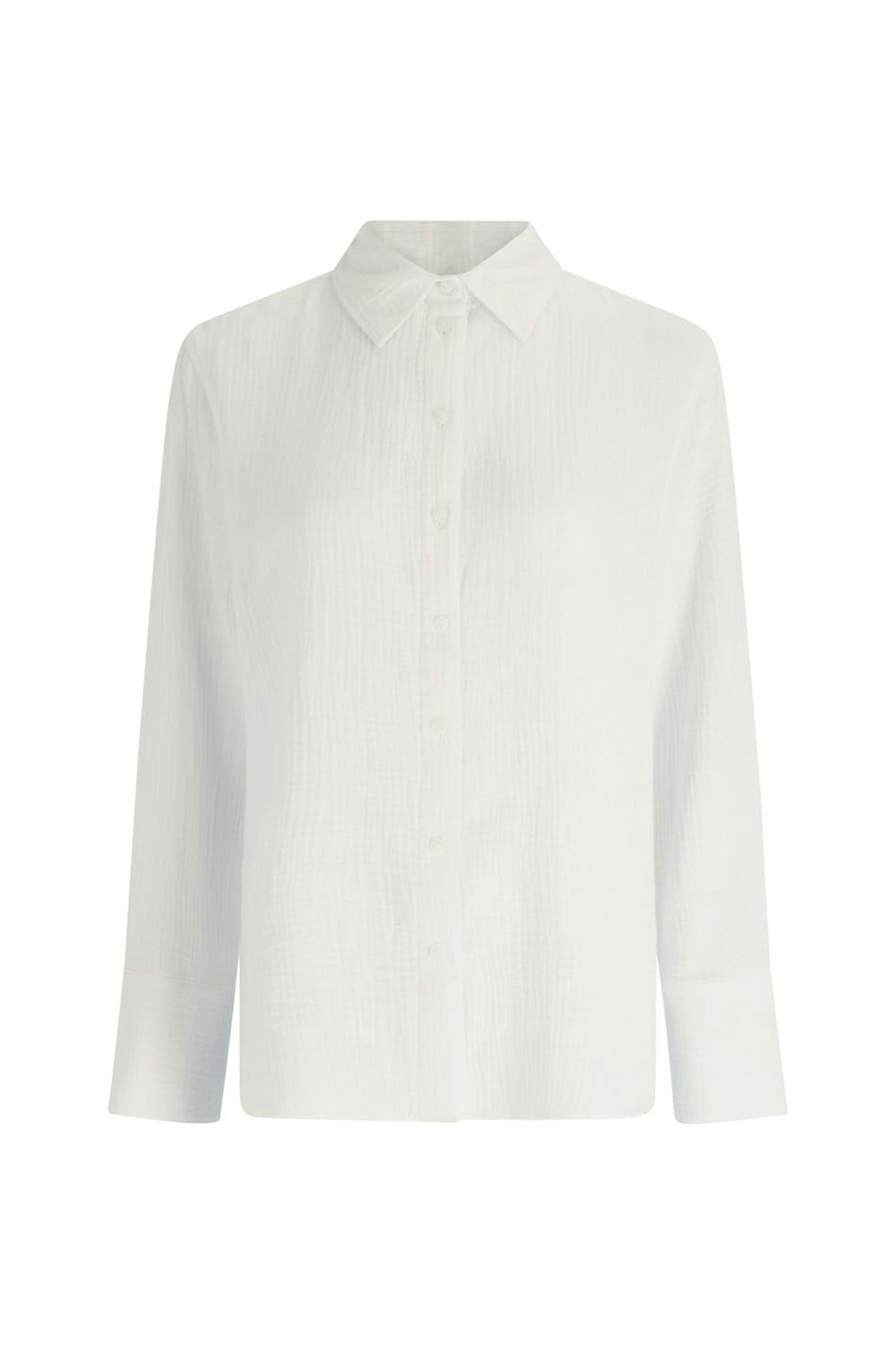 Shirt in cotton with button placket in front. The shirt is white and has a structured material. It has collar and long sleeve with button and cuff.