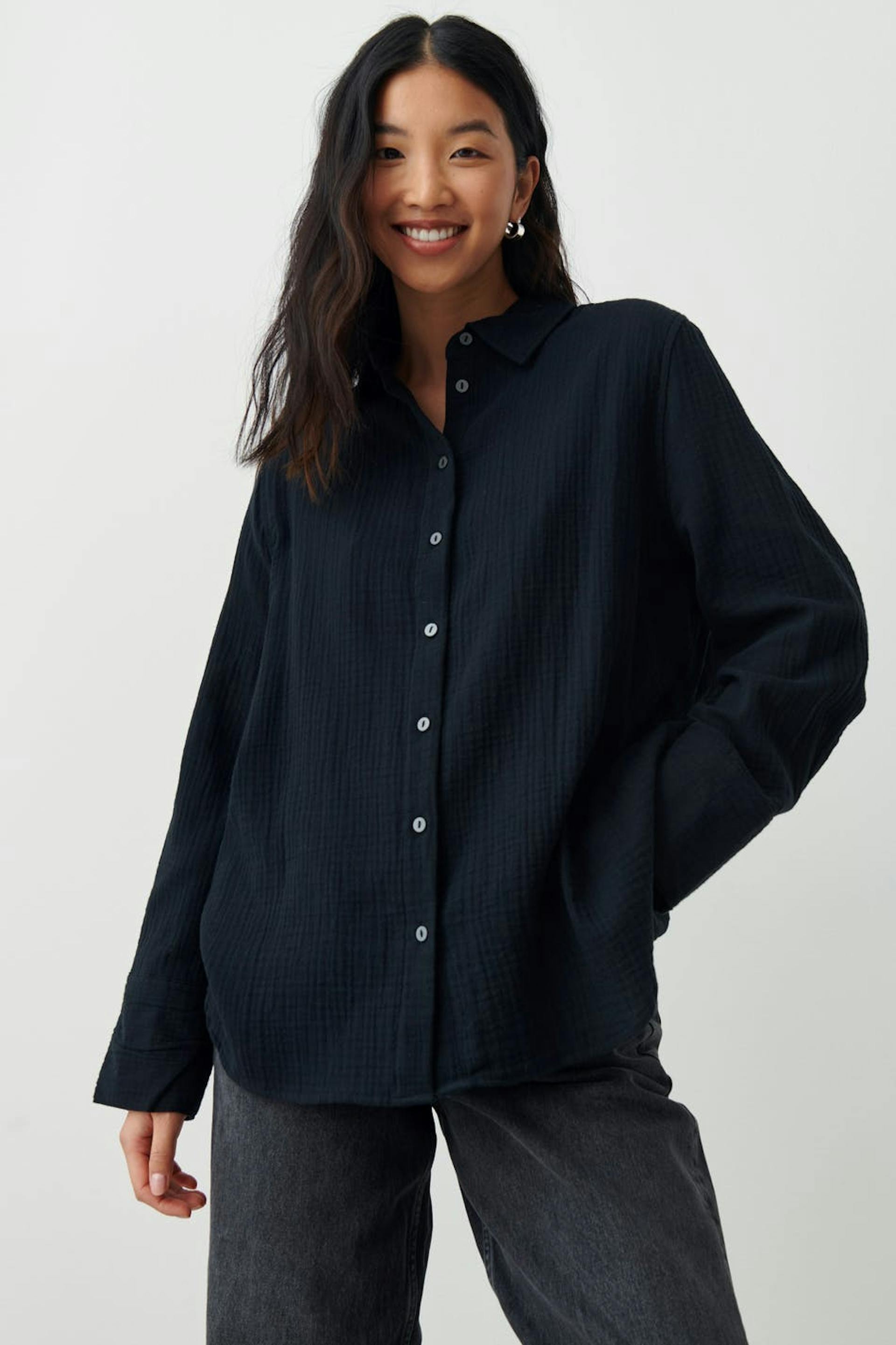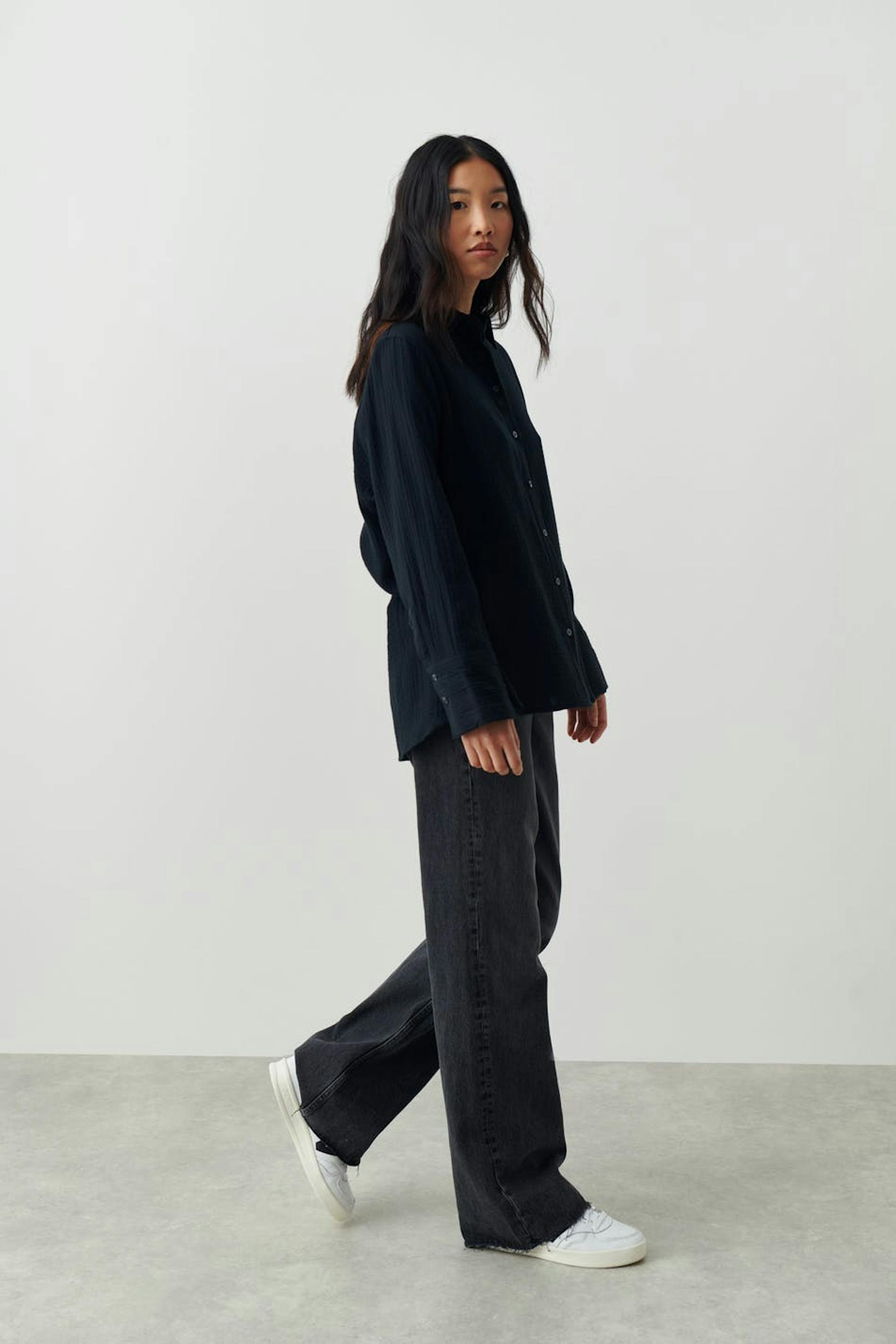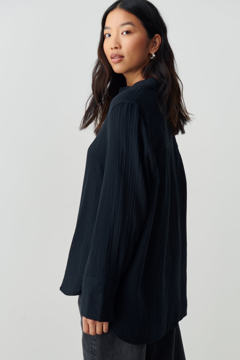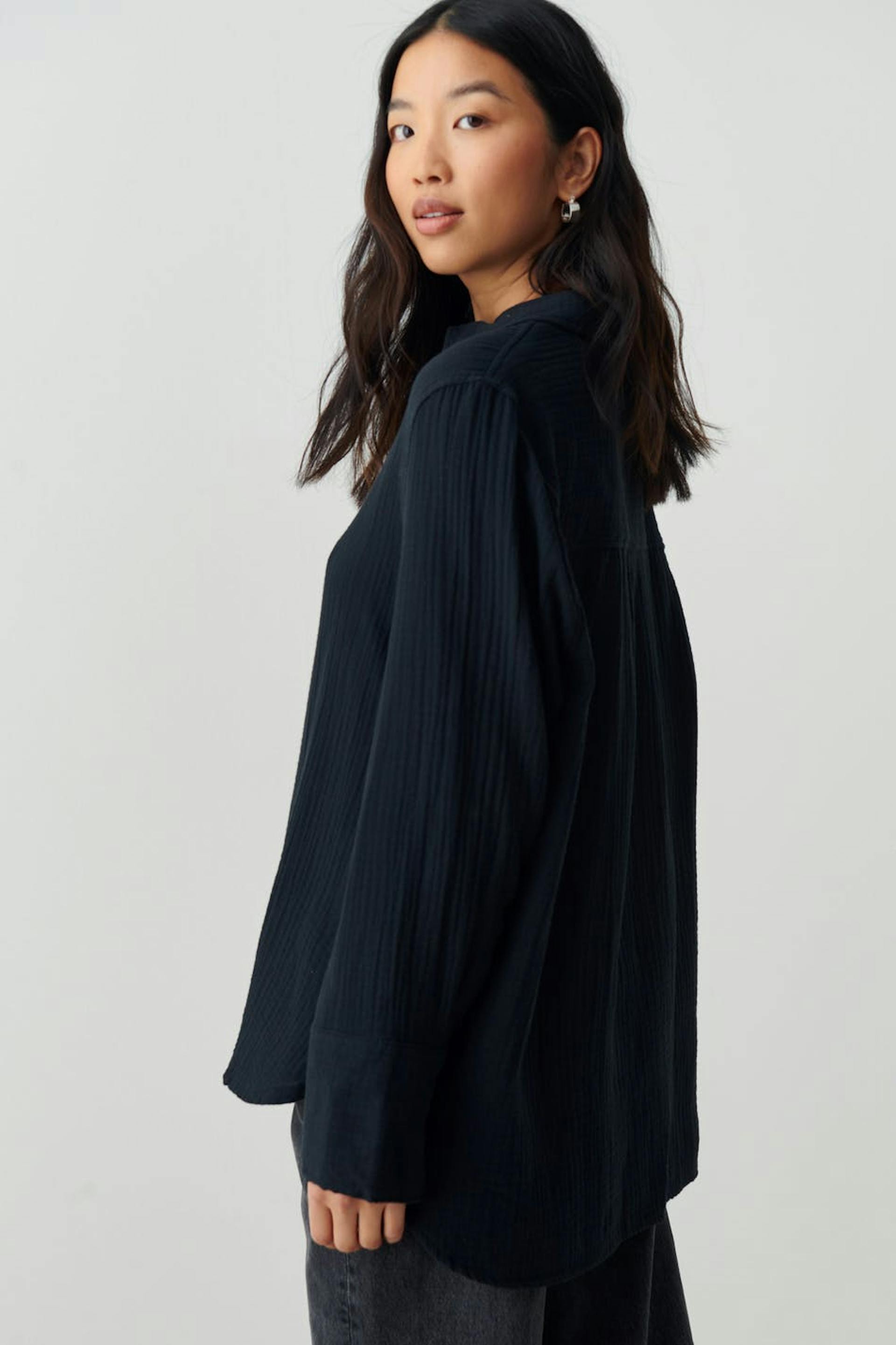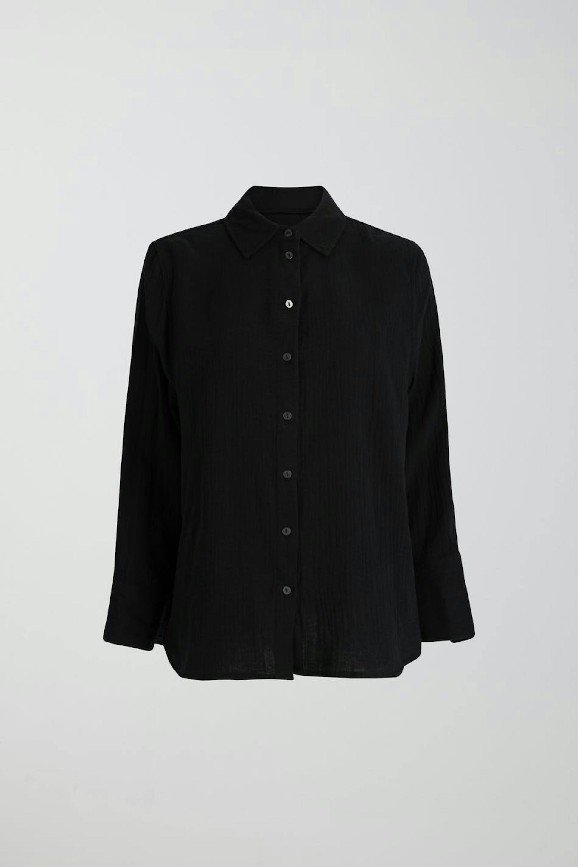 Shirt in cotton with button placket in front. The shirt is black and has a structured material. It has collar and long sleeve with button and cuff.