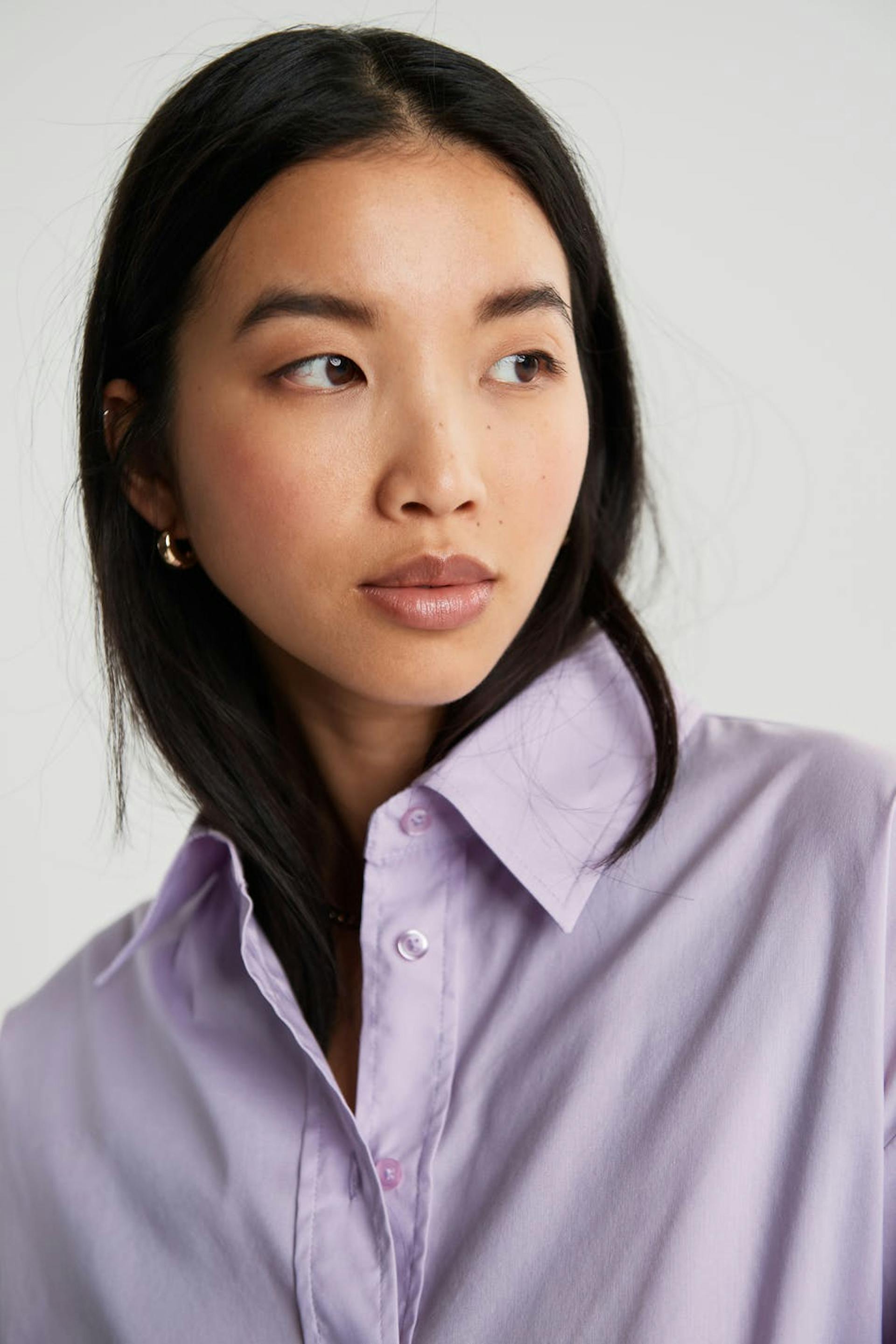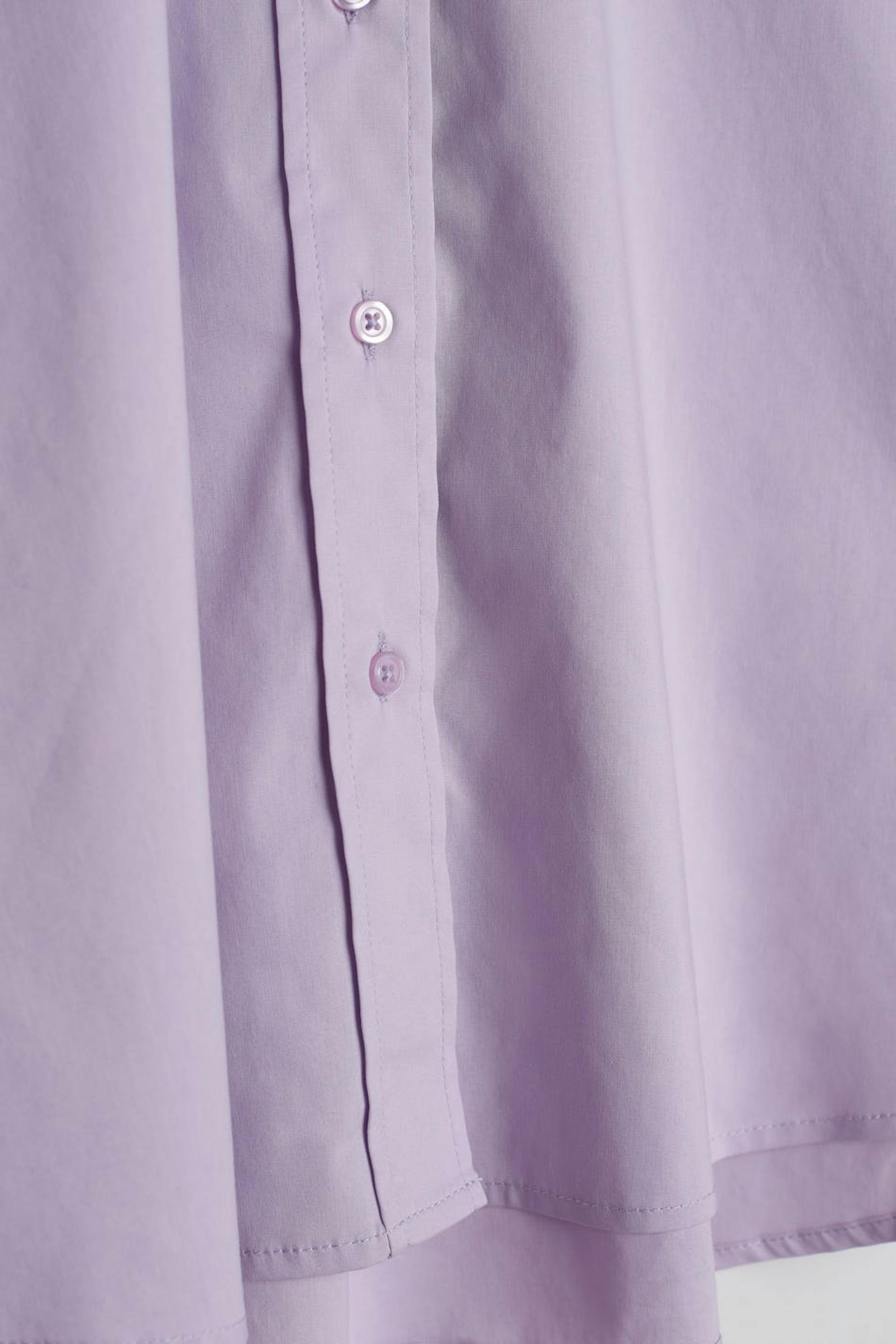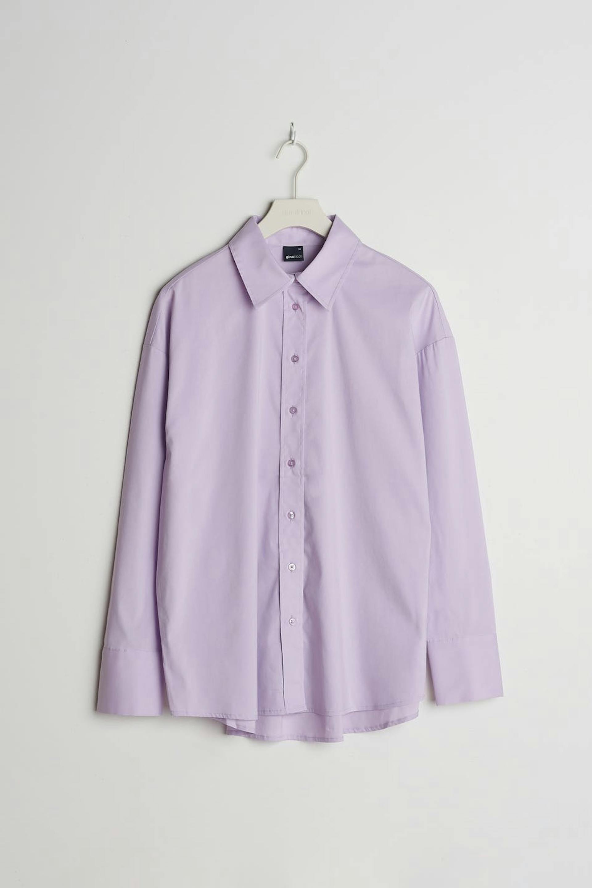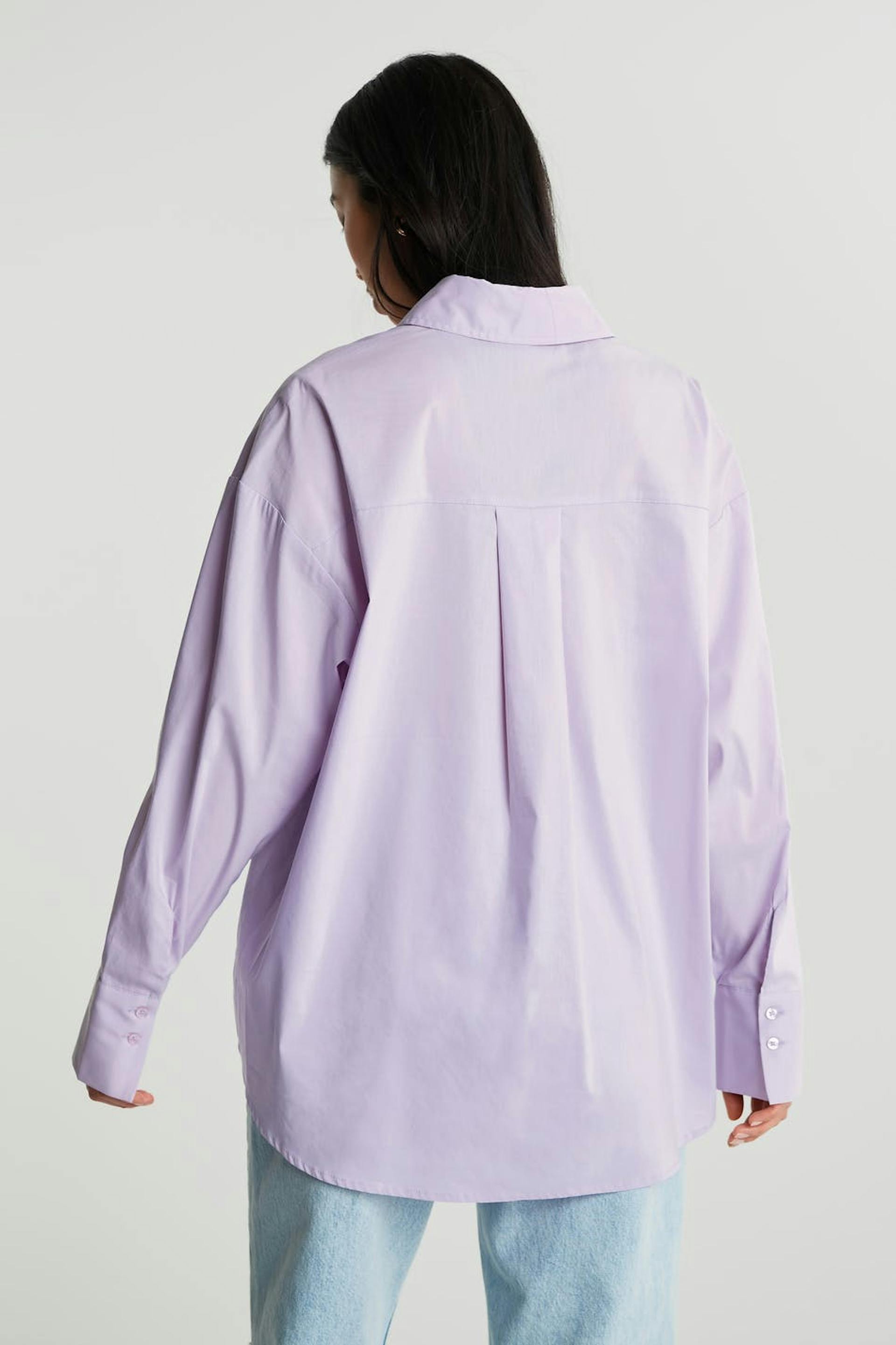Oversize shirt with buttons at the front. The shirt is purple and slightly longer.