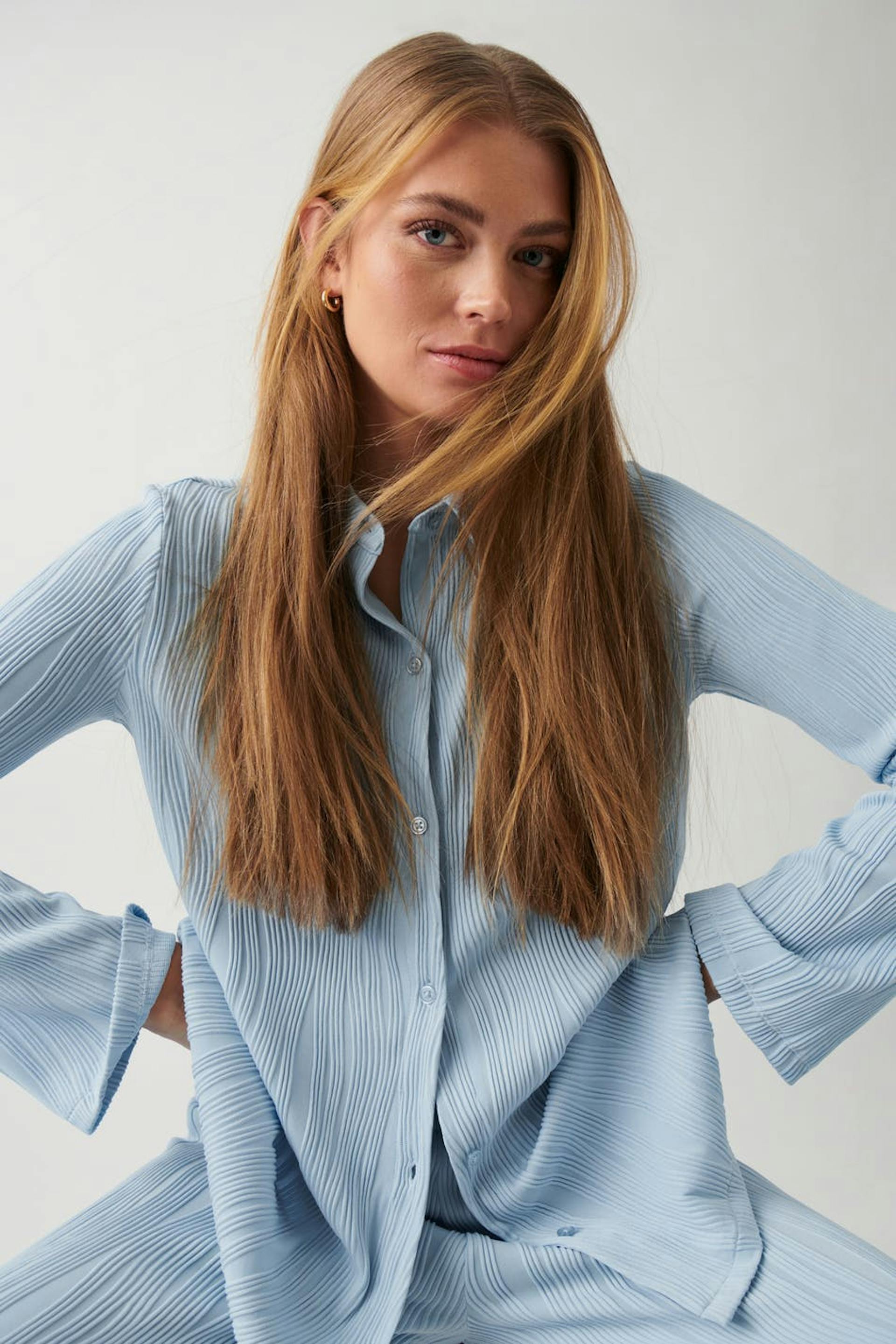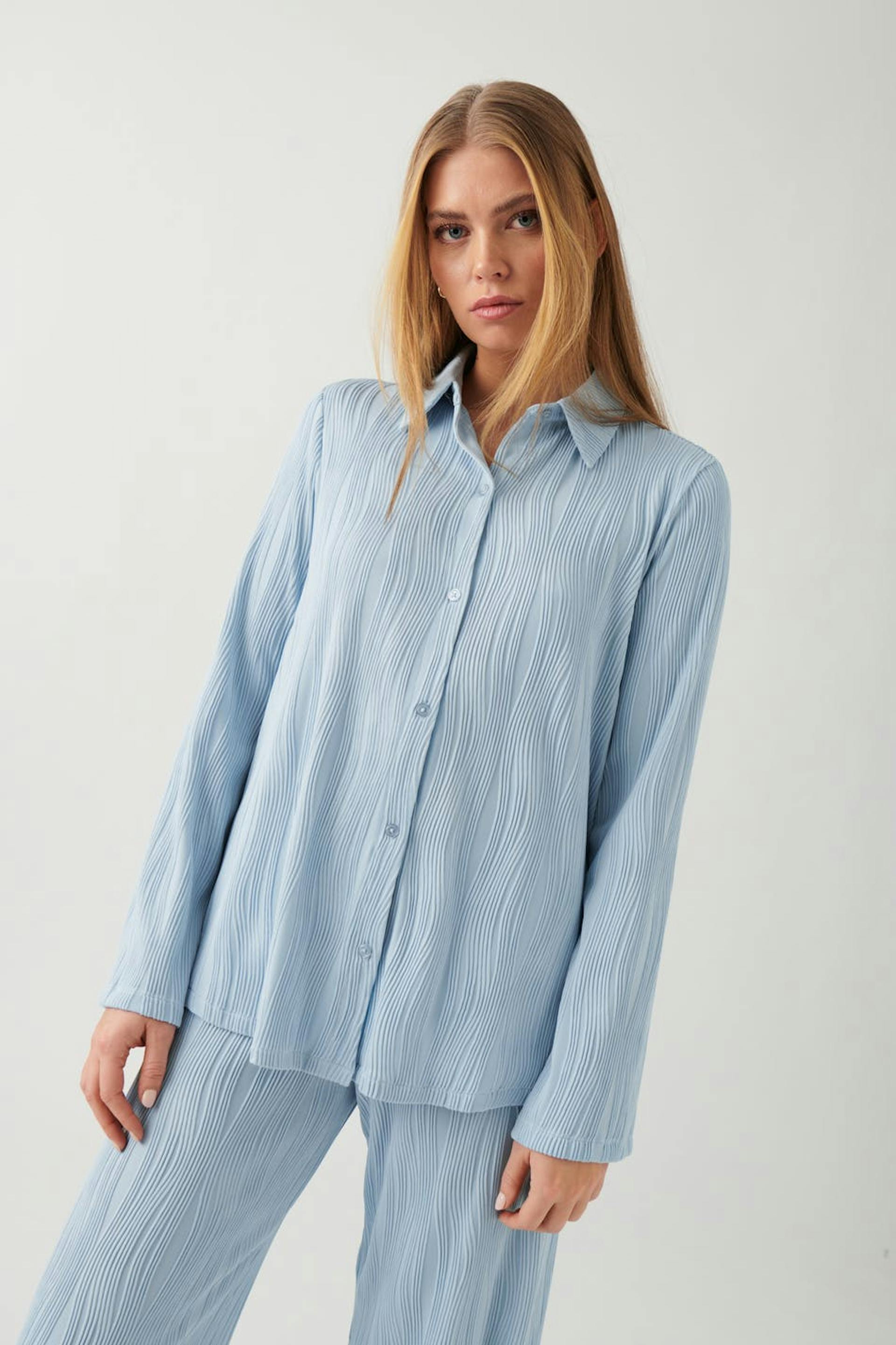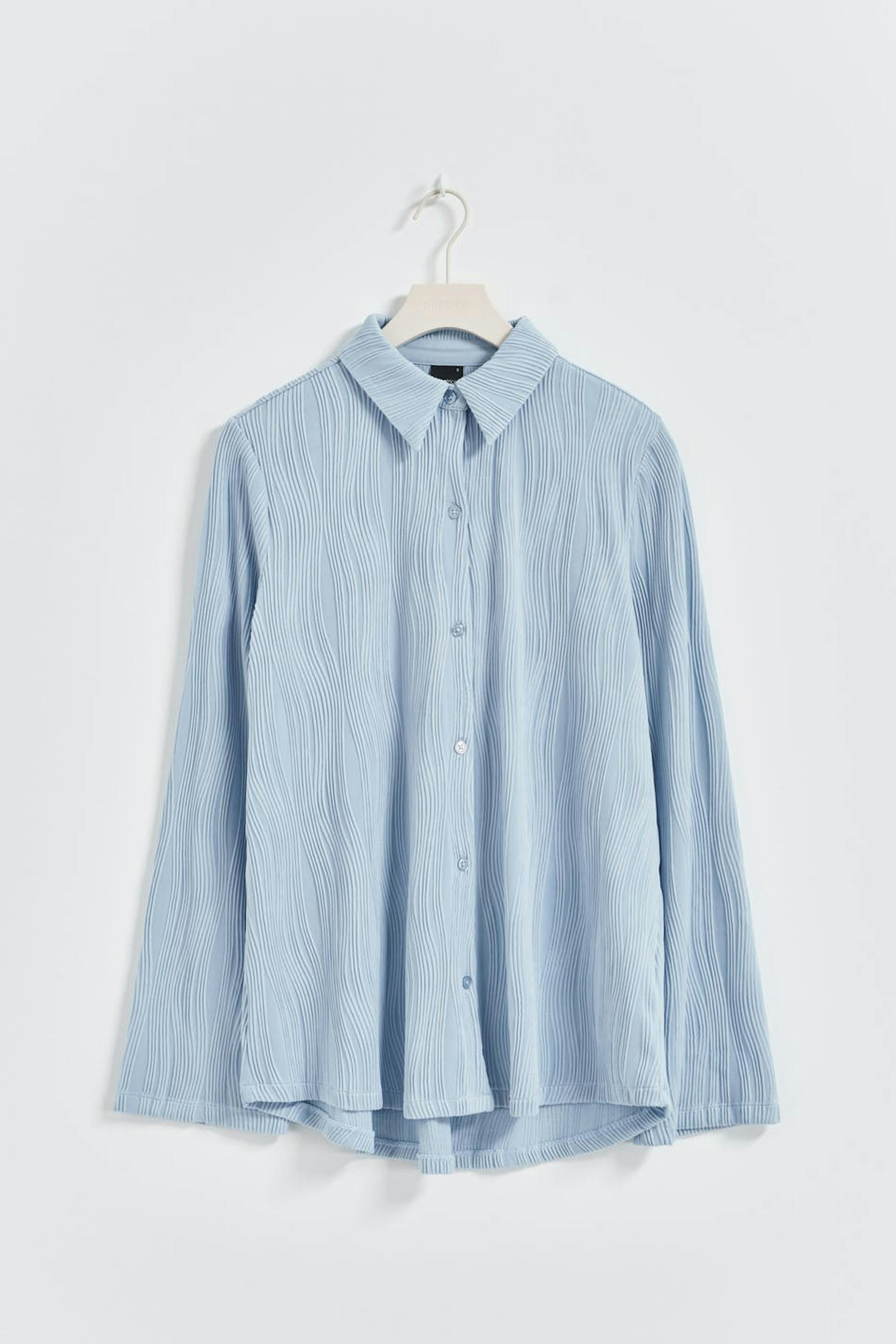Structured shirt with buttoning at the front. The shirt is blue and has long sleeve.