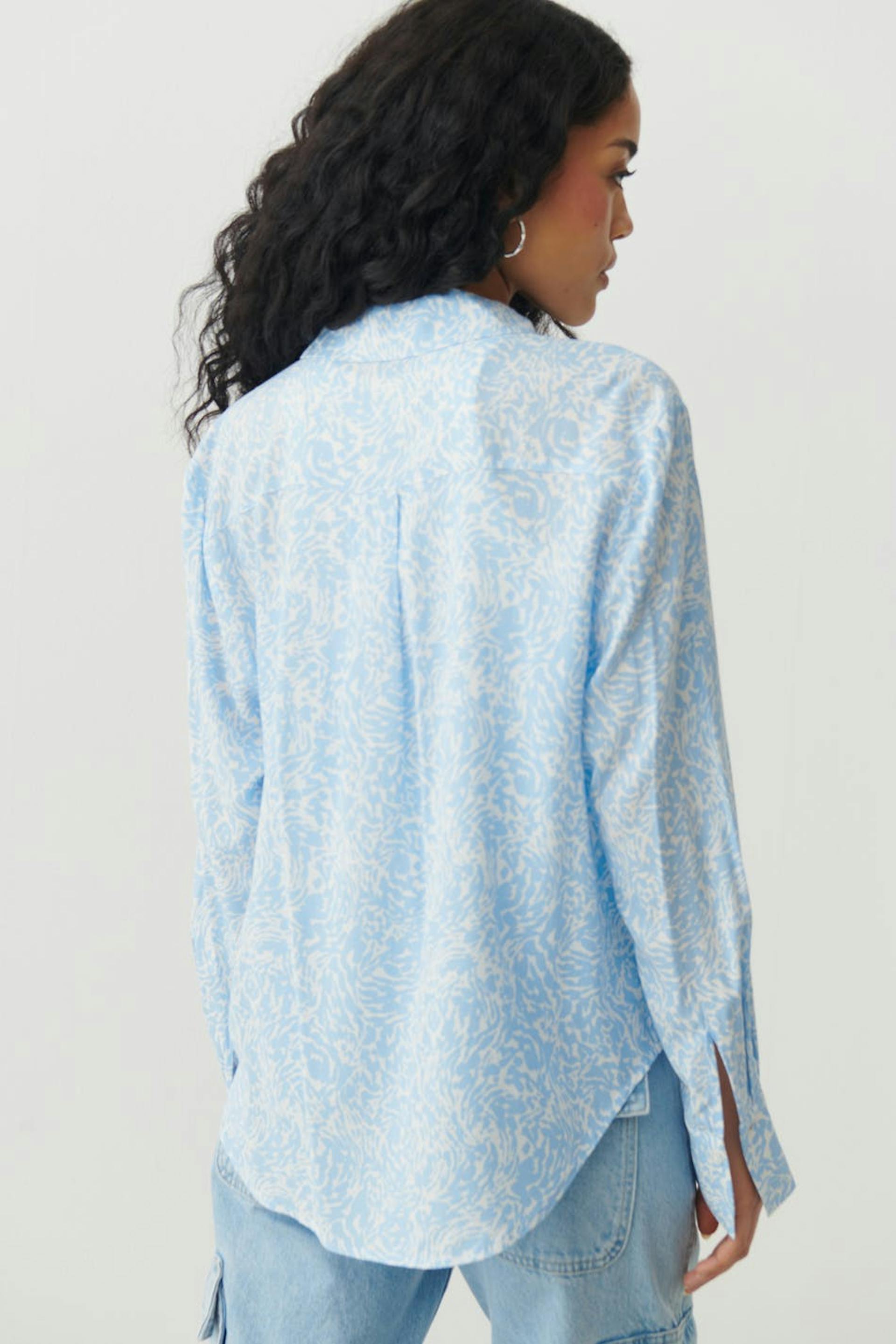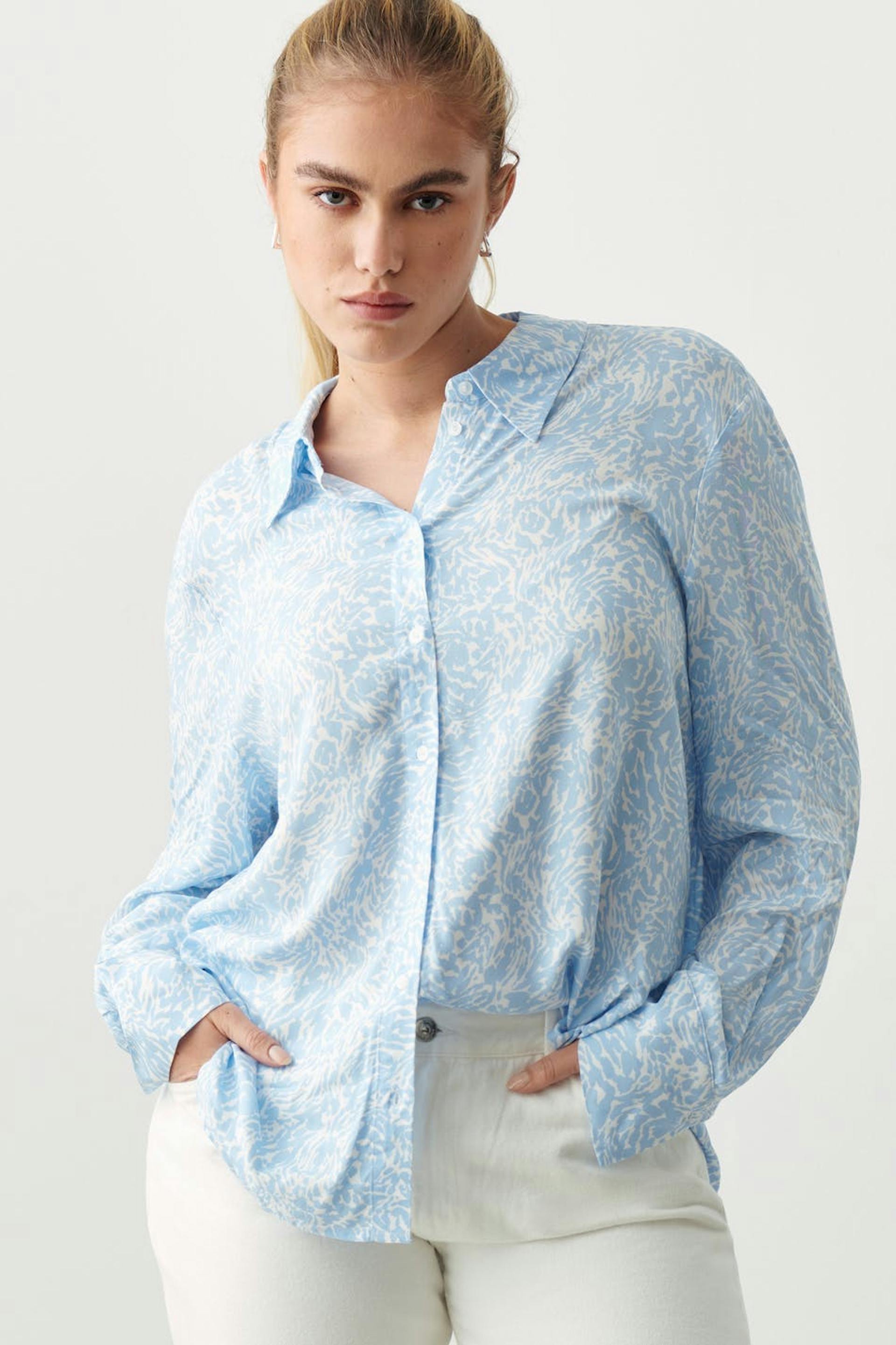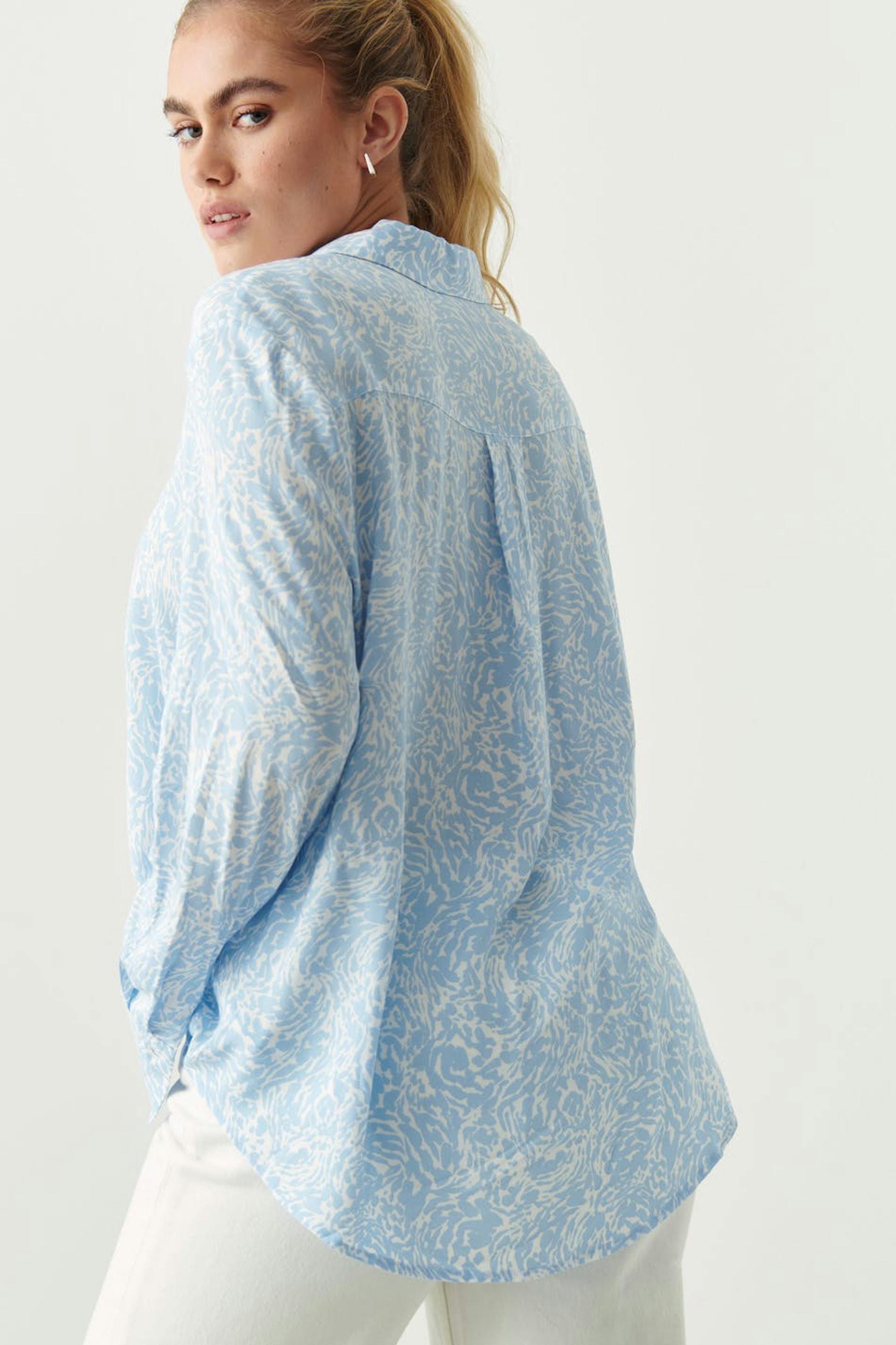 Patterned shirt with button placket in front. The shirt is blue, white and woven. It has a soft quality, collar, cuffs and slightly longer back piece.