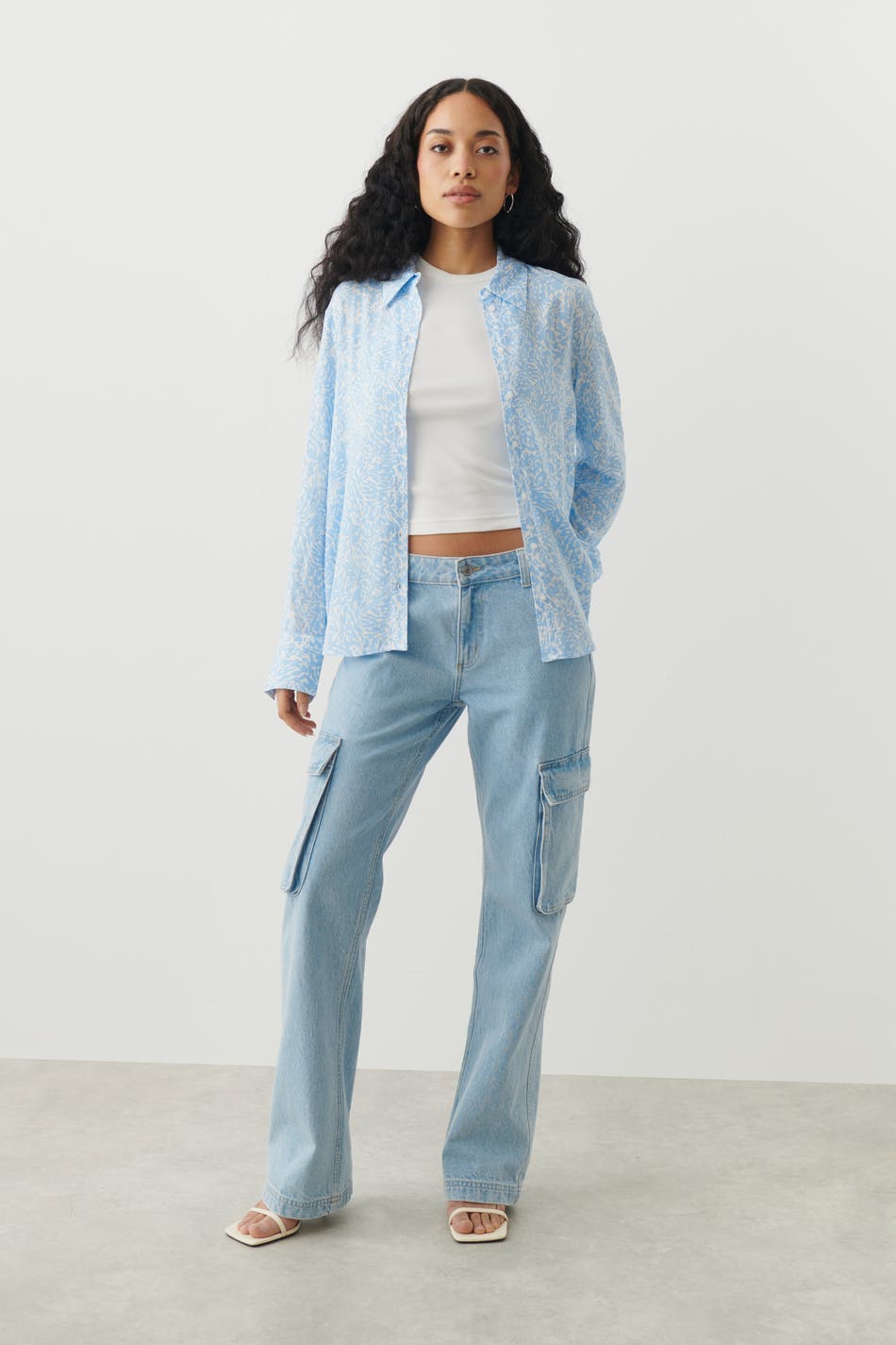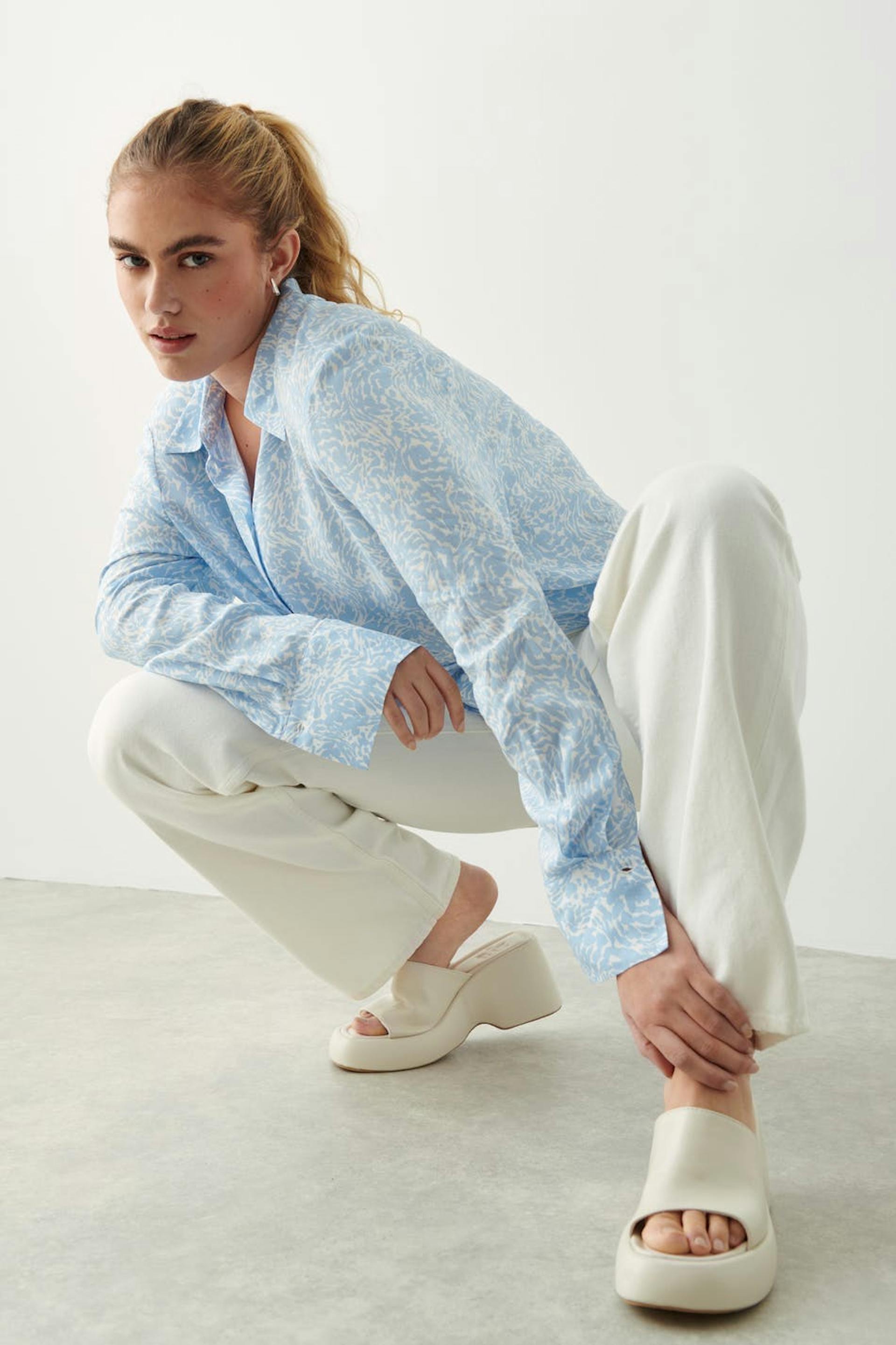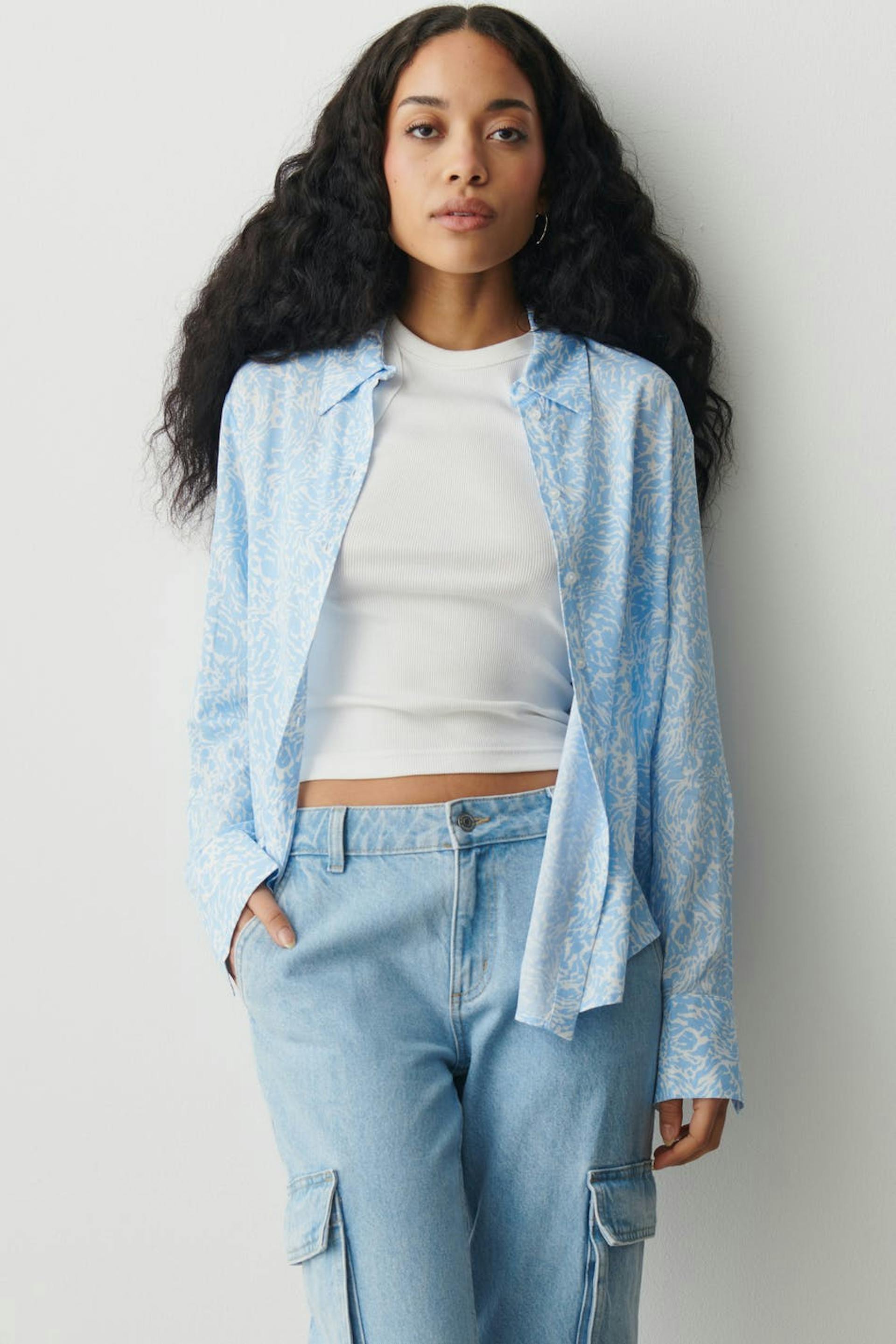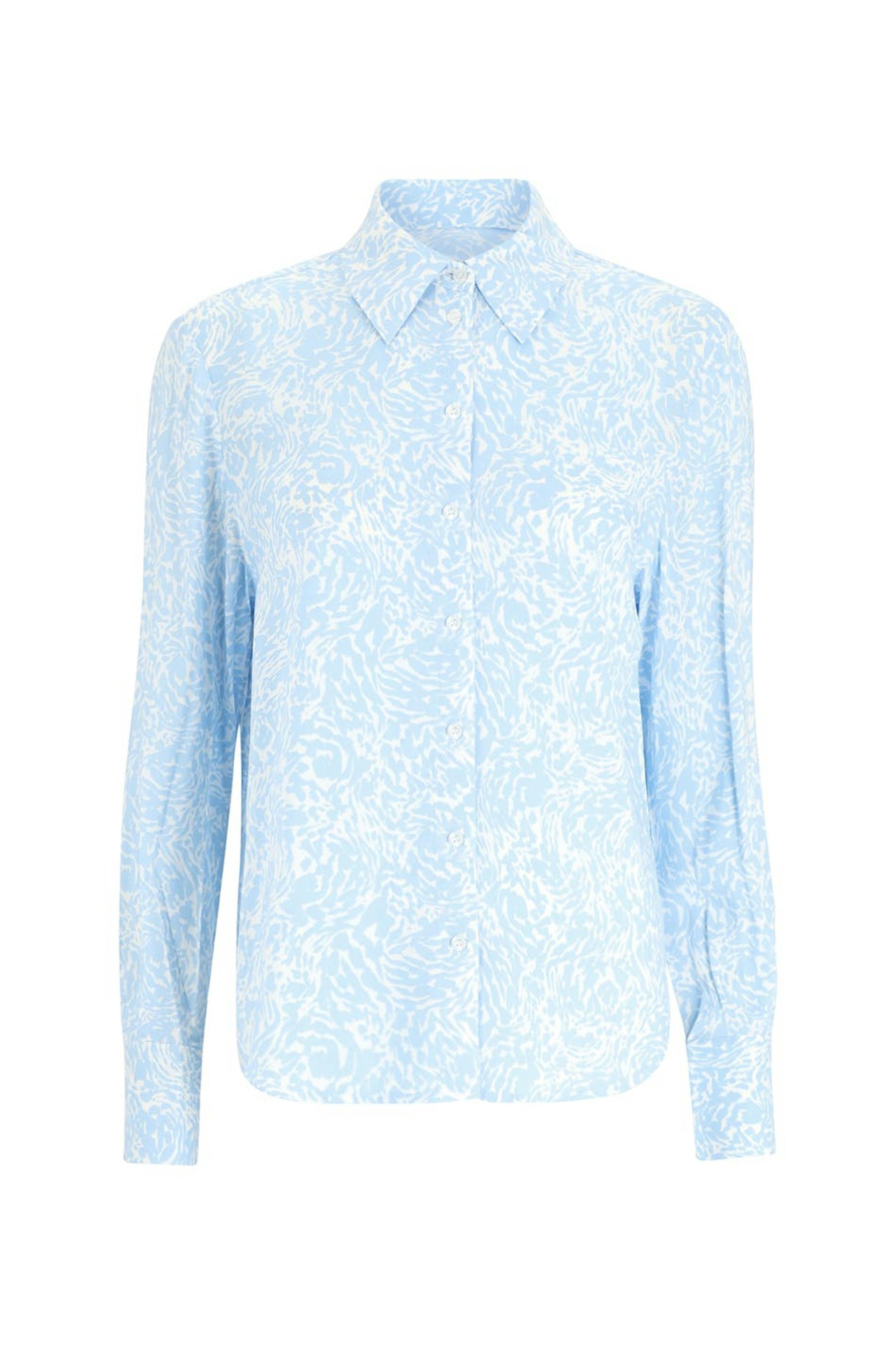 Patterned shirt with button placket in front. The shirt is blue, white and woven. It has a soft quality, collar, cuffs and slightly longer back piece.