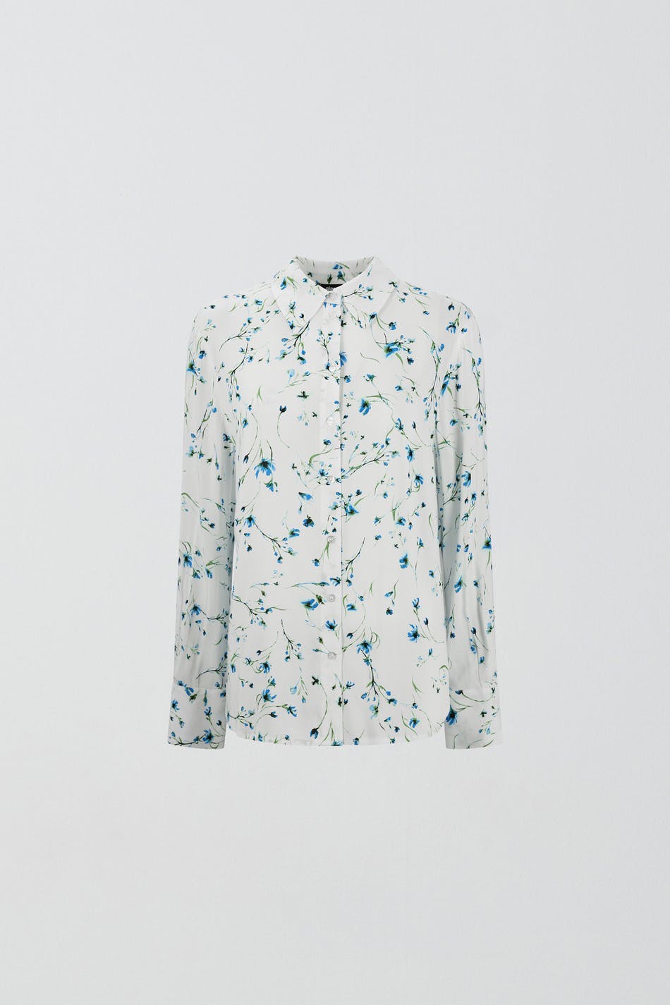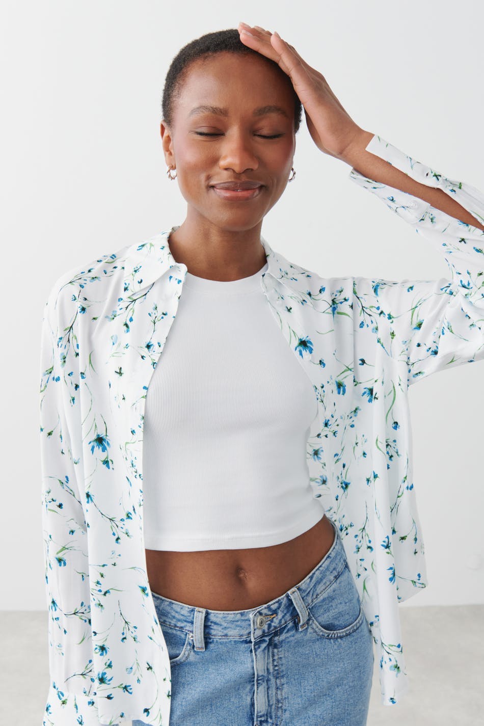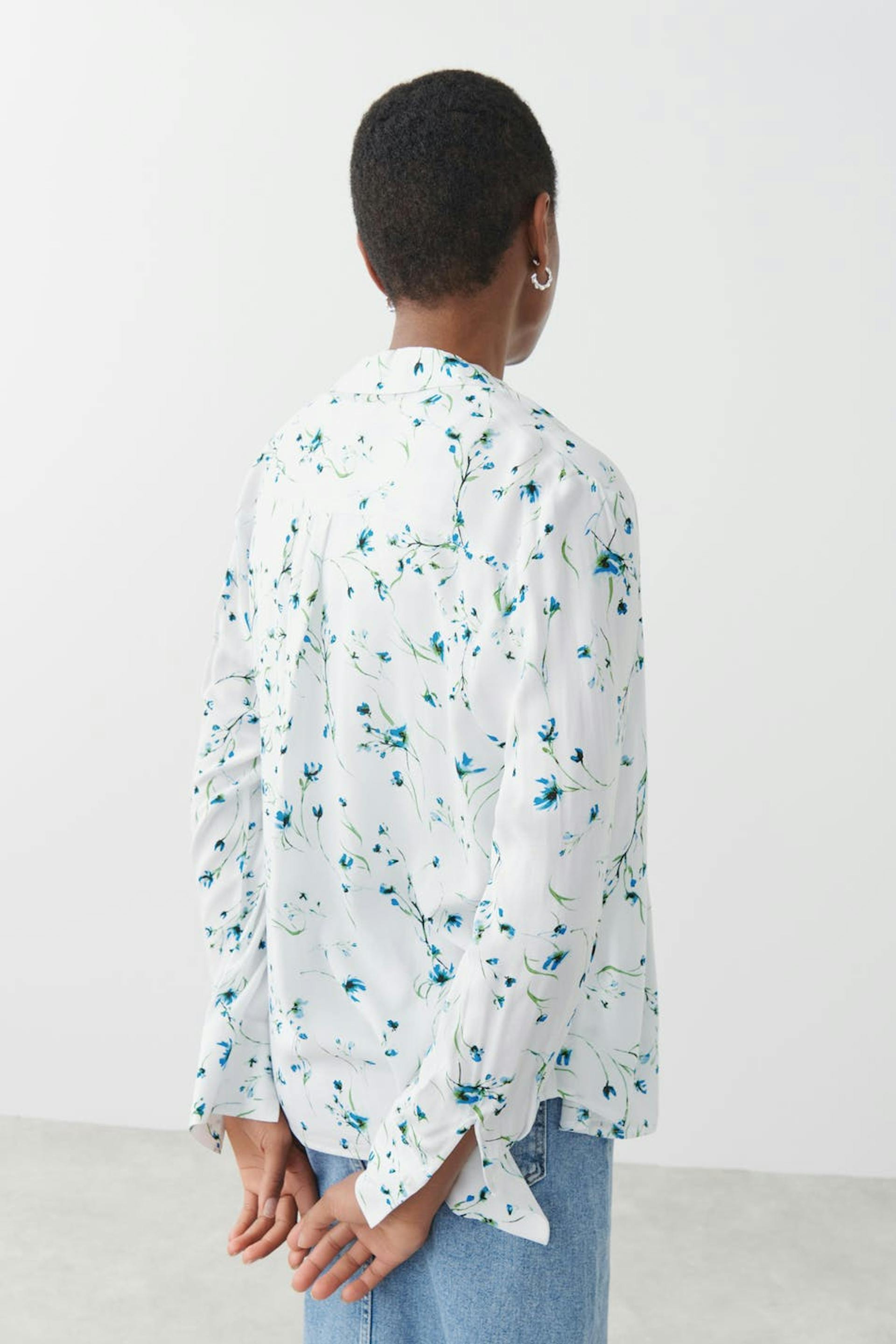 Floral shirt with button placket in front. The shirt is blue, white and woven. It has a soft quality, collar, cuffs and slightly longer back piece.