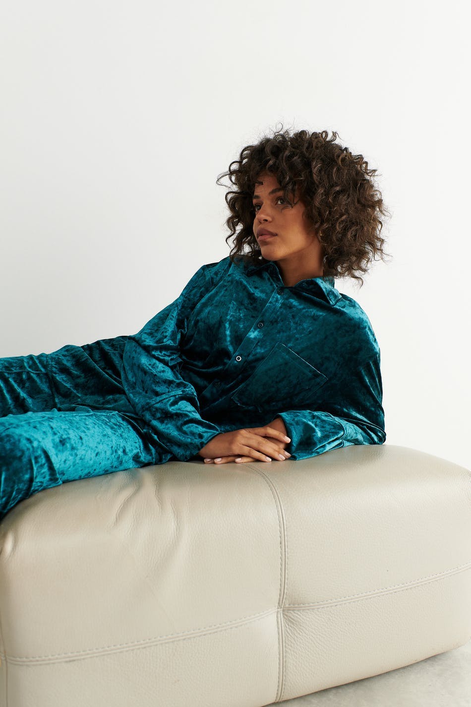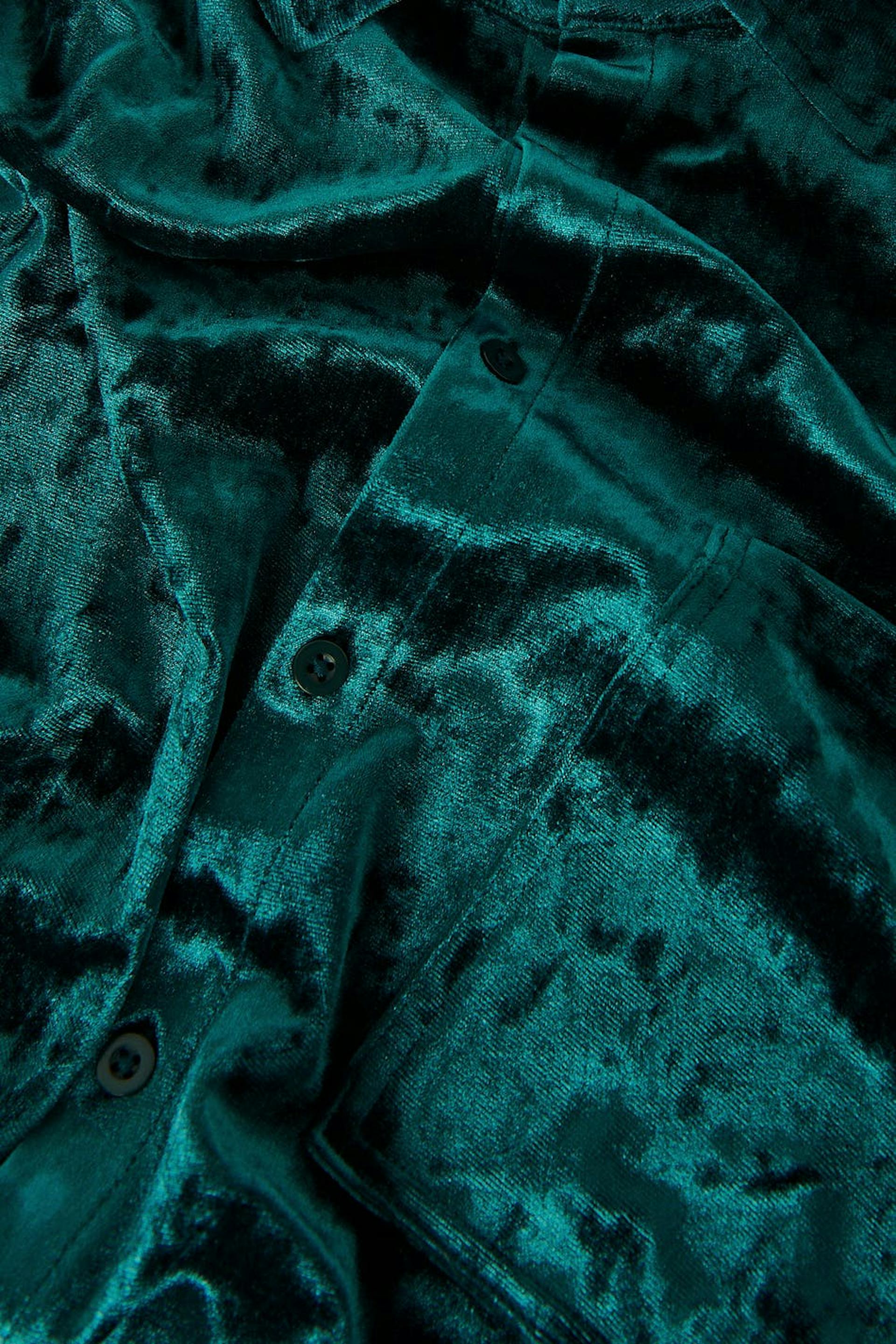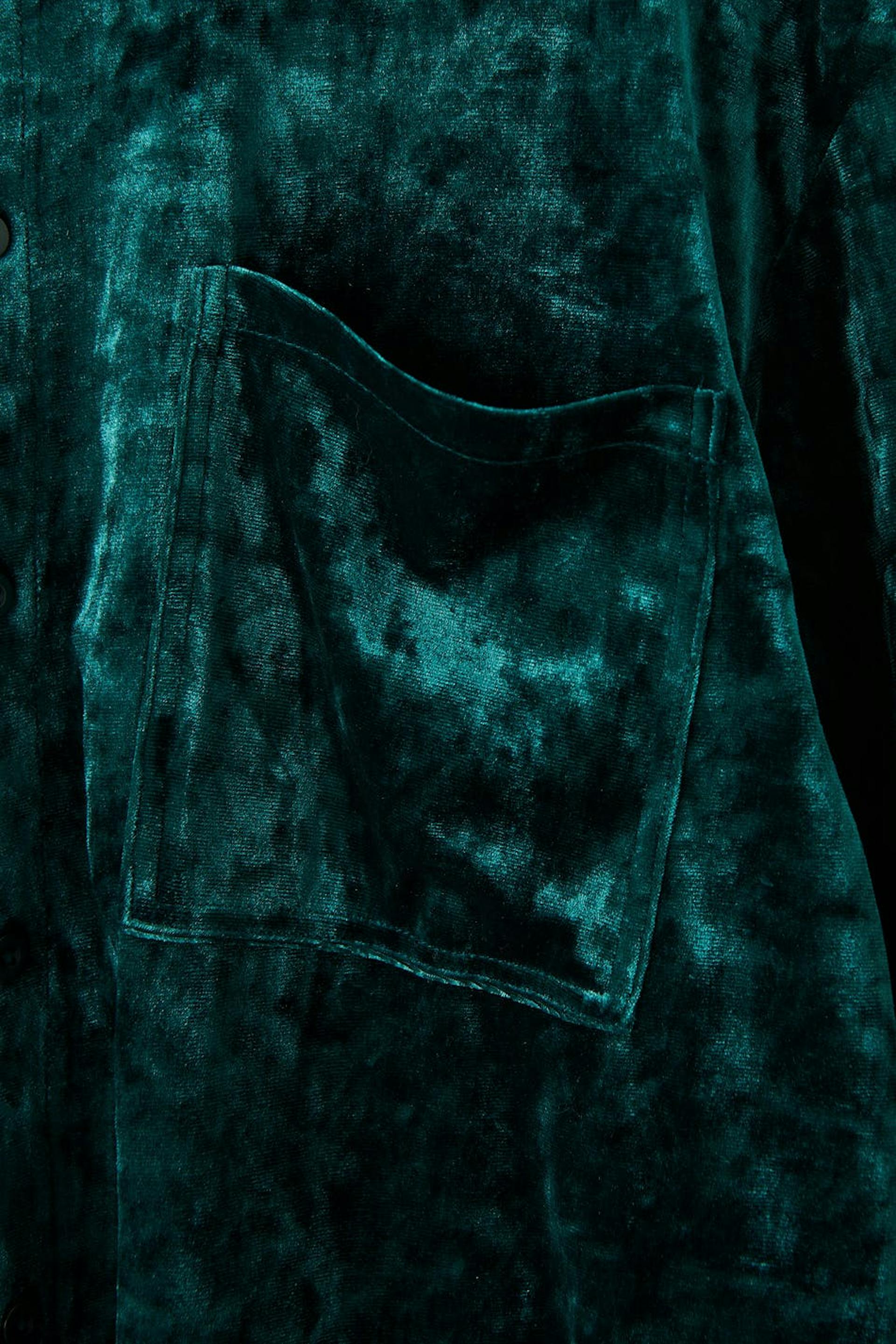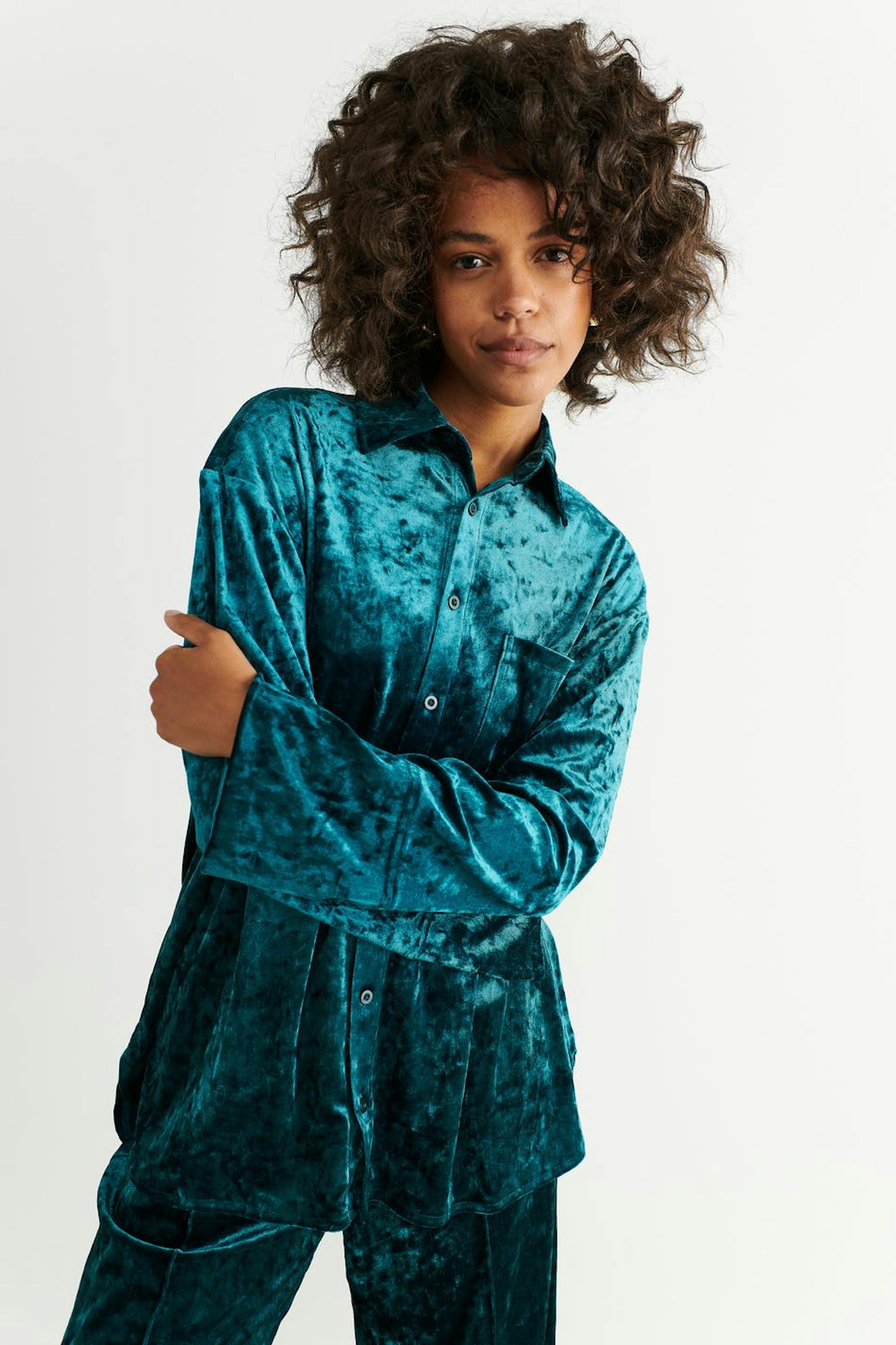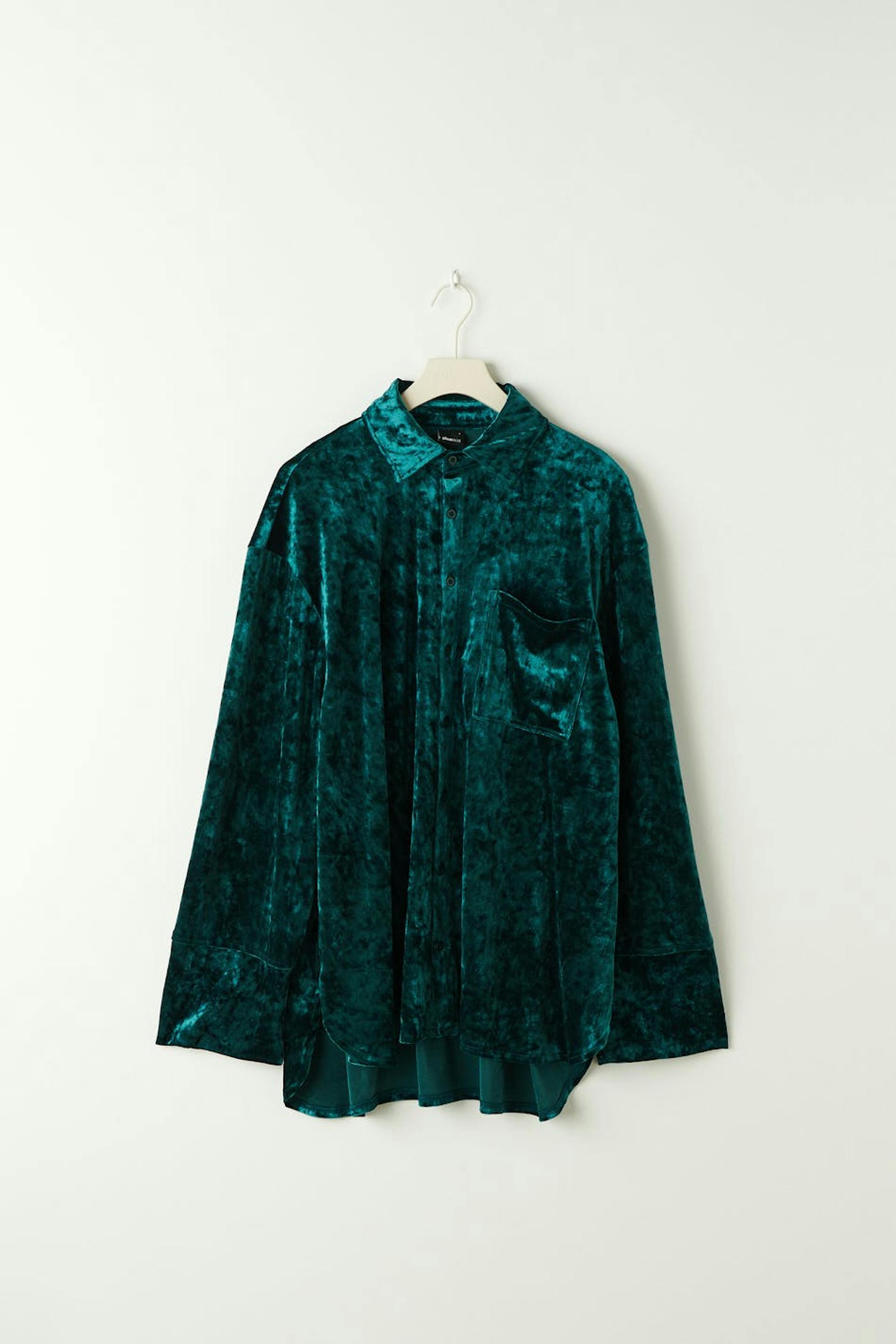 Shirt in velvet with oversize fit. The shirt is green and has button placket in front. It has collar, chest pocket on the left side, wide cuffs and vent in the sides.