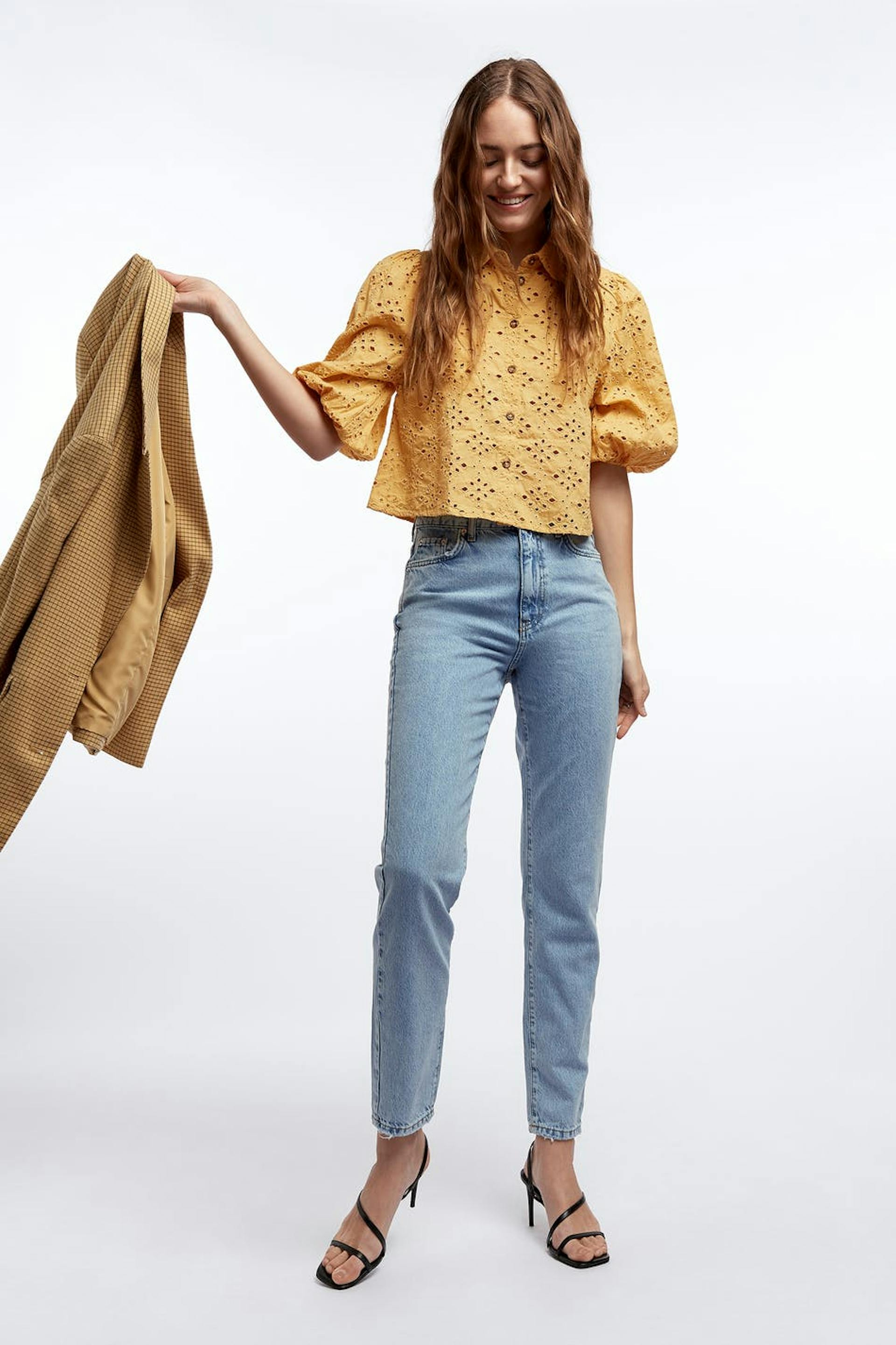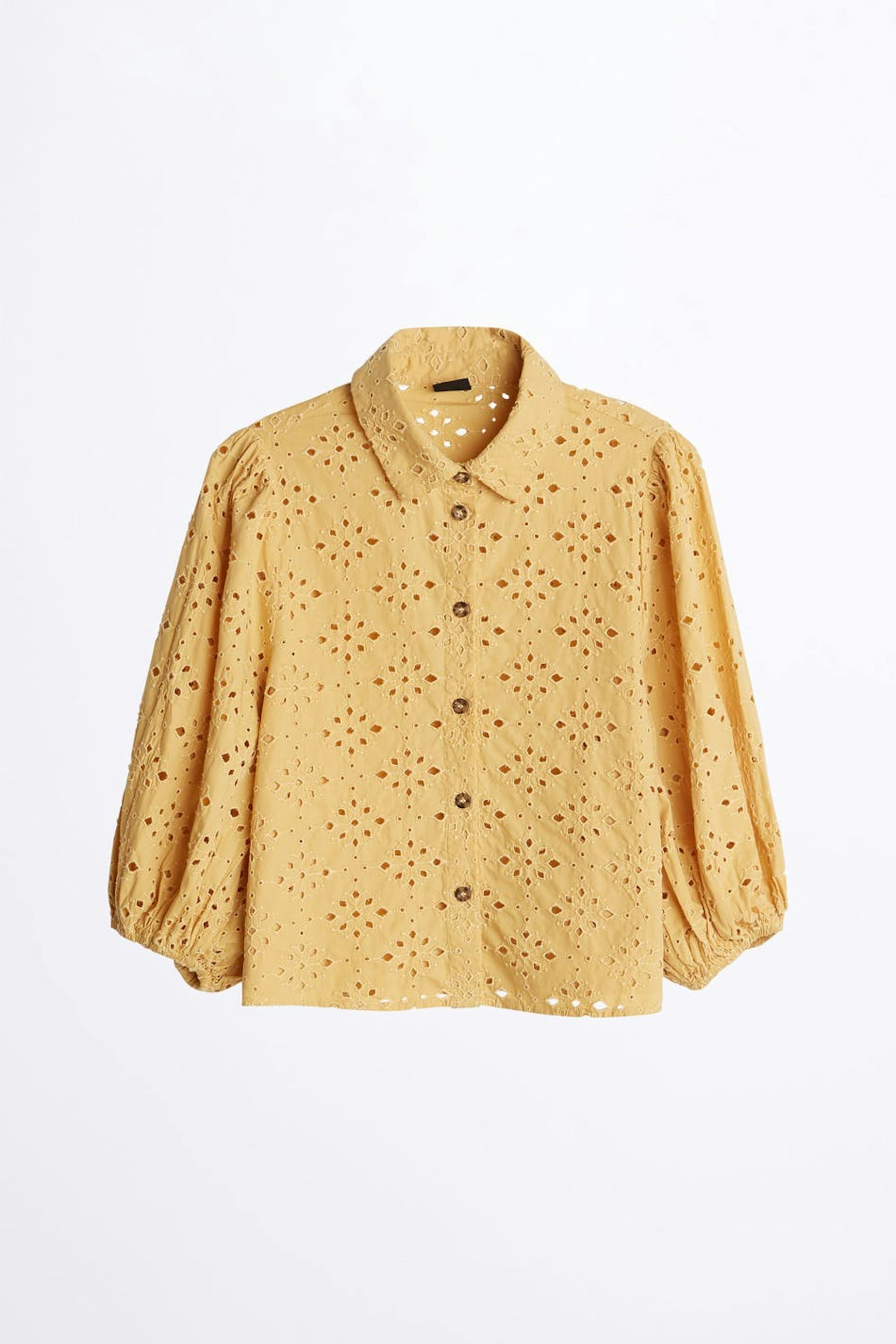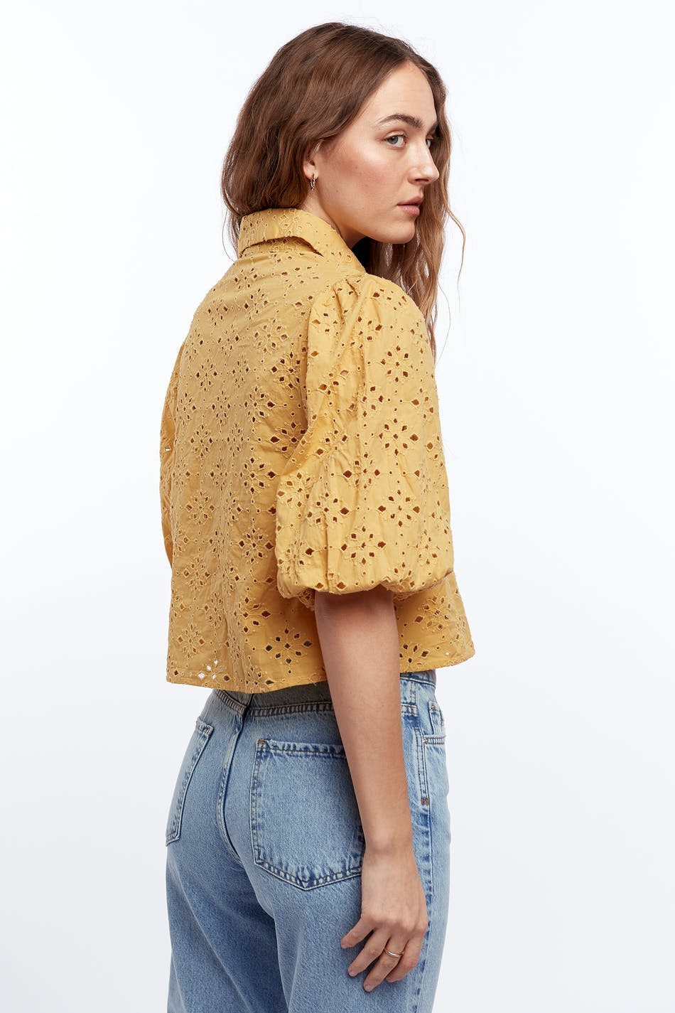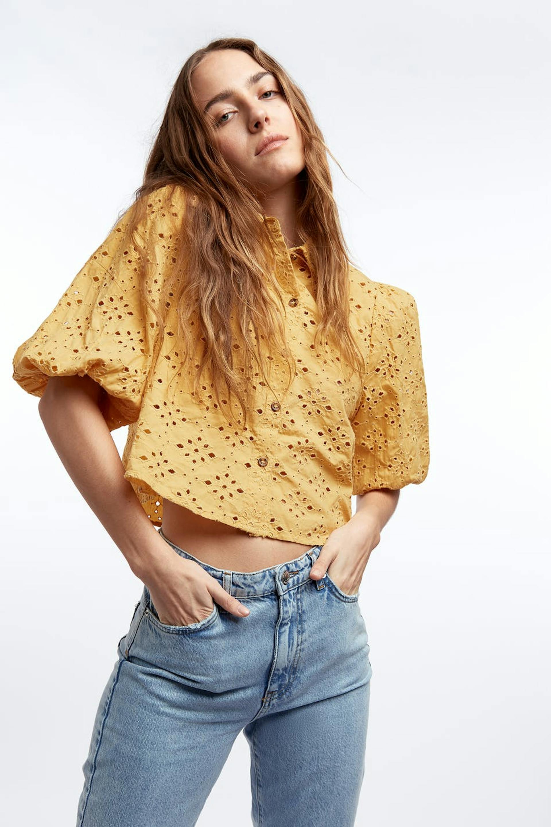 Straight blouse with short puff sleeves. The blouse is yellow and short.