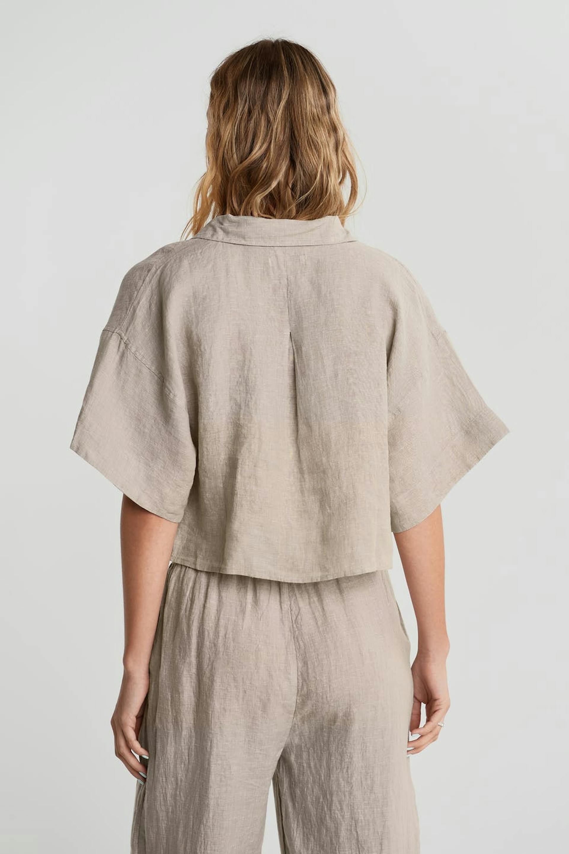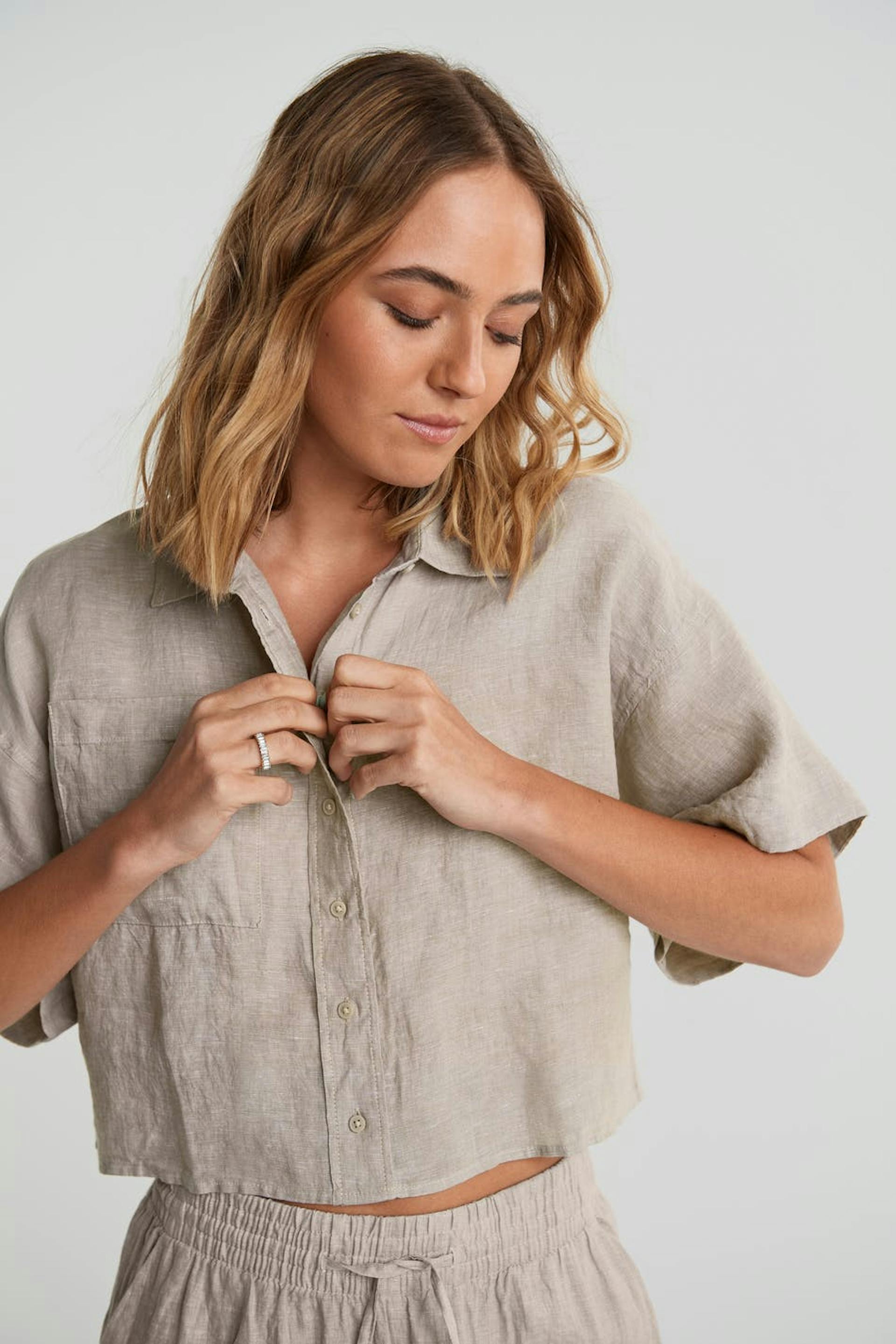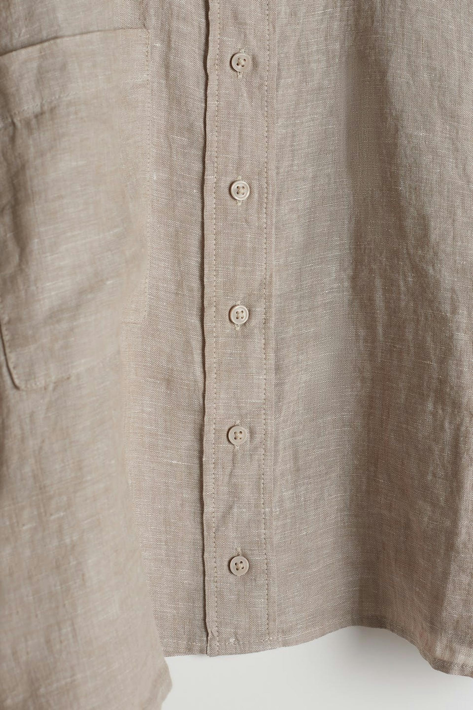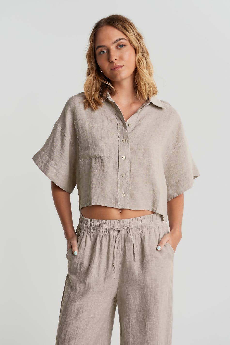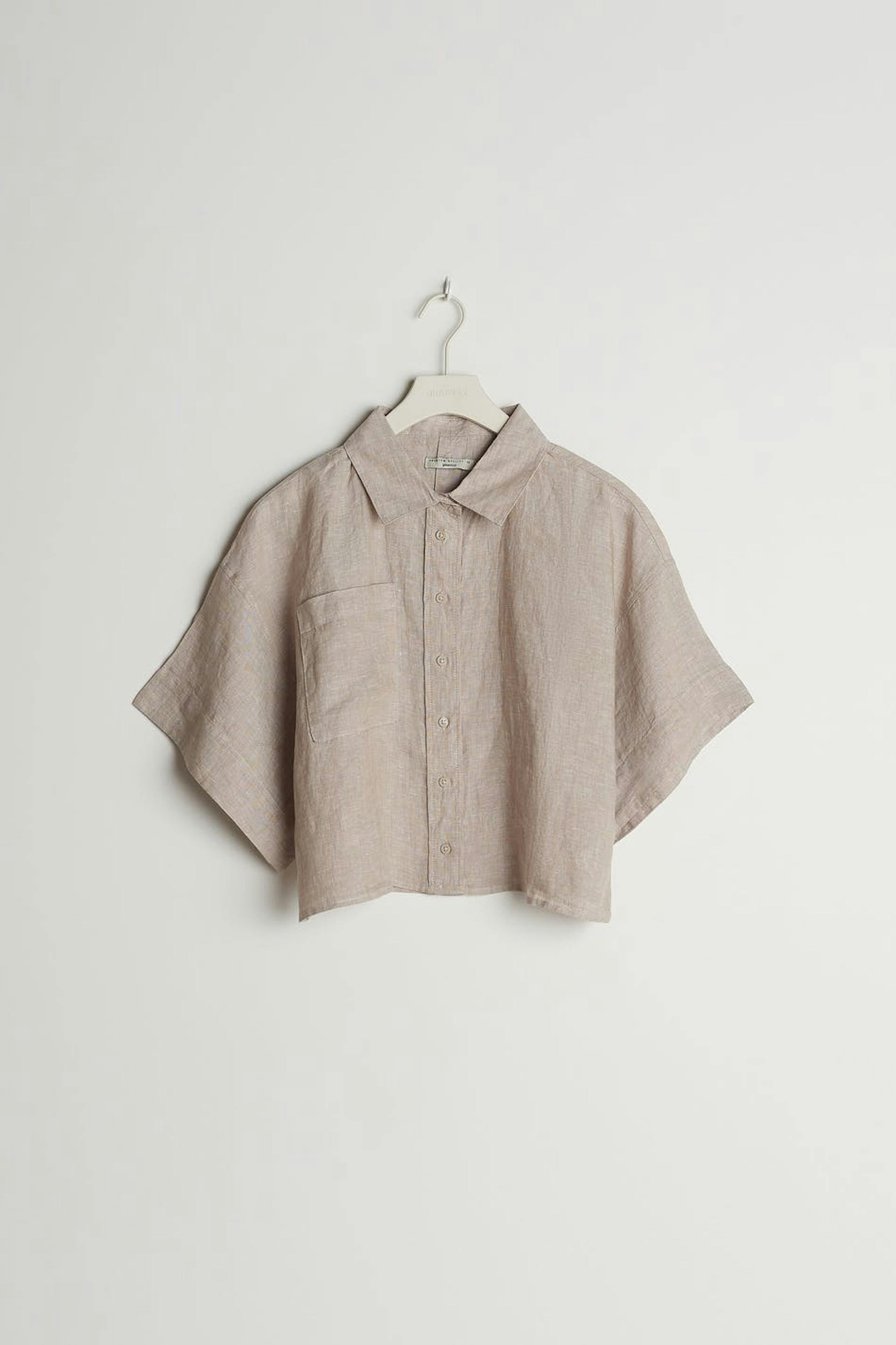 Short-sleeved shirt with a cropped length. The shirt is beige and has buttons at the front. It has a spacious fit, a chest pocket and a material in linen and cotton.