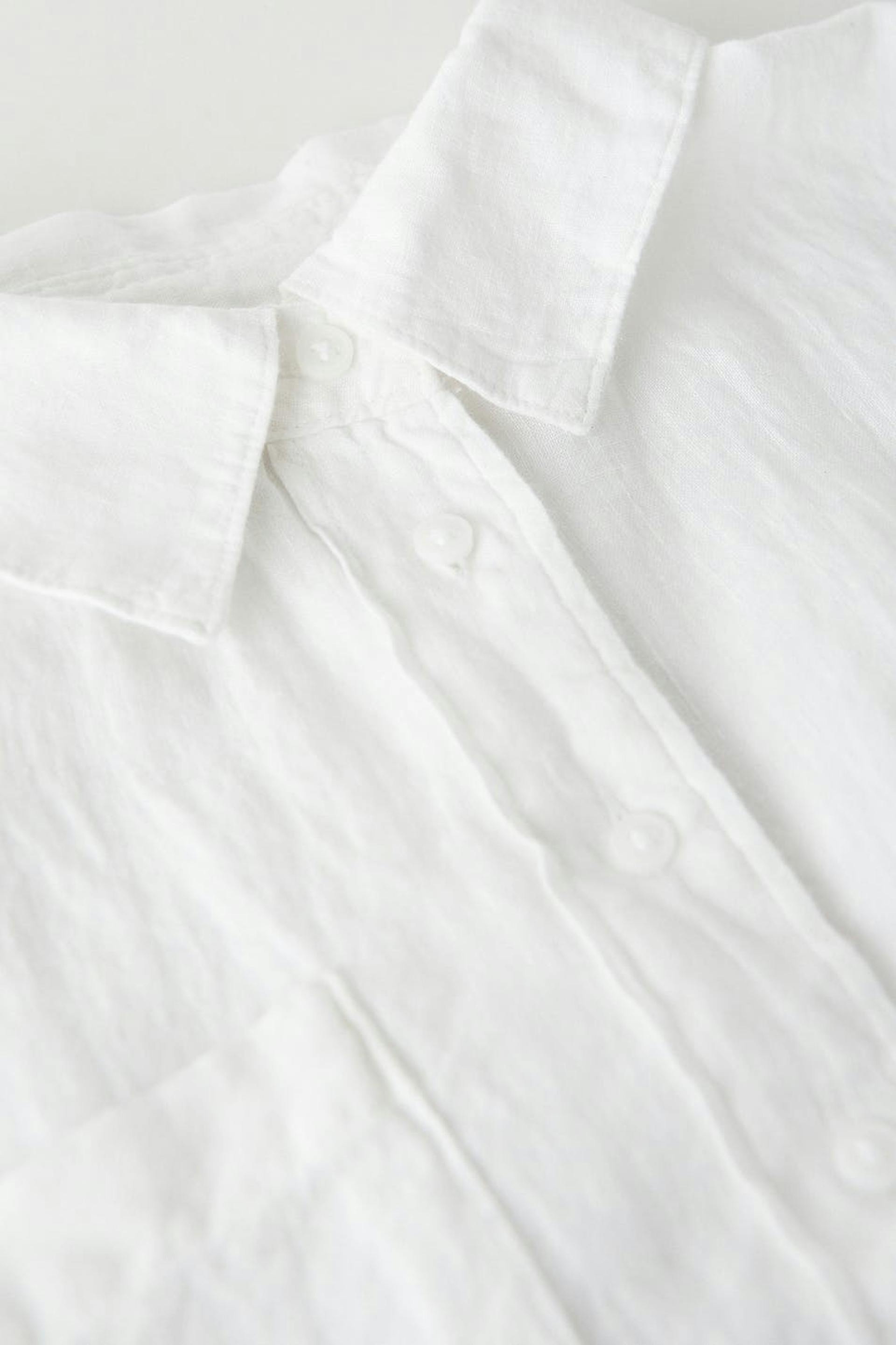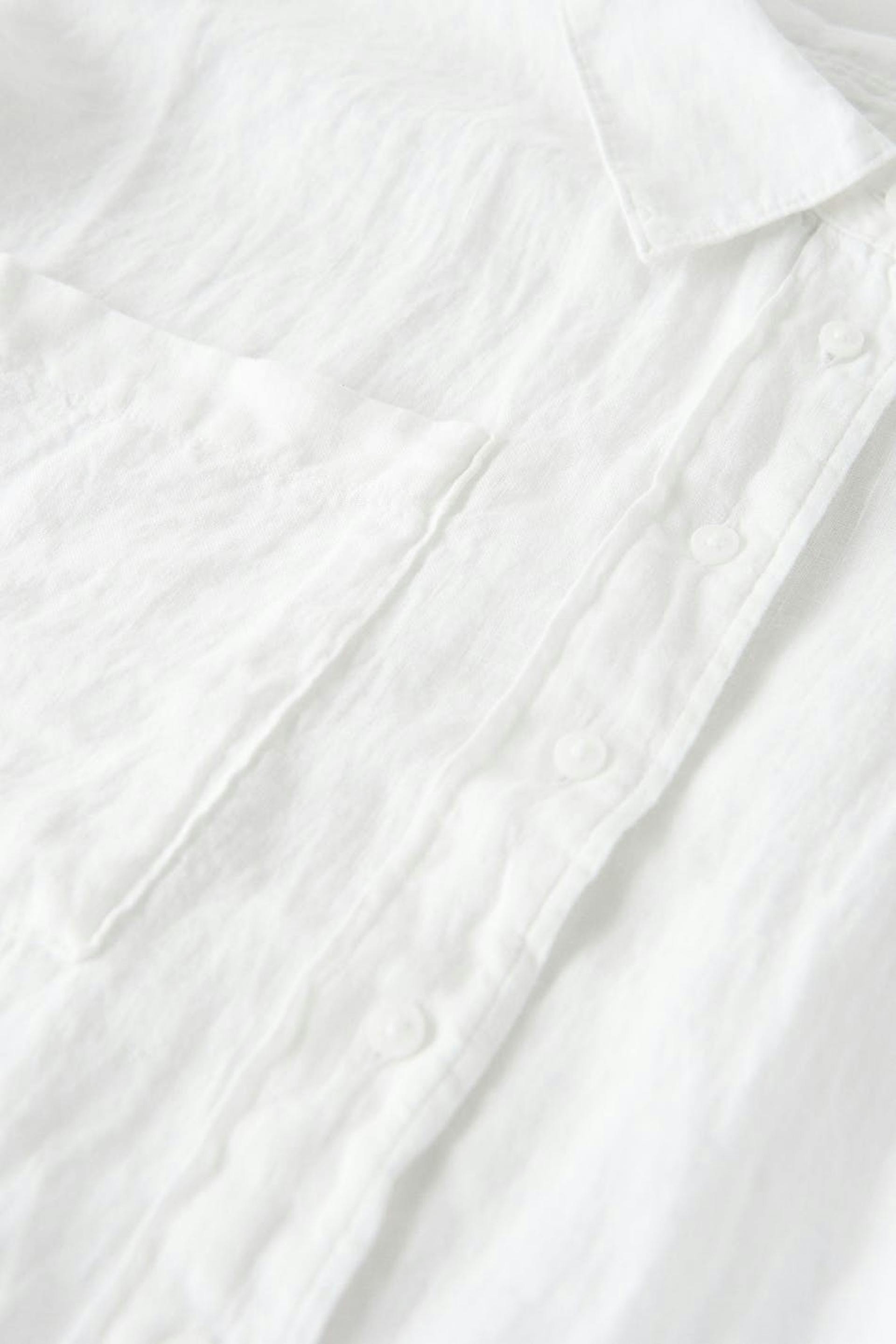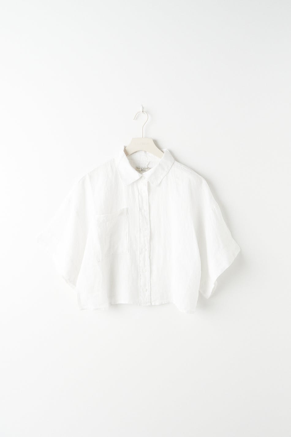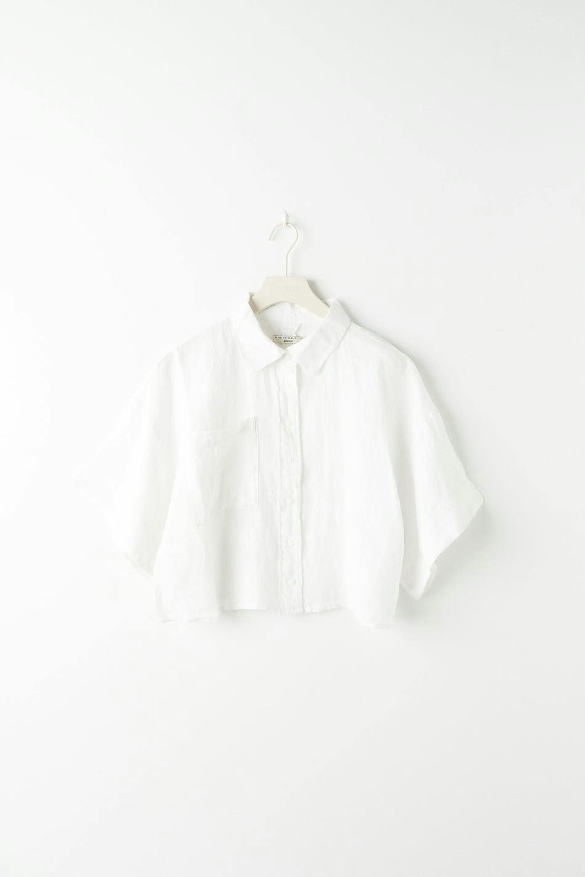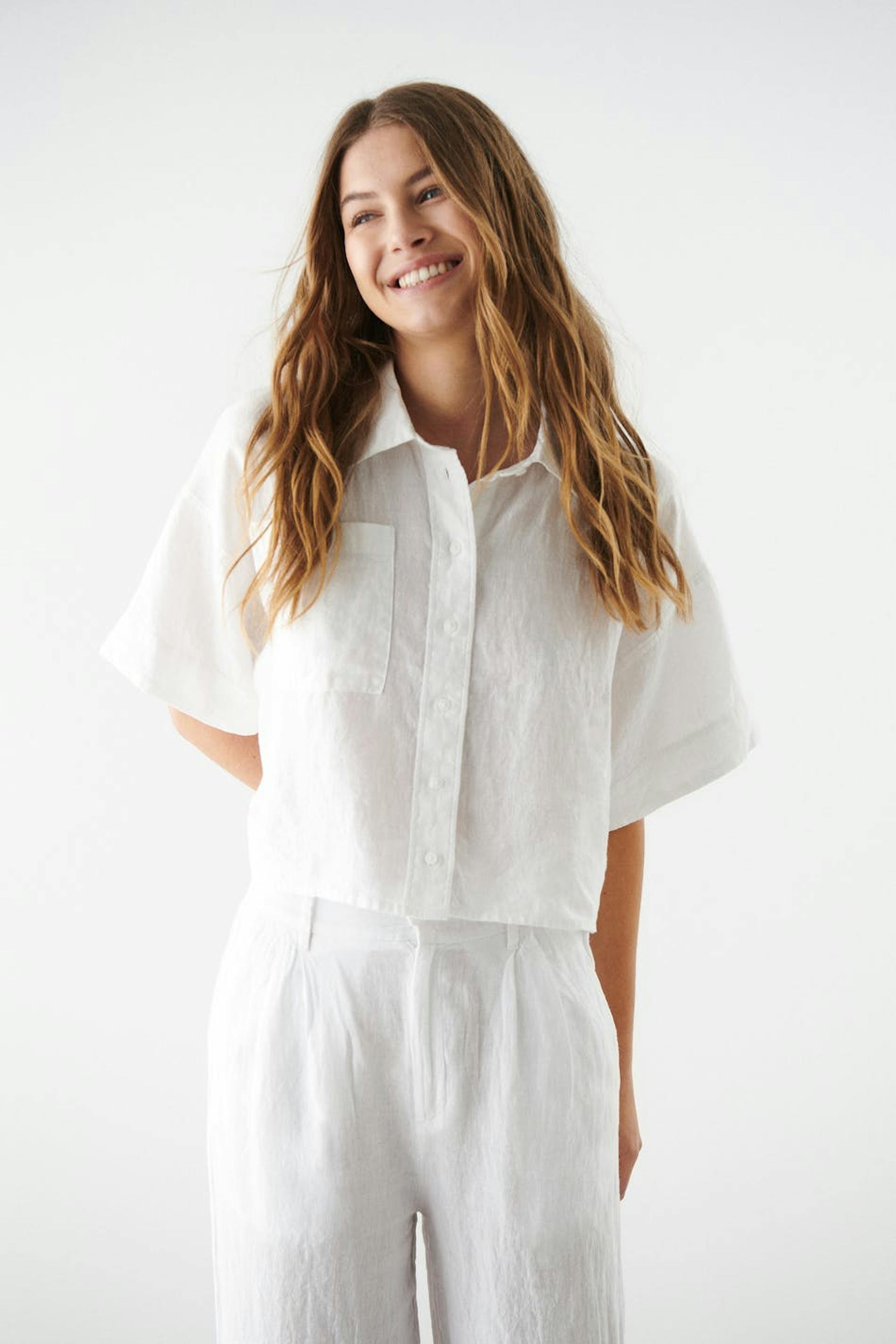 Short-sleeved linen shirt with an oversize fit. The shirt is white, cropped and boxy. It has button placket at the front and a chest pocket.