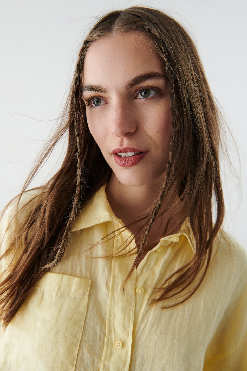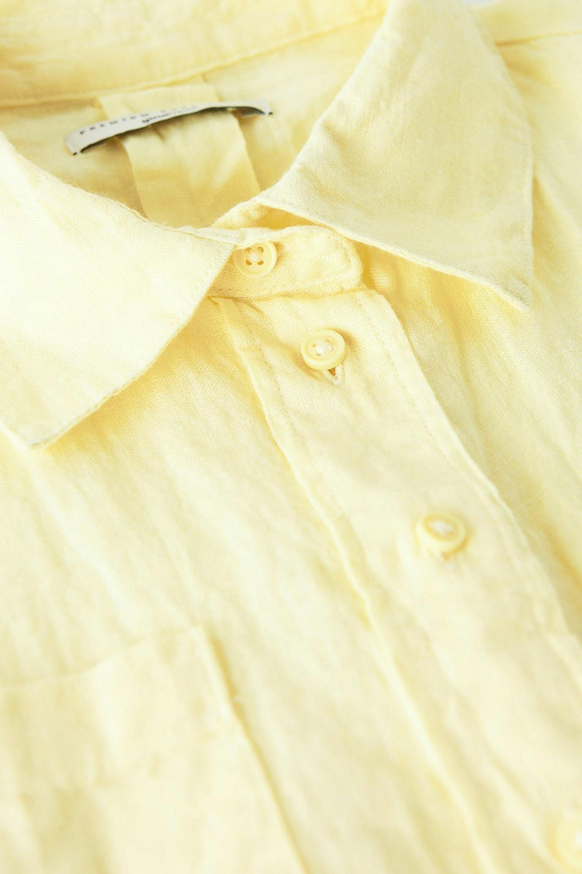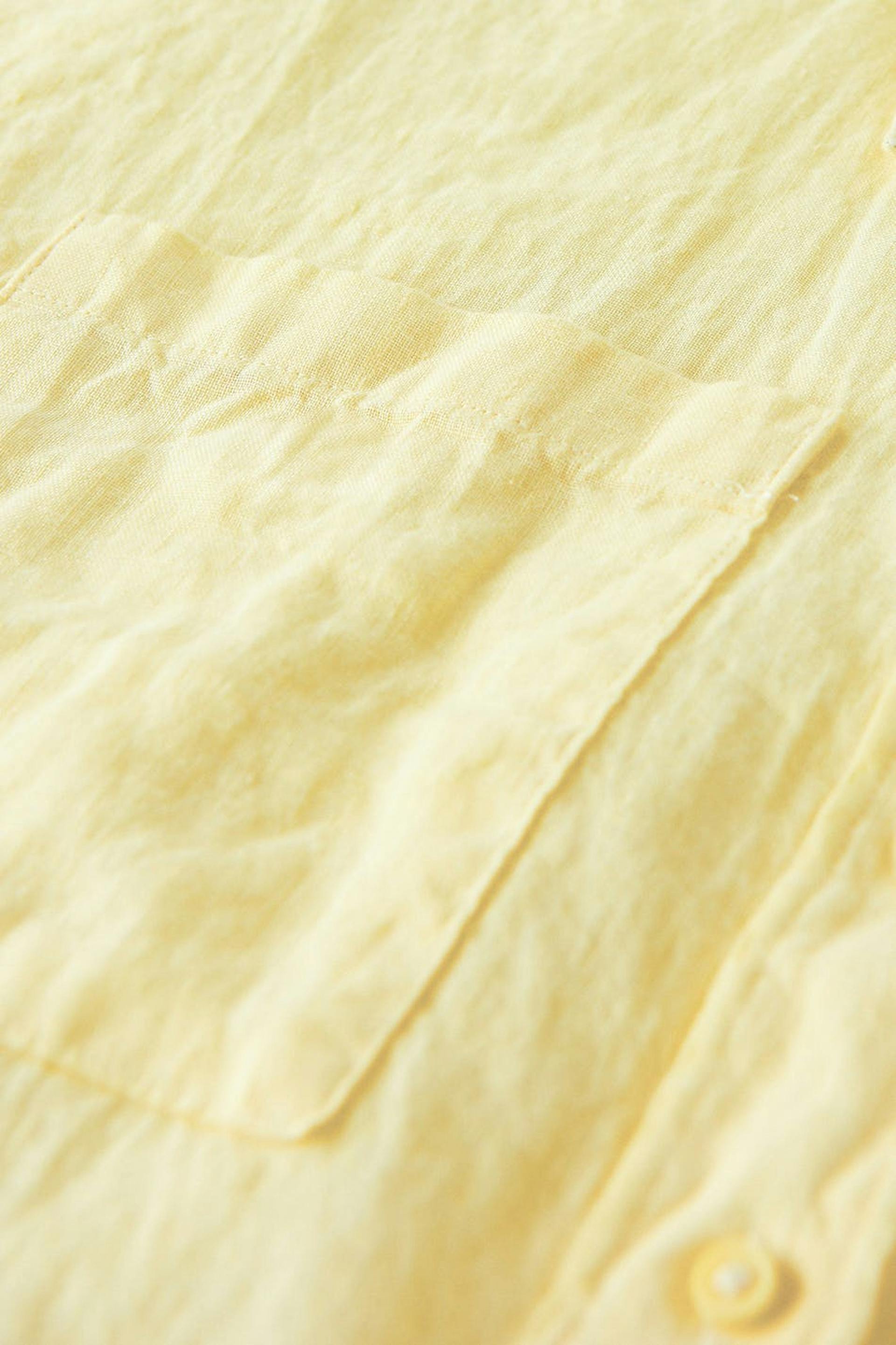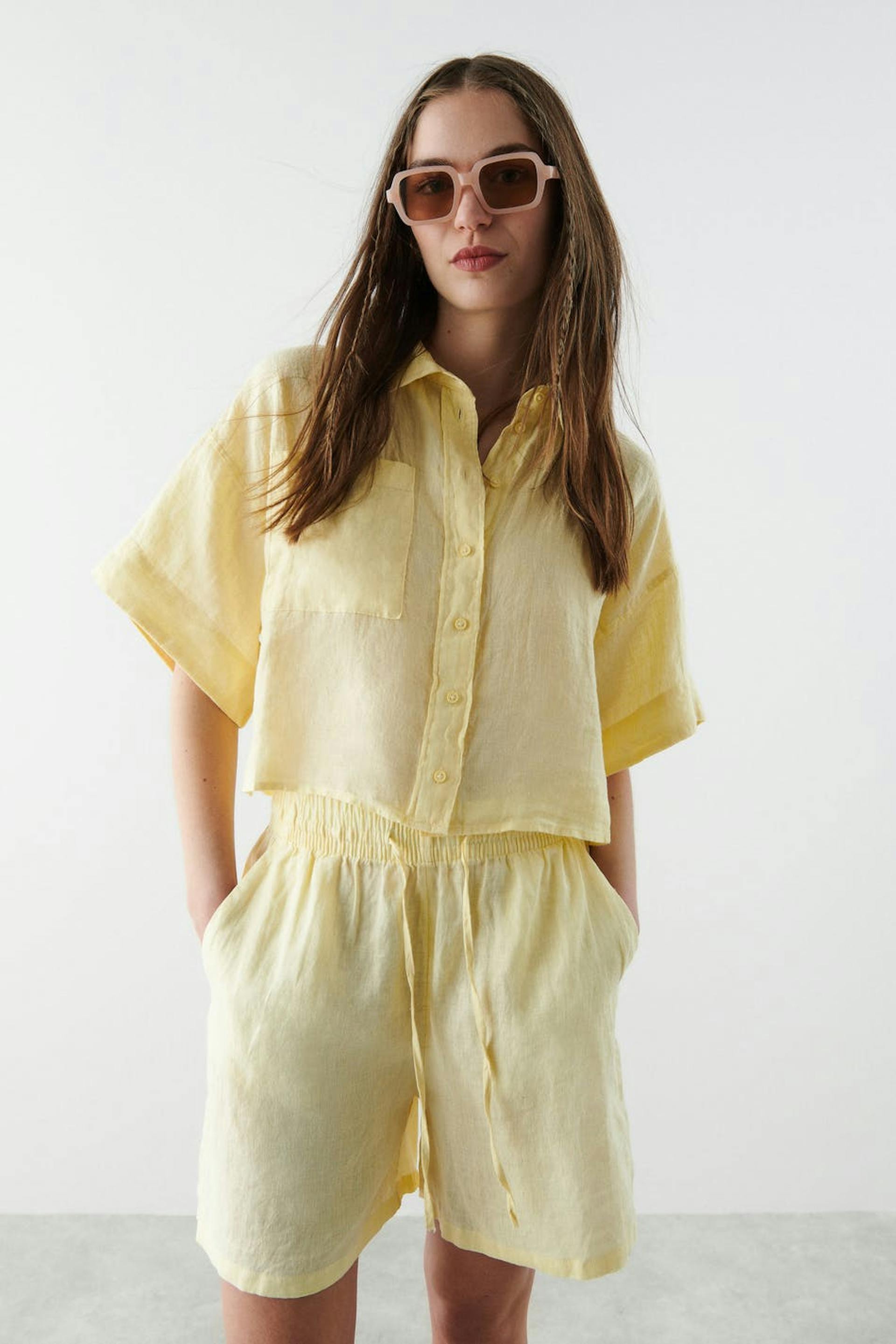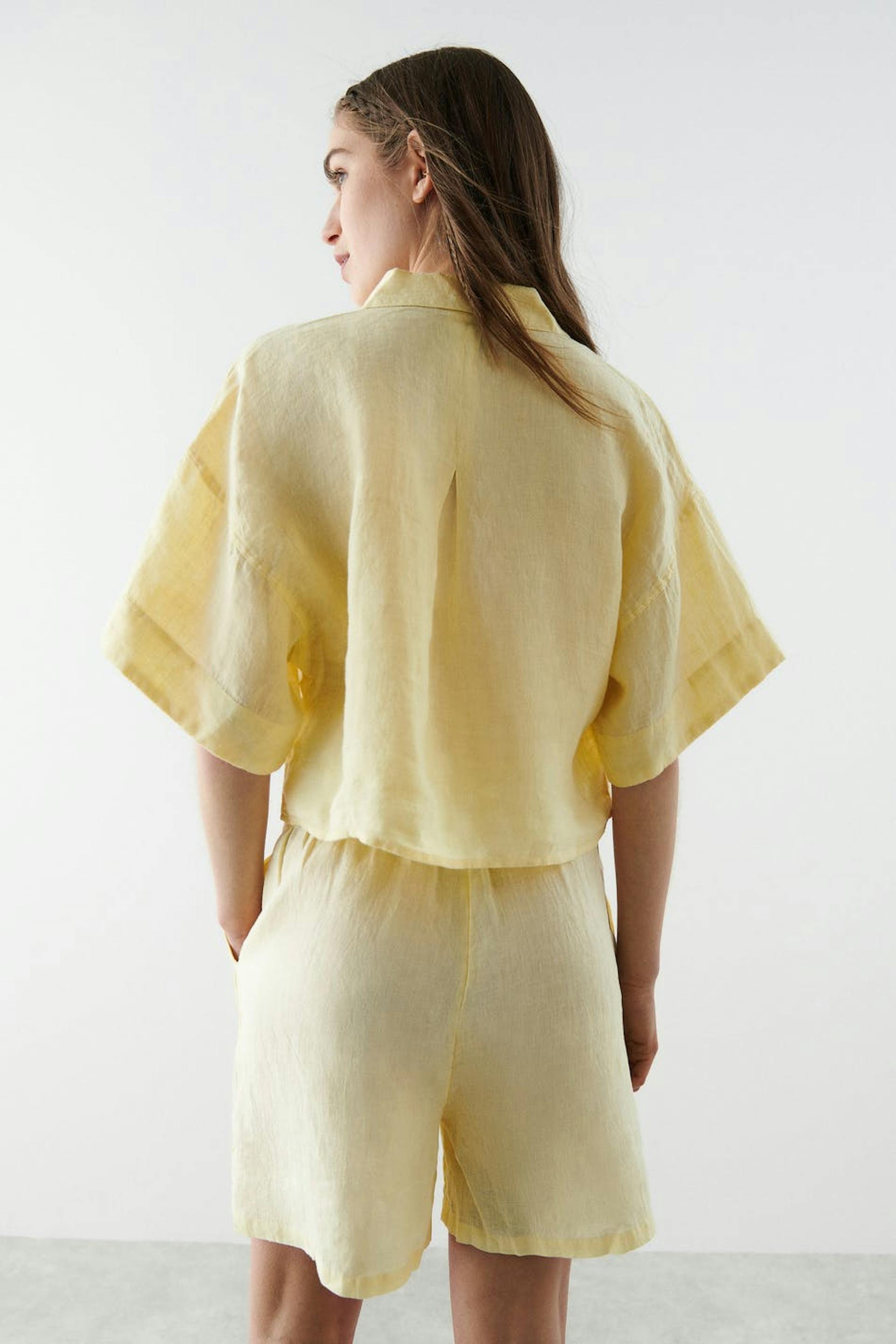 Short-sleeved linen shirt with an oversize fit. The shirt is yellow, cropped and boxy. It has button placket at the front and a chest pocket.