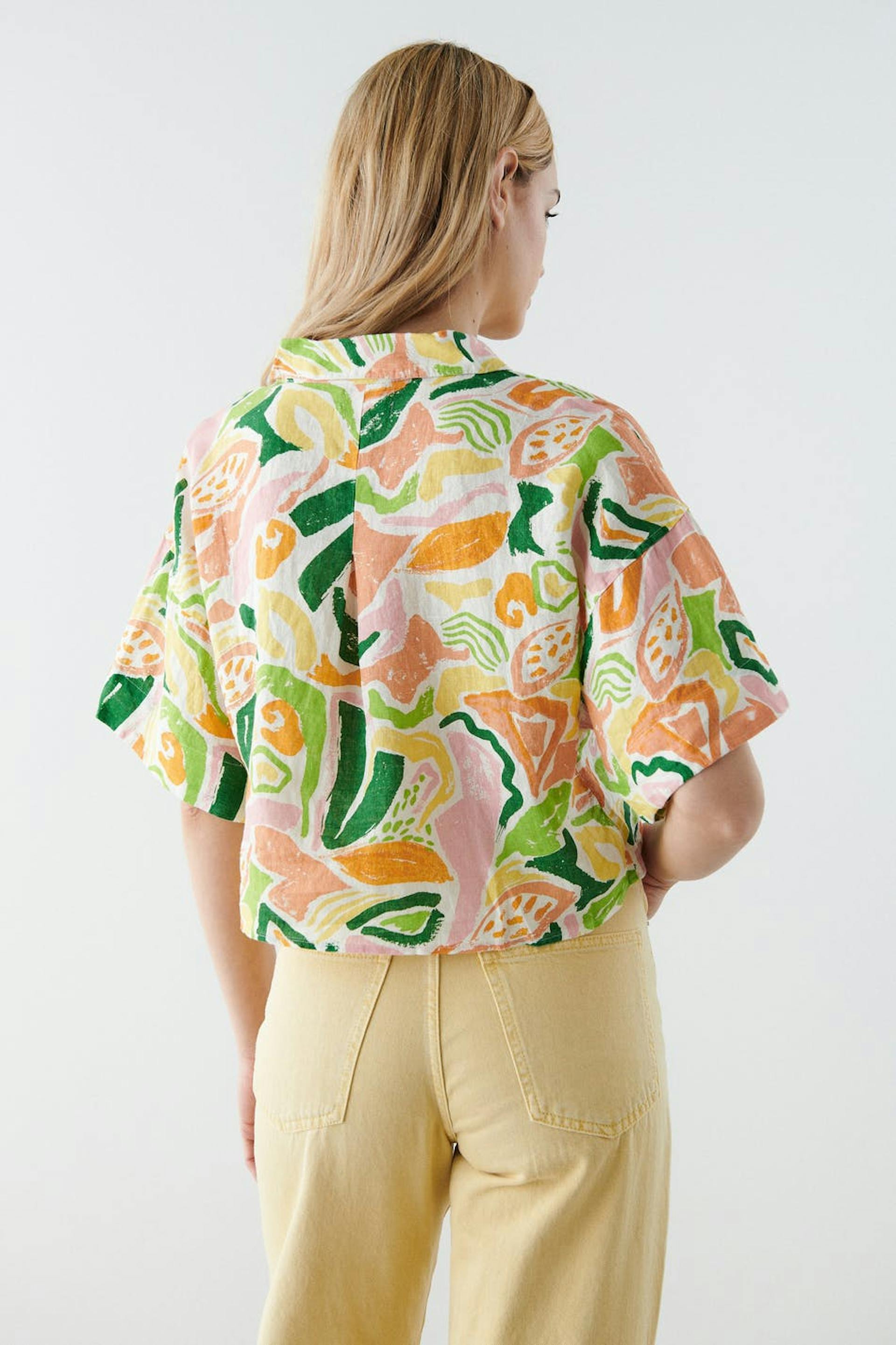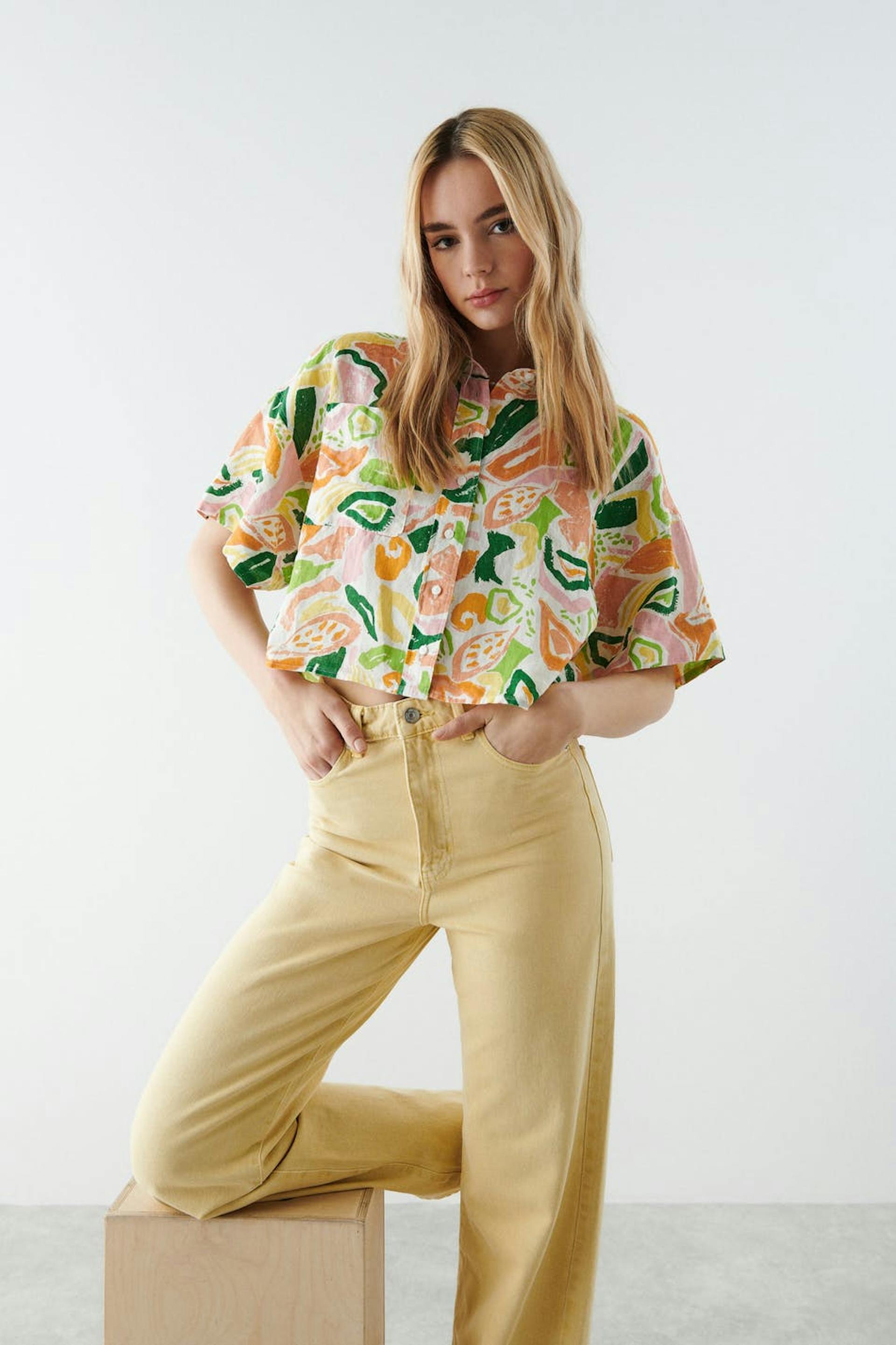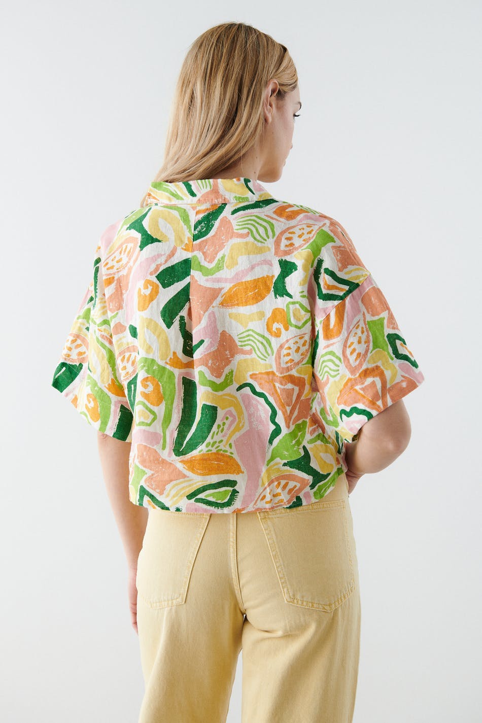 Short-sleeved linen shirt with a tropical print. The shirt is yellow, cropped and boxy. It has an oversize fit, button placket at the front and a chest pocket.