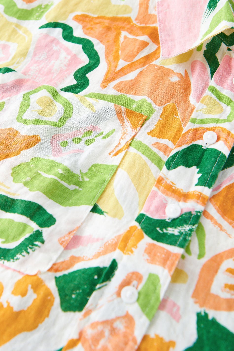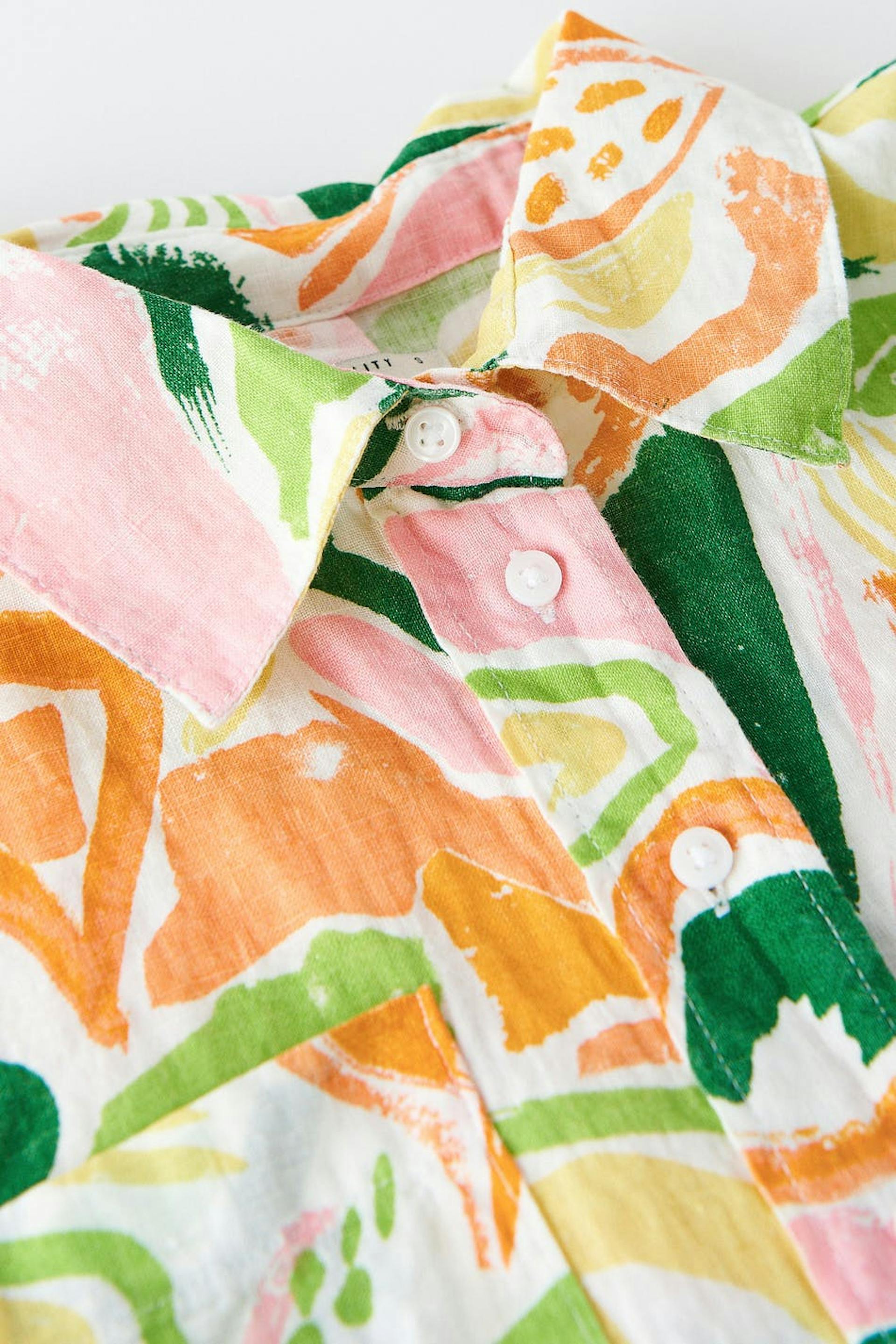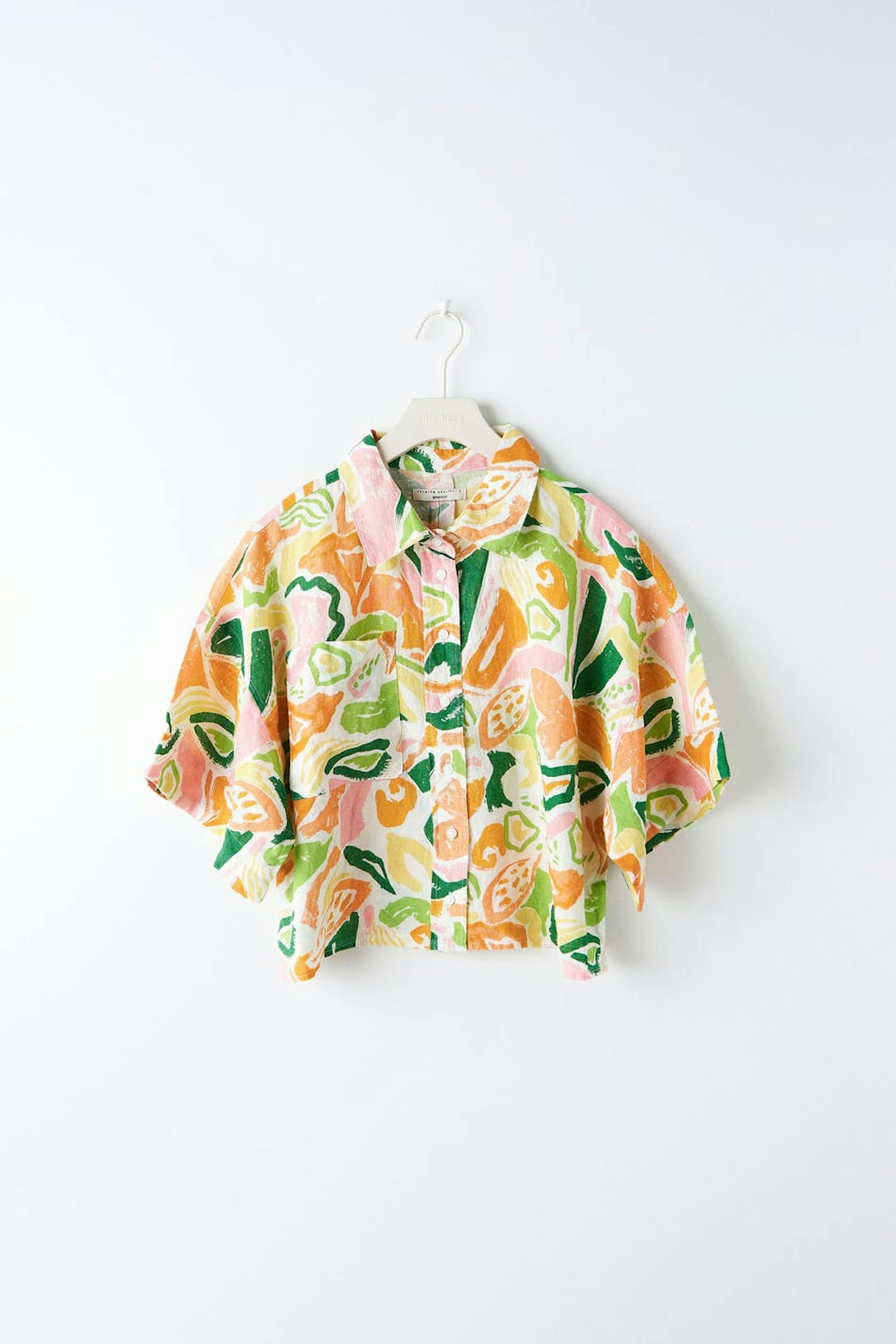 Short-sleeved linen shirt with a tropical print. The shirt is yellow, cropped and boxy. It has an oversize fit, button placket at the front and a chest pocket.