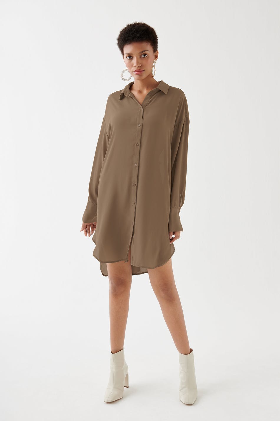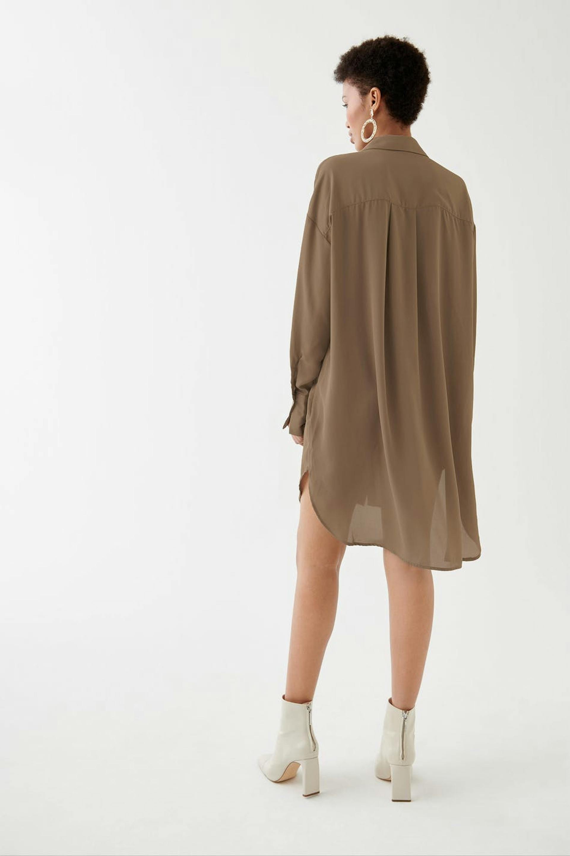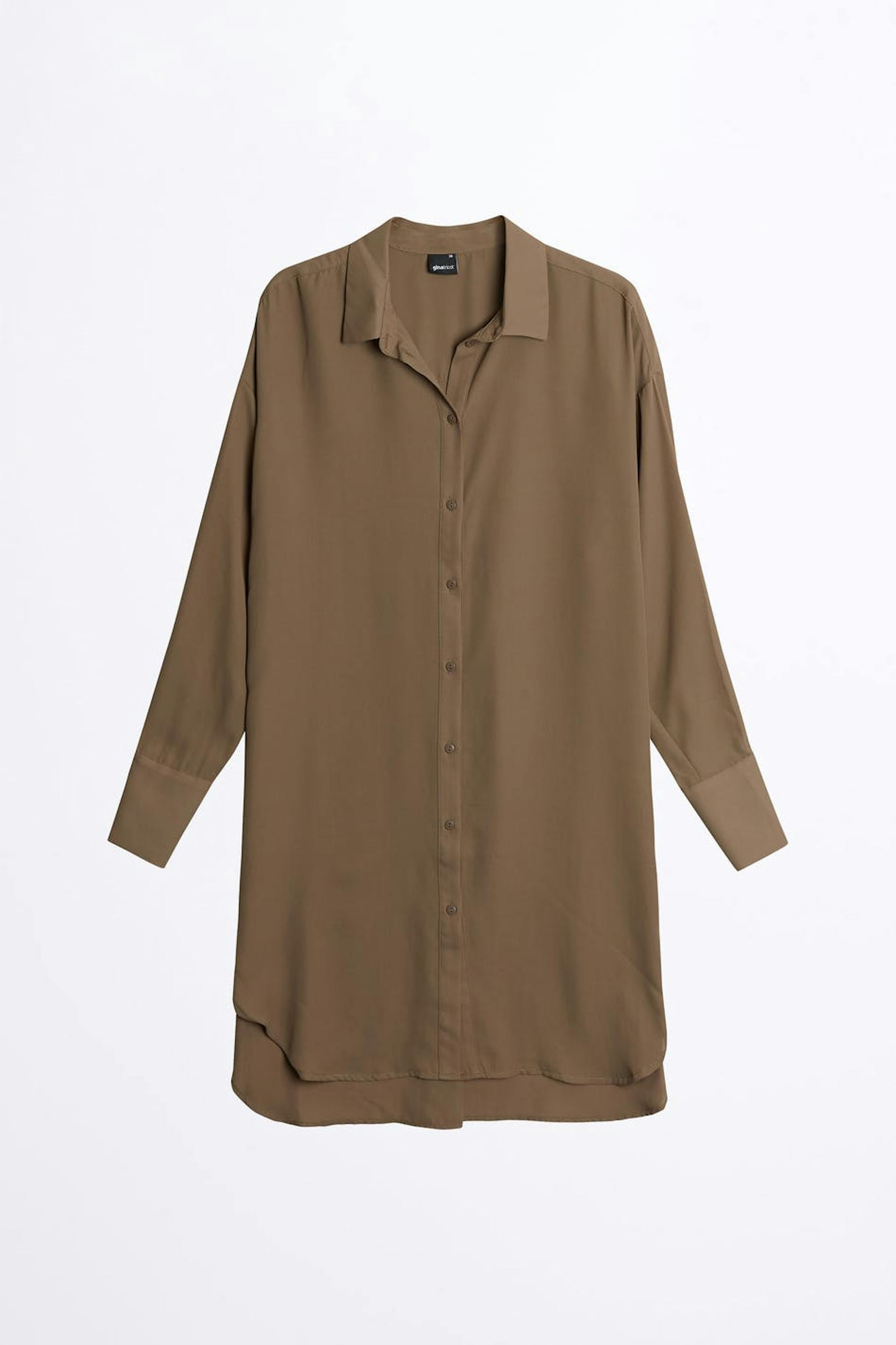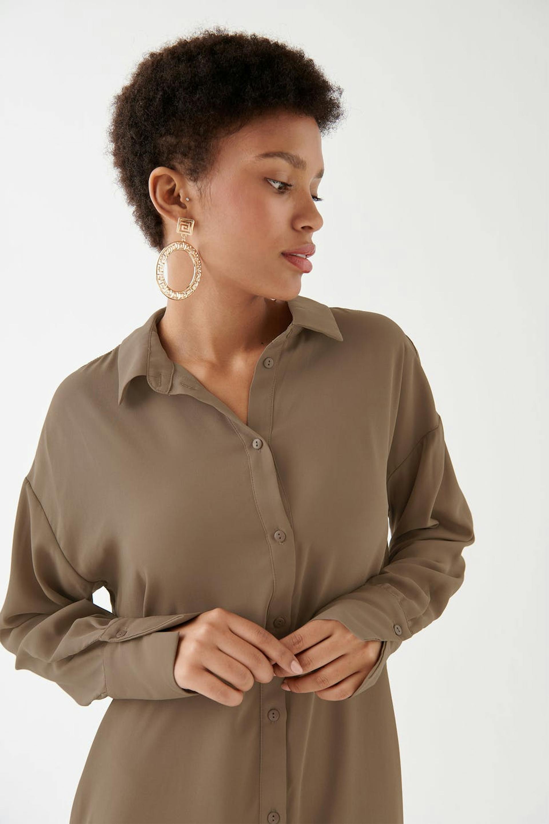 Oversize tunic with an oversize fit. The tunic is brown and long-sleeved and has buttons at the front. It has a rounded hem and a collar.