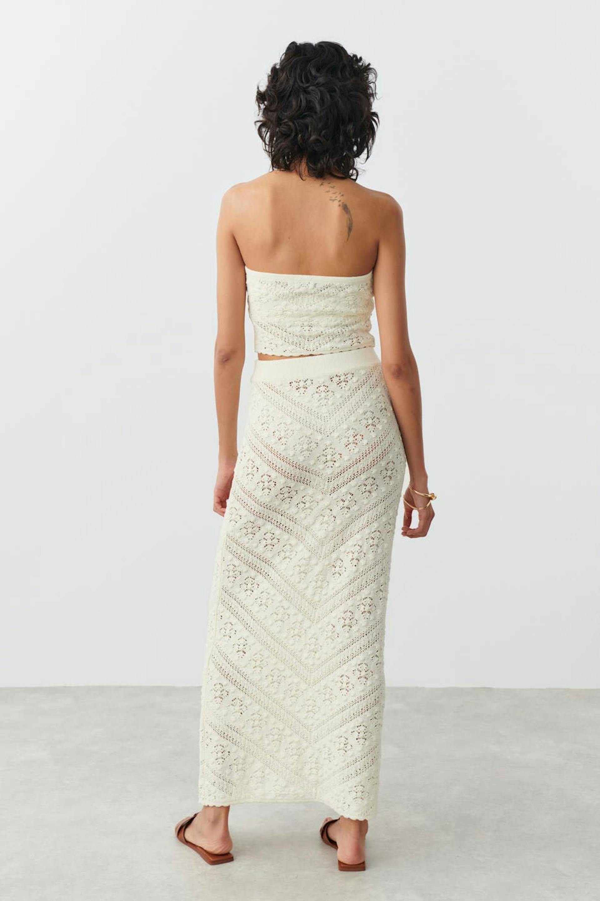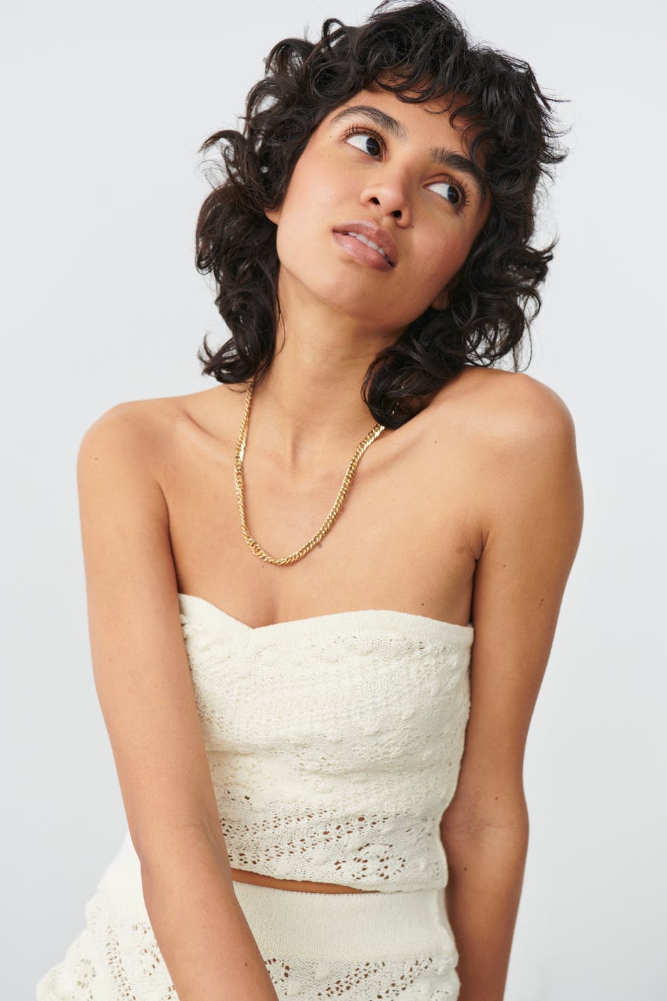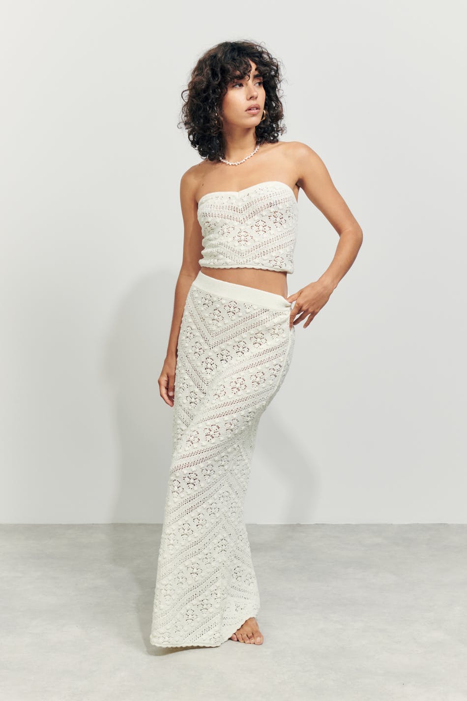 Crocheted tube top with fitted fit. The tube top is white and has heart-shaped neckline.