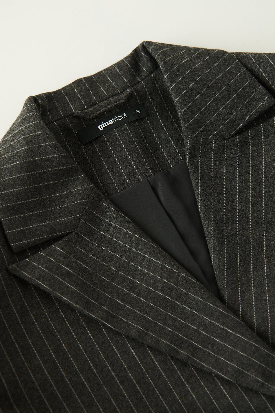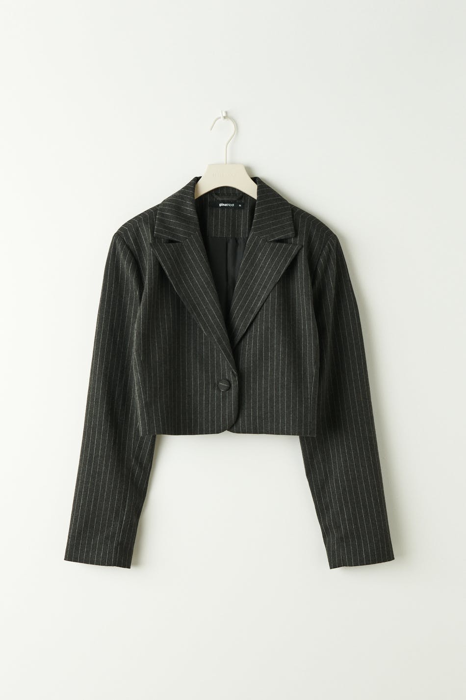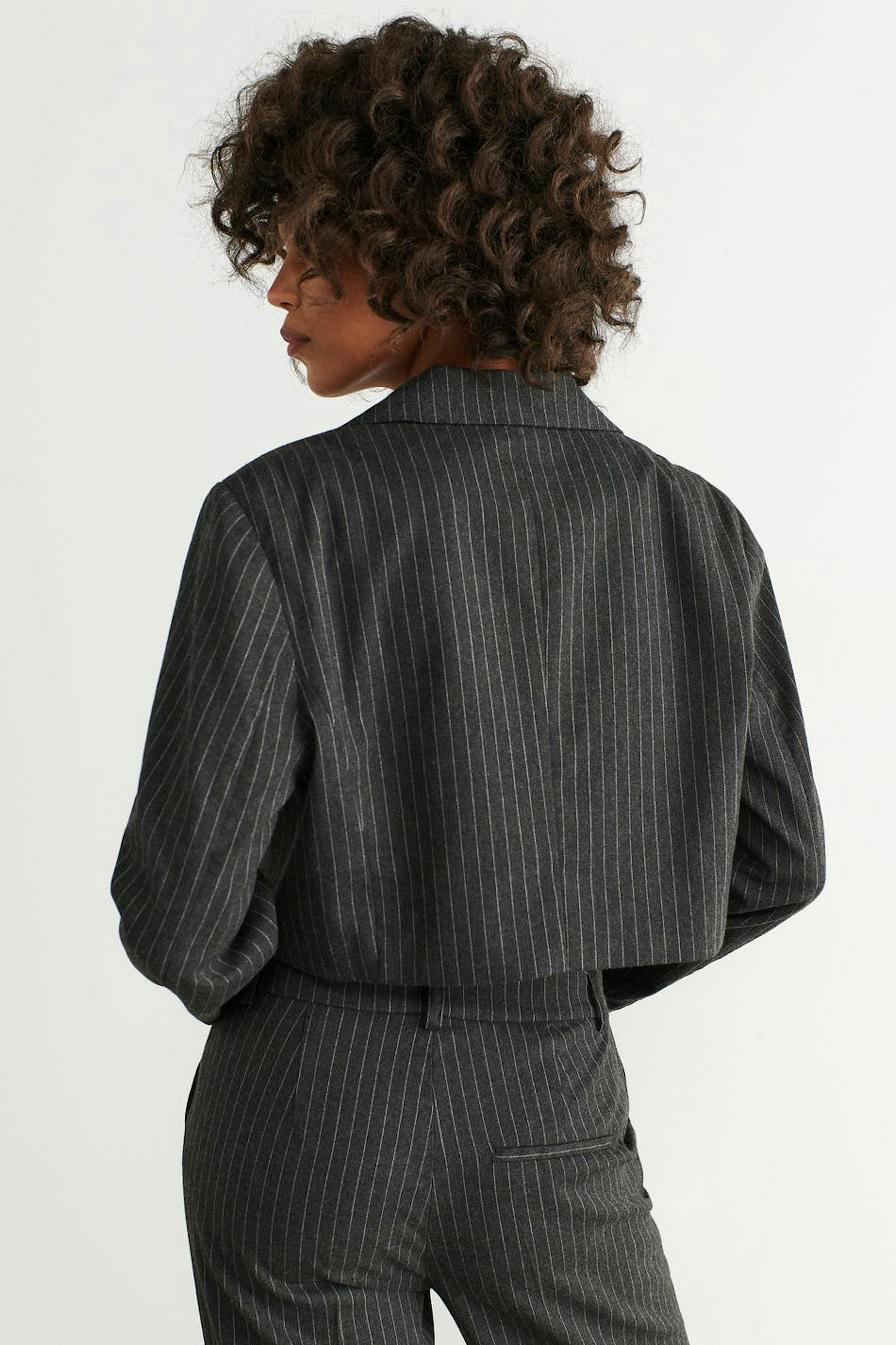Pinstriped blazer with cropped length. The blazer is grey and has one-button fastening at the front.