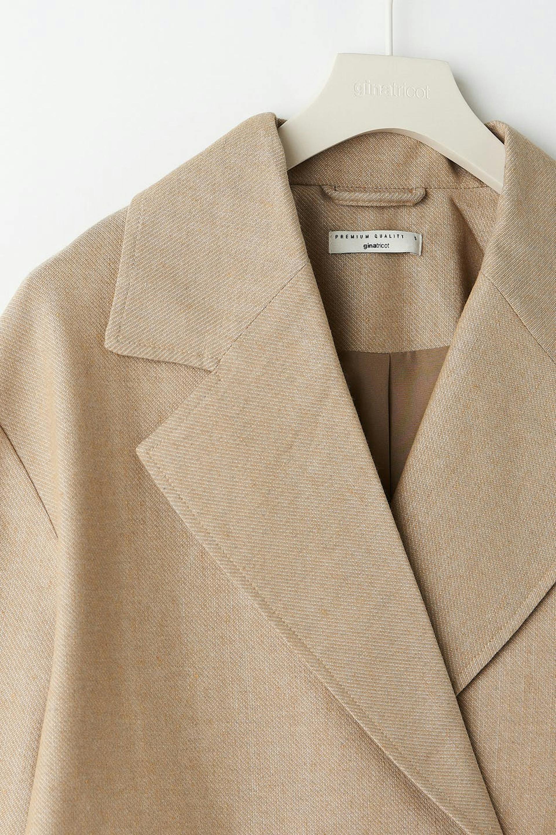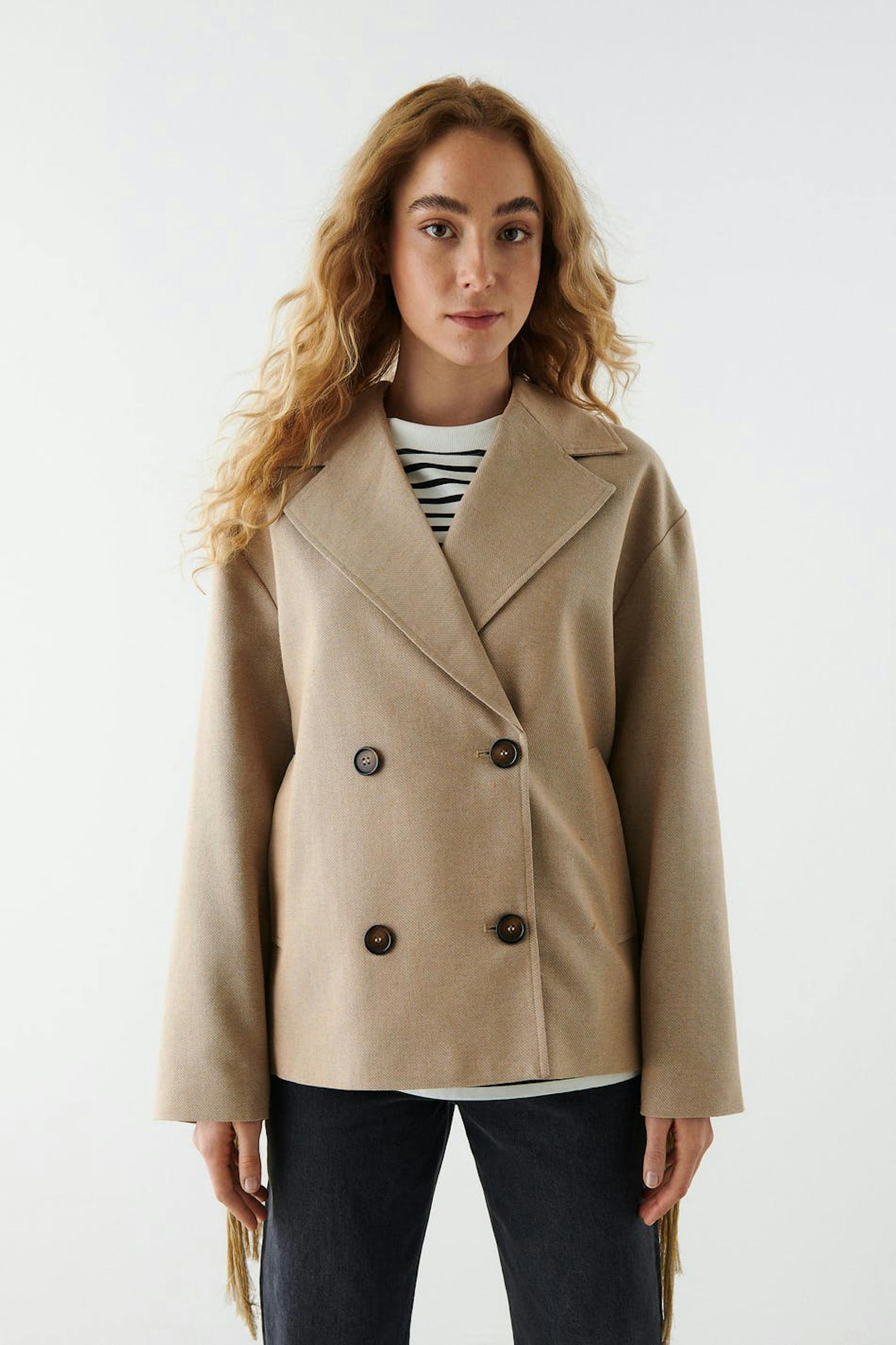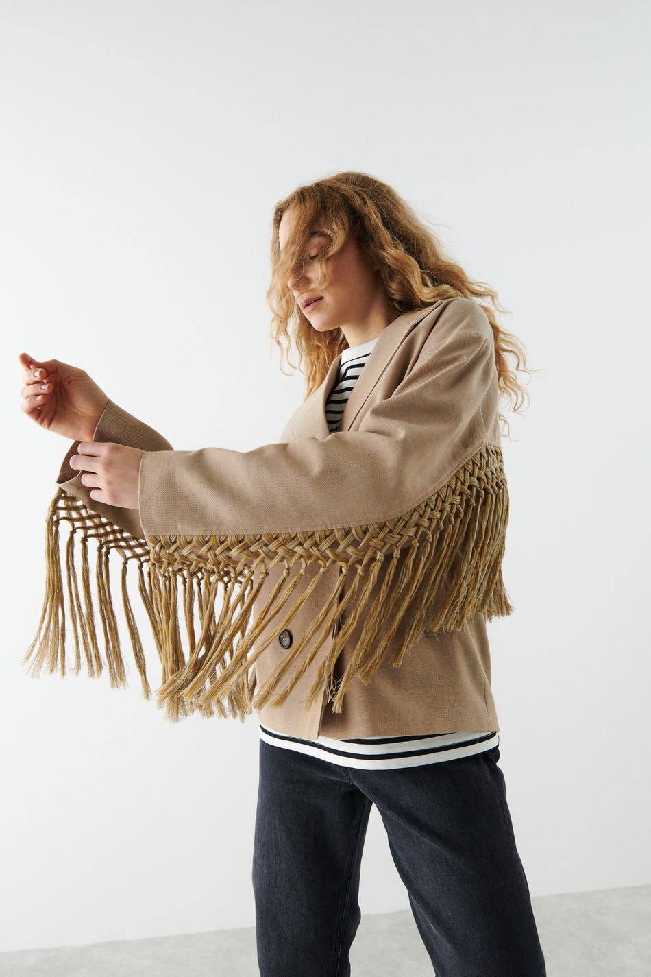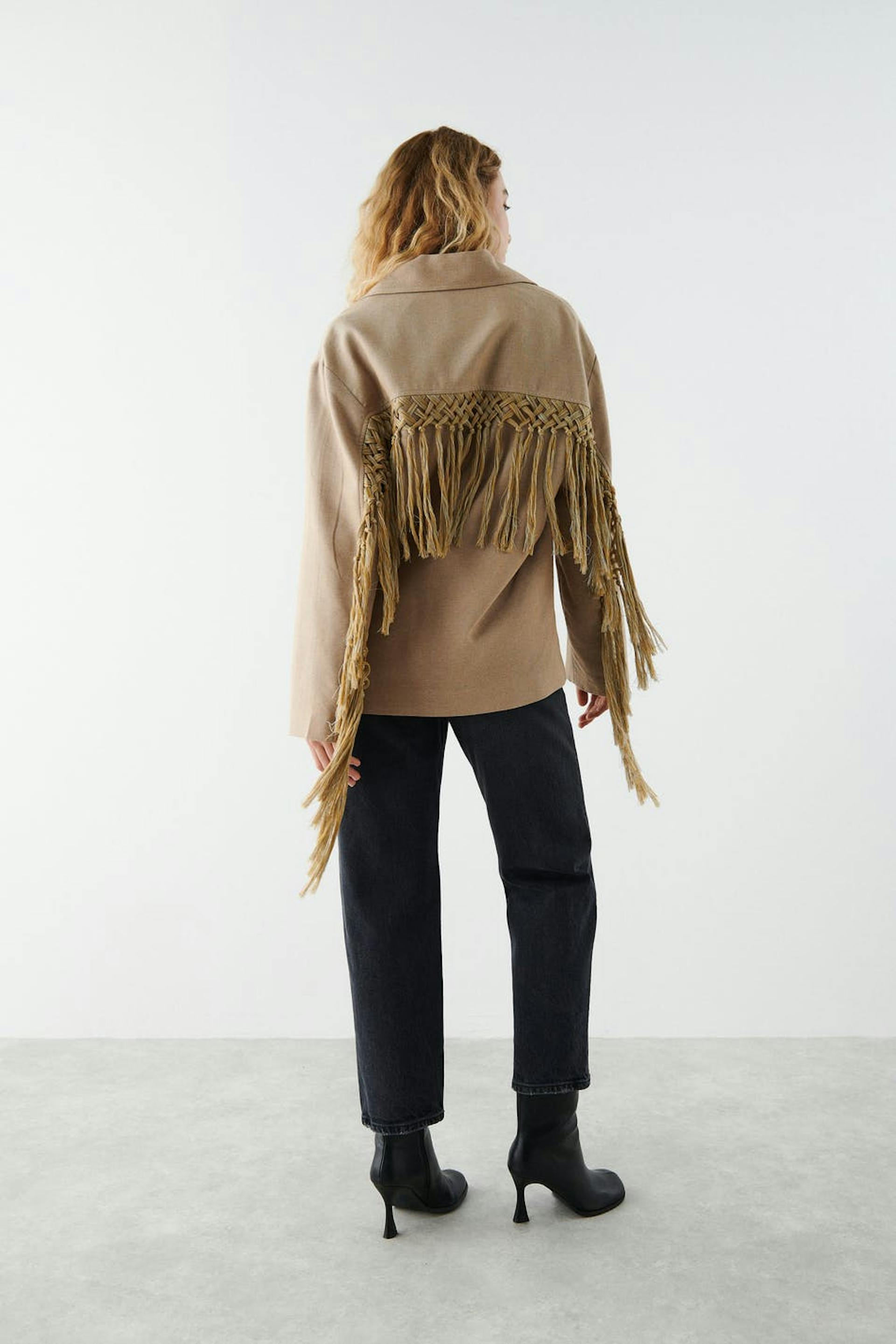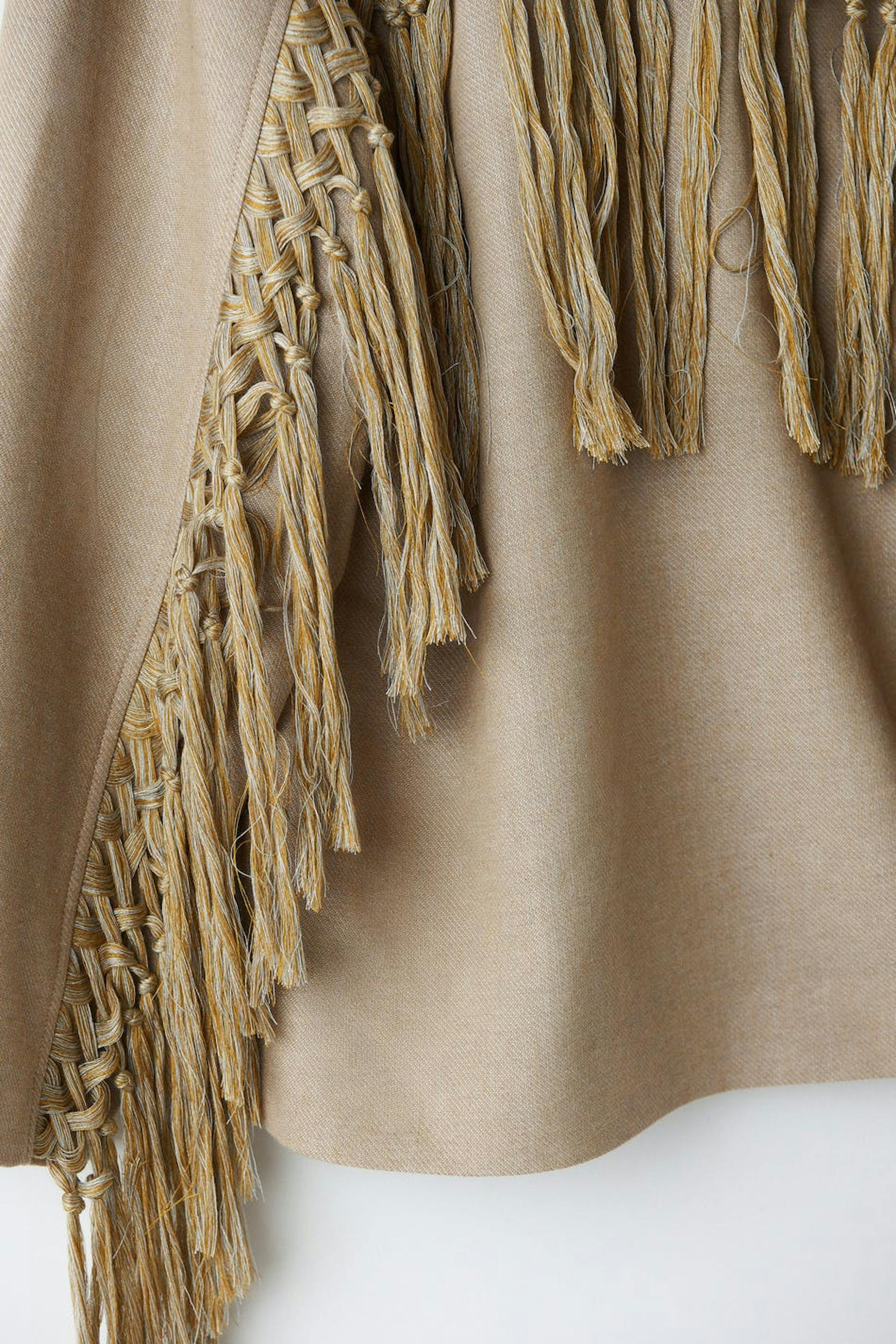Double-breasted shirt jacket with boxy fit. The jacket is beige and has voluminous sleeves. It has a wide collar with lapel, pockets on the sides and details in macramé with fringes at the back and on the sleeves.