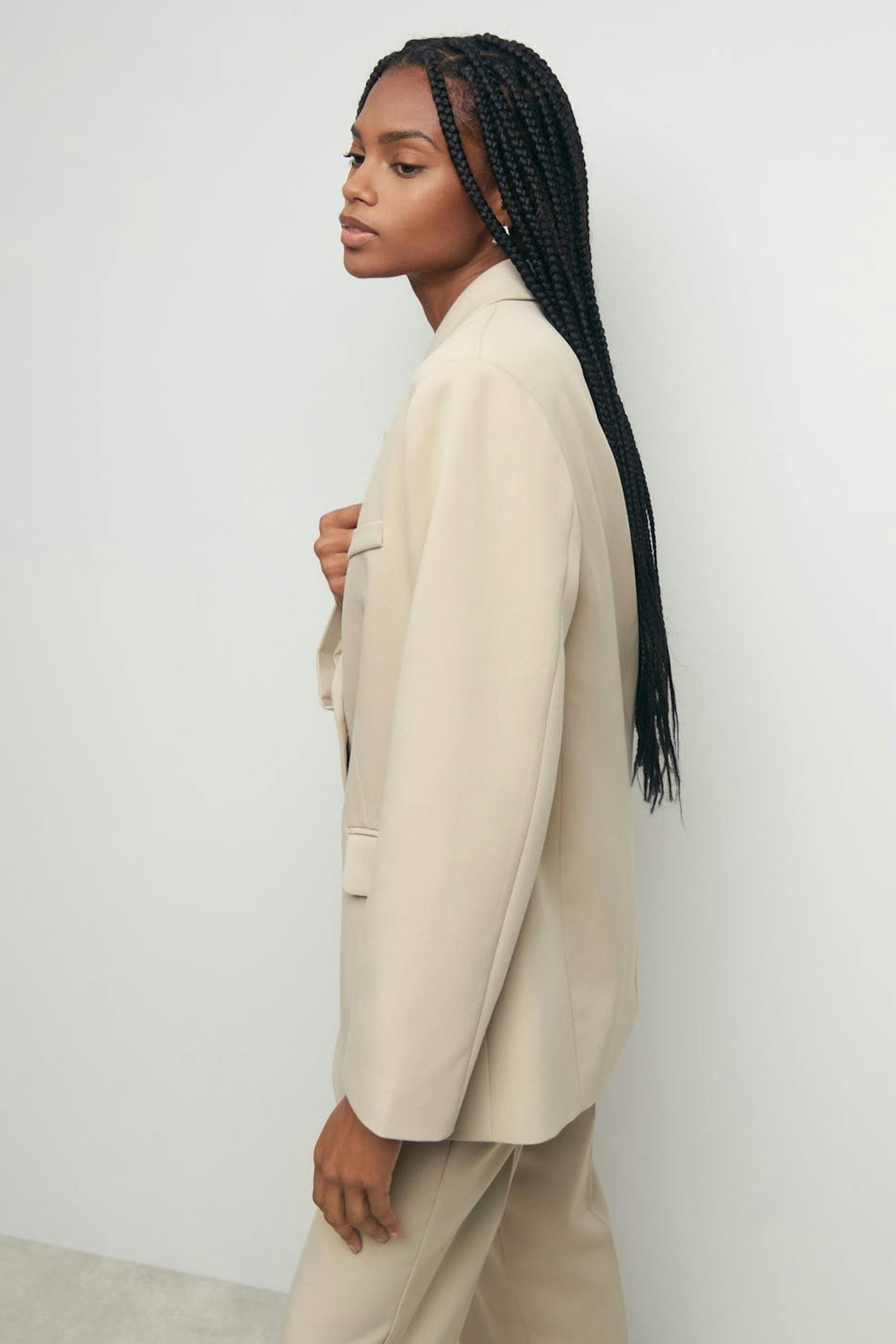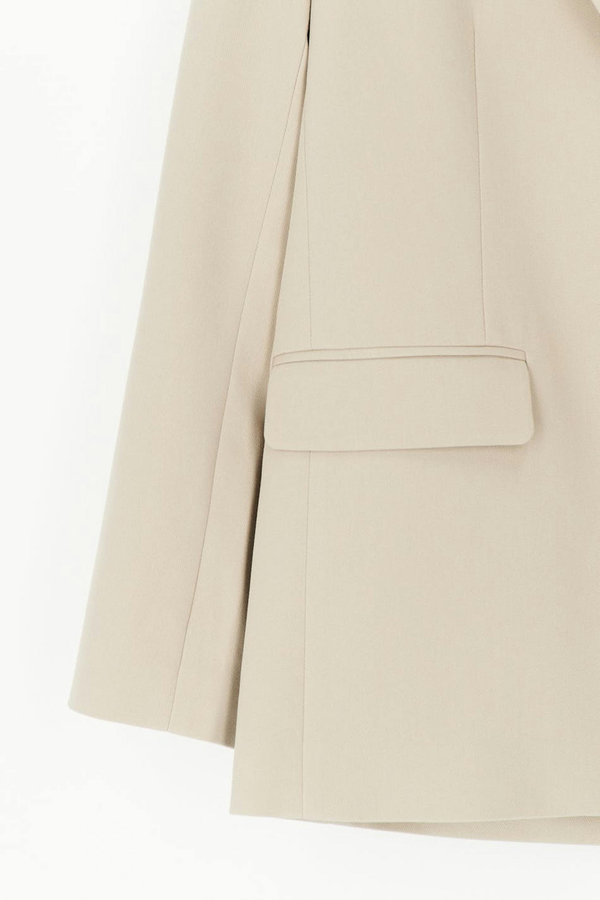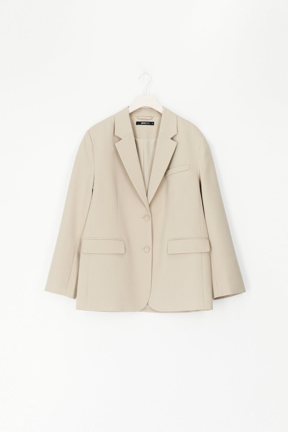 Single-breasted jacket with an oversize fit. The jacket is beige and has woven quality. It has button placket in front, a welt pocket on the chest, flap pockets in the sides and collar with lapels.