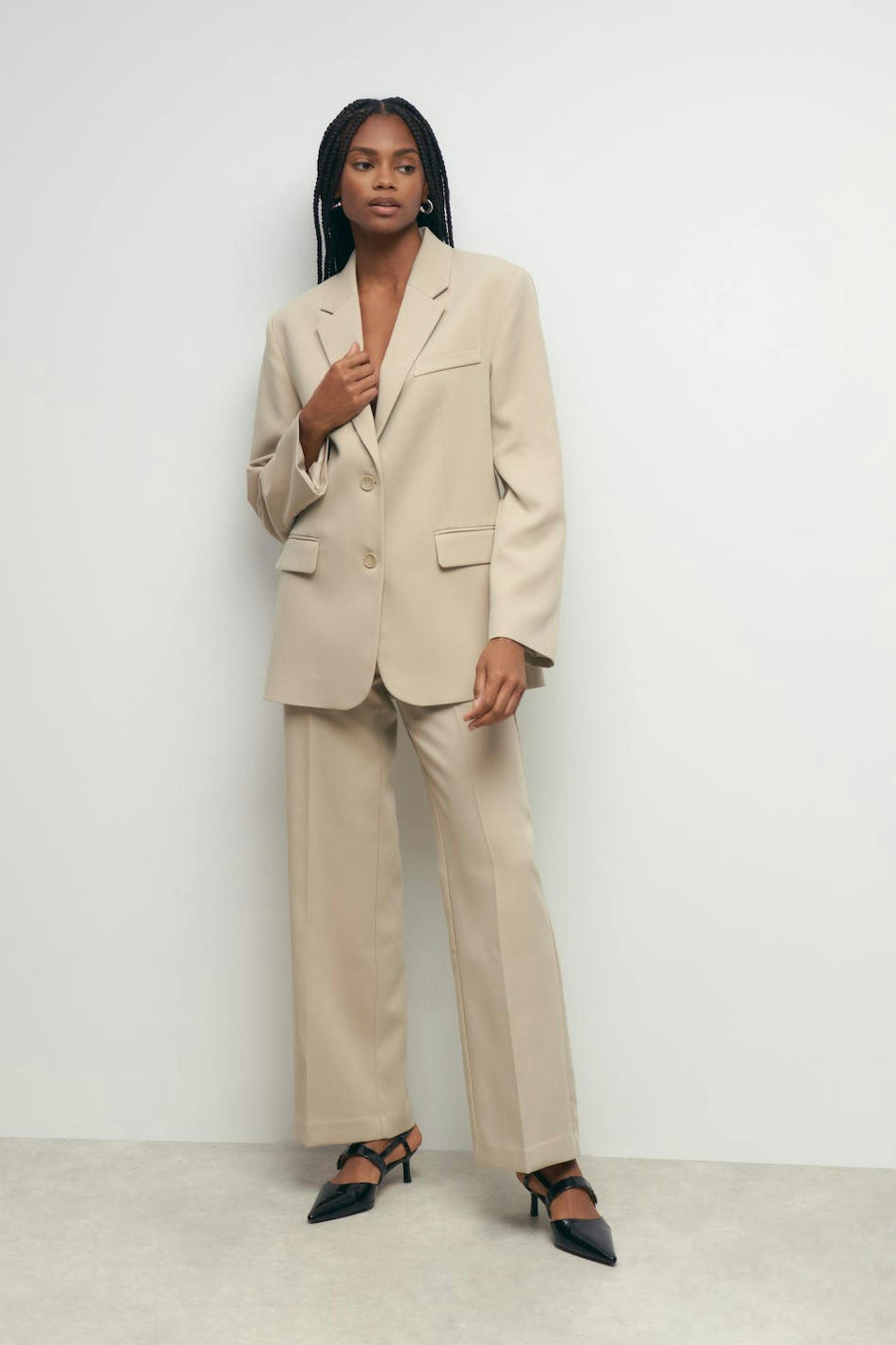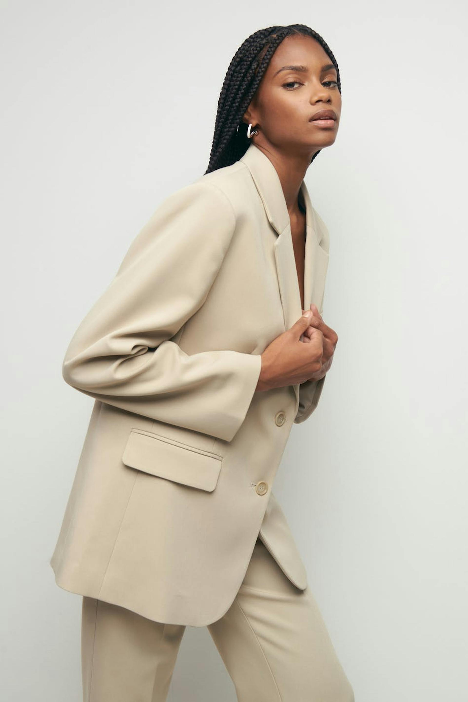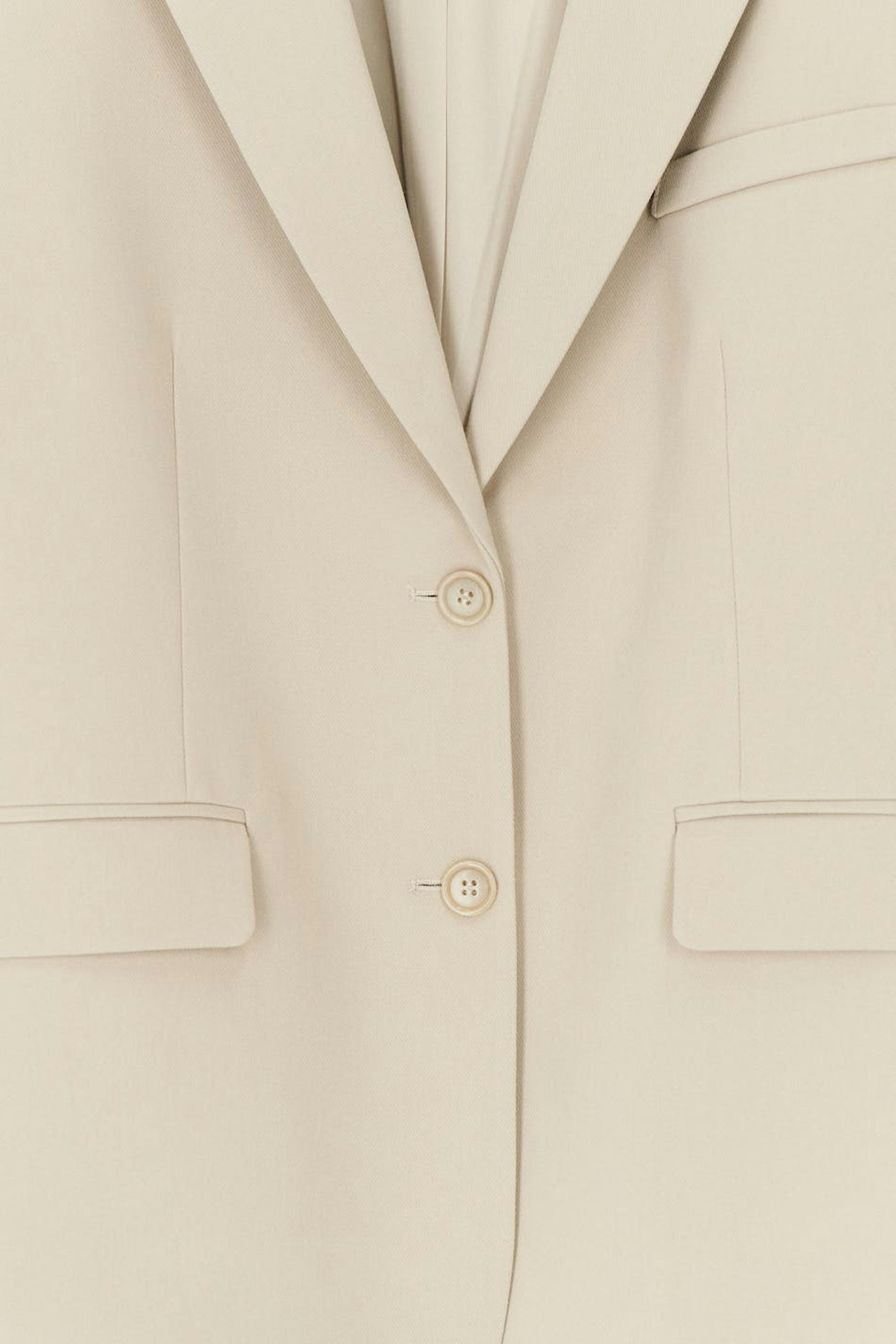 Single-breasted jacket with an oversize fit. The jacket is beige and has woven quality. It has button placket in front, a welt pocket on the chest, flap pockets in the sides and collar with lapels.