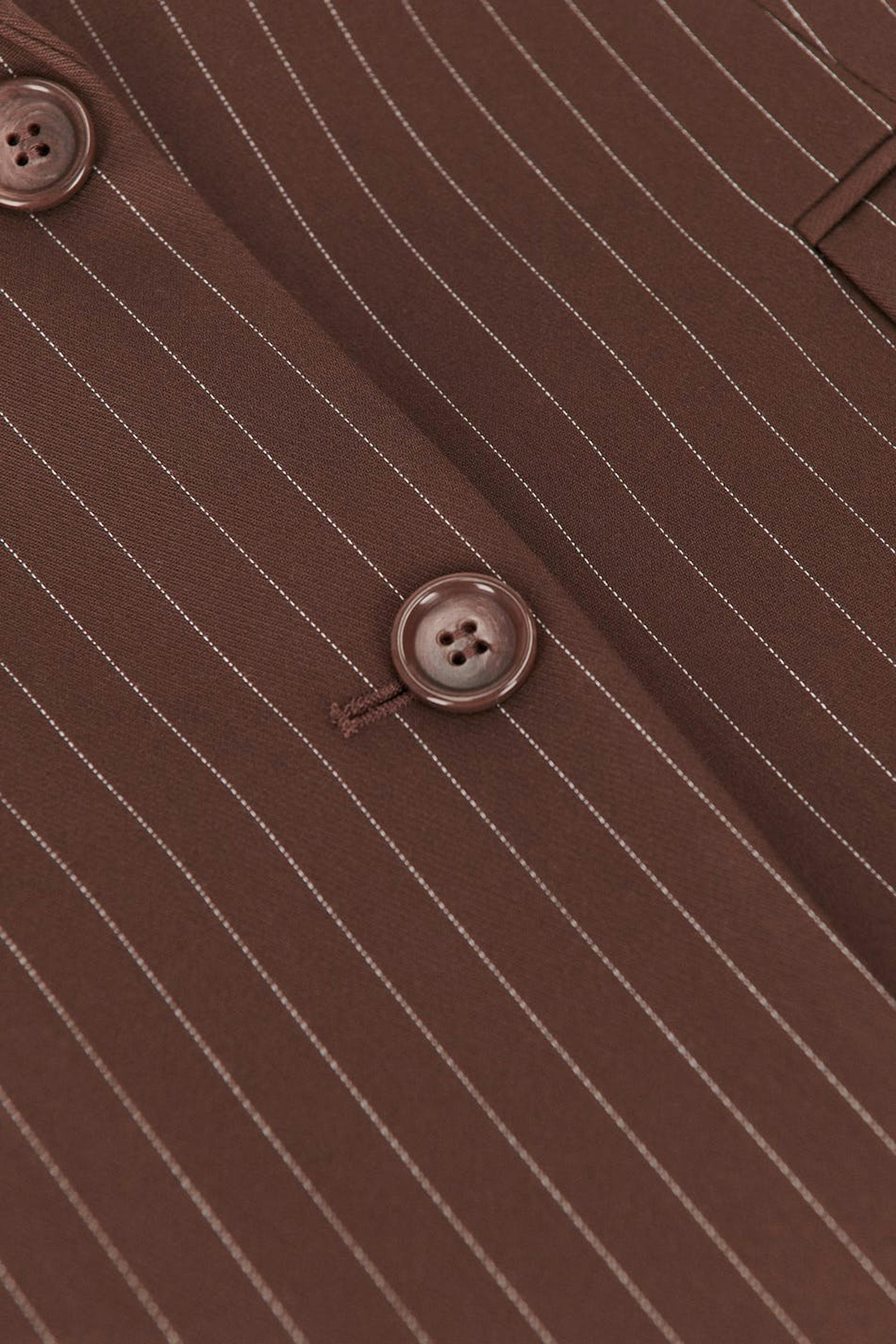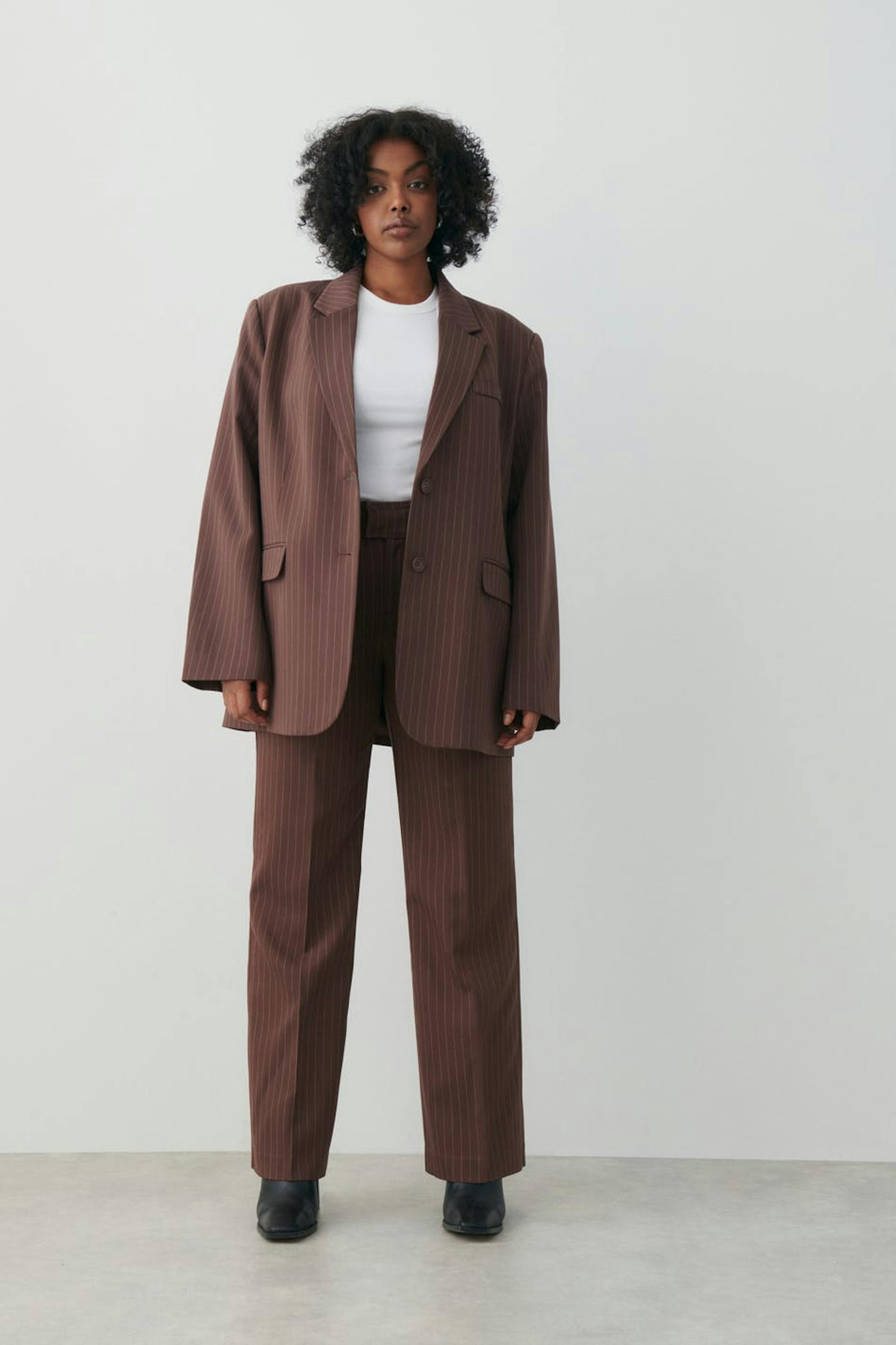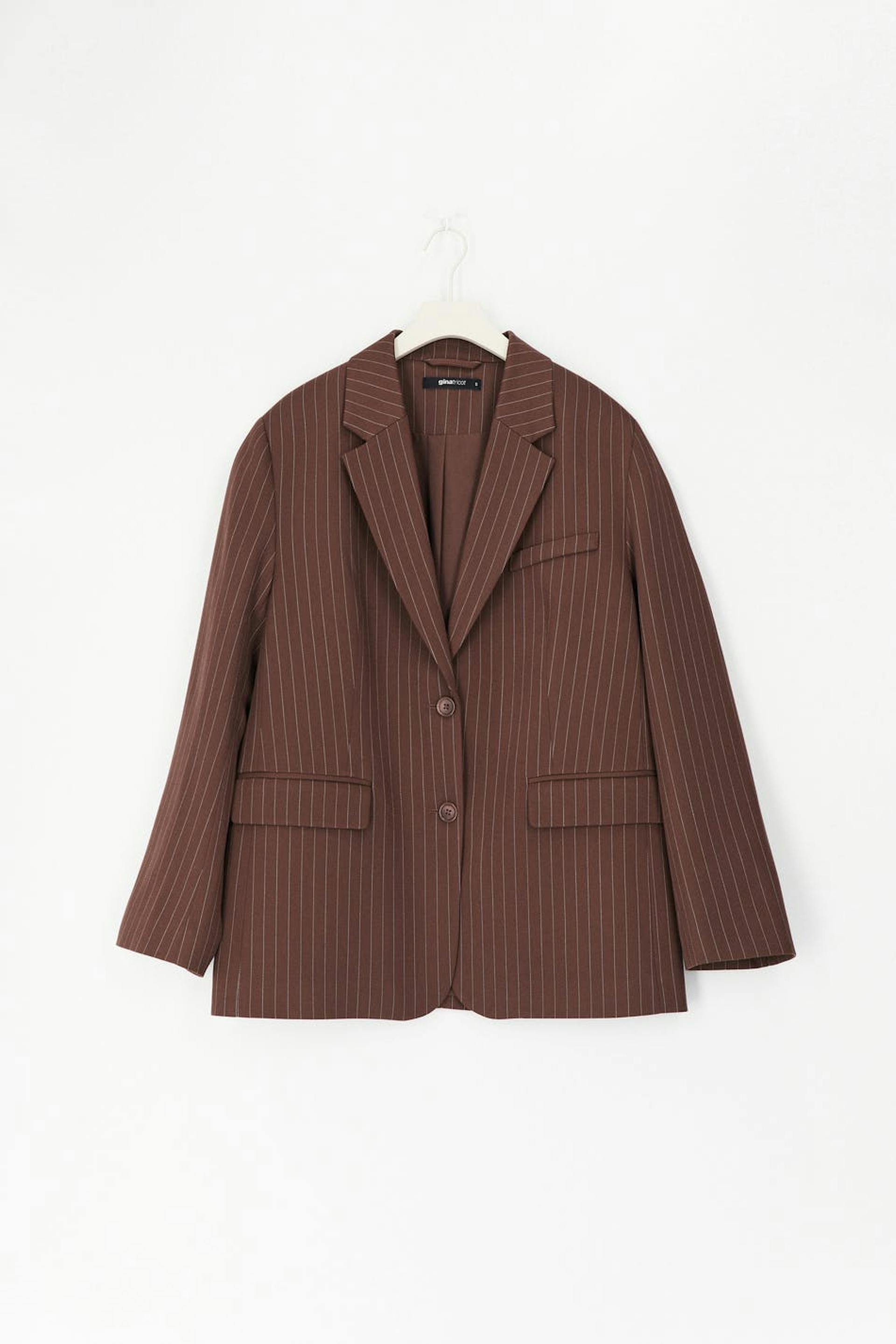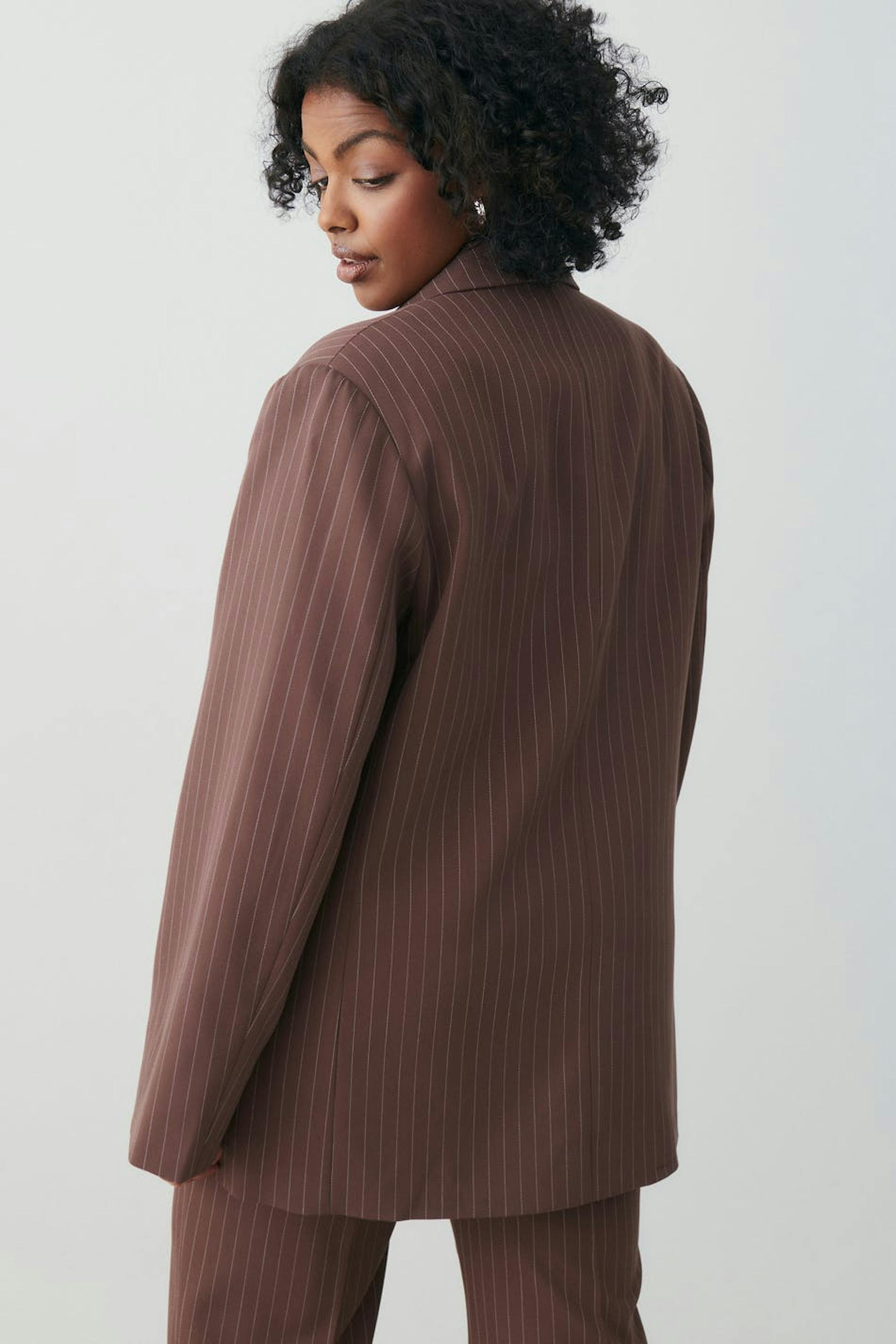 Pinstriped jacket with an oversize fit. The jacket is brown and has woven quality. It has button placket in front, a welt pocket on the chest, flap pockets in the sides and collar with lapels.
