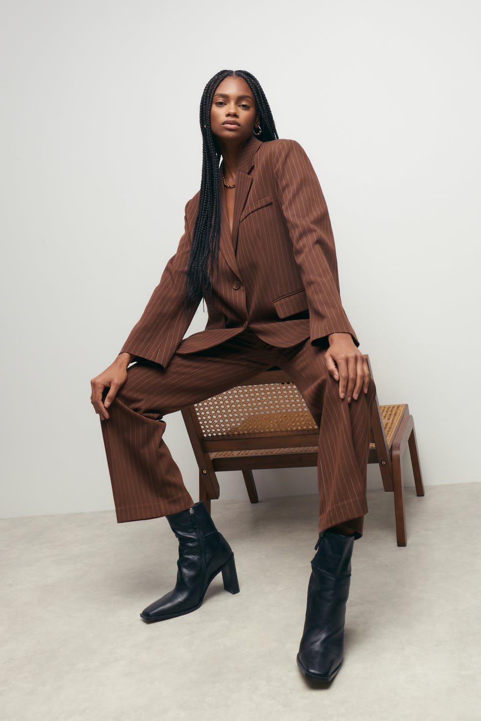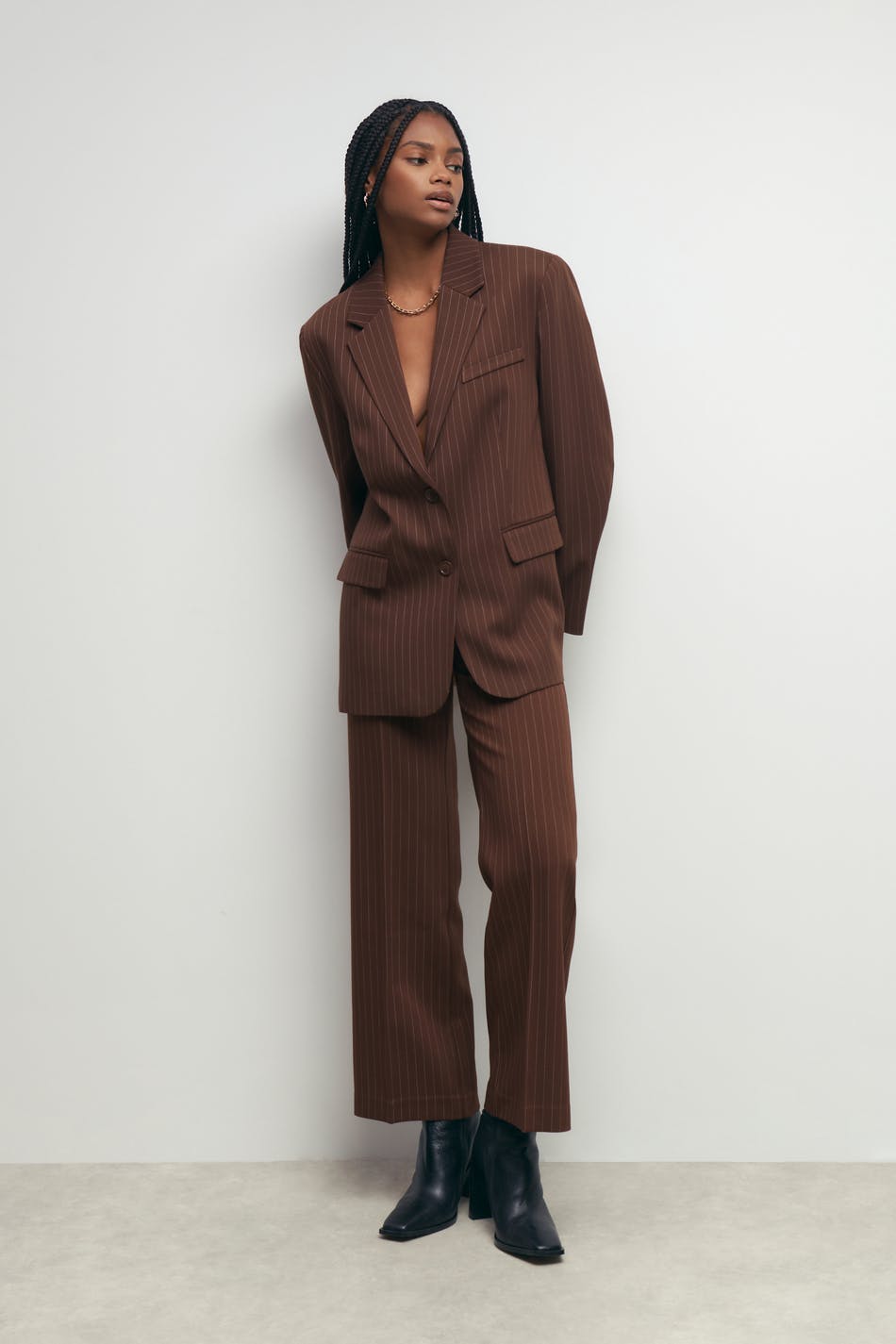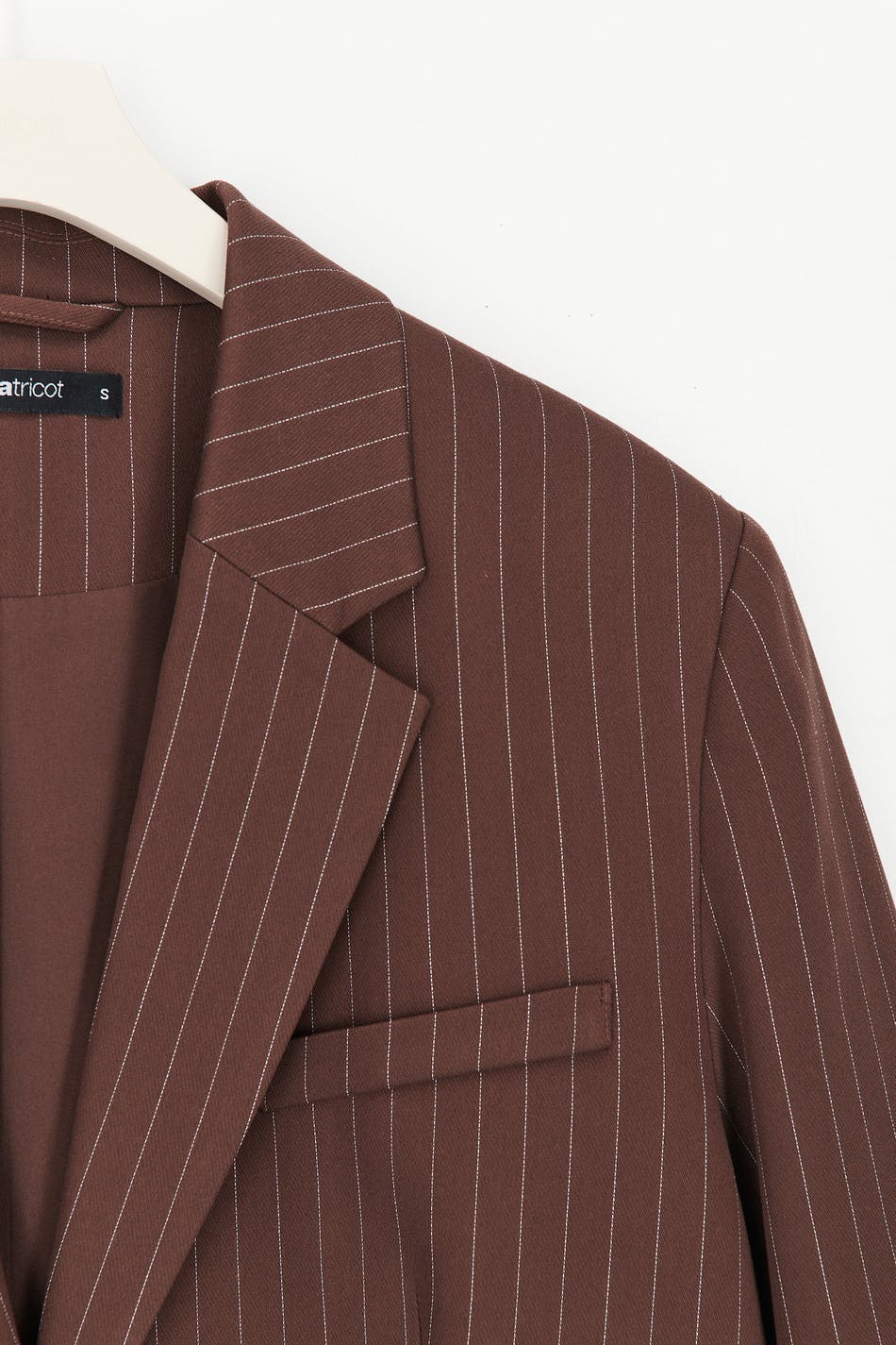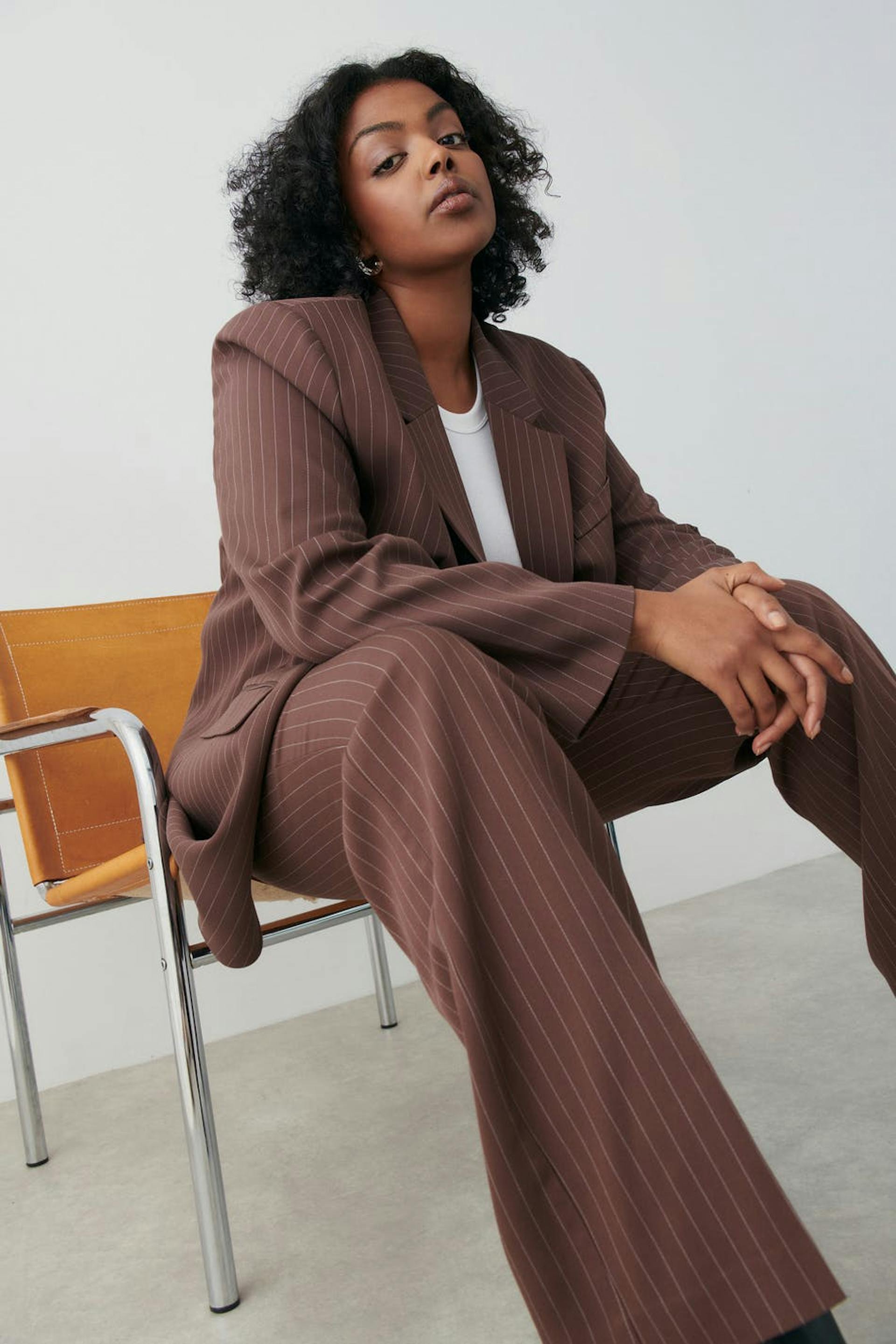 Pinstriped jacket with an oversize fit. The jacket is brown and has woven quality. It has button placket in front, a welt pocket on the chest, flap pockets in the sides and collar with lapels.