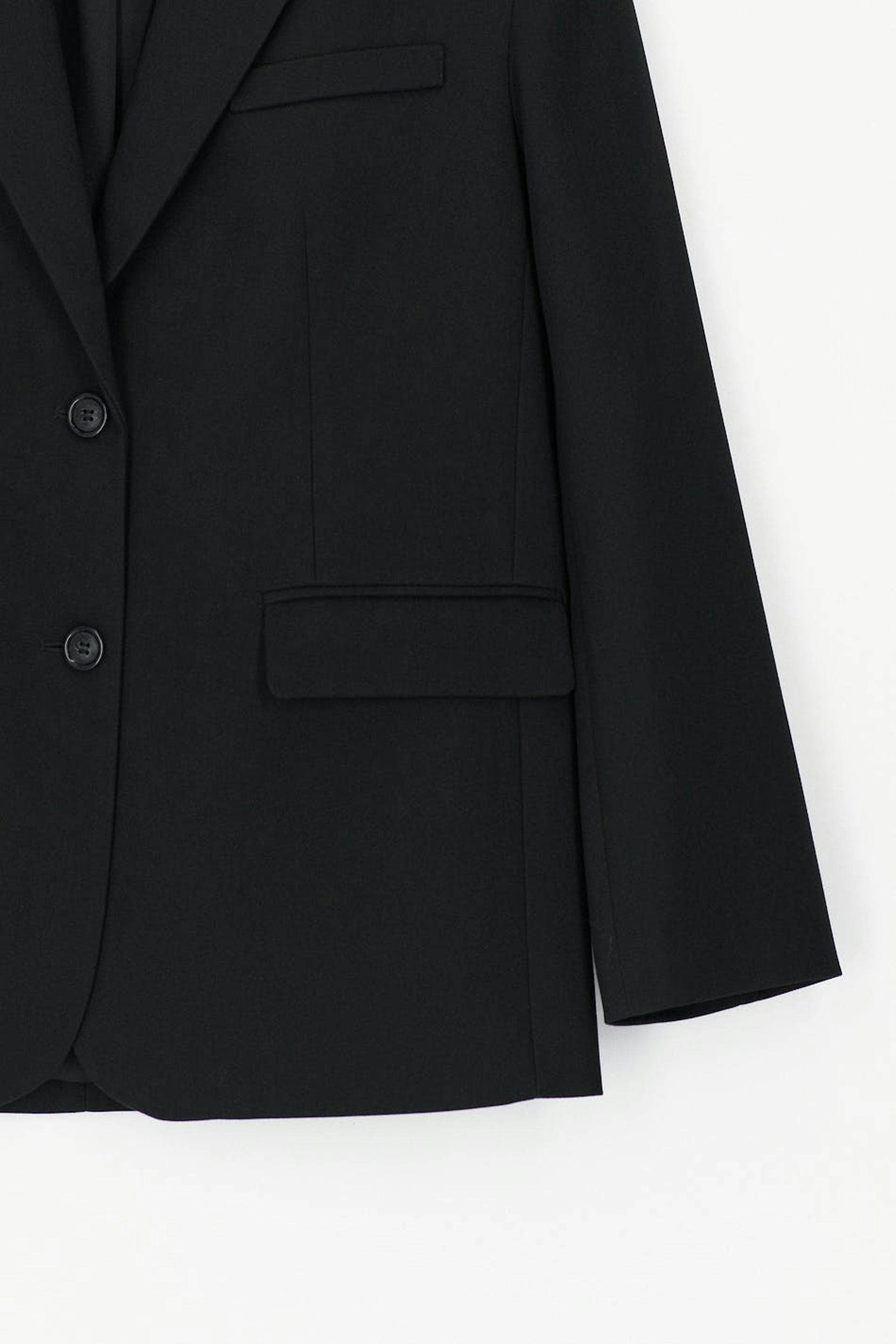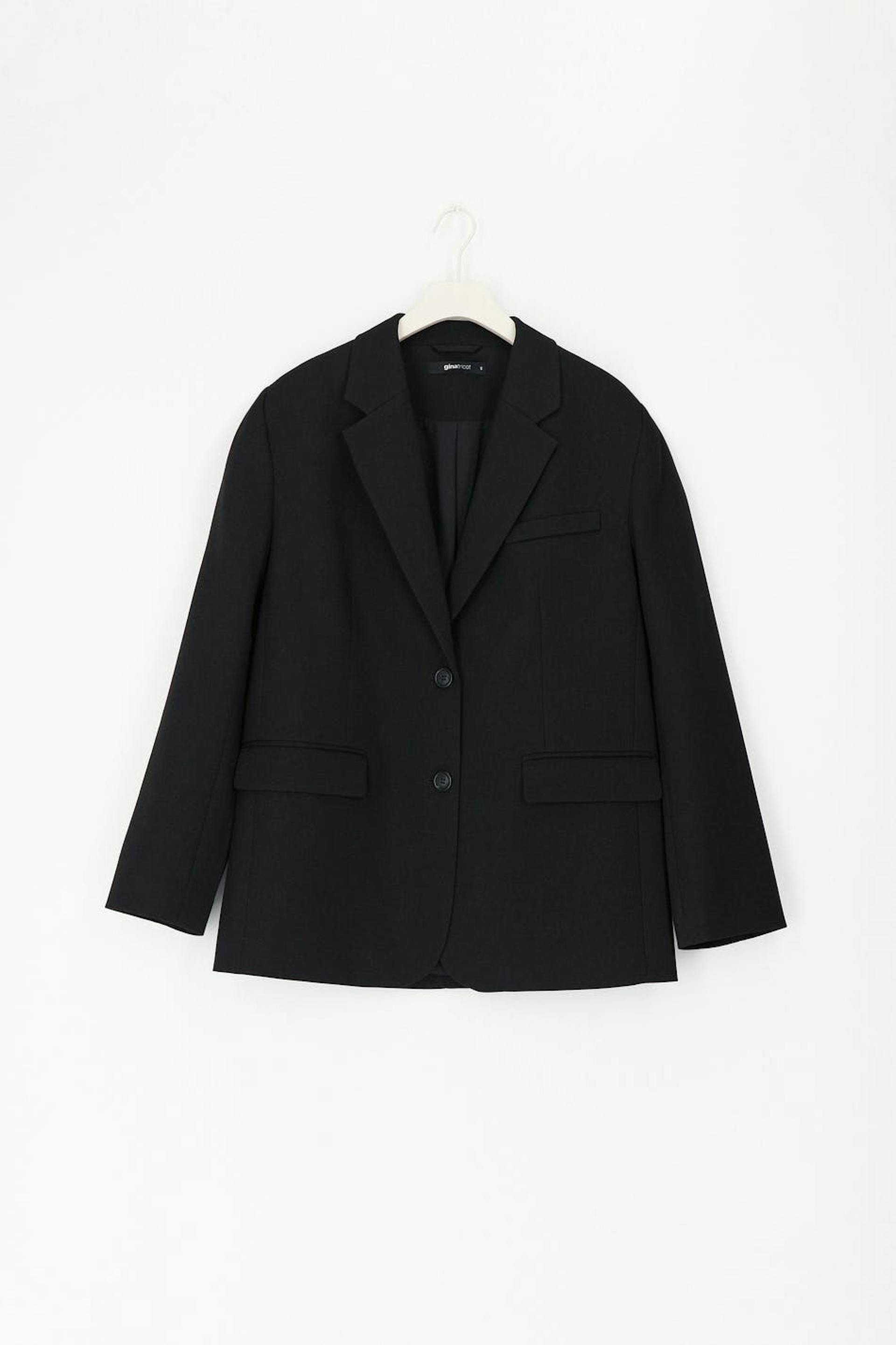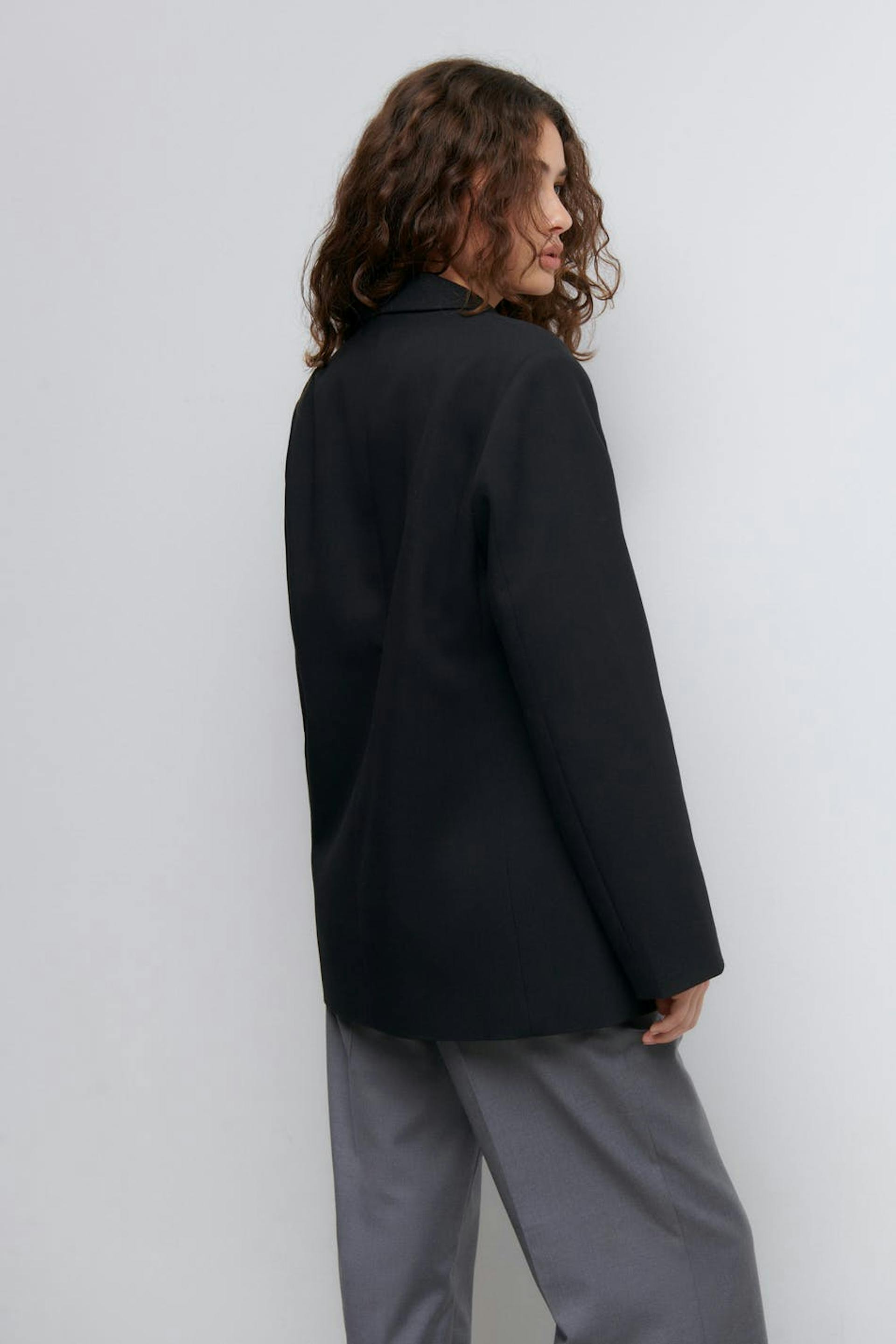 Single-breasted jacket with an oversize fit. The jacket is black and has woven quality. It has button placket in front, a welt pocket on the chest, flap pockets in the sides and collar with lapels.