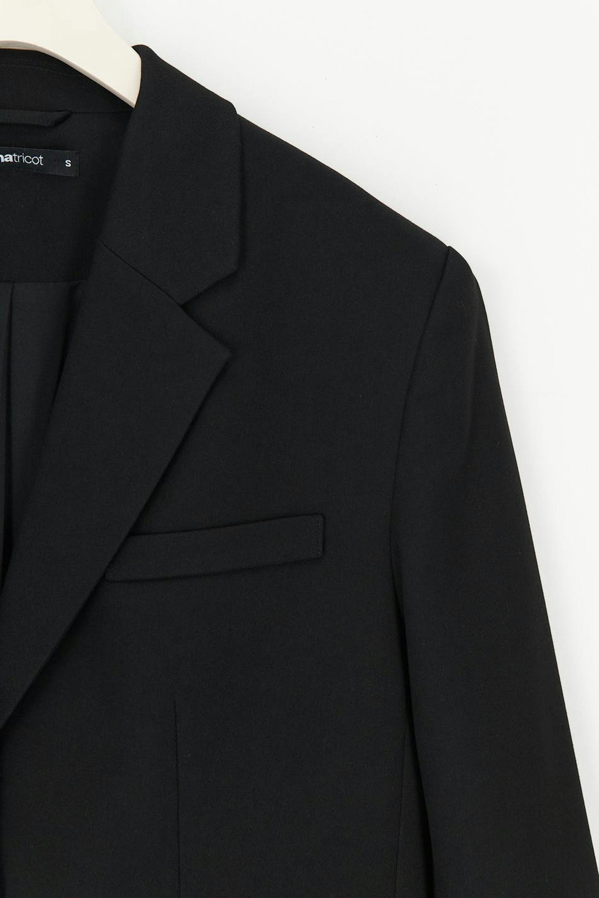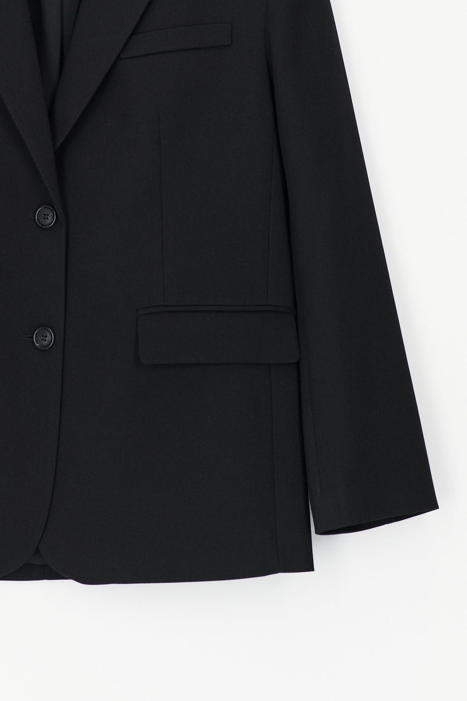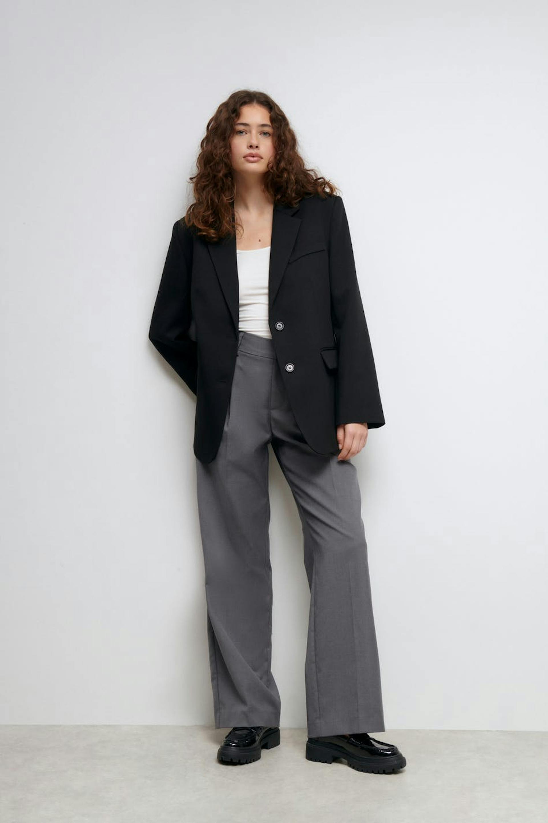Single-breasted jacket with an oversize fit. The jacket is black and has woven quality. It has button placket in front, a welt pocket on the chest, flap pockets in the sides and collar with lapels.