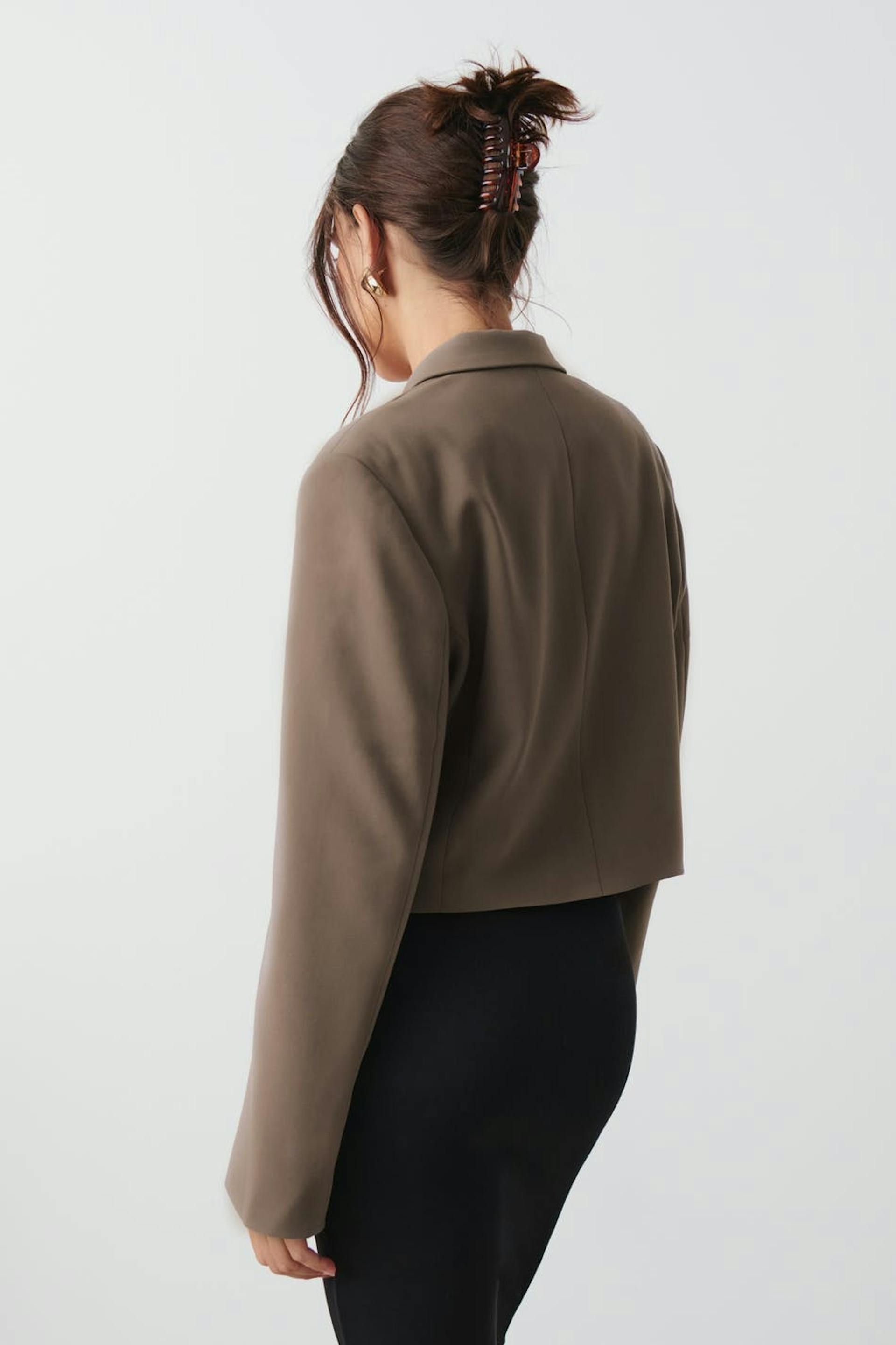 Cropped jacket. The jacket is brown, double-breasted and long-sleeved.