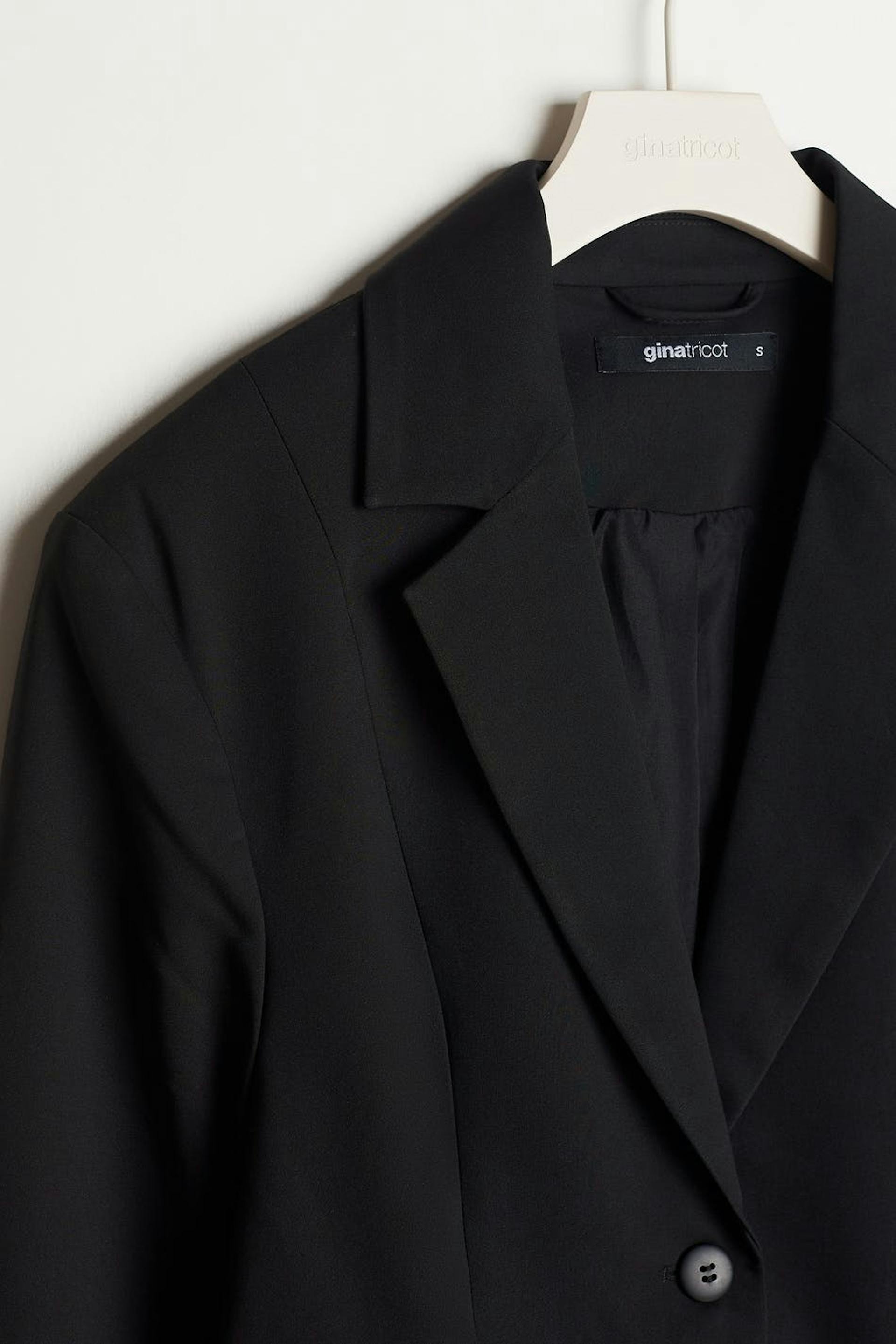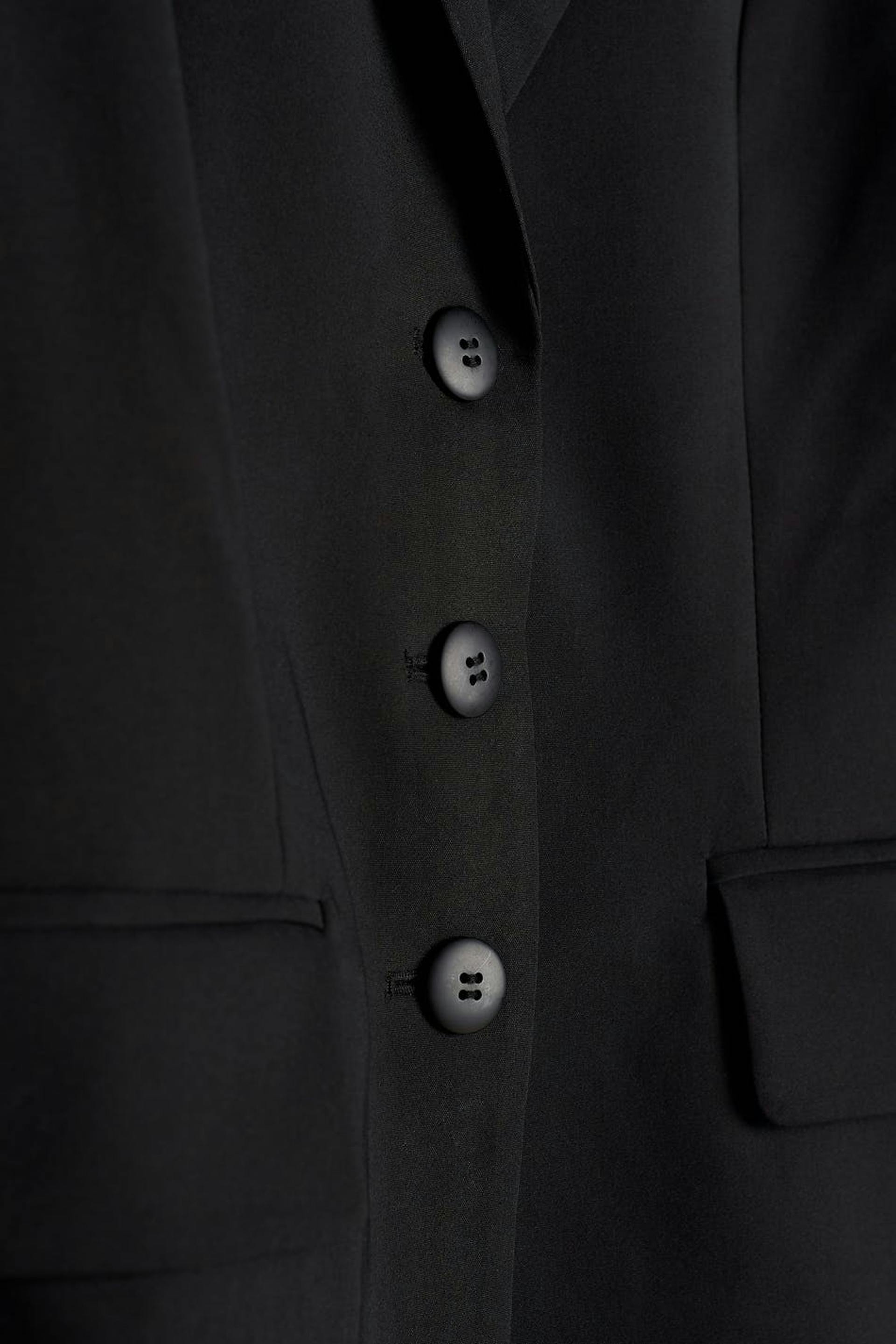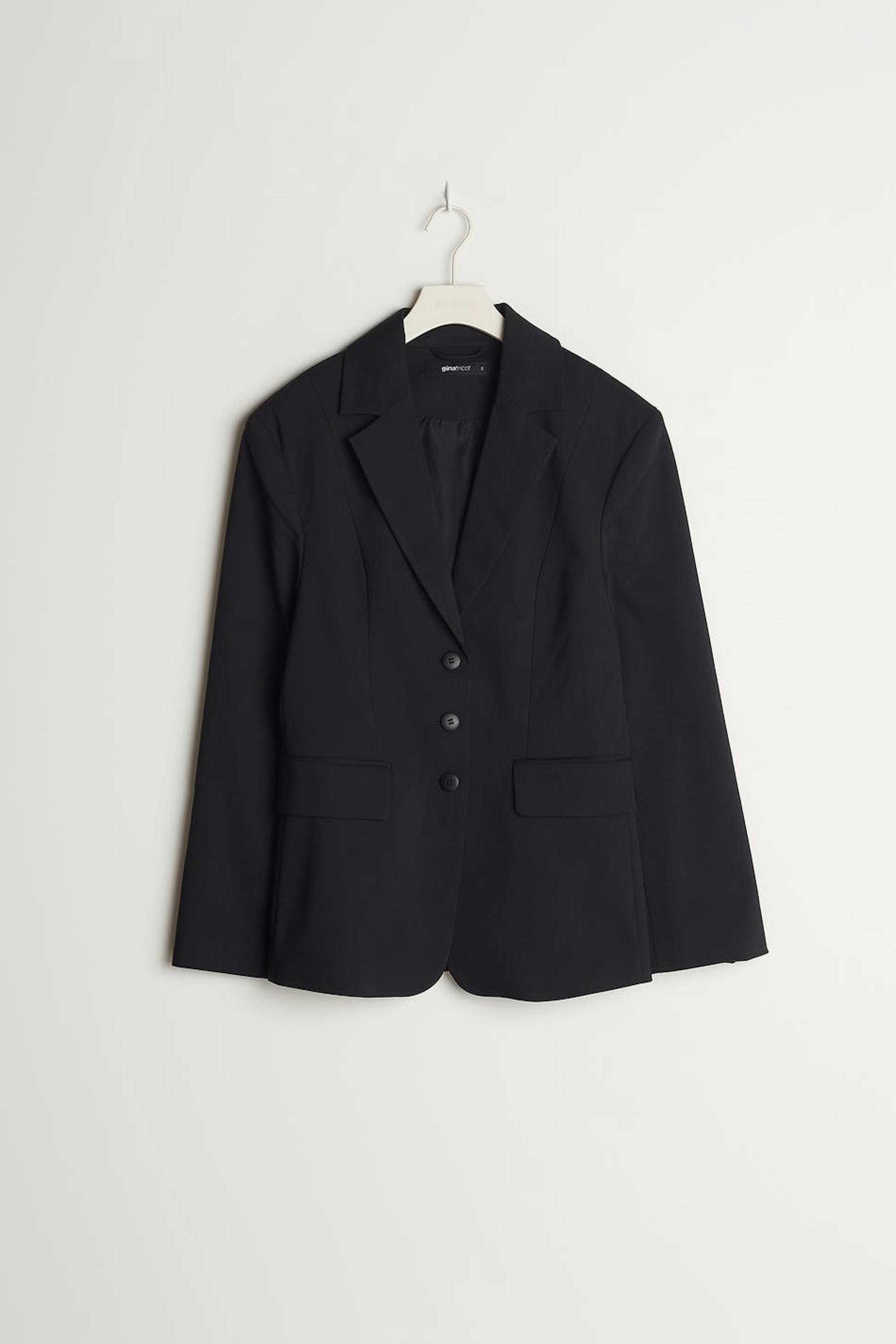 Tailored jacket with three buttons at the front. The jacket is black and has flap pockets at the front. It has a traditional collar and seam details in the back.