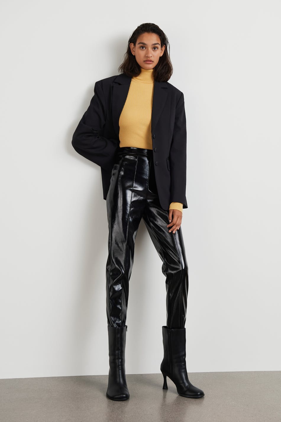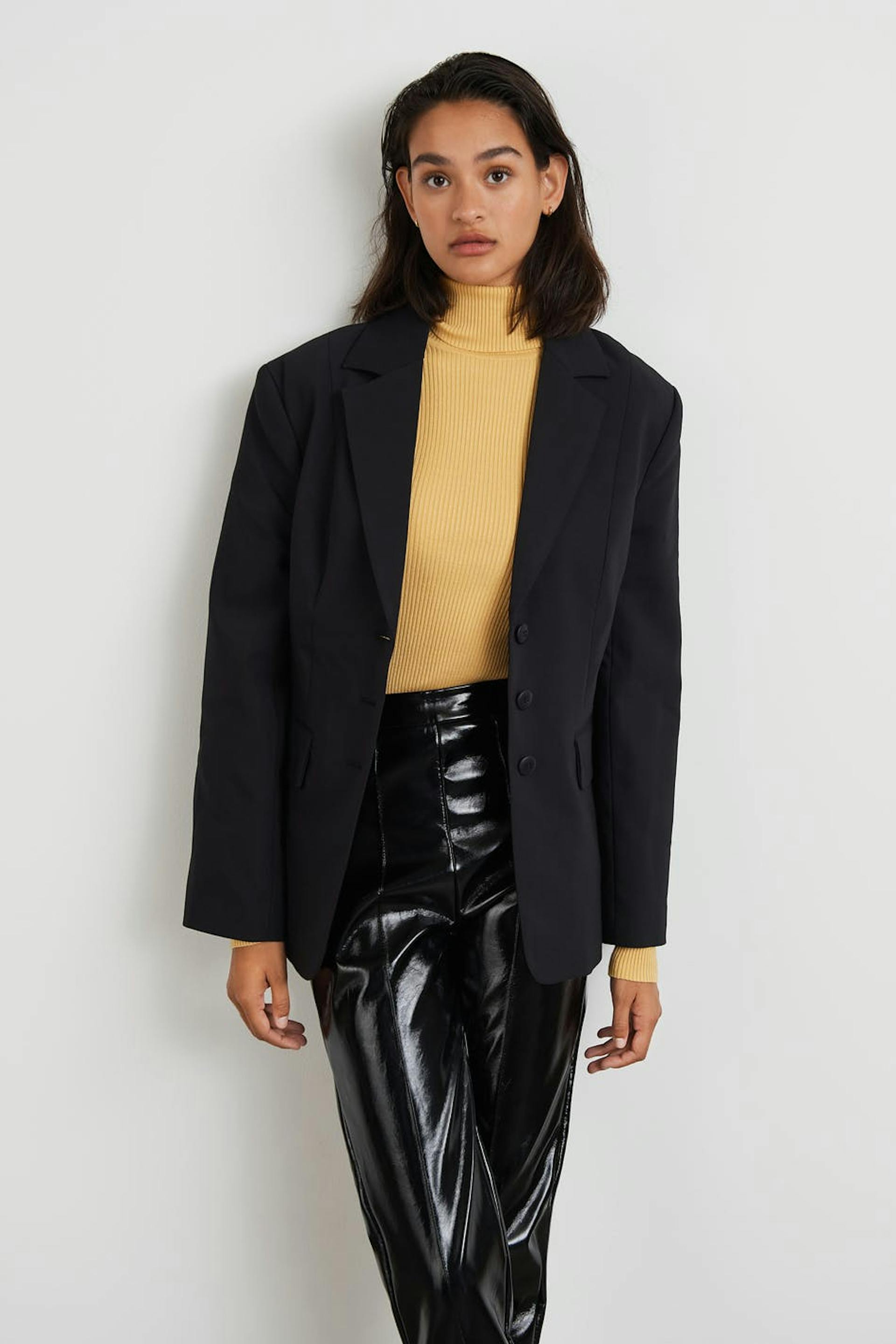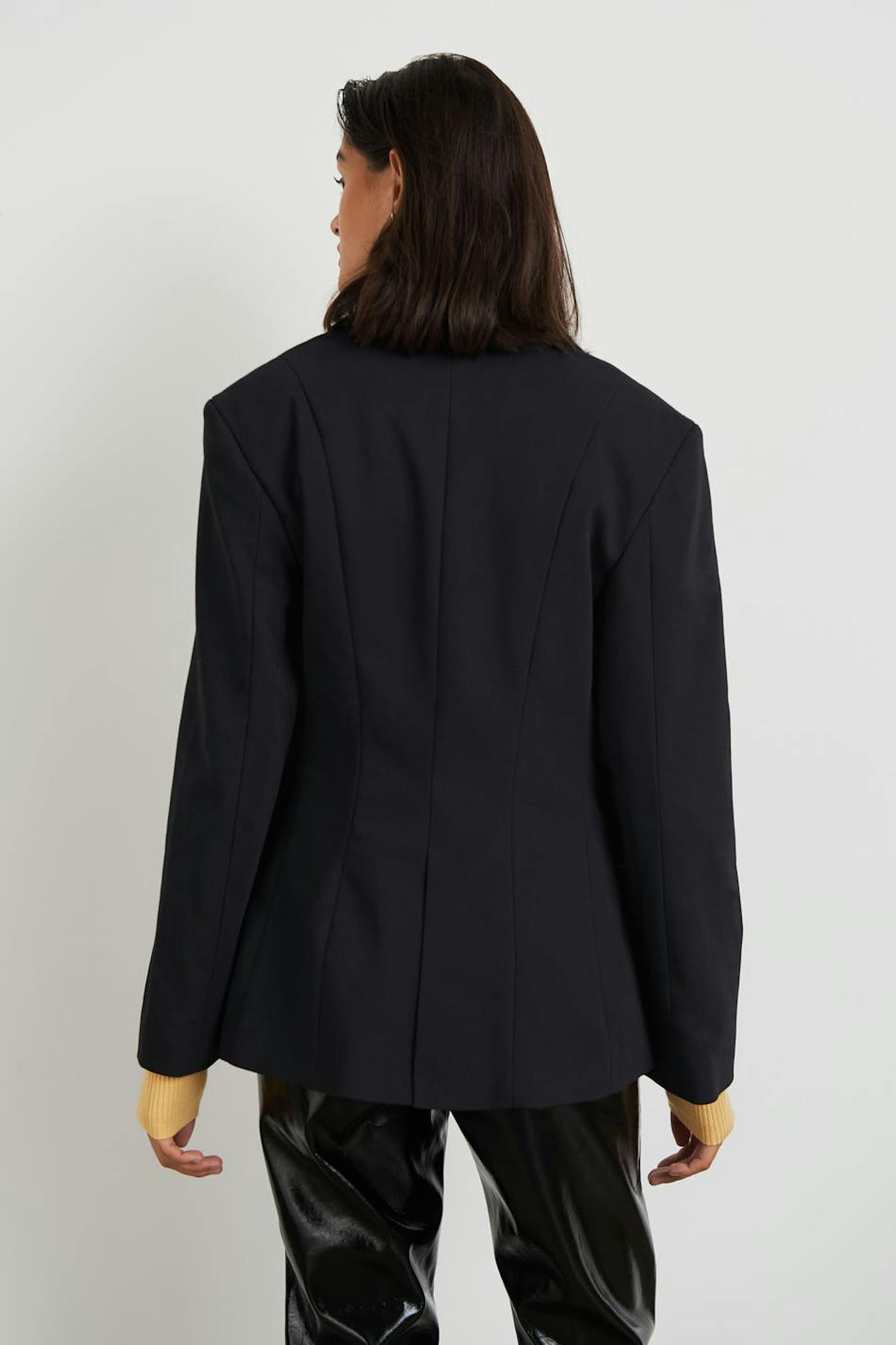 Tailored jacket with three buttons at the front. The jacket is black and has flap pockets at the front. It has a traditional collar and seam details in the back.