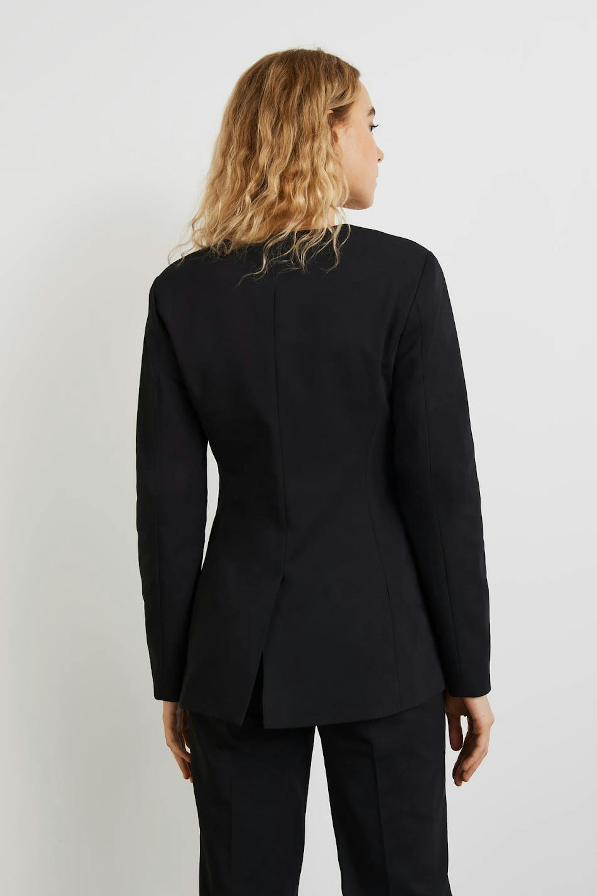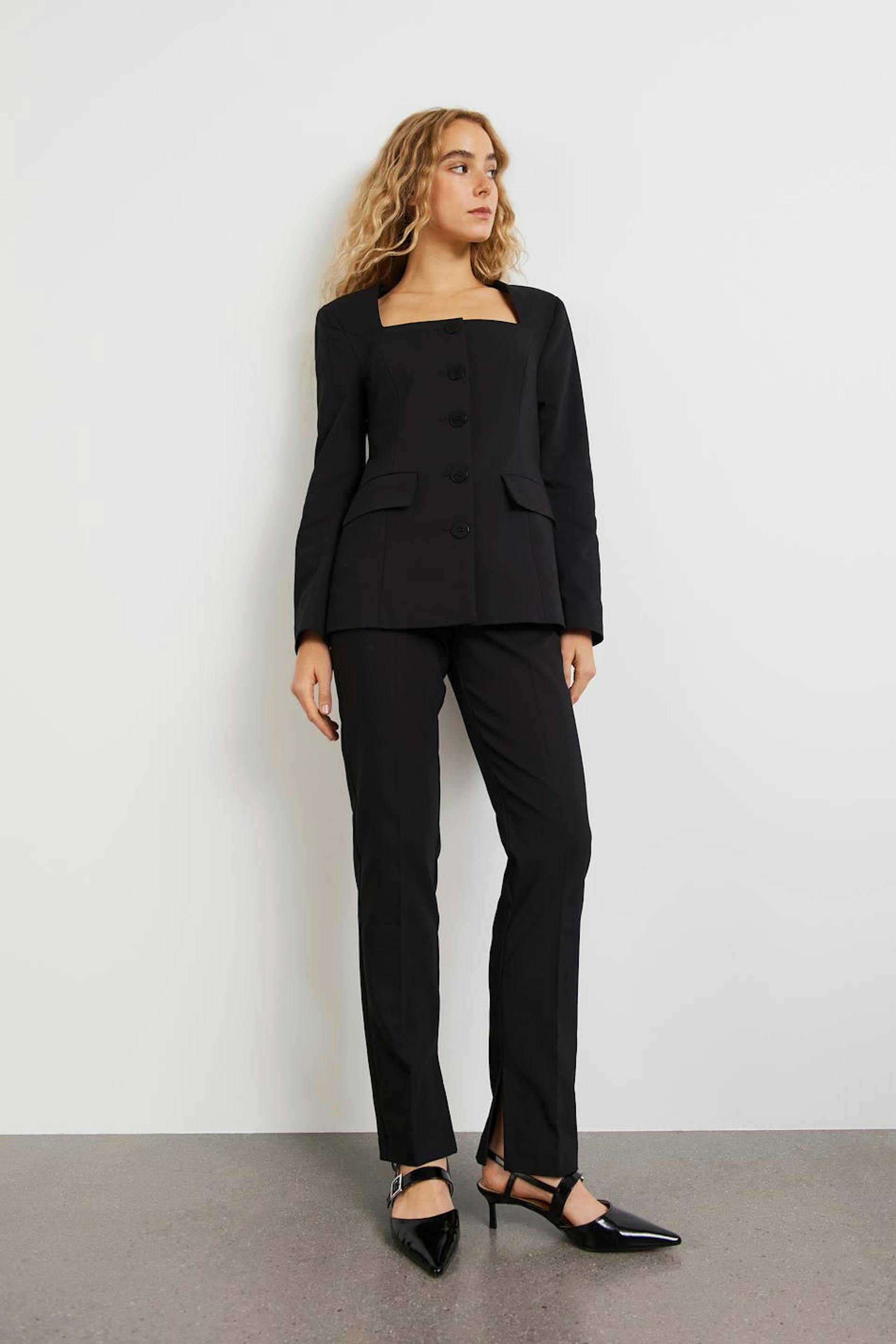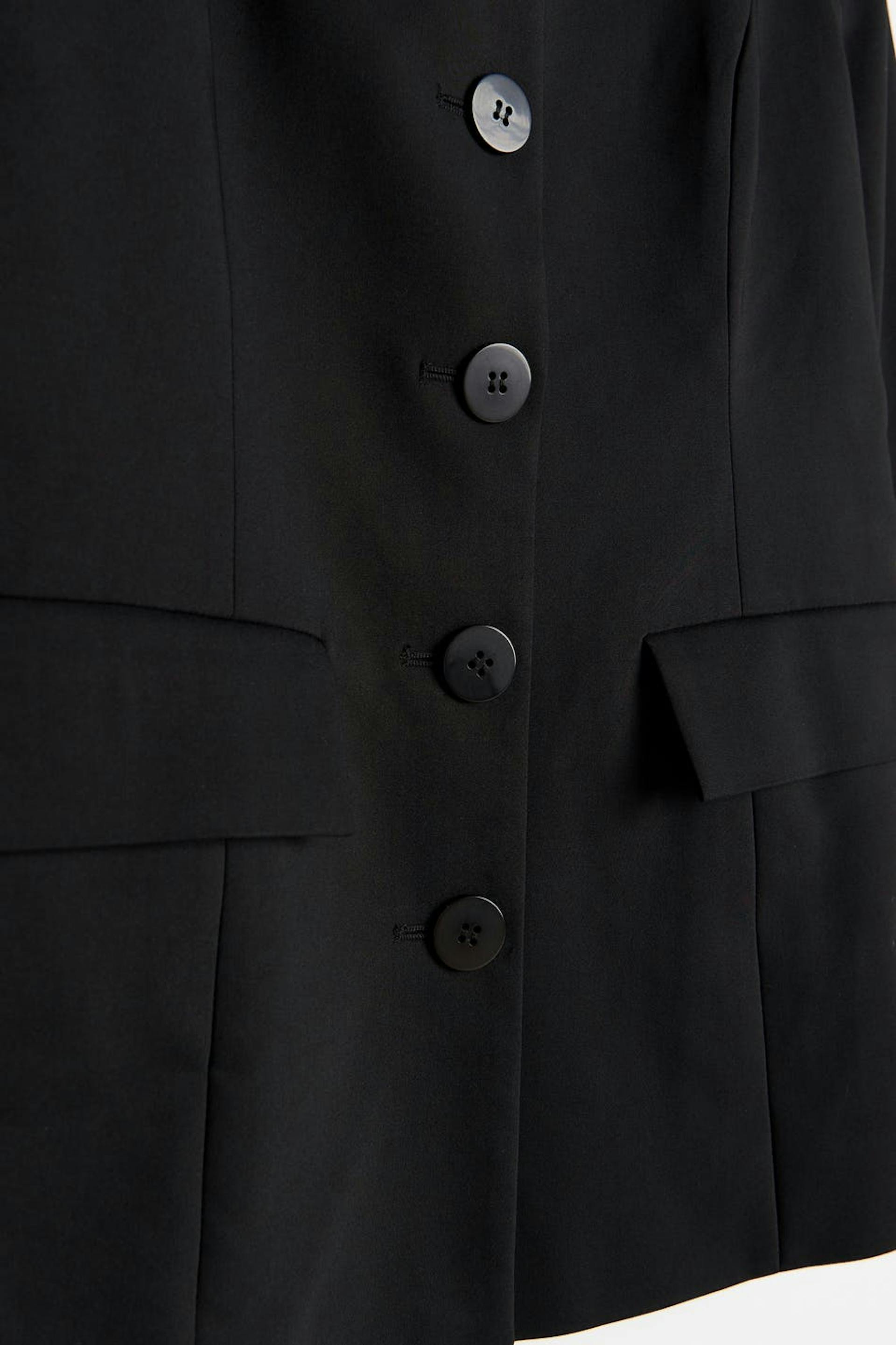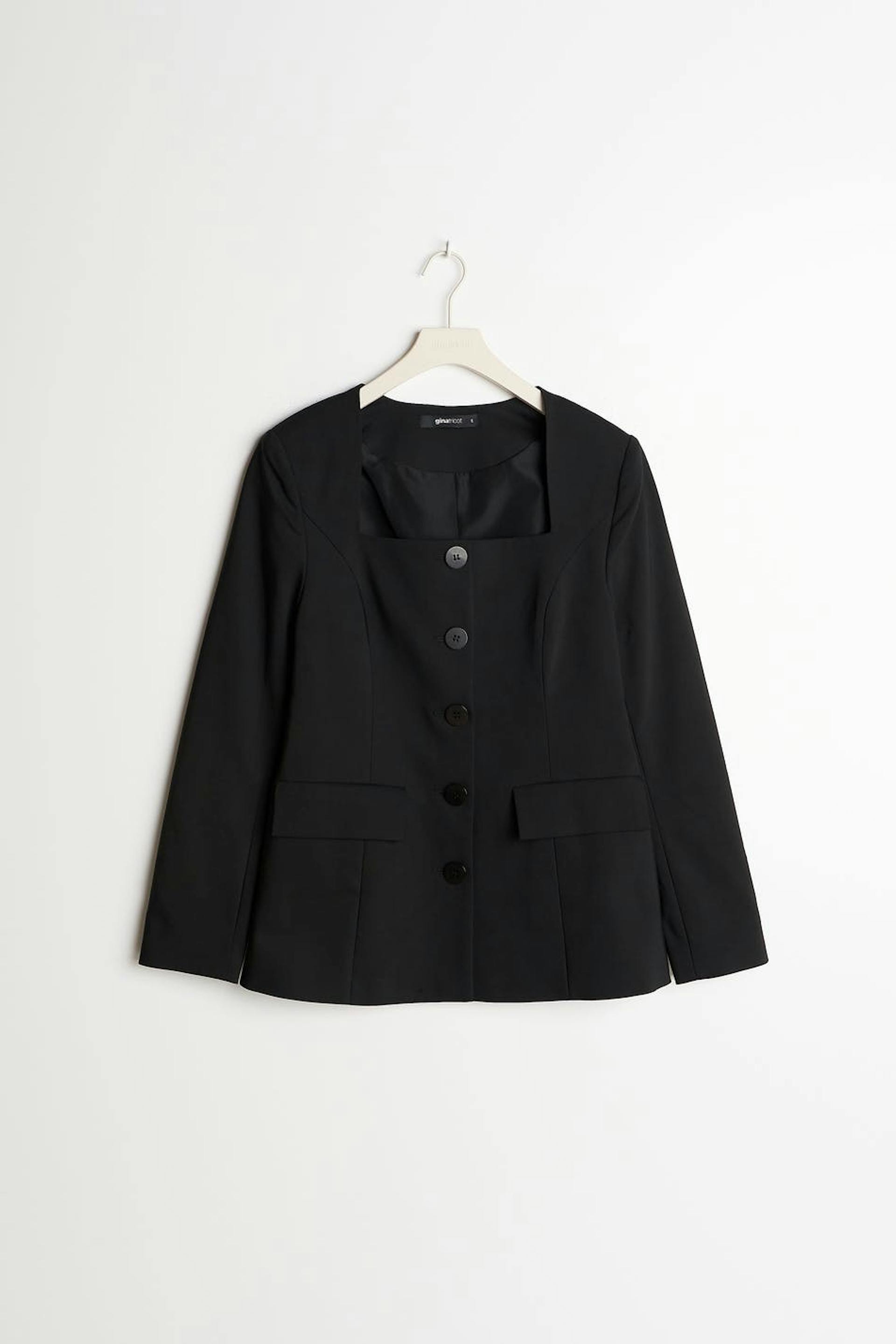 Fitted jacket with square neckline. The jacket is black and has flap pockets. It has a button placket in front and a vent at the back.