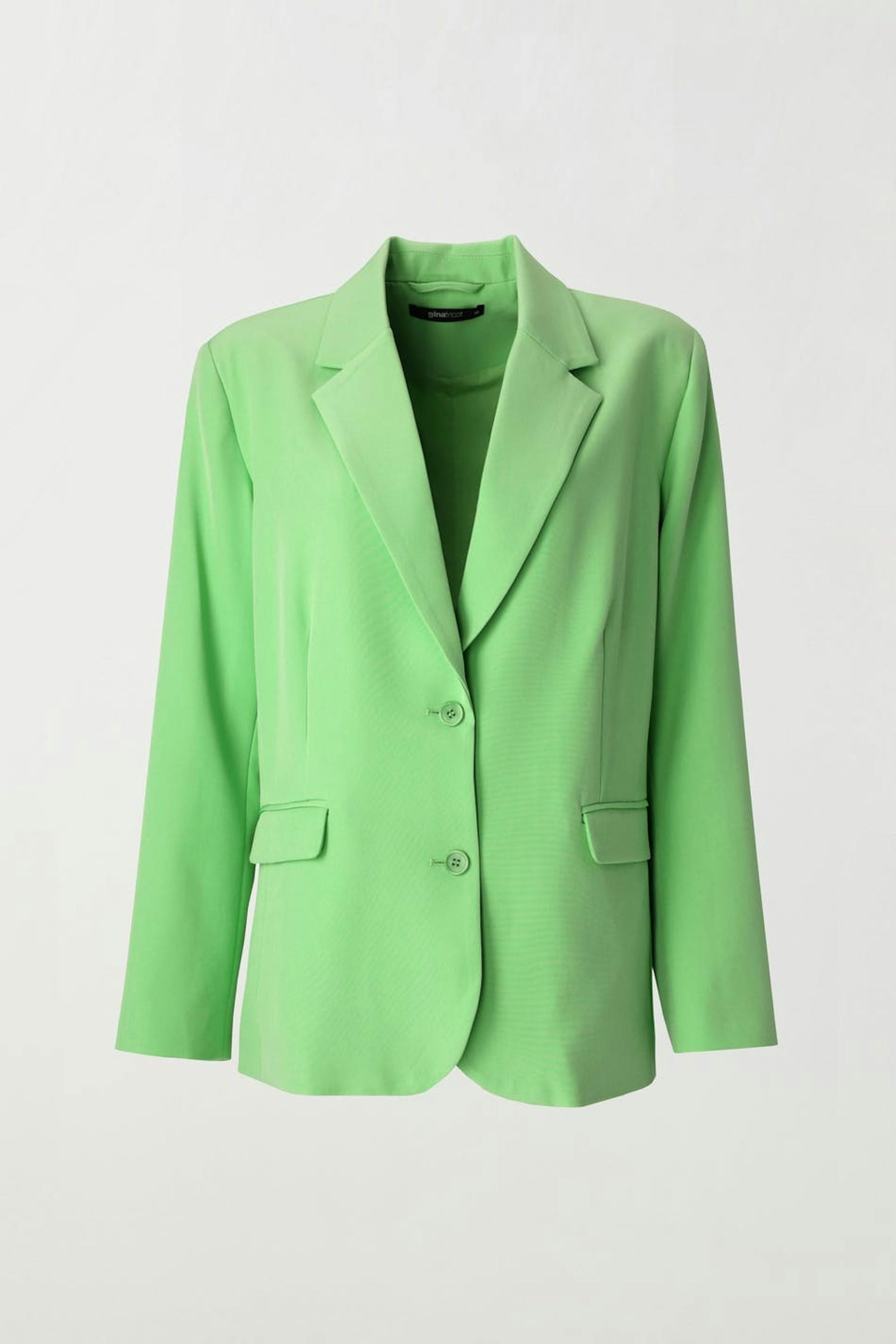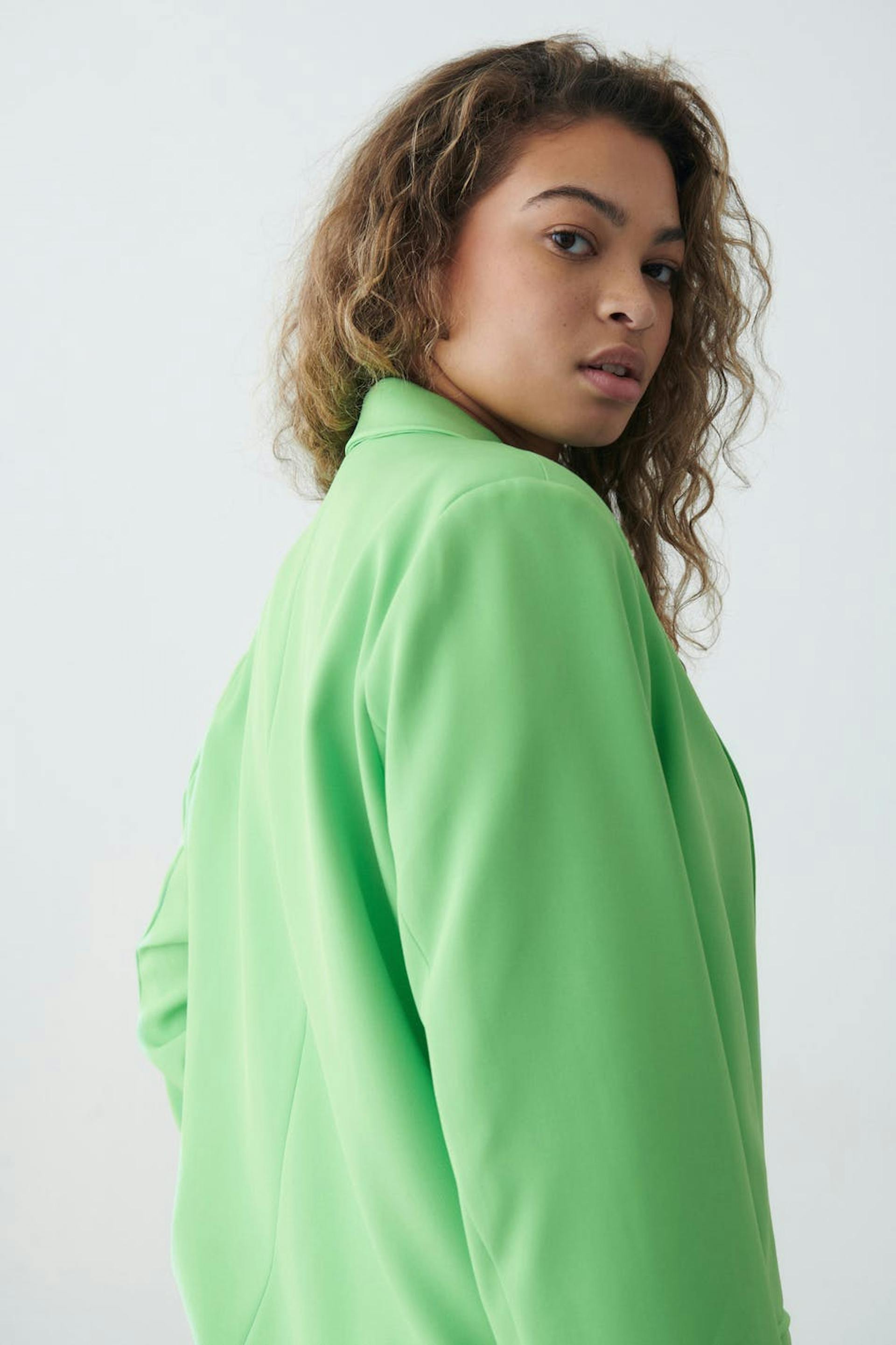Oversized blazer with a woven quality. The blazer is green and has one-button fastening at the front. It has collar with lapel, flap pockets in the sides and buttons on the sleeve ends.