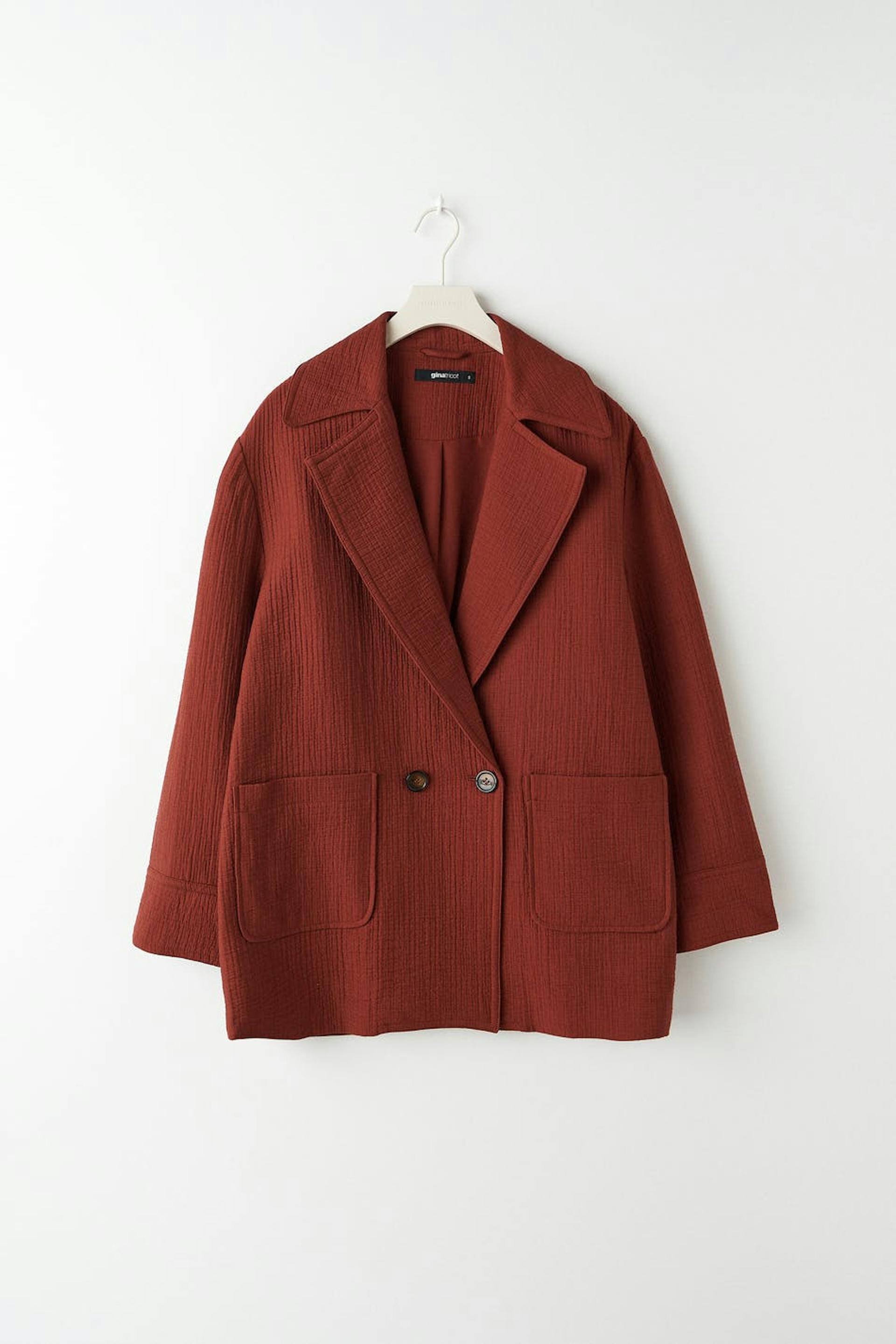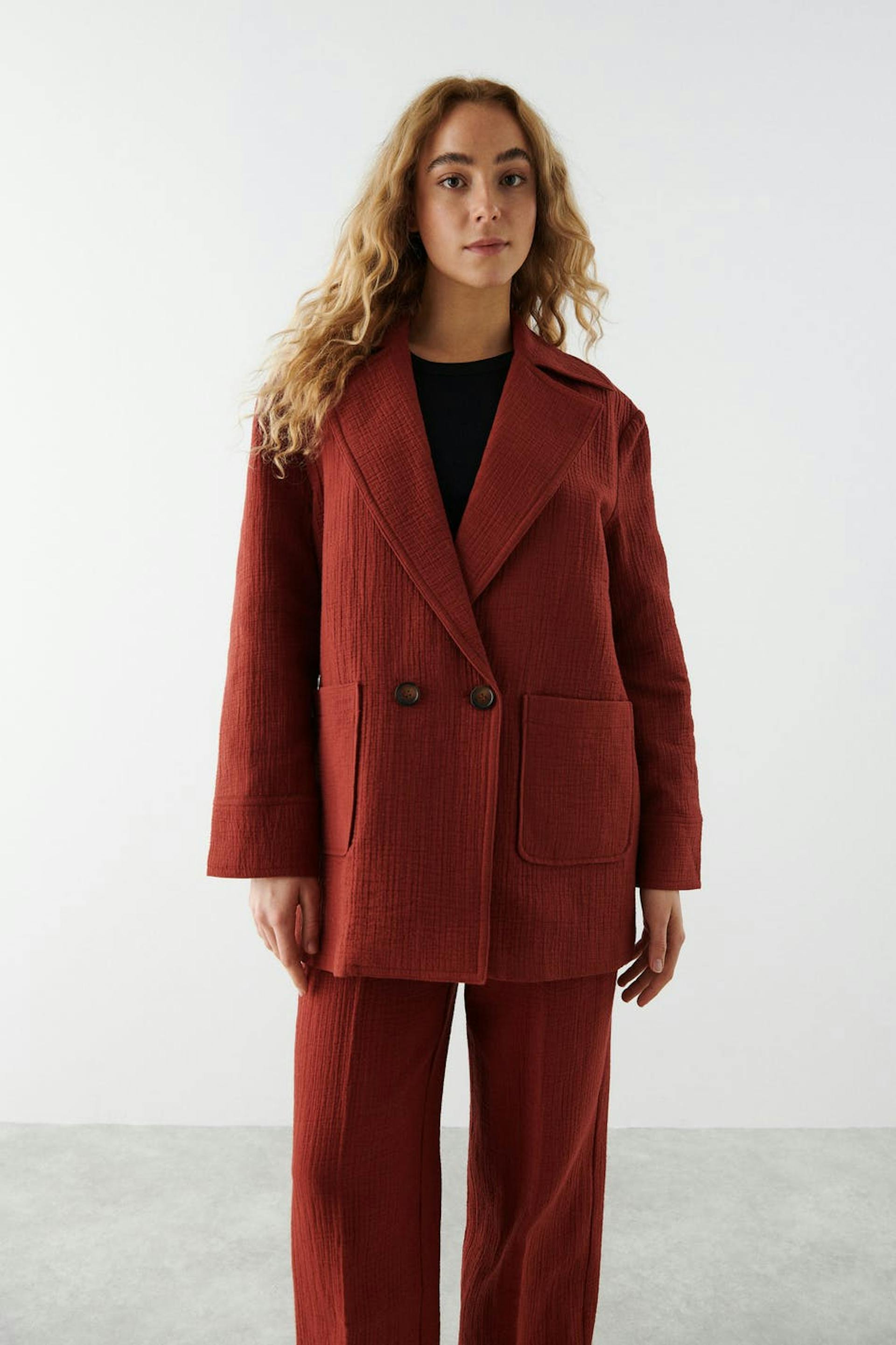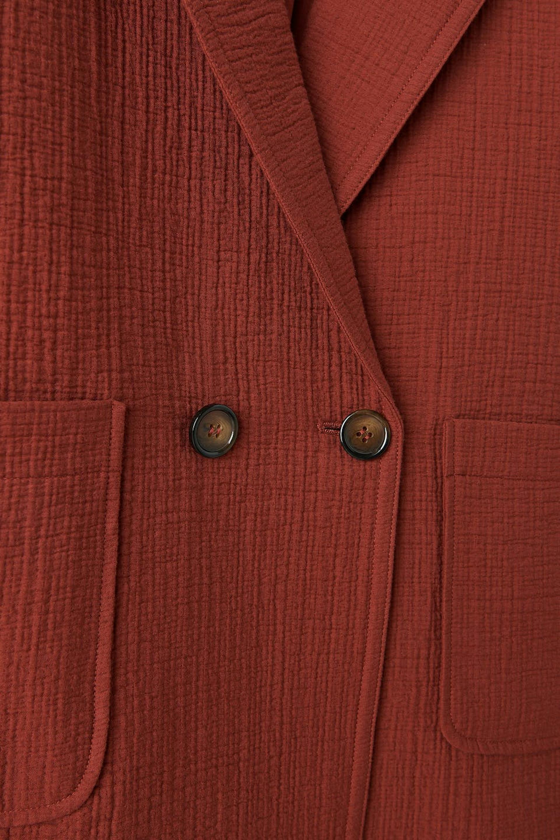 Double-breasted jacket with wide lapels. The jacket is red and has a straight, fitted fit. It has patch front pockets and a structured material.