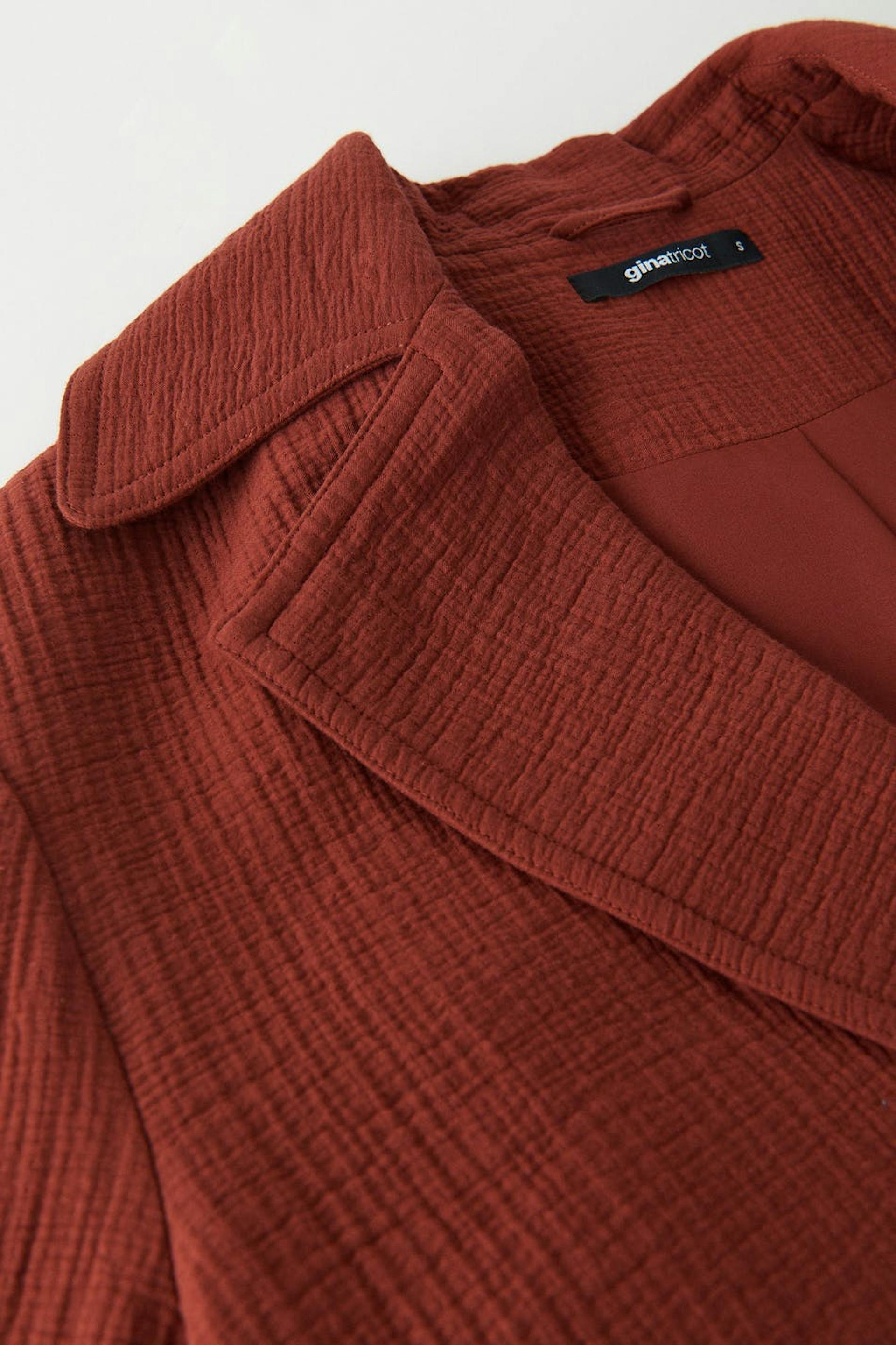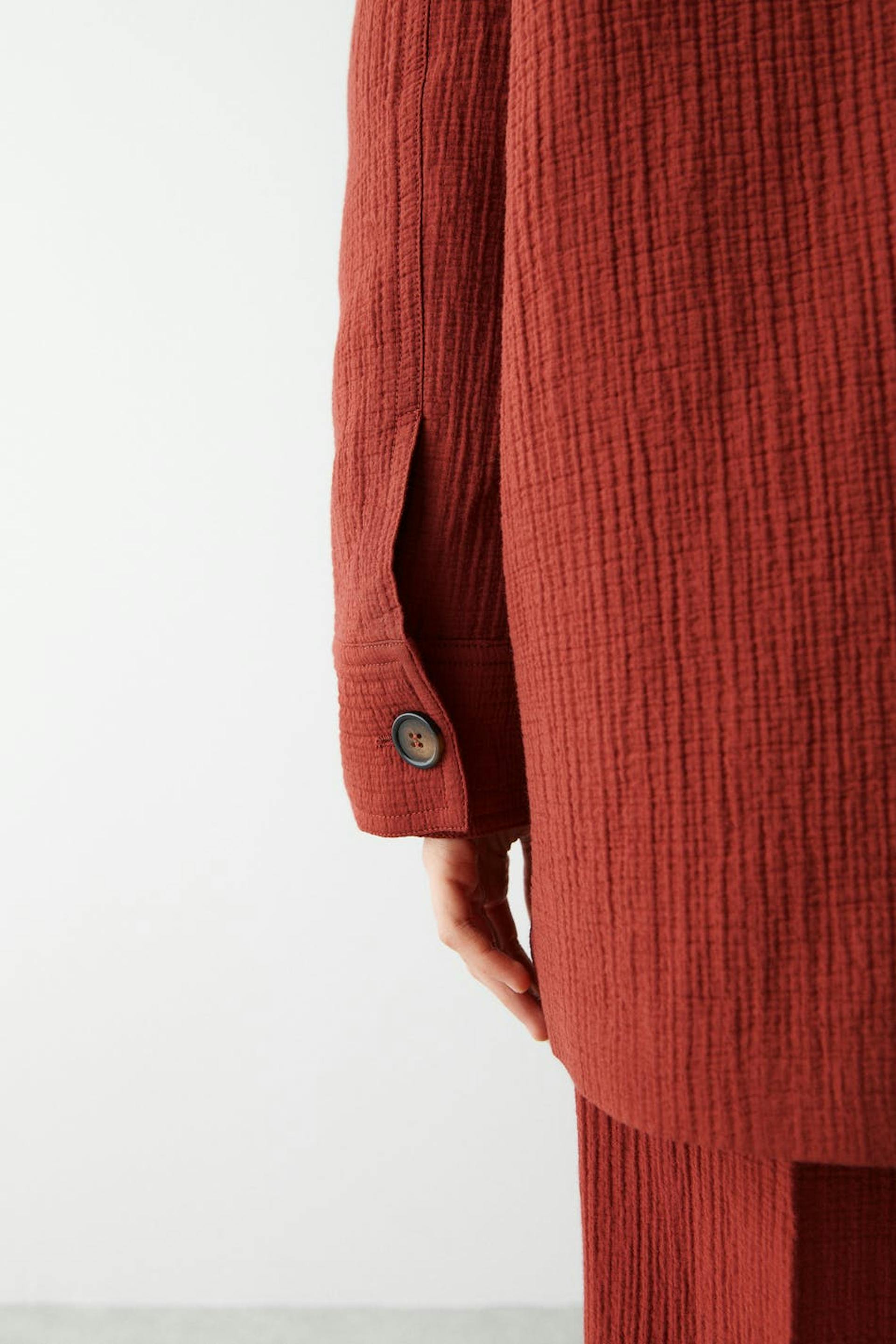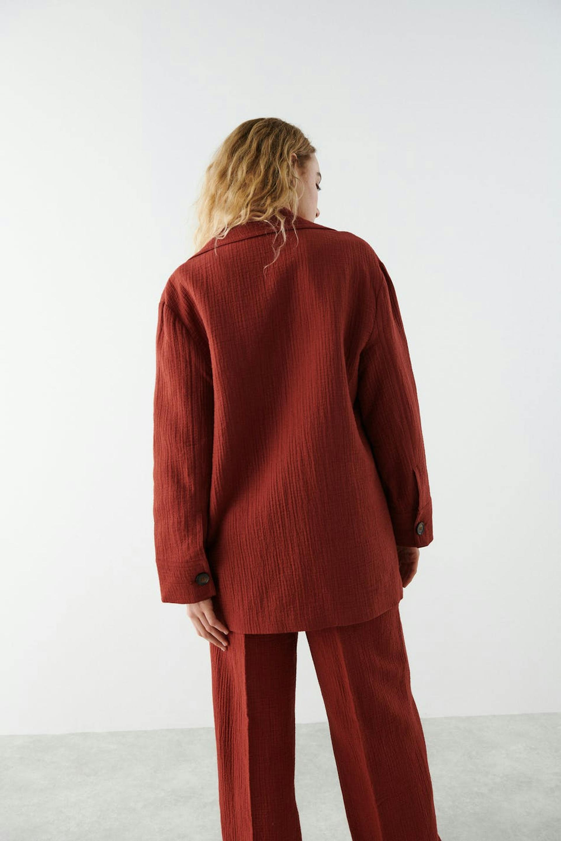 Double-breasted jacket with wide lapels. The jacket is red and has a straight, fitted fit. It has patch front pockets and a structured material.