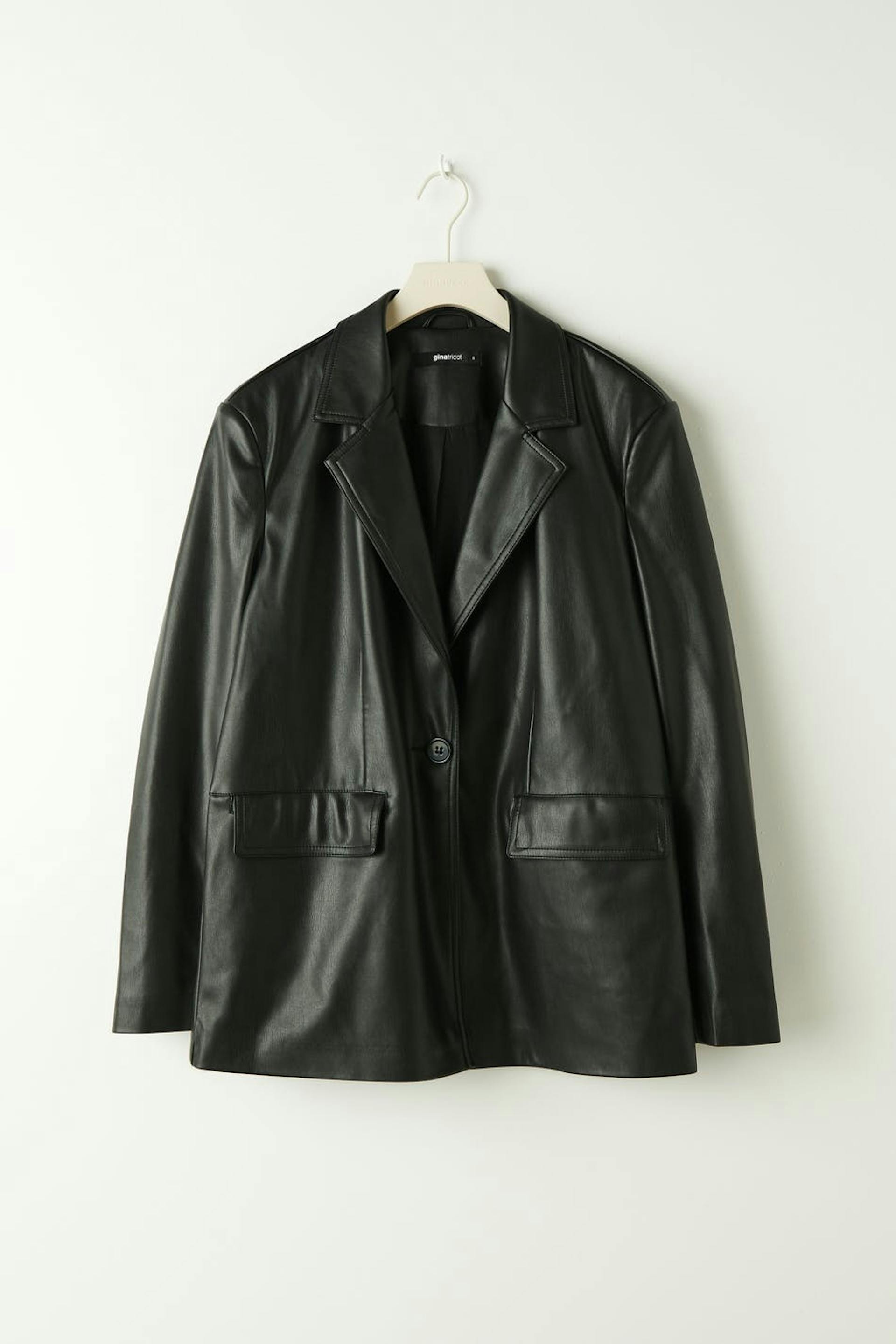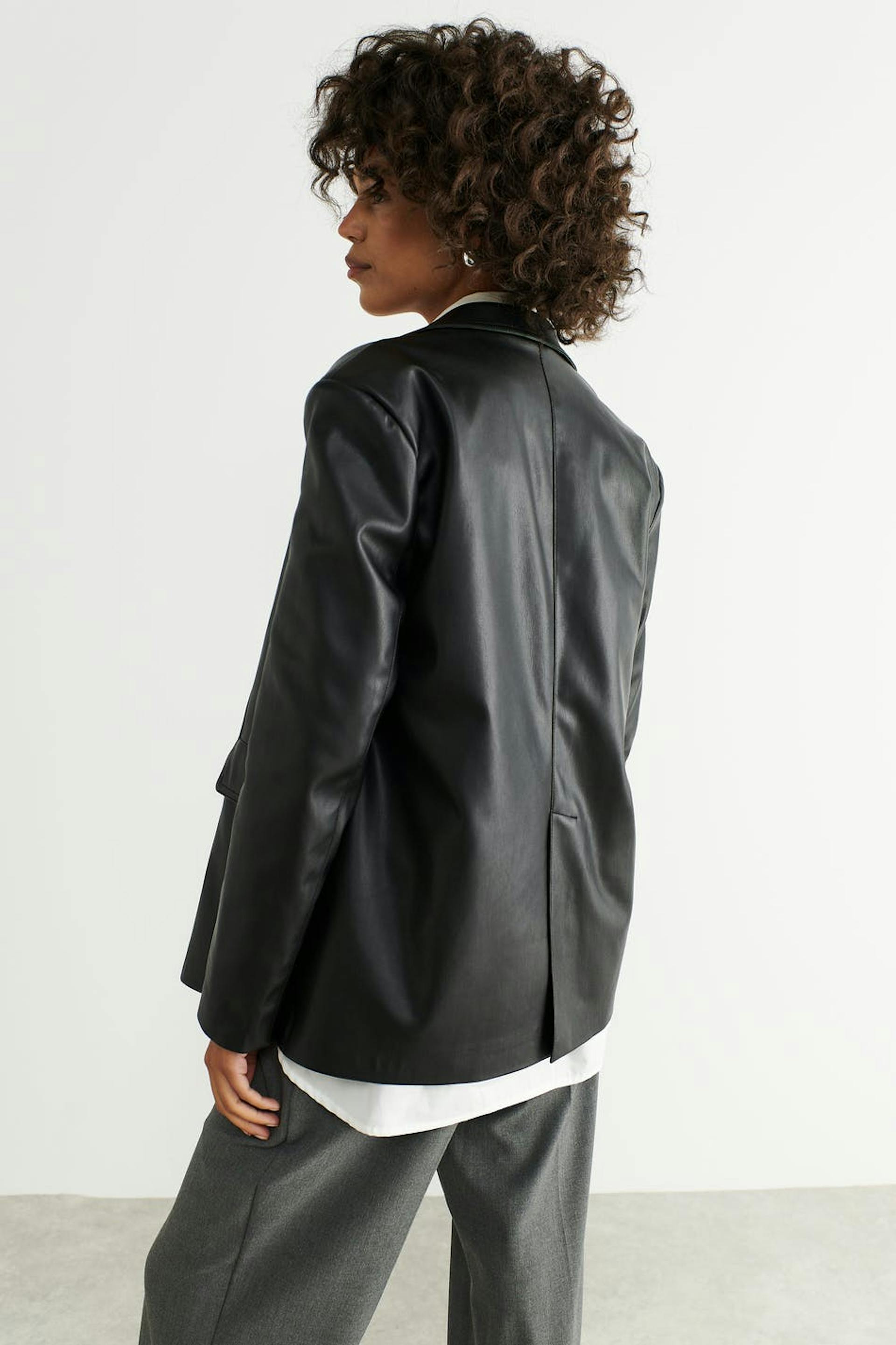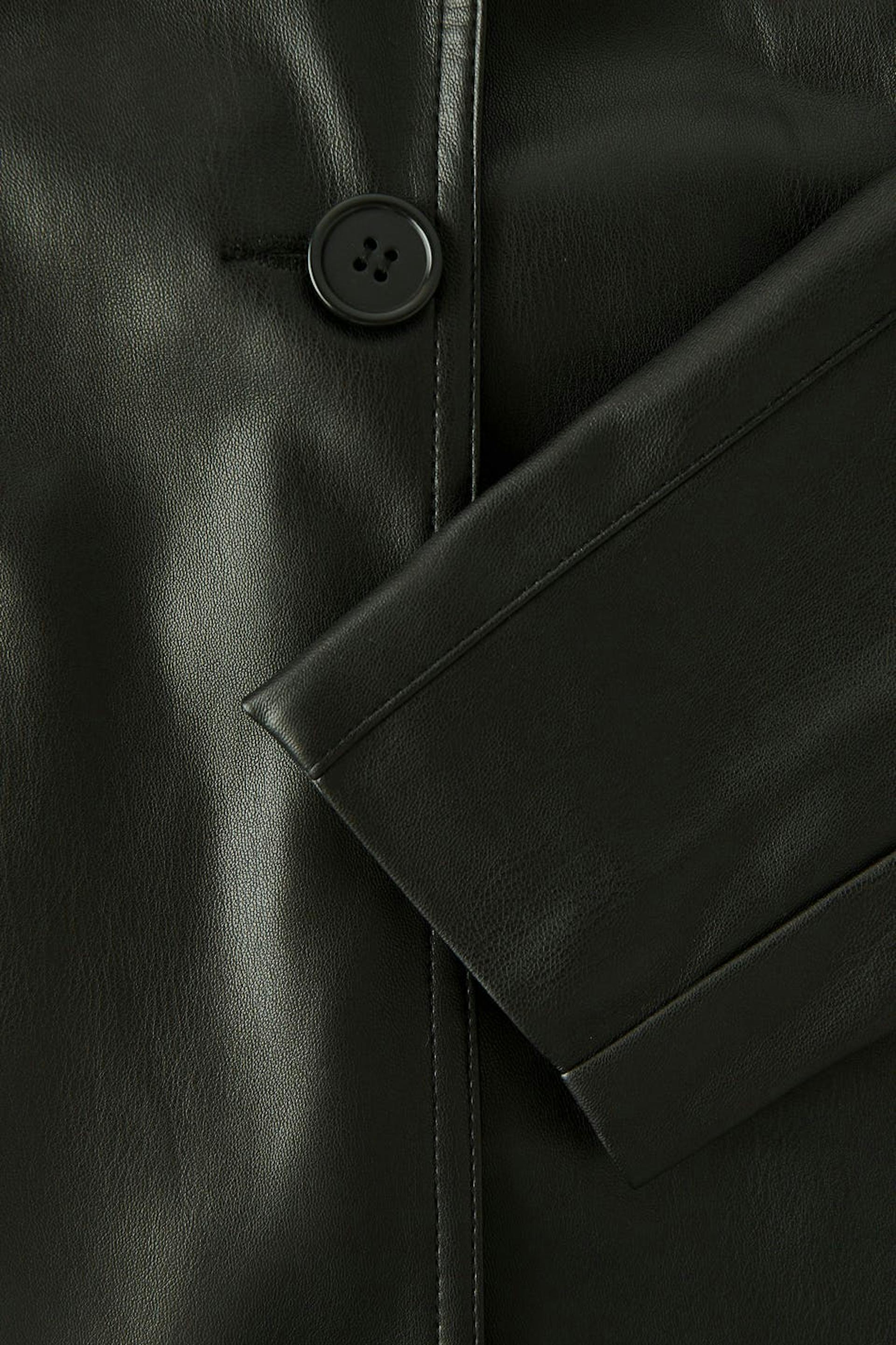 Leather blazer in PU with an oversize fit. The blazer is black and has button closure in front. It has collar with lapels, flap pockets at the front and vent at the back.
