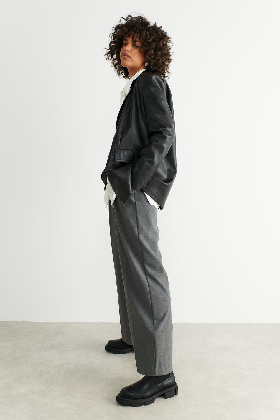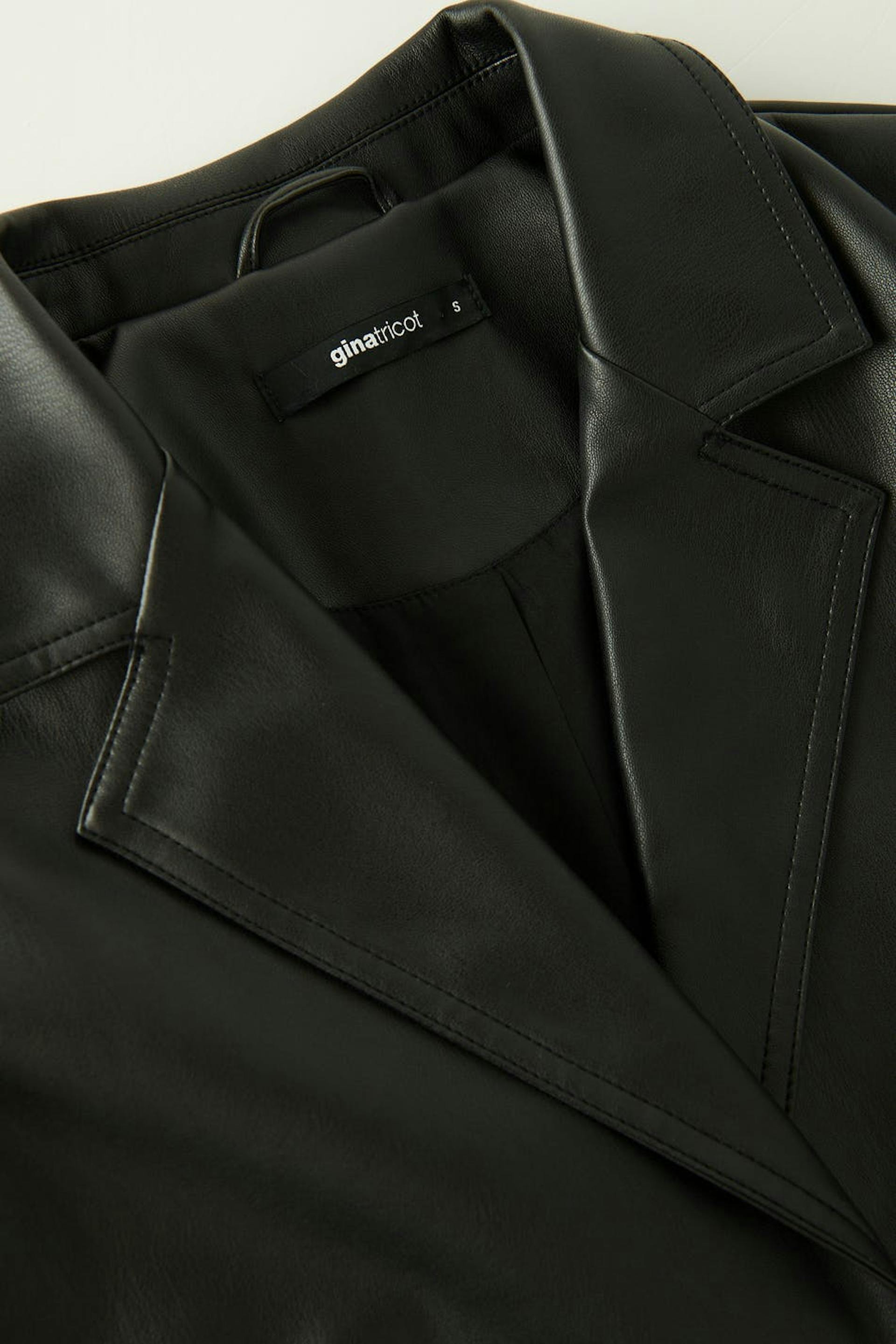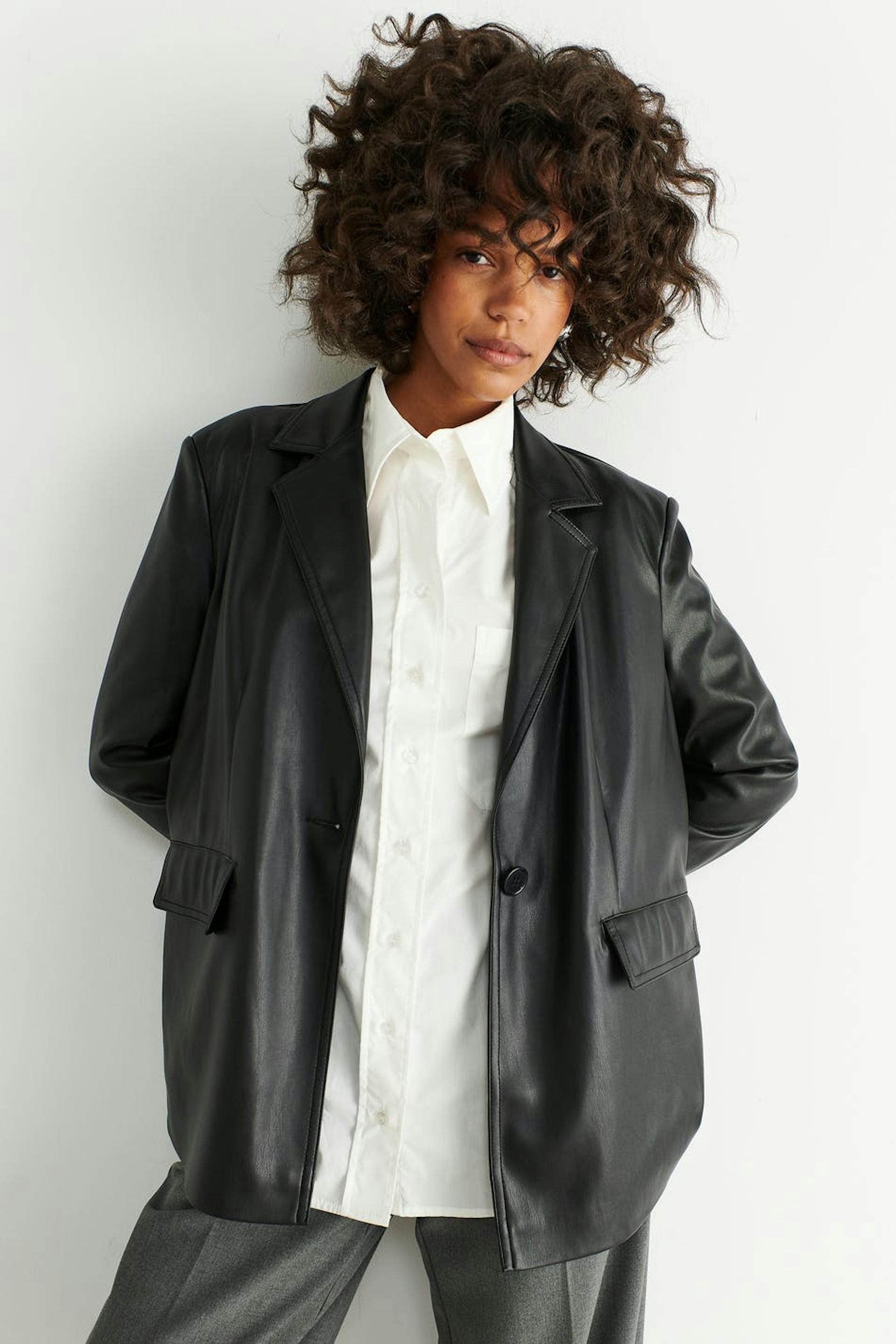 Leather blazer in PU with an oversize fit. The blazer is black and has button closure in front. It has collar with lapels, flap pockets at the front and vent at the back.