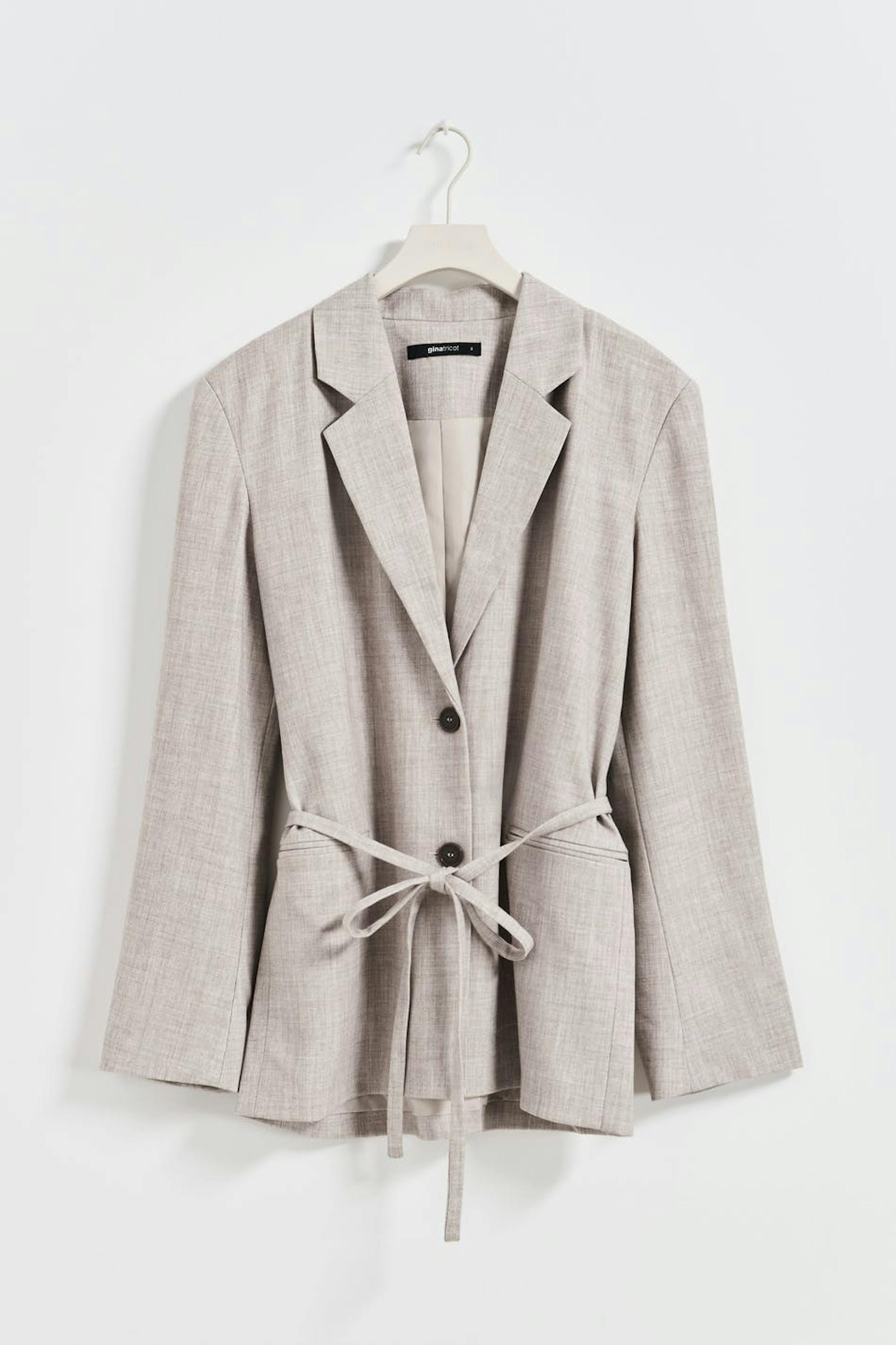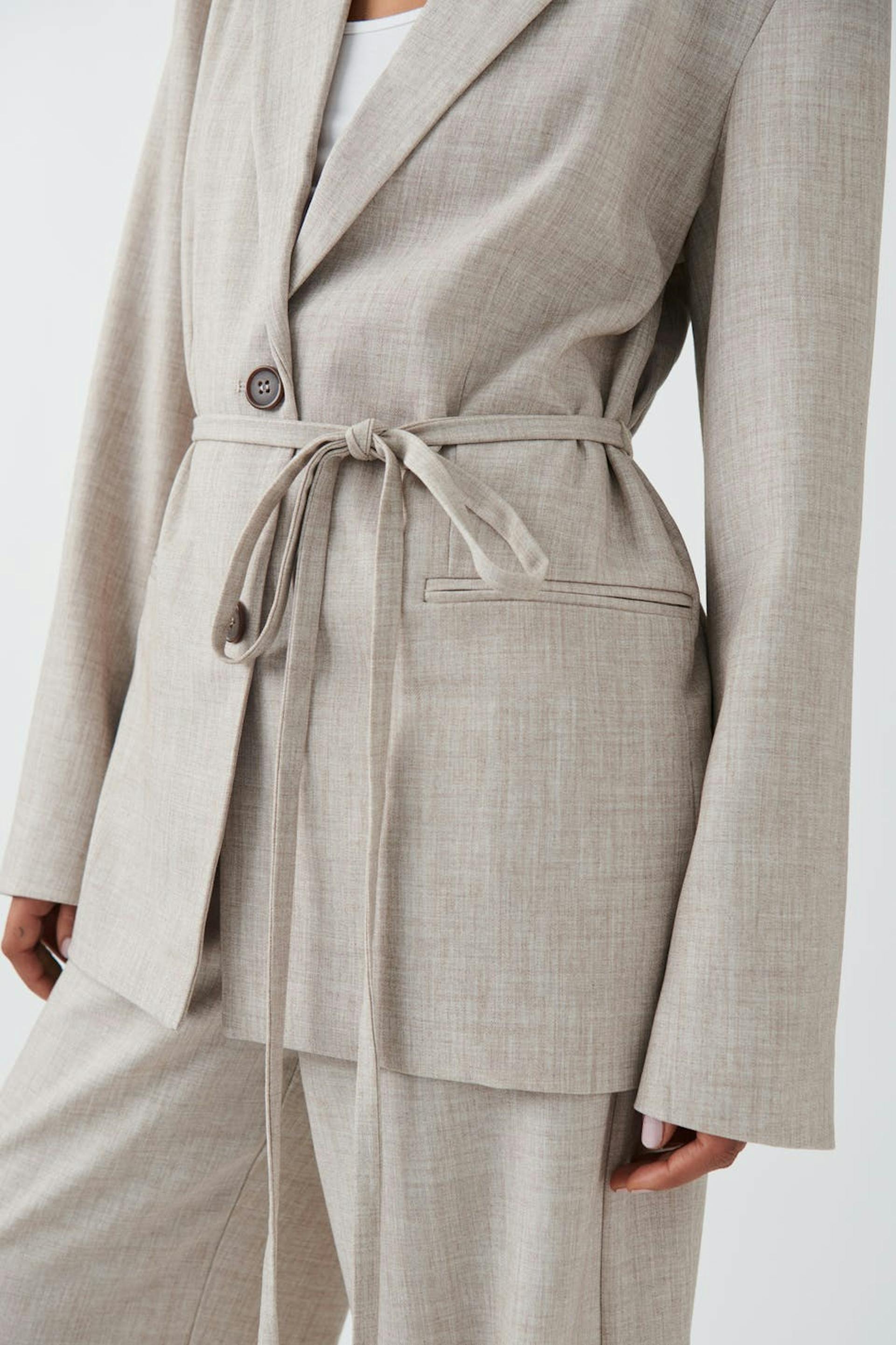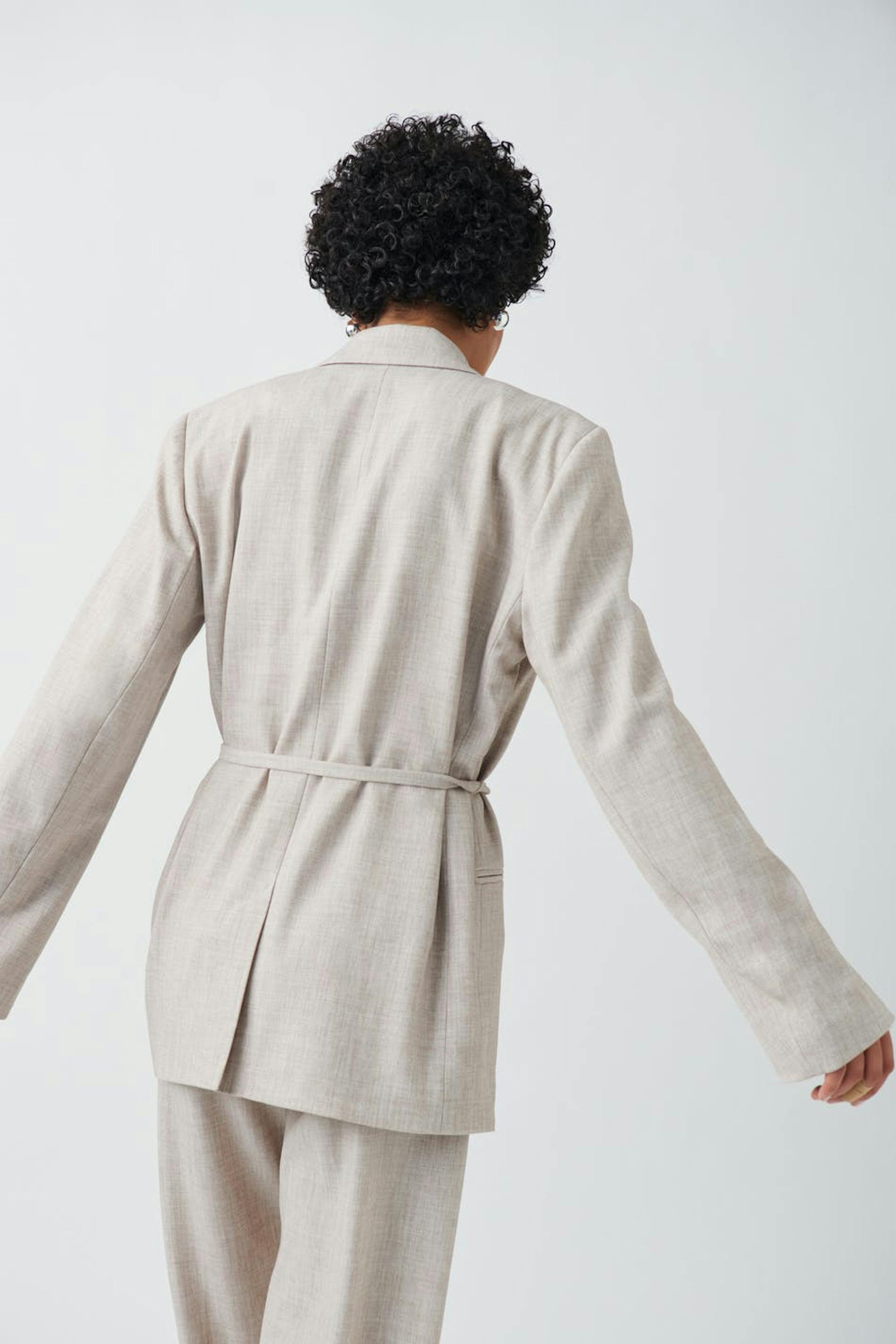Oversized jacket with self-tie belt at the waist. The jacket is beige and has button placket at the front. It has woven quality, welt pockets in the sides, collar with lapel and vent at the back.