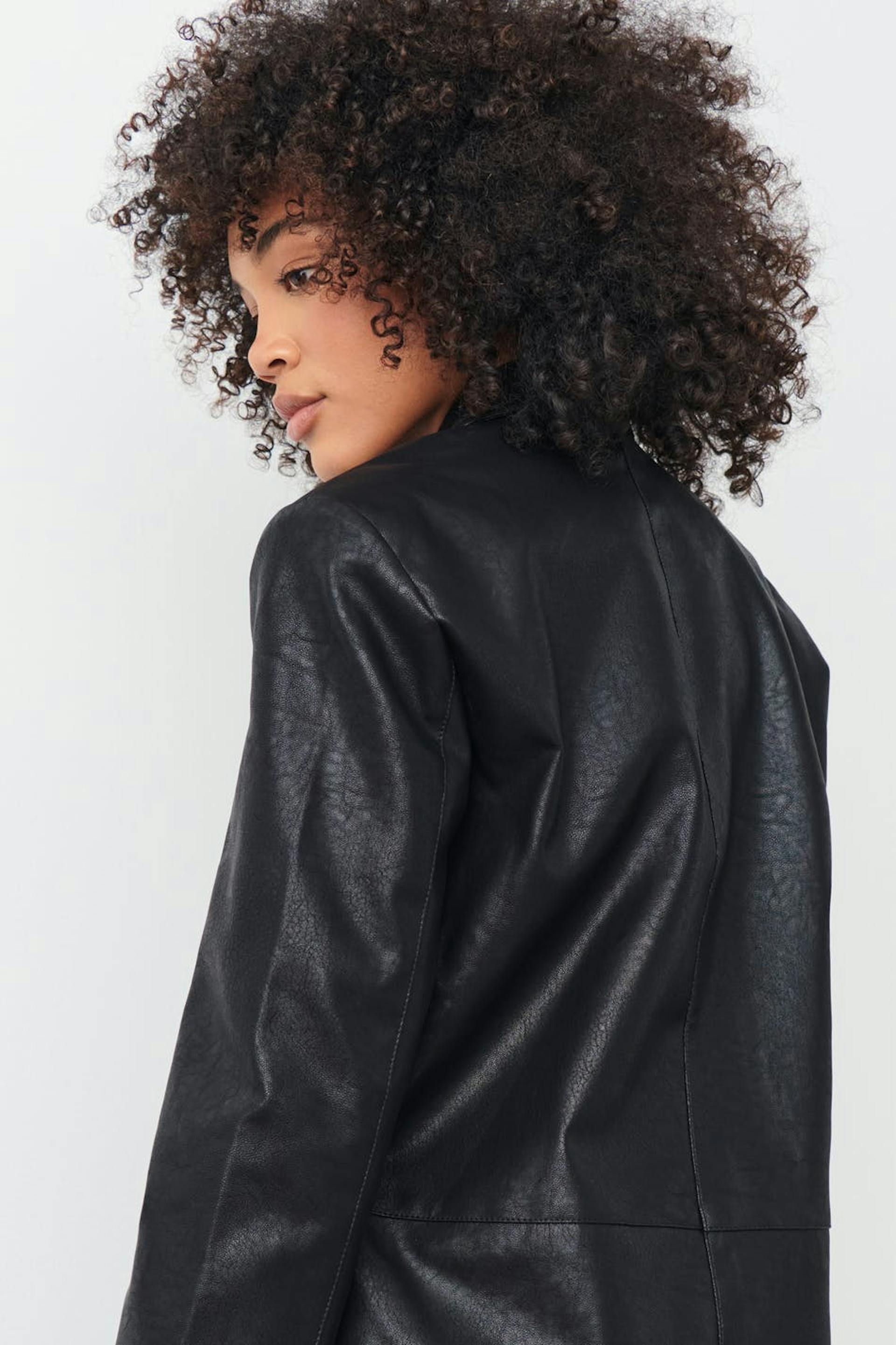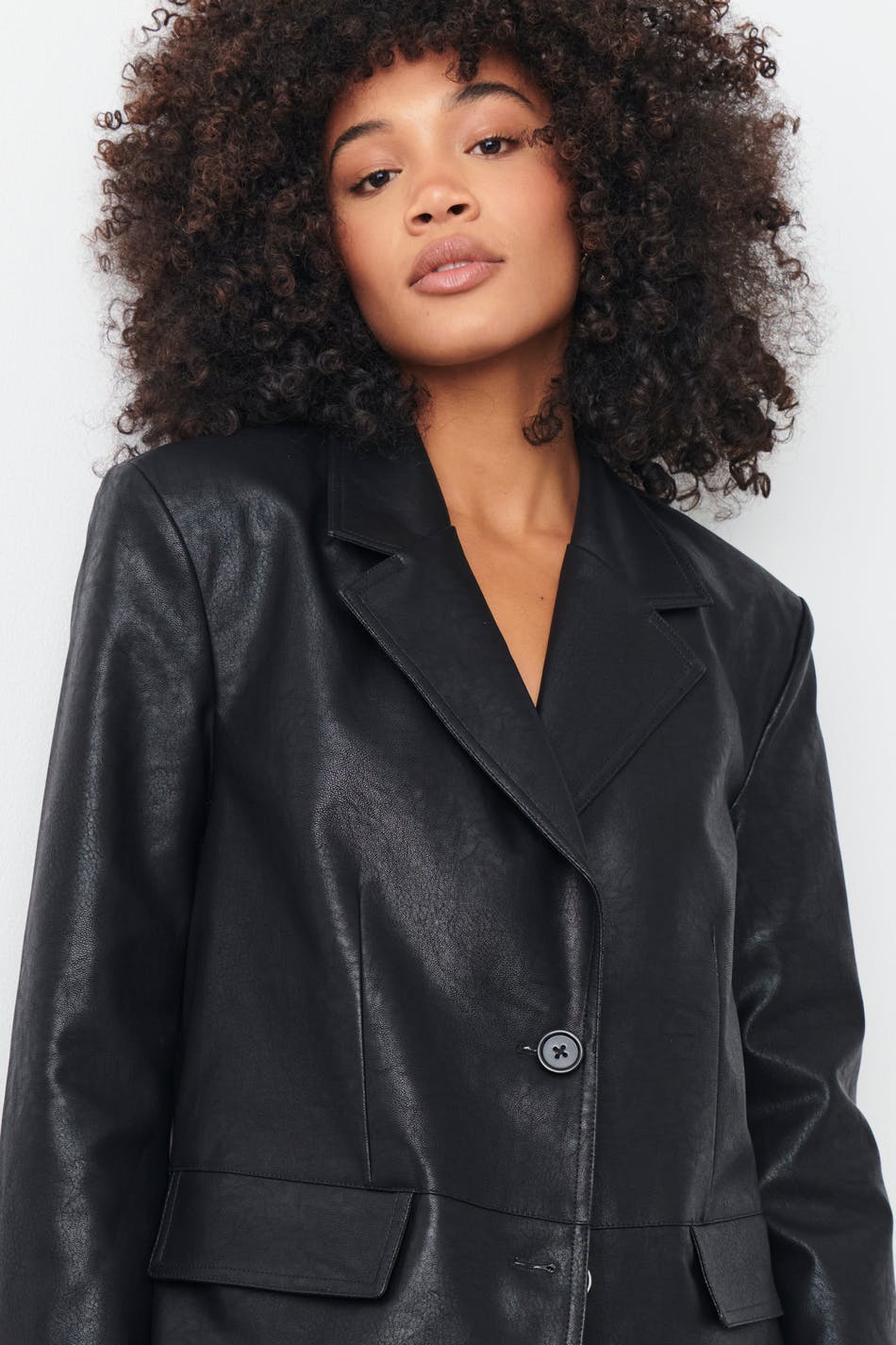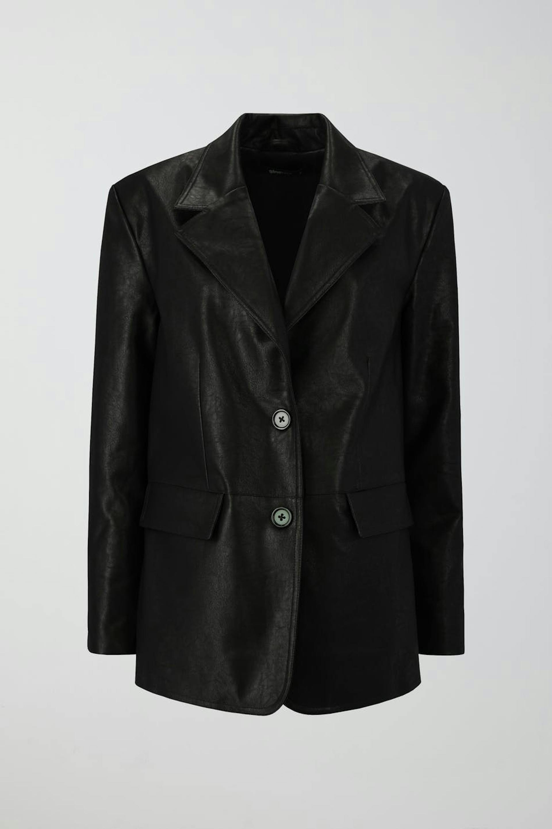 Oversized suit jacket in imitation leather with a woven quality. The jacket is black and has button placket at the front. It has slit pockets with flaps in the sides and collar with notch lapel.