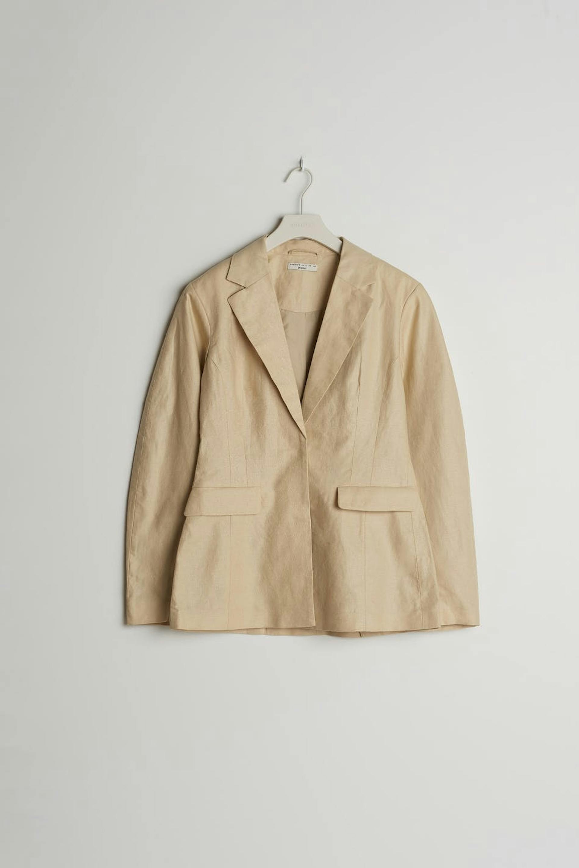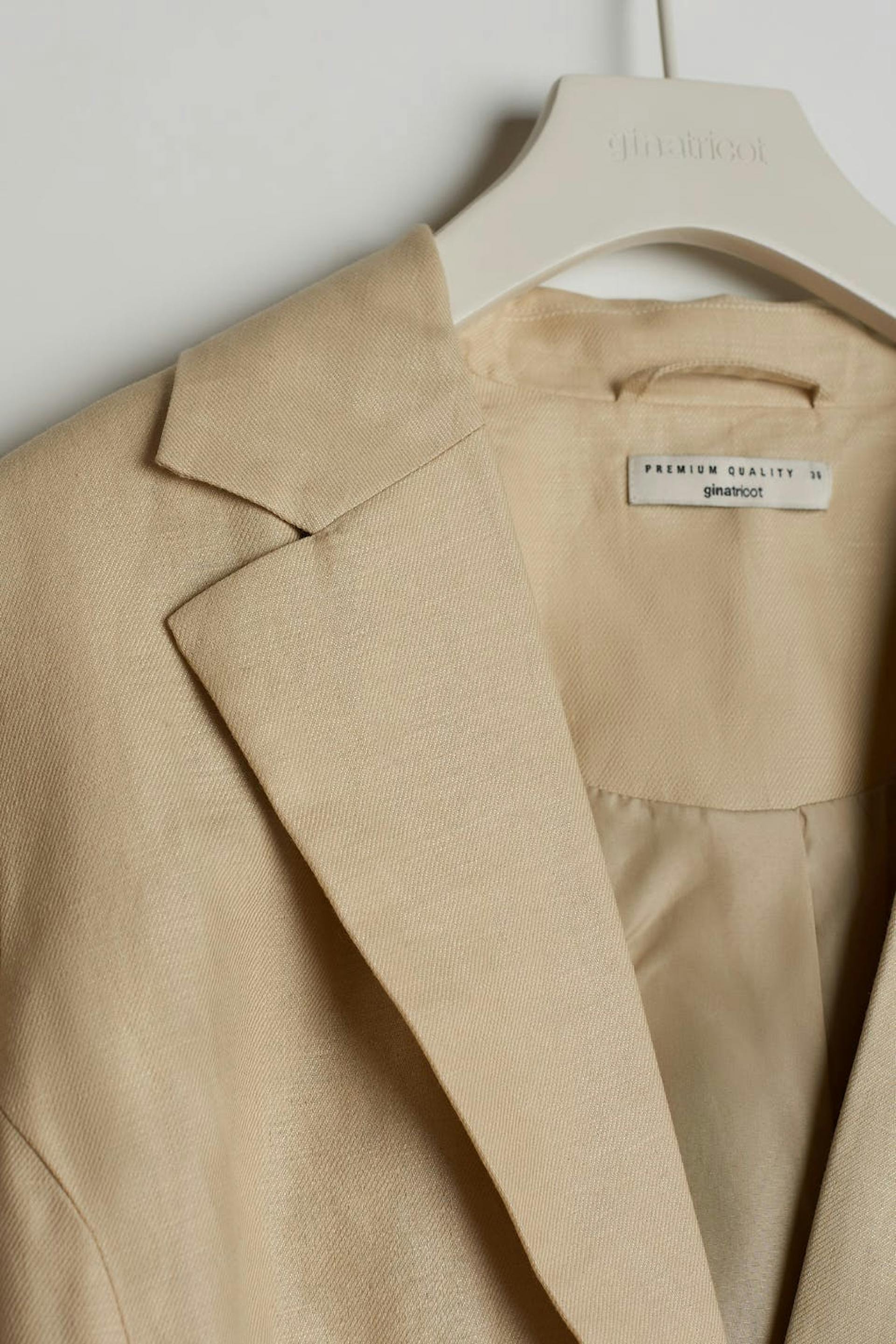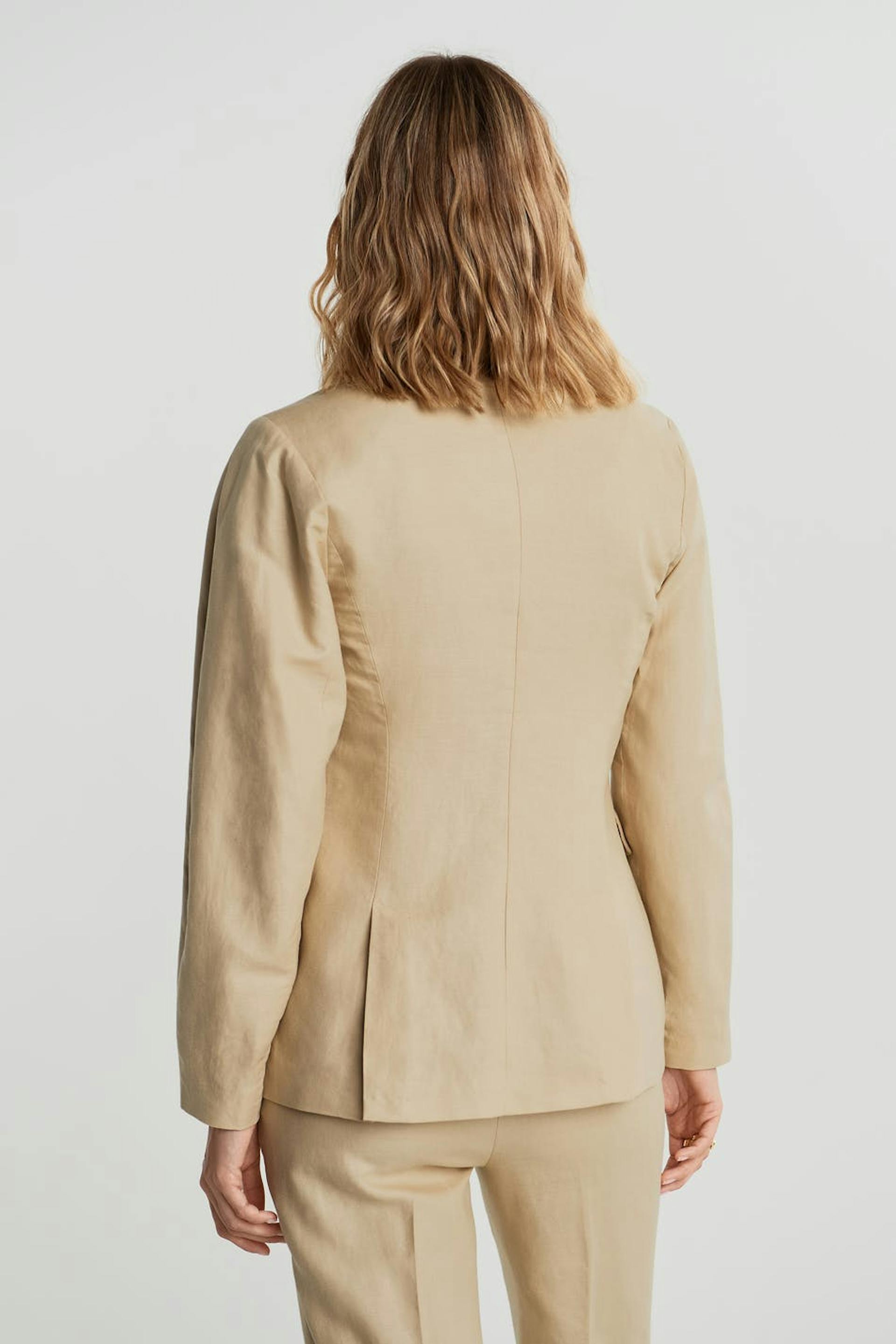 Timeless jacket with a gently fitted fit for an hourglass figure. The jacket is beige and has hidden snap buttons at the front. It has wide lapels.