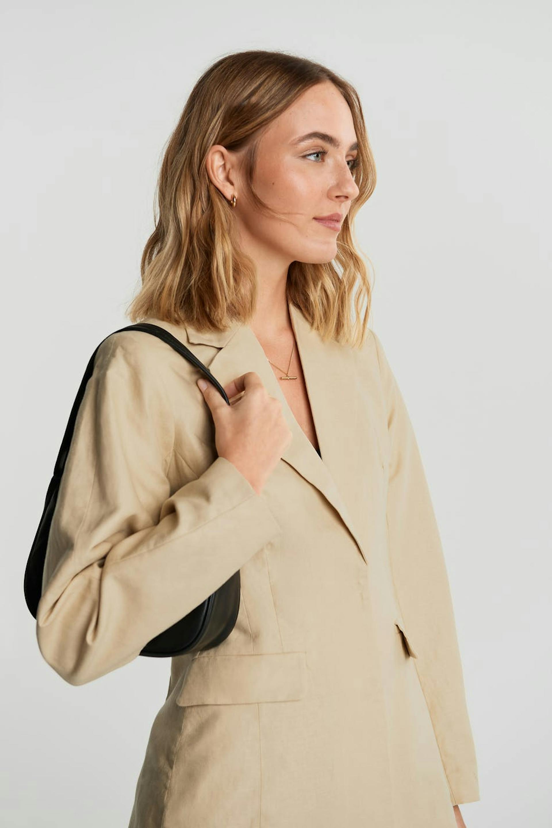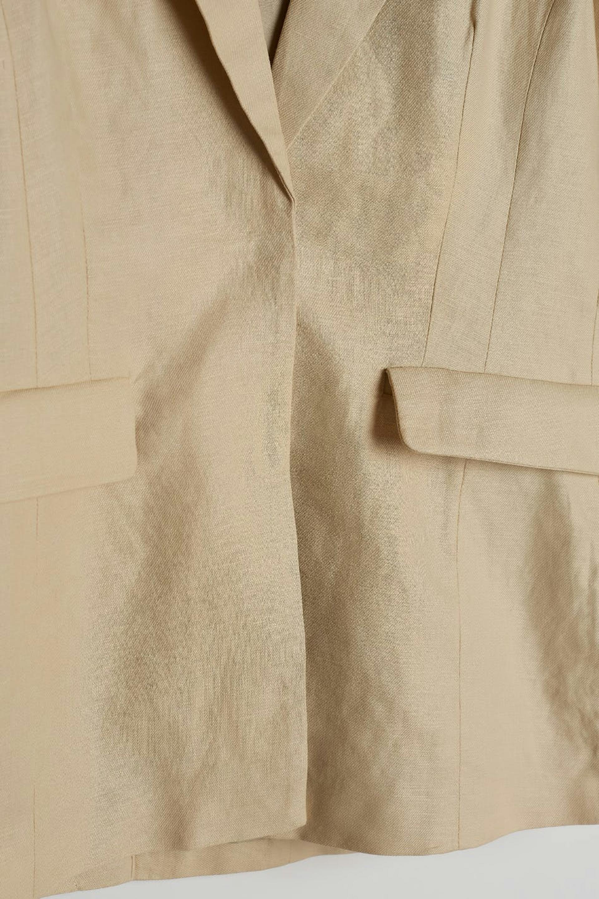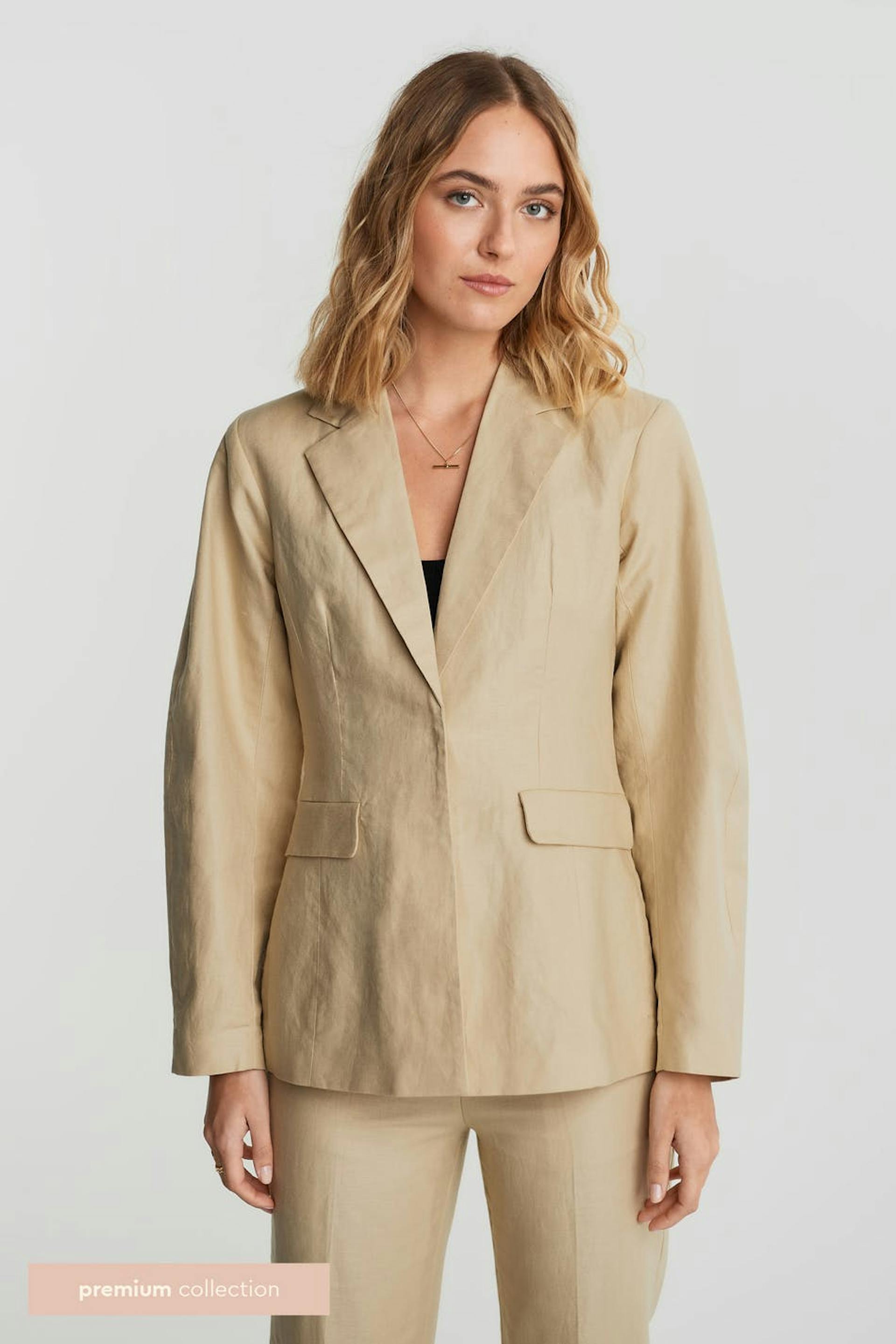 Timeless jacket with a gently fitted fit for an hourglass figure. The jacket is beige and has hidden snap buttons at the front. It has wide lapels.