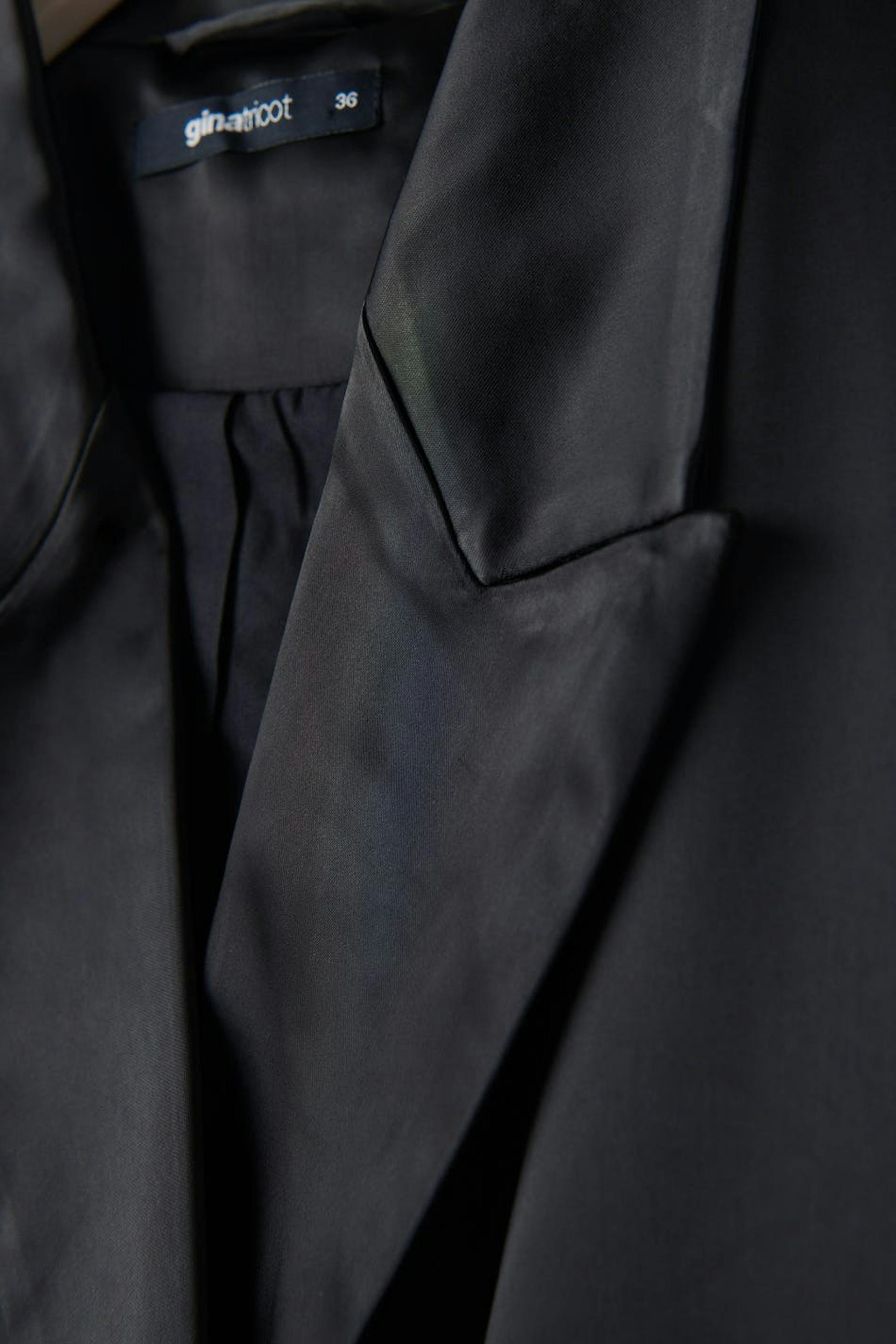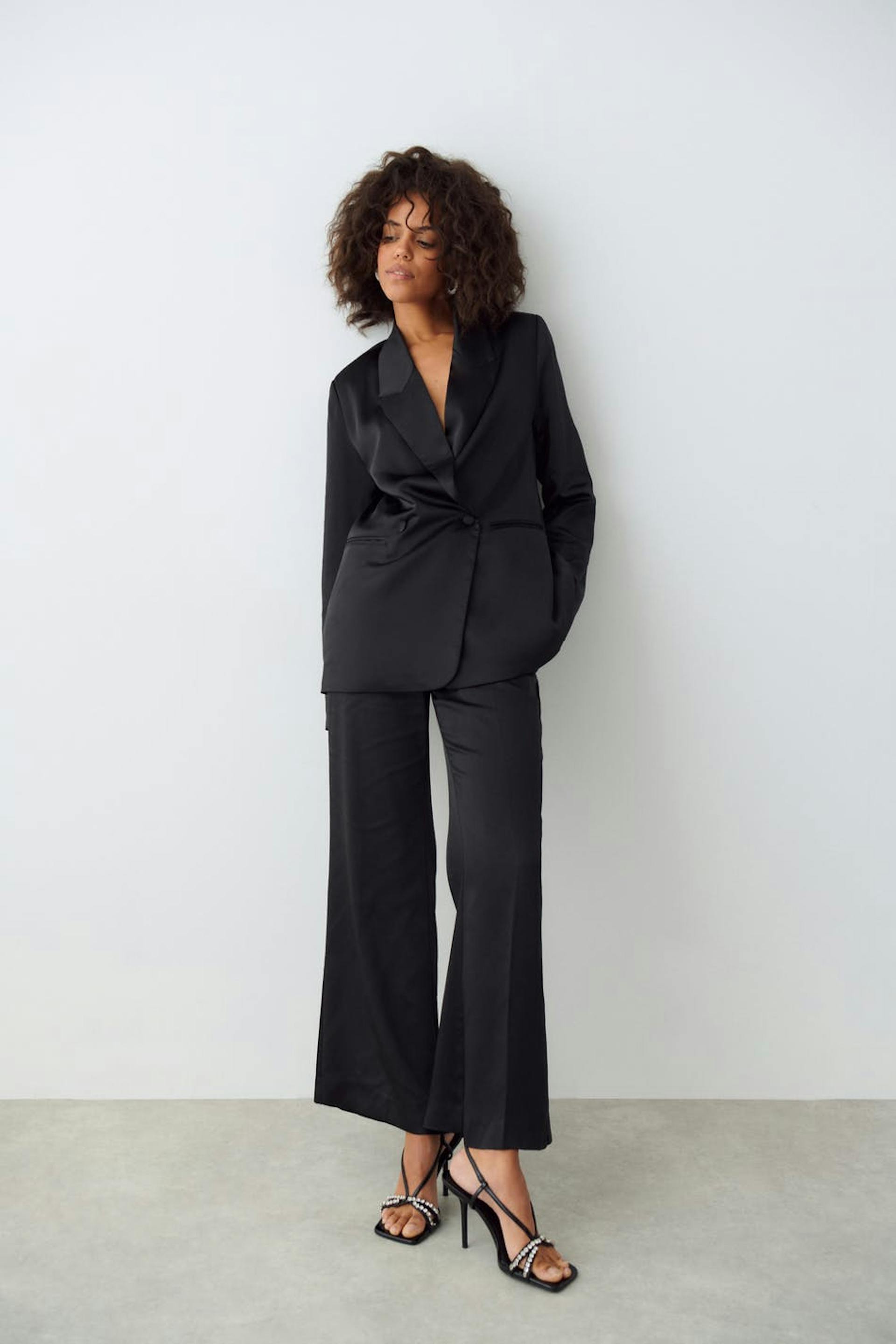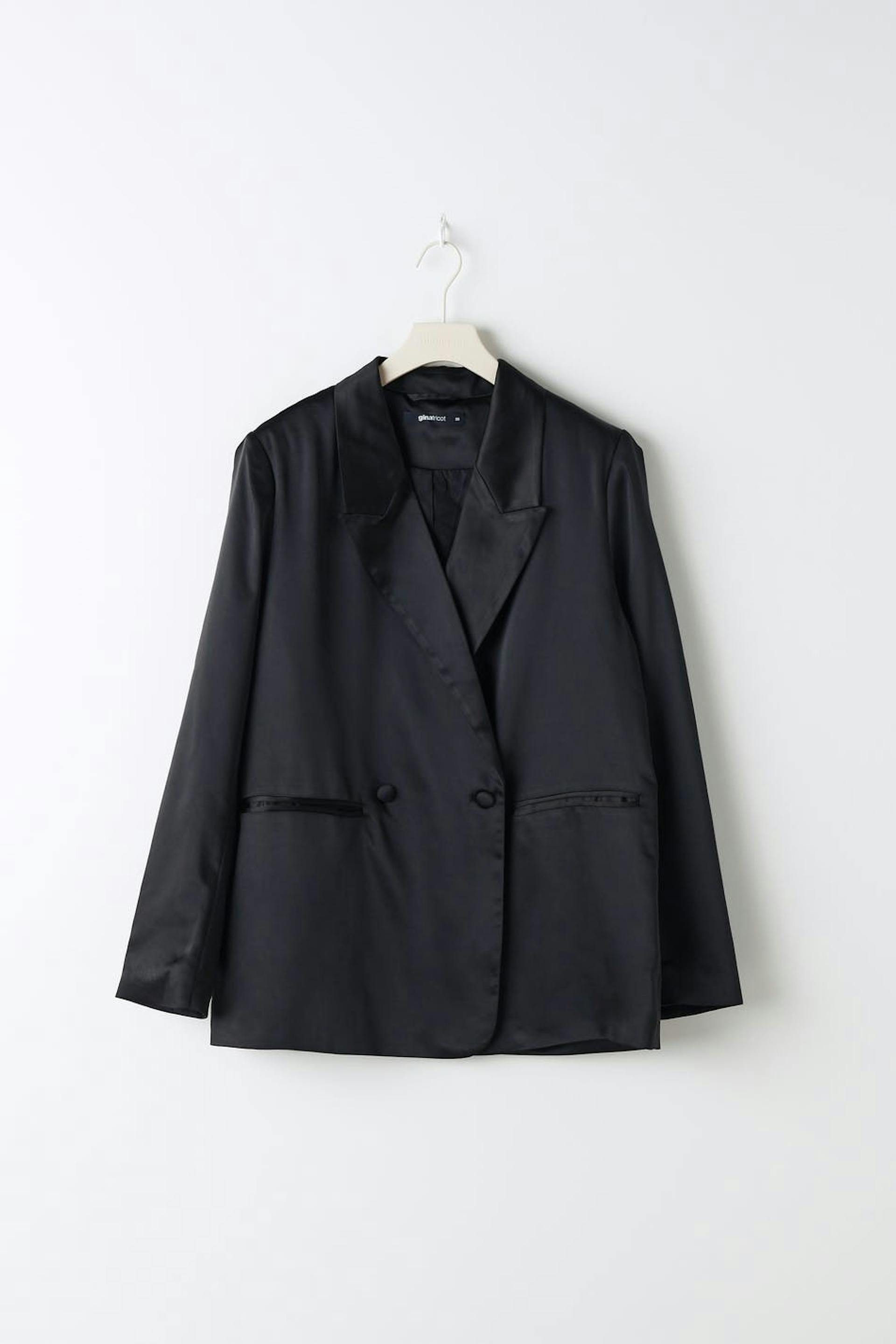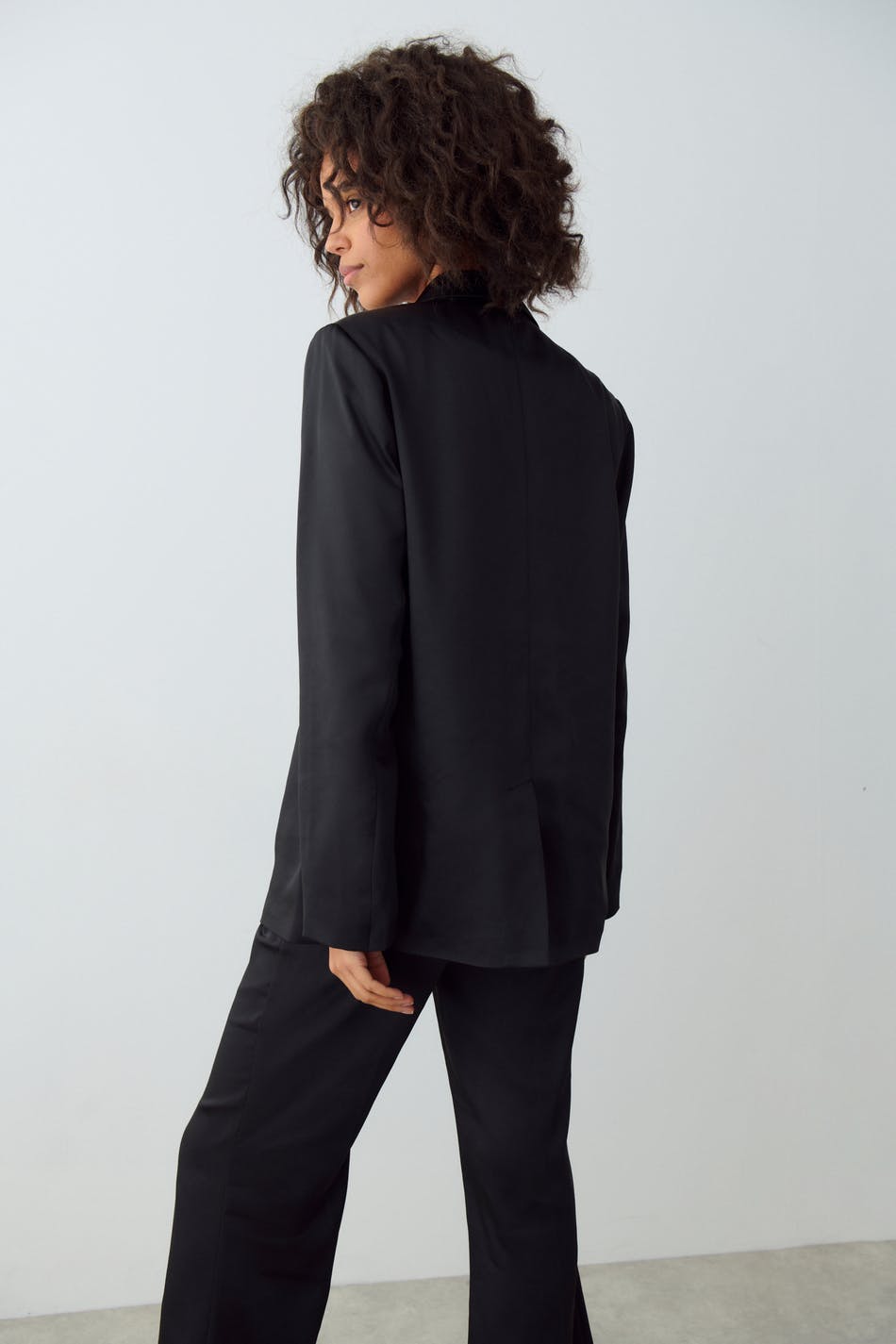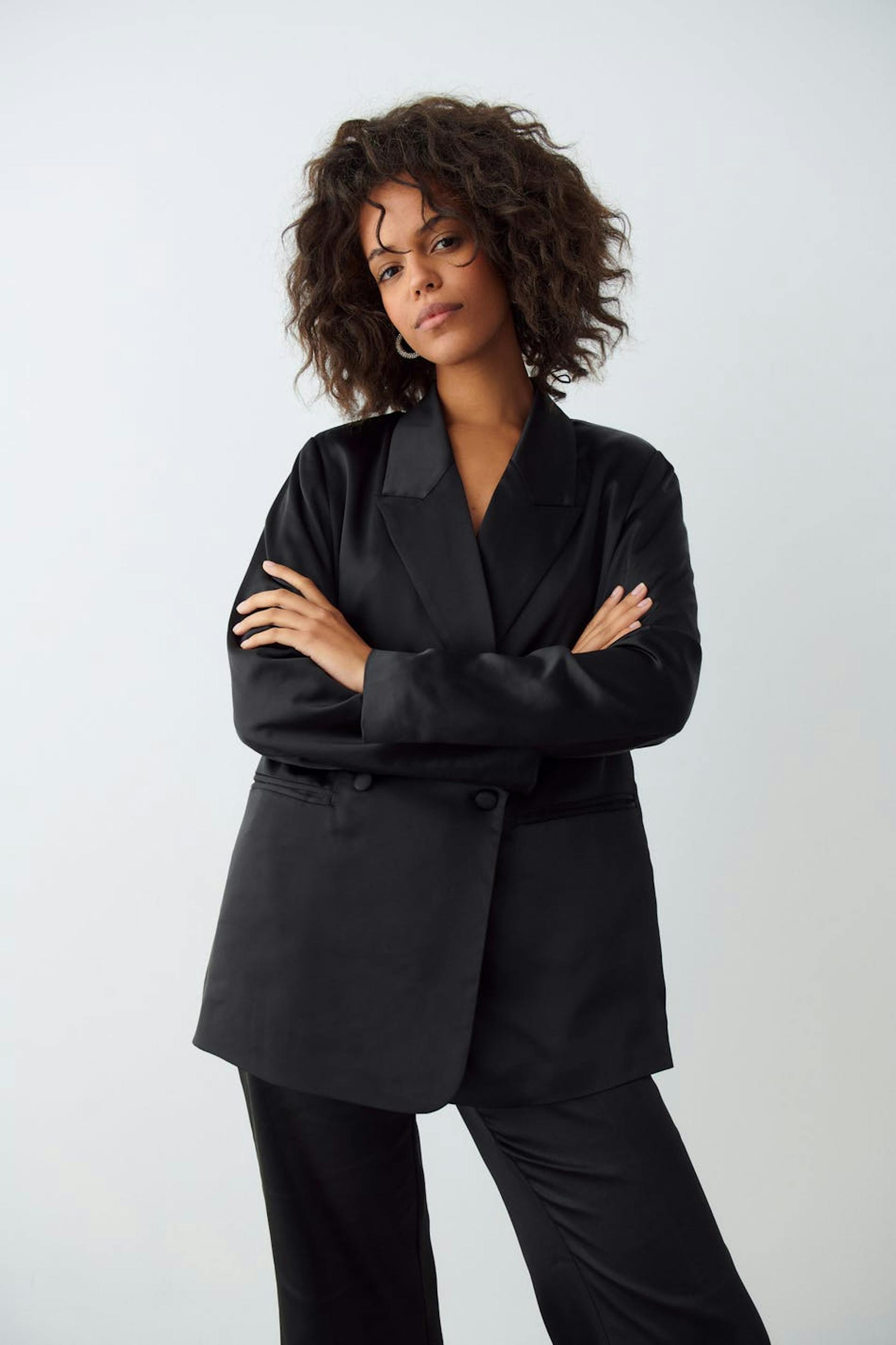 Double-breasted jacket in satin with relaxed fit. The jacket is black and has button placket in front. It has slit pockets in the sides, collar with lapels and vent at the back.