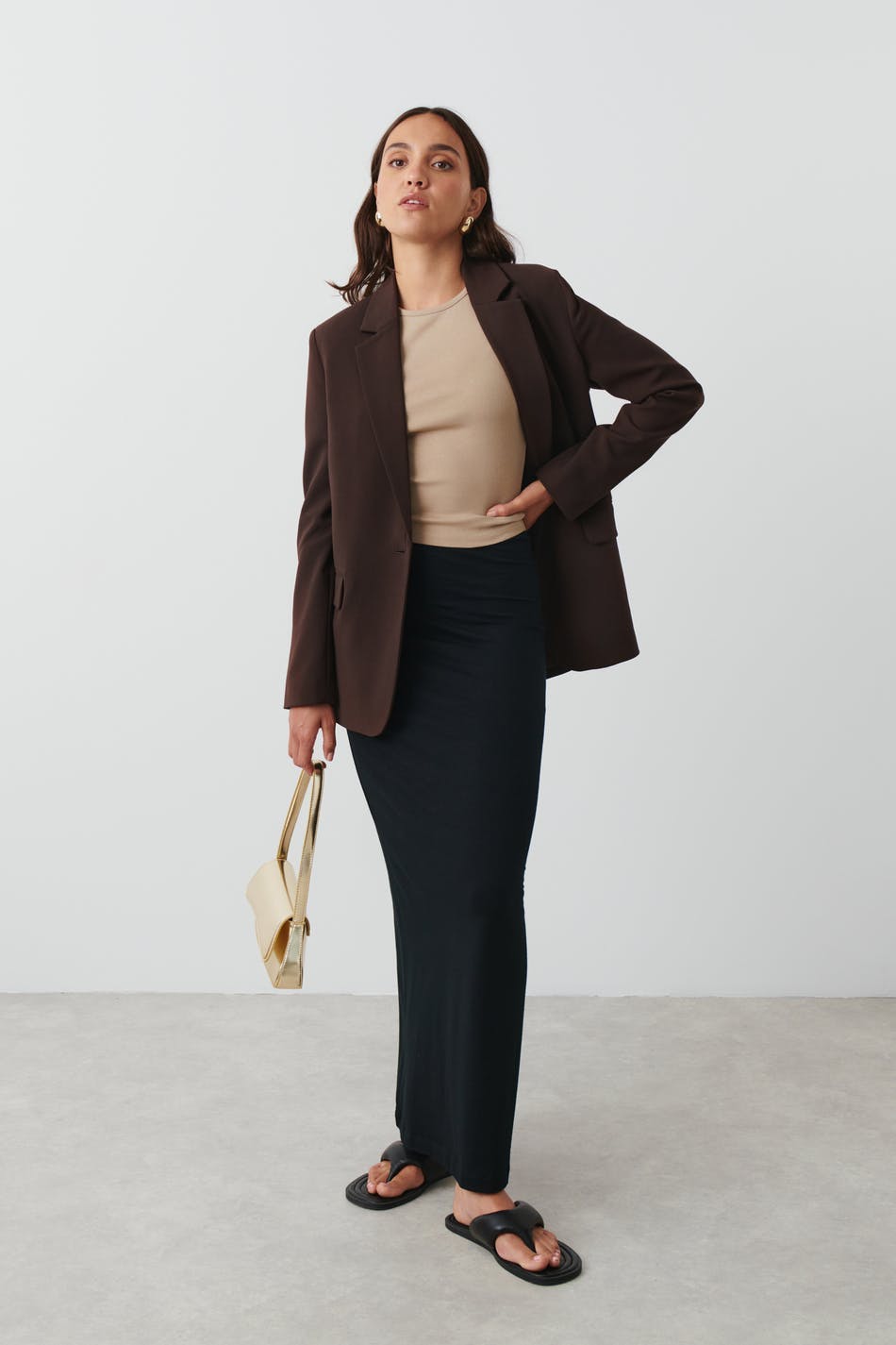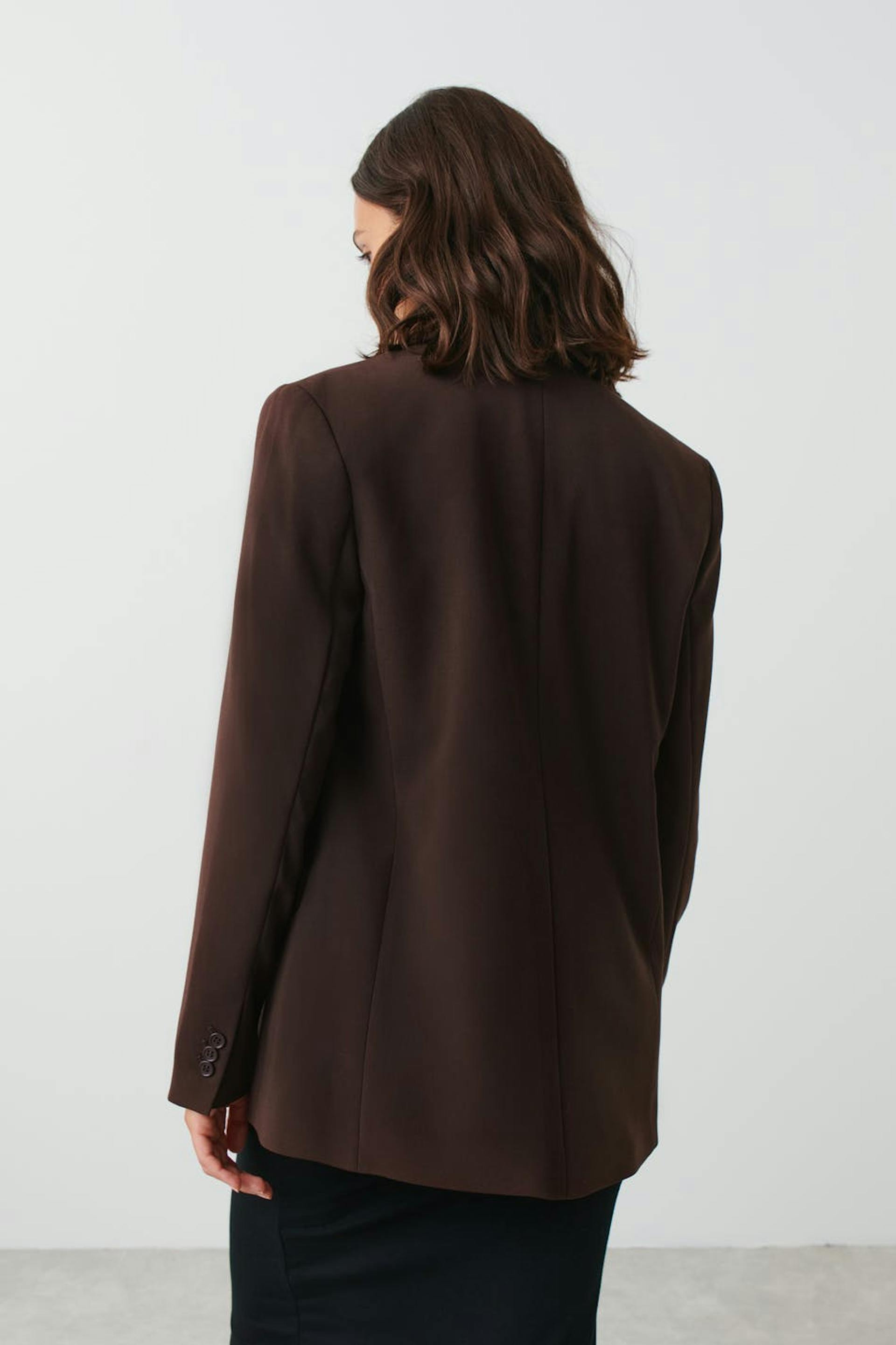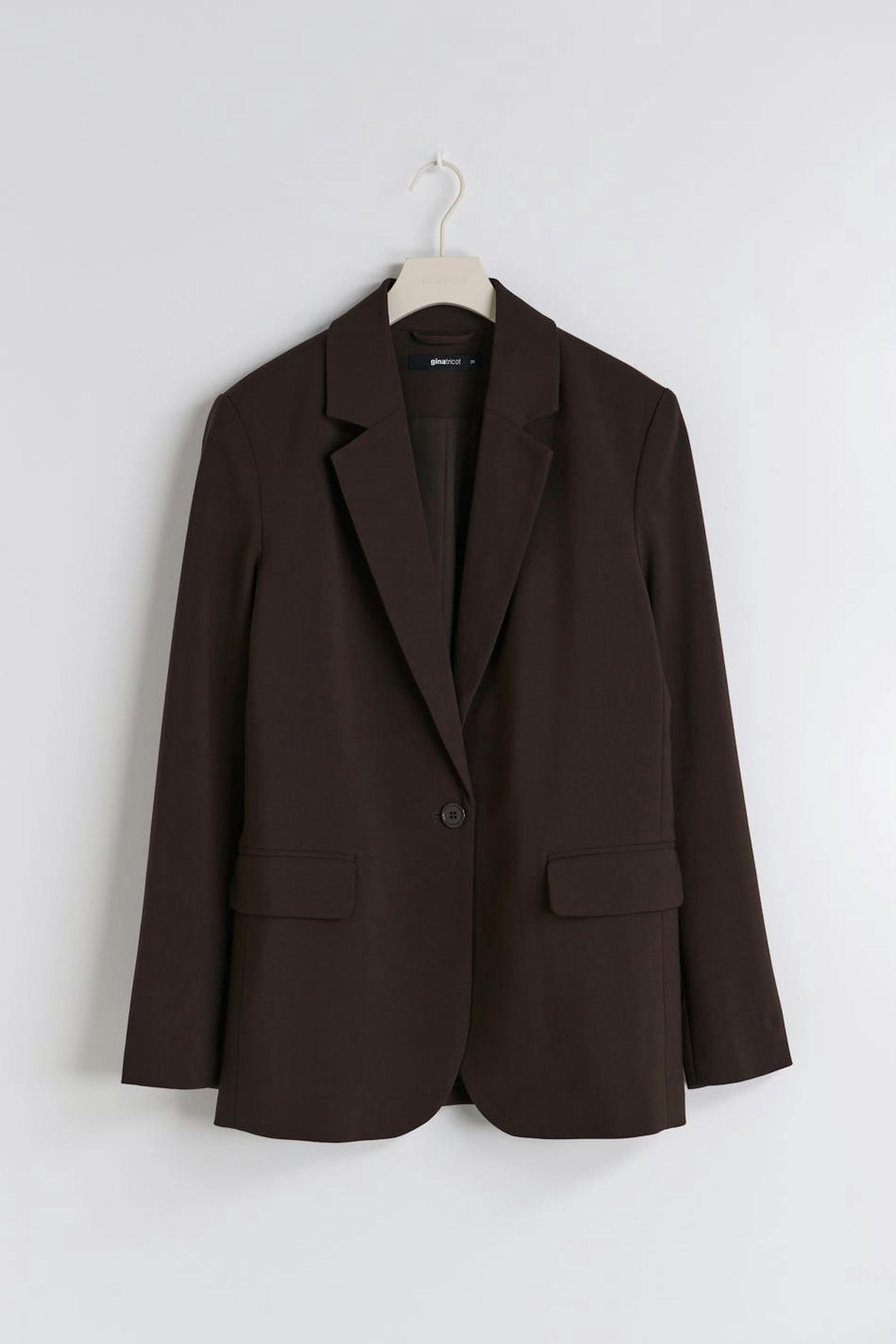 Single-breasted suit jacket with straight, relaxed fit. The jacket is brown and has button placket at the front. It has flap pockets and lapel neckline.