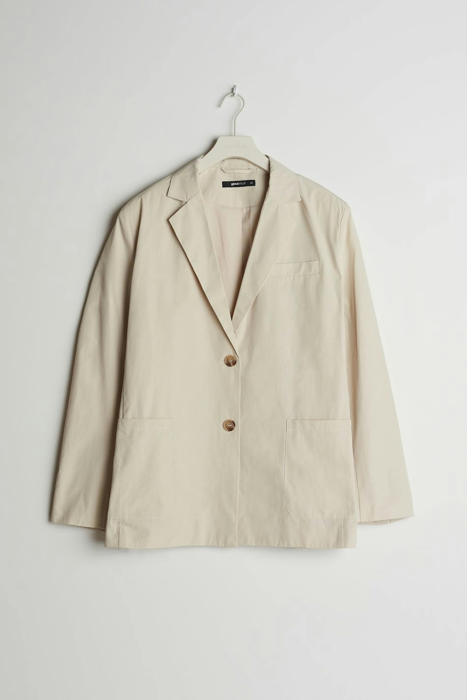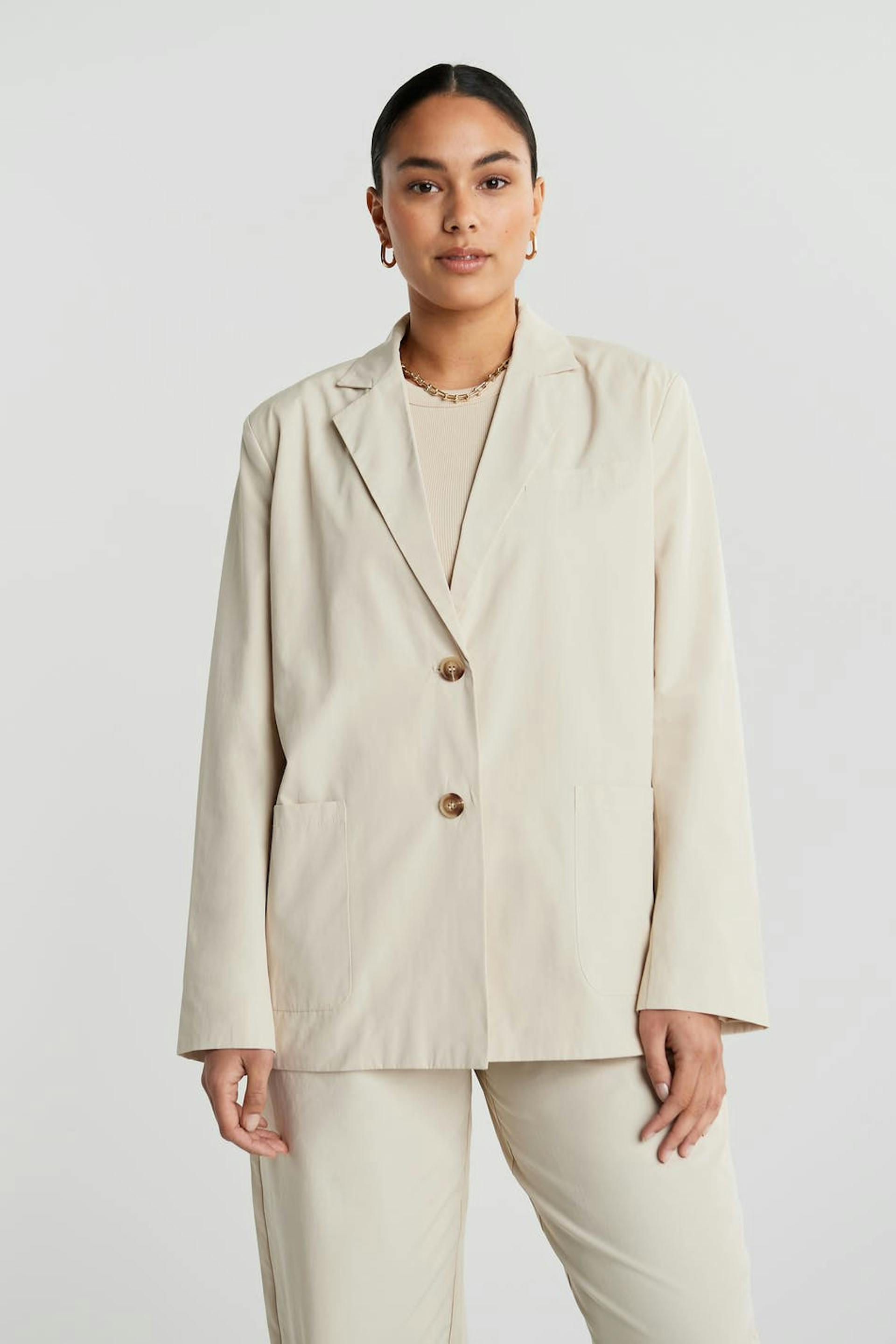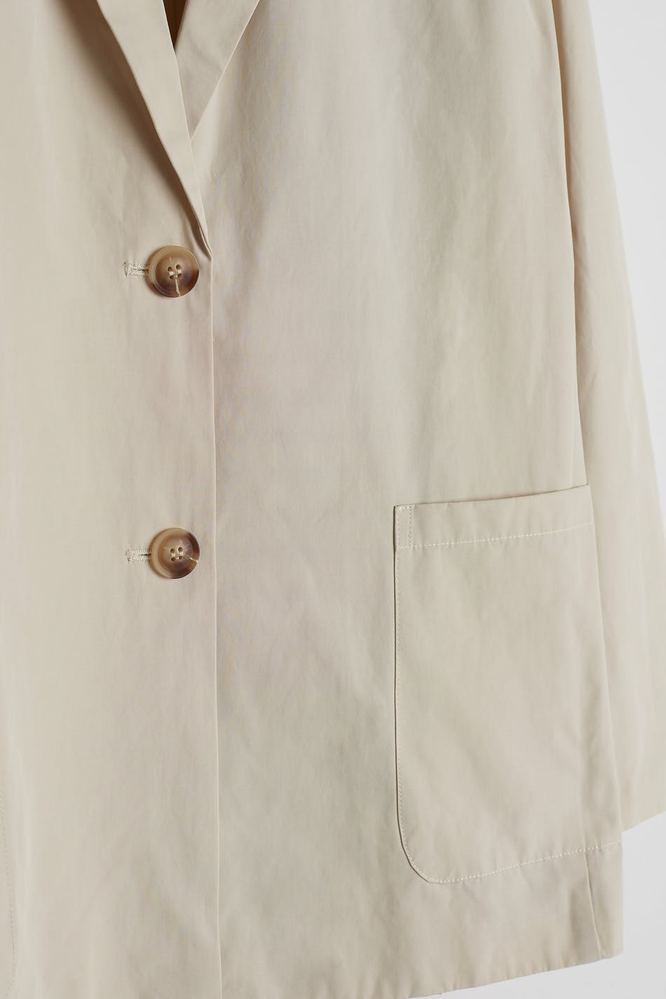 Jacket with a straight oversize fit. The jacket is beige and has two closure buttons at the front and on the sleeve ends. It has pockets in front.