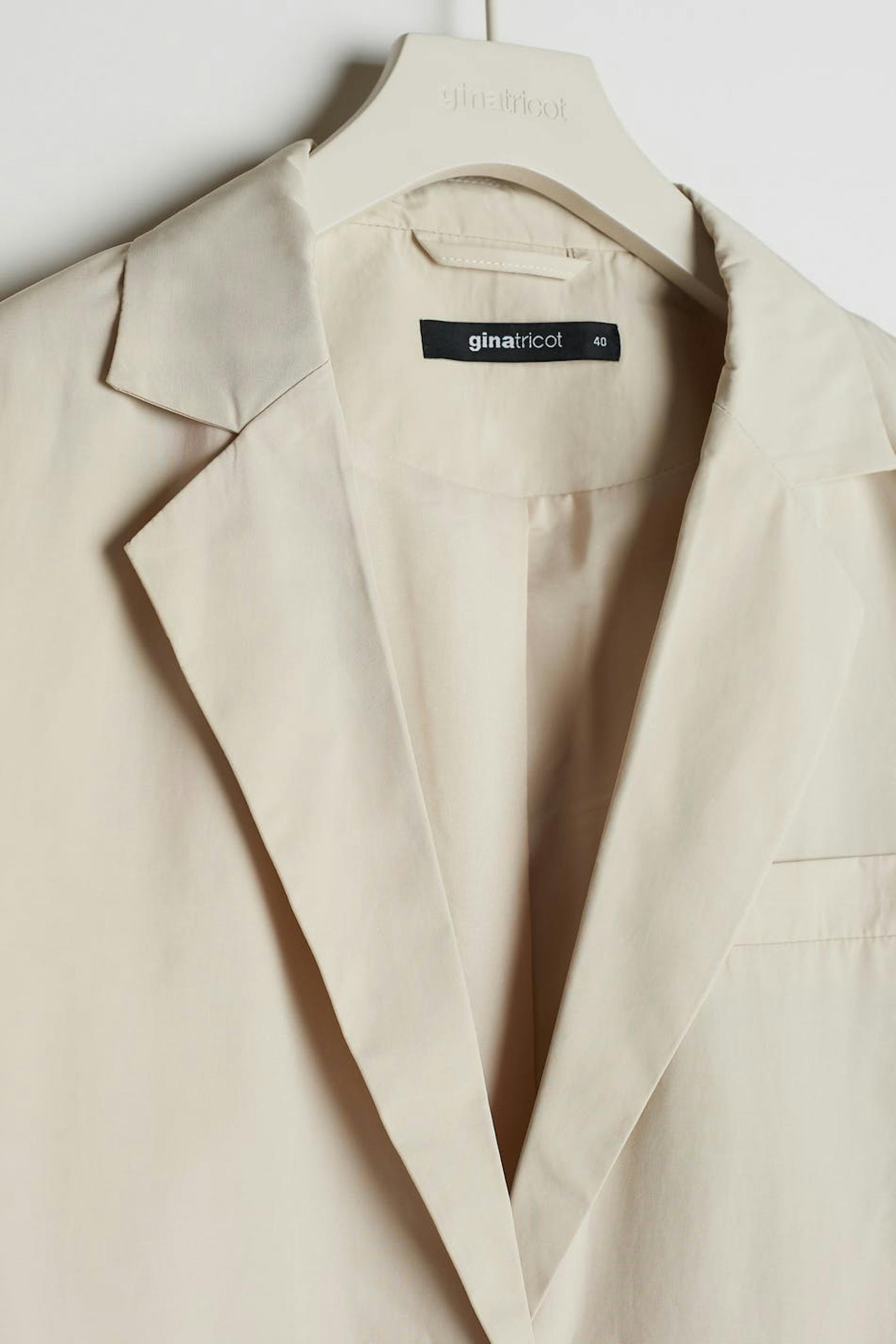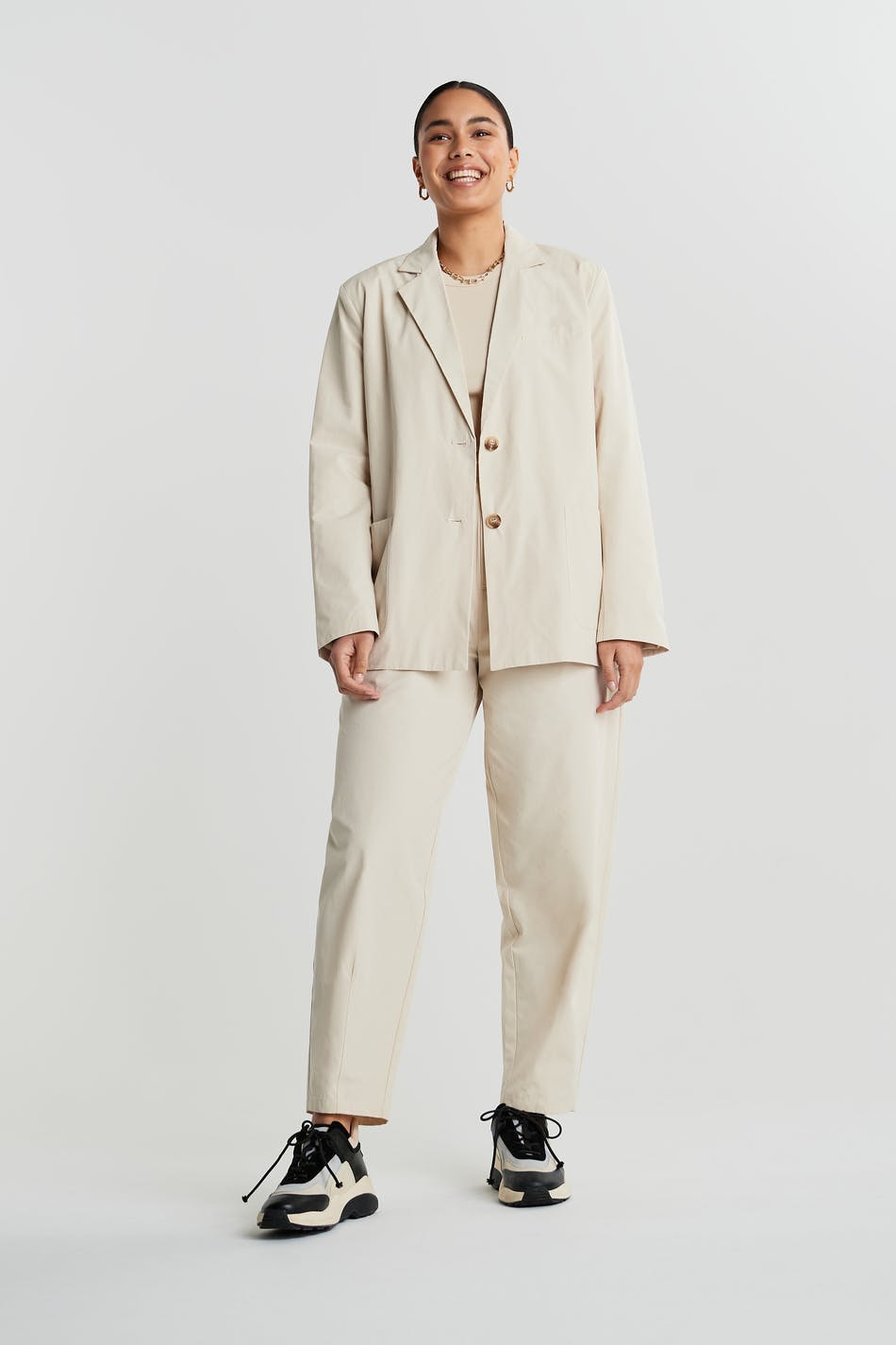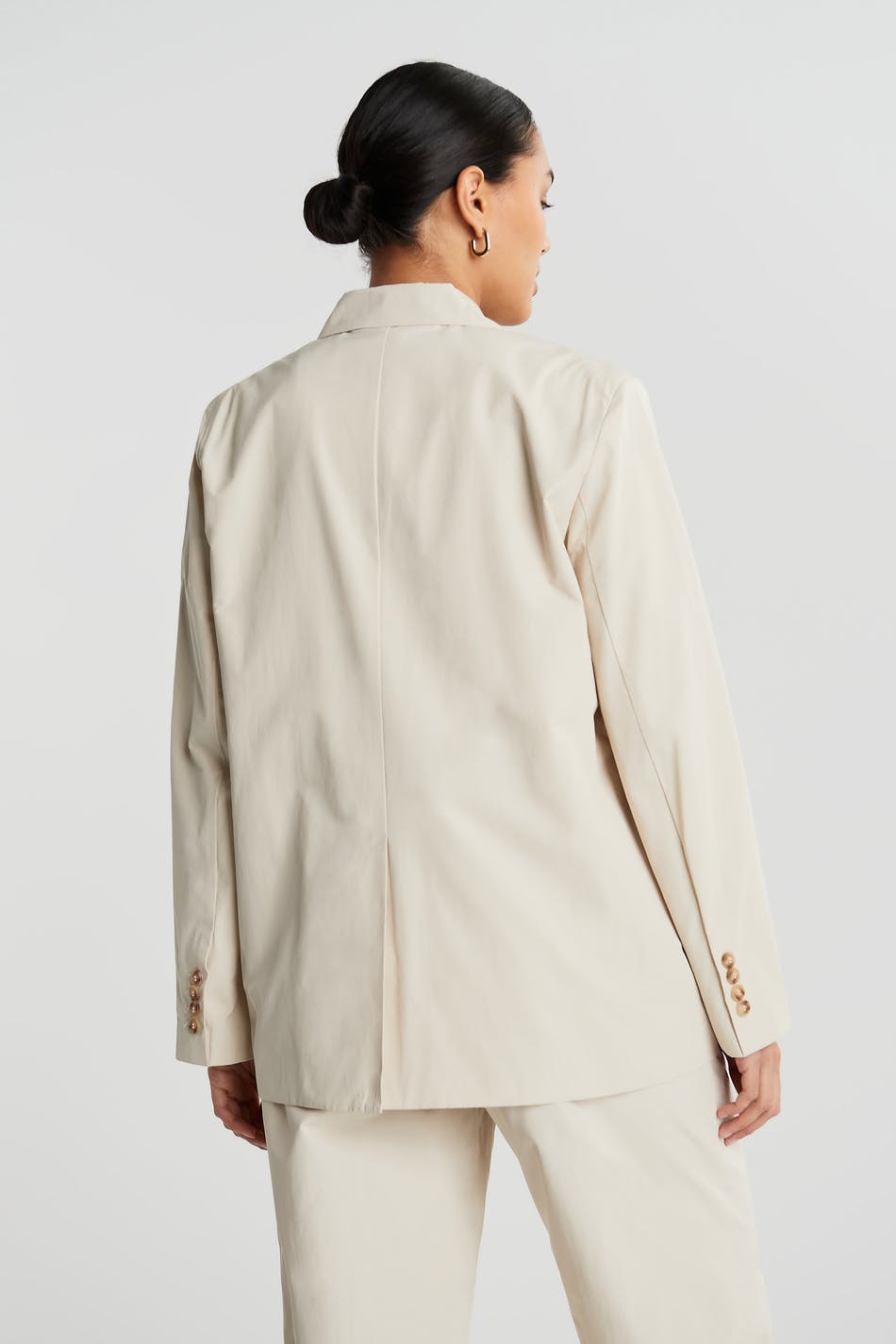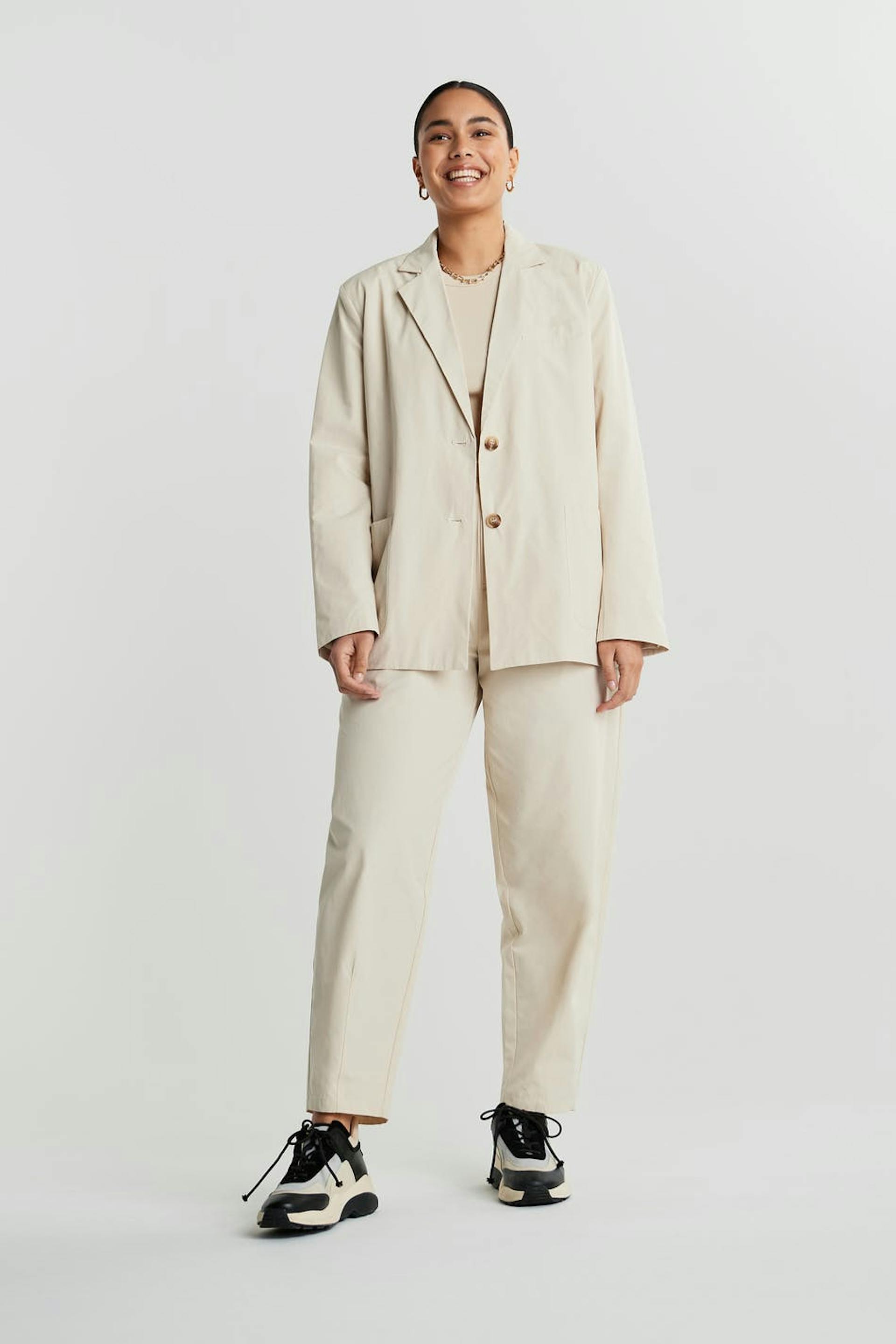 Jacket with a straight oversize fit. The jacket is beige and has two closure buttons at the front and on the sleeve ends. It has pockets in front.
