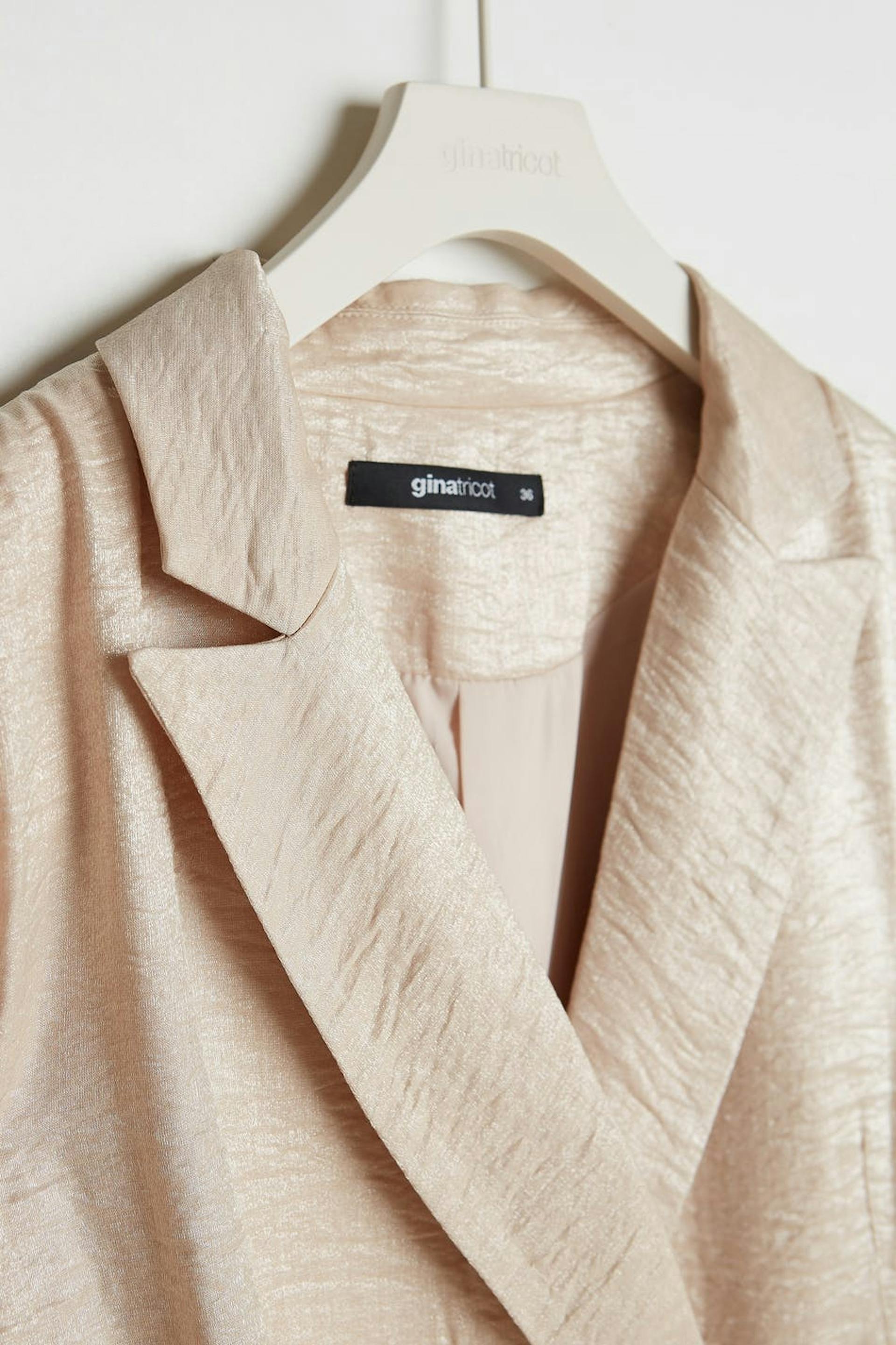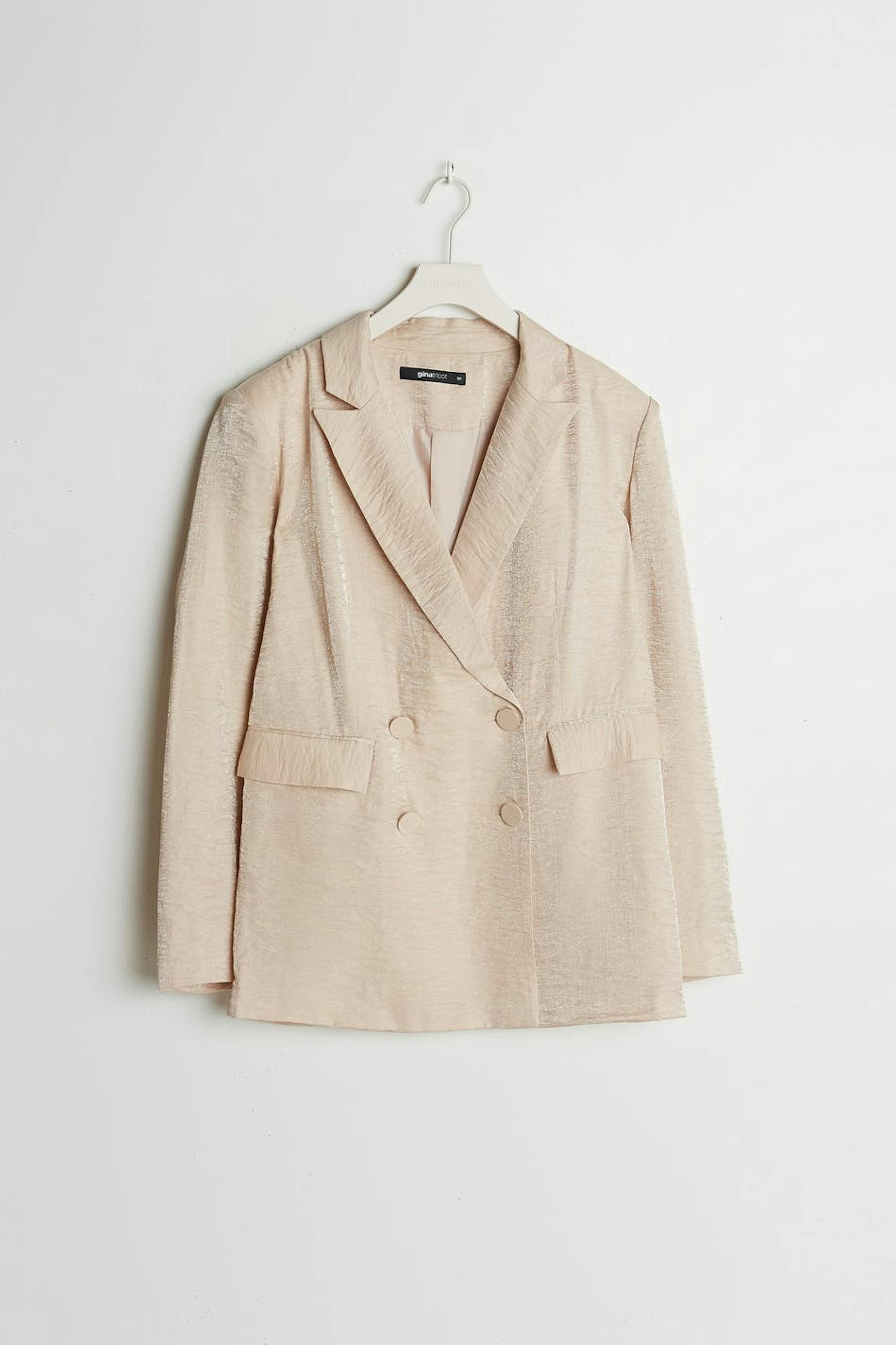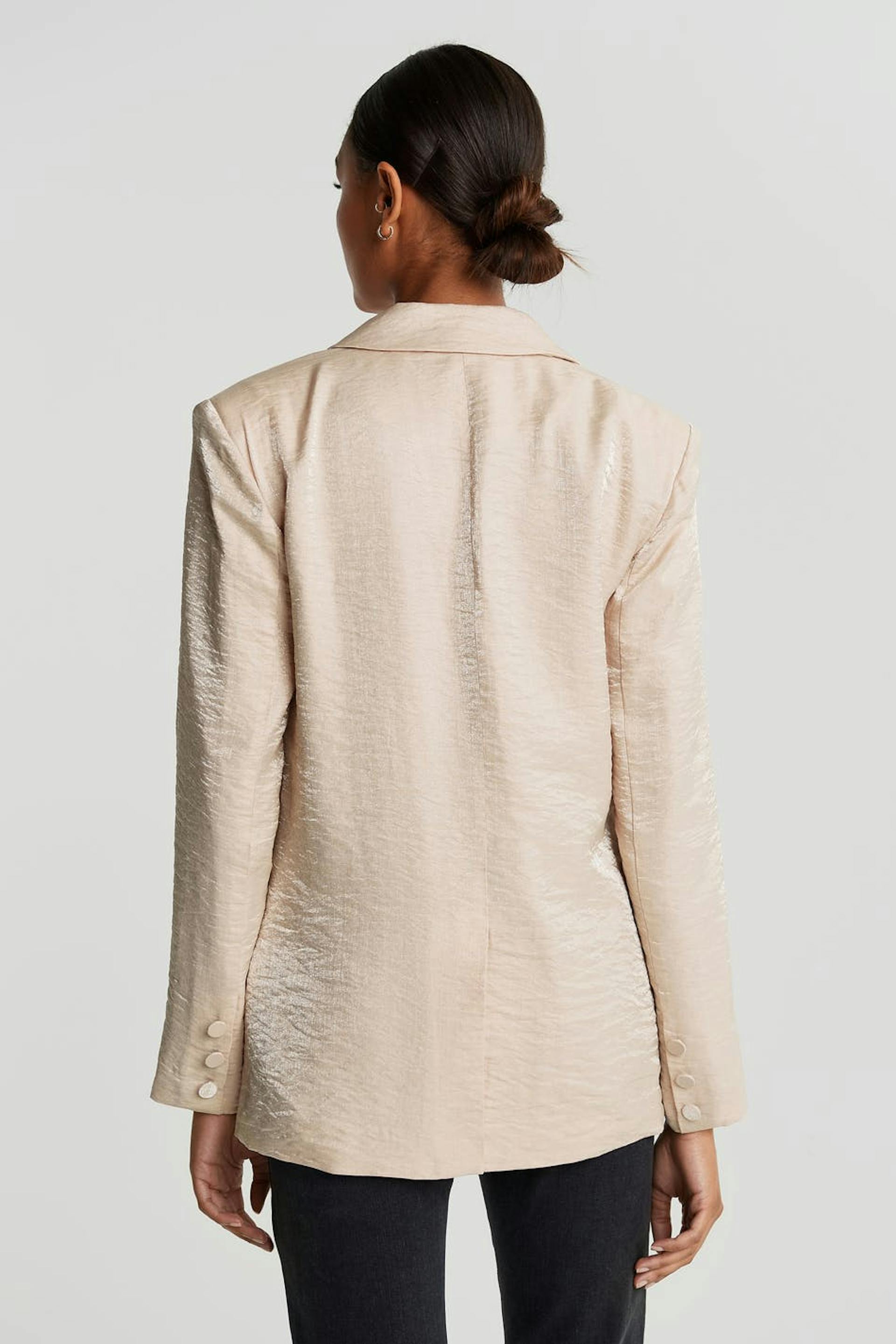 Champagne colour jacket with an oversize fit. Perfect for the party, beige, shimmering and double-breasted. It has fabric covered buttons at the front and on the sleeve ends, pockets on the sides and a slit at the back.
