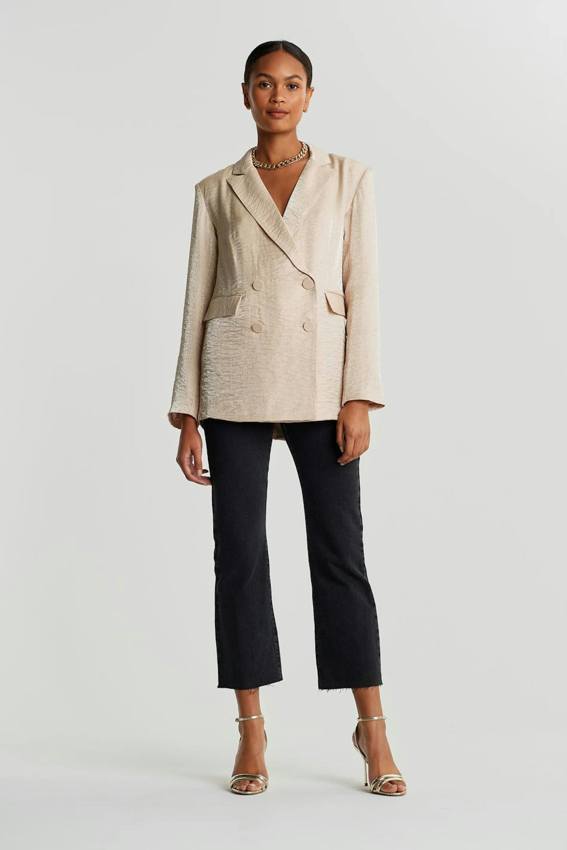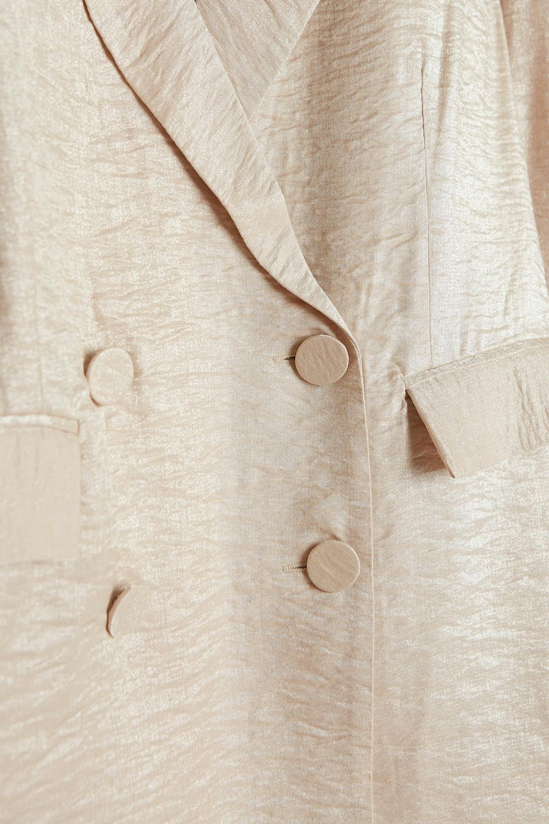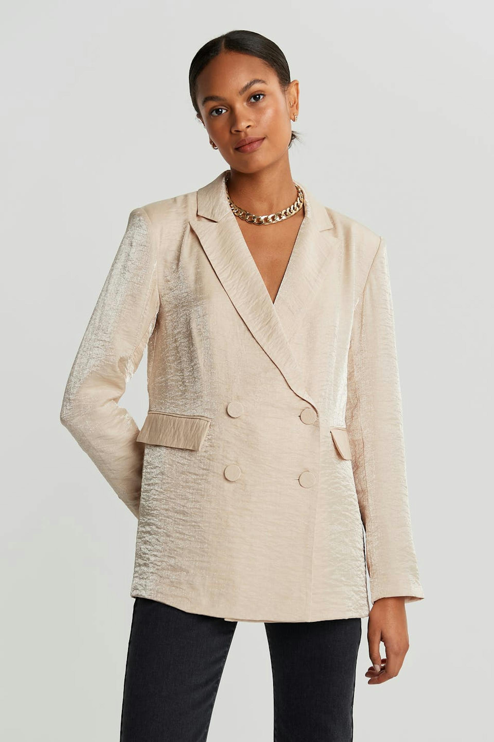 Champagne colour jacket with an oversize fit. Perfect for the party, beige, shimmering and double-breasted. It has fabric covered buttons at the front and on the sleeve ends, pockets on the sides and a slit at the back.