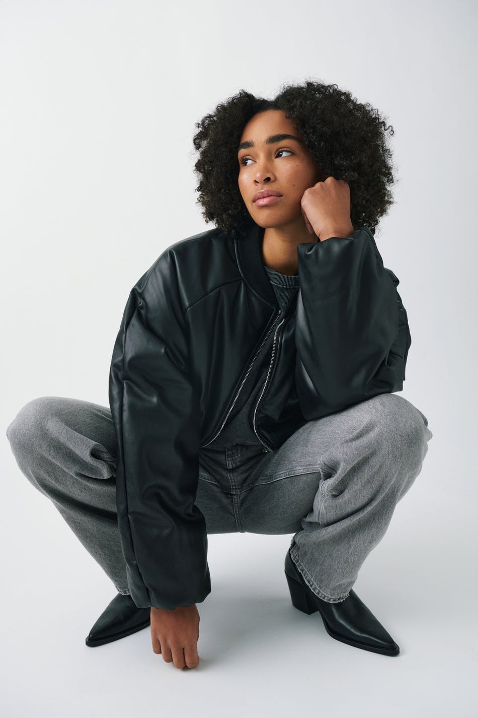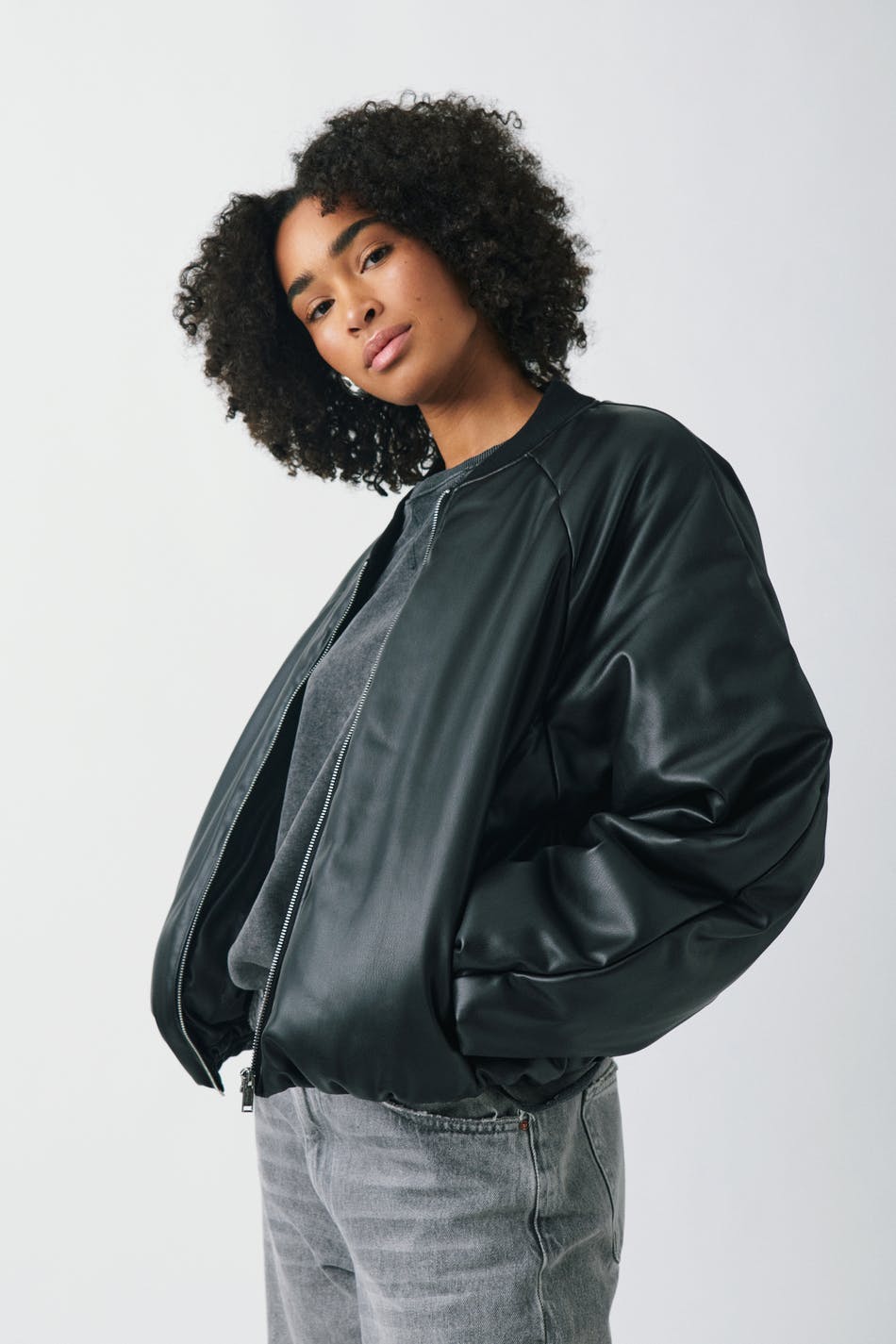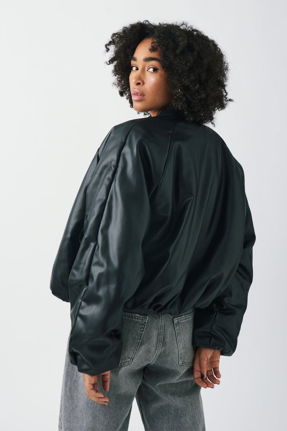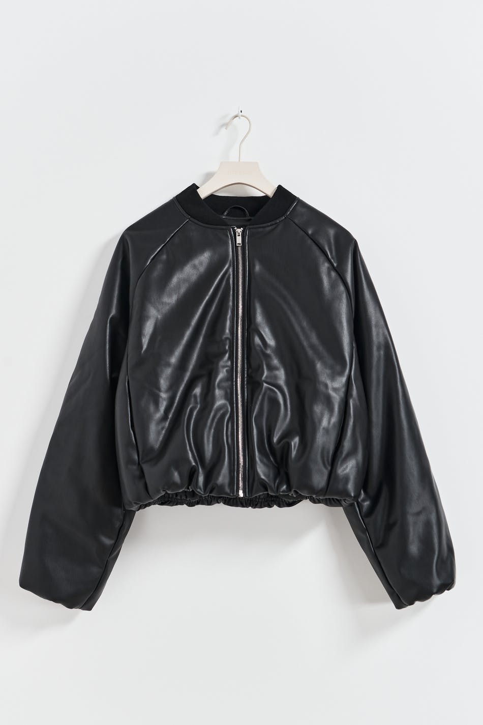 Bomber jacket in imitation leather with zip closure at the front. The jacket is black and has side pockets.