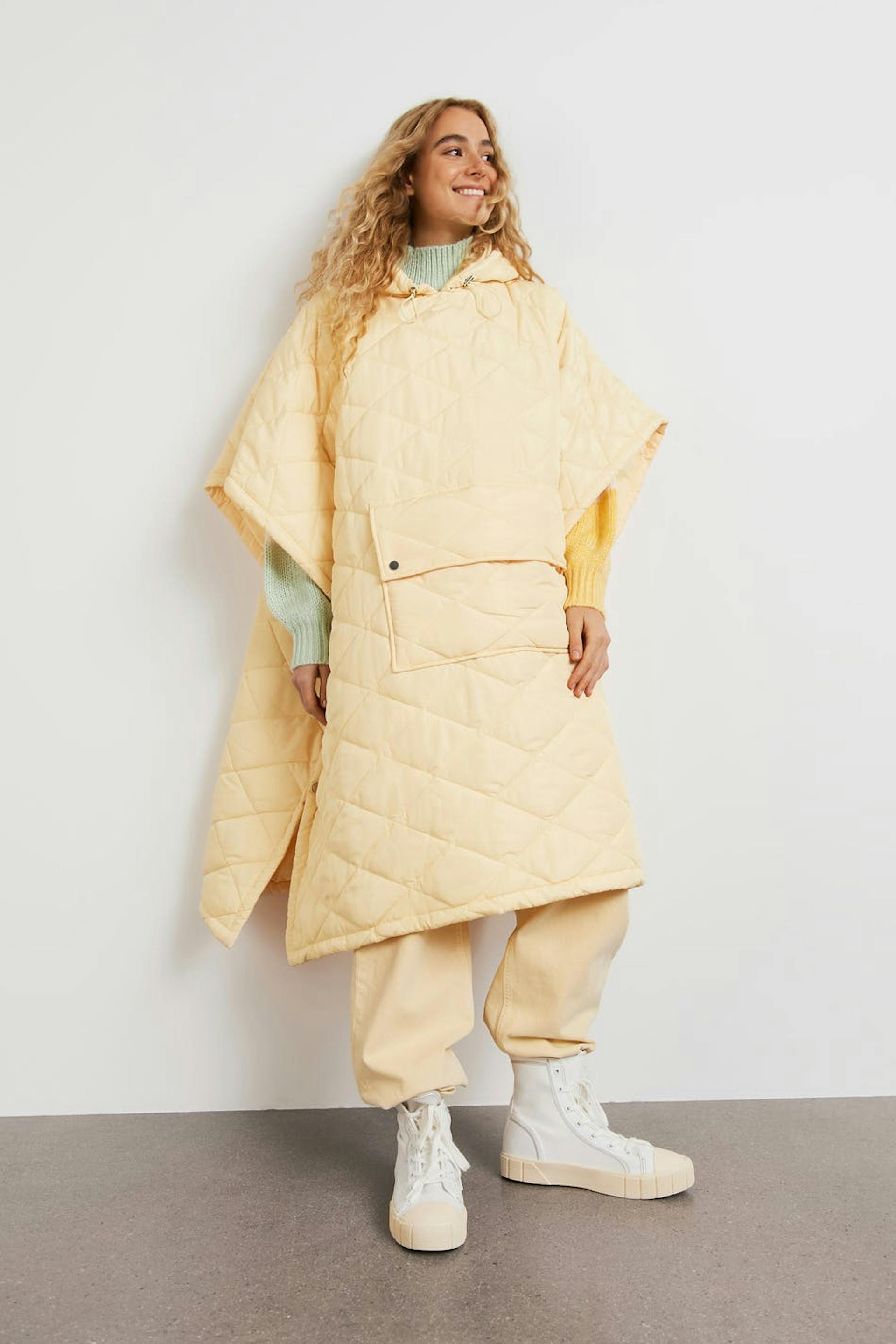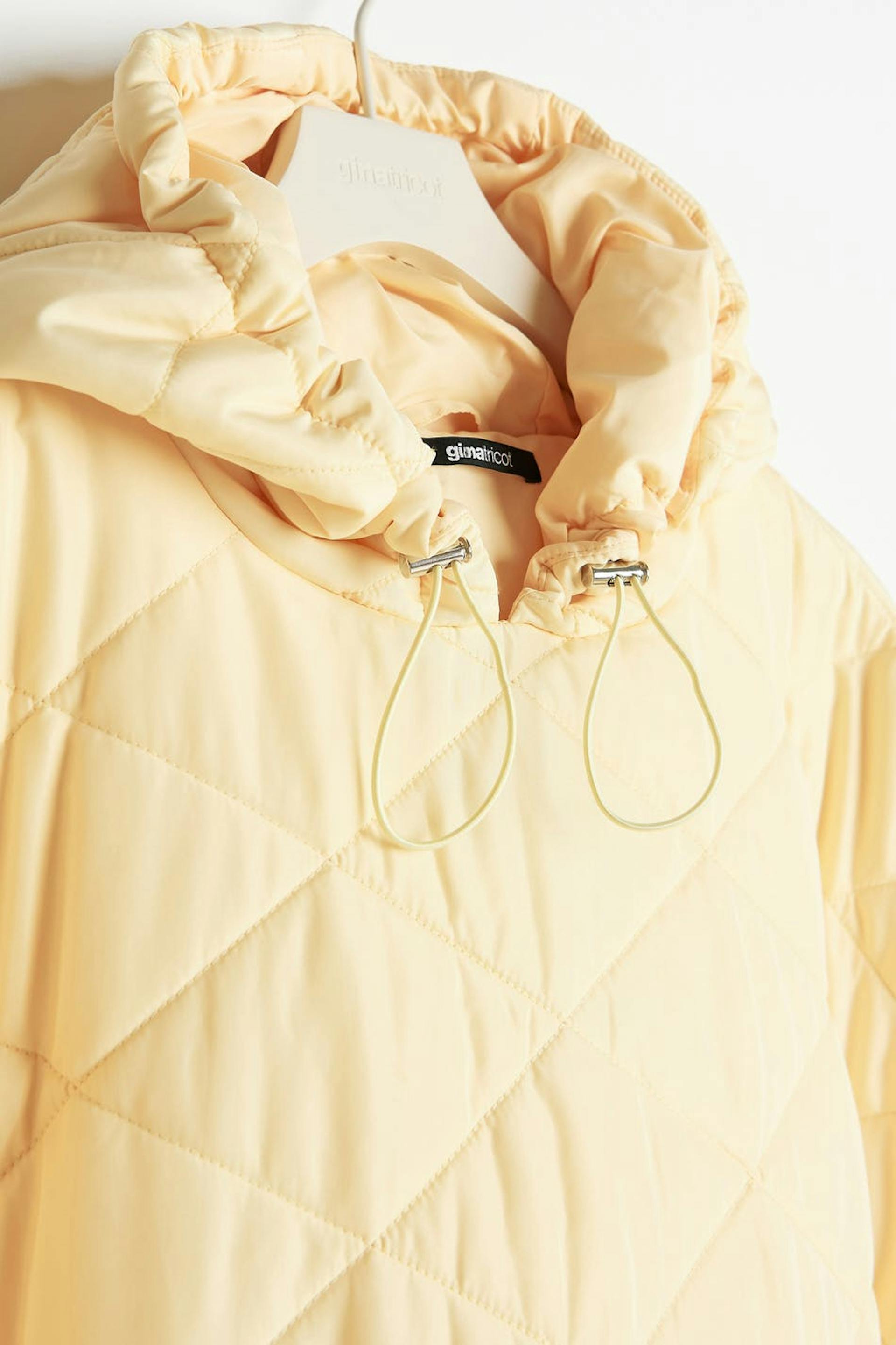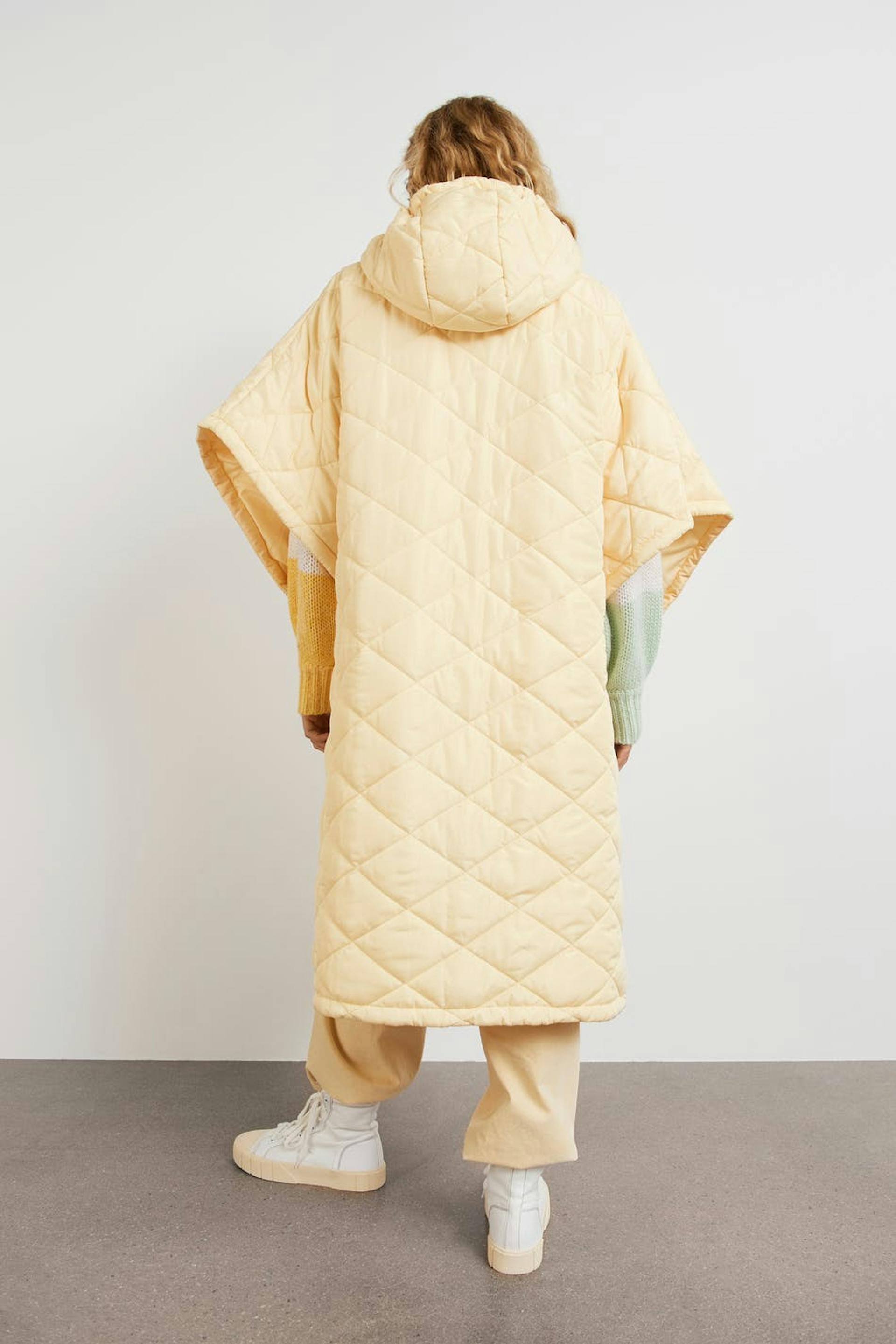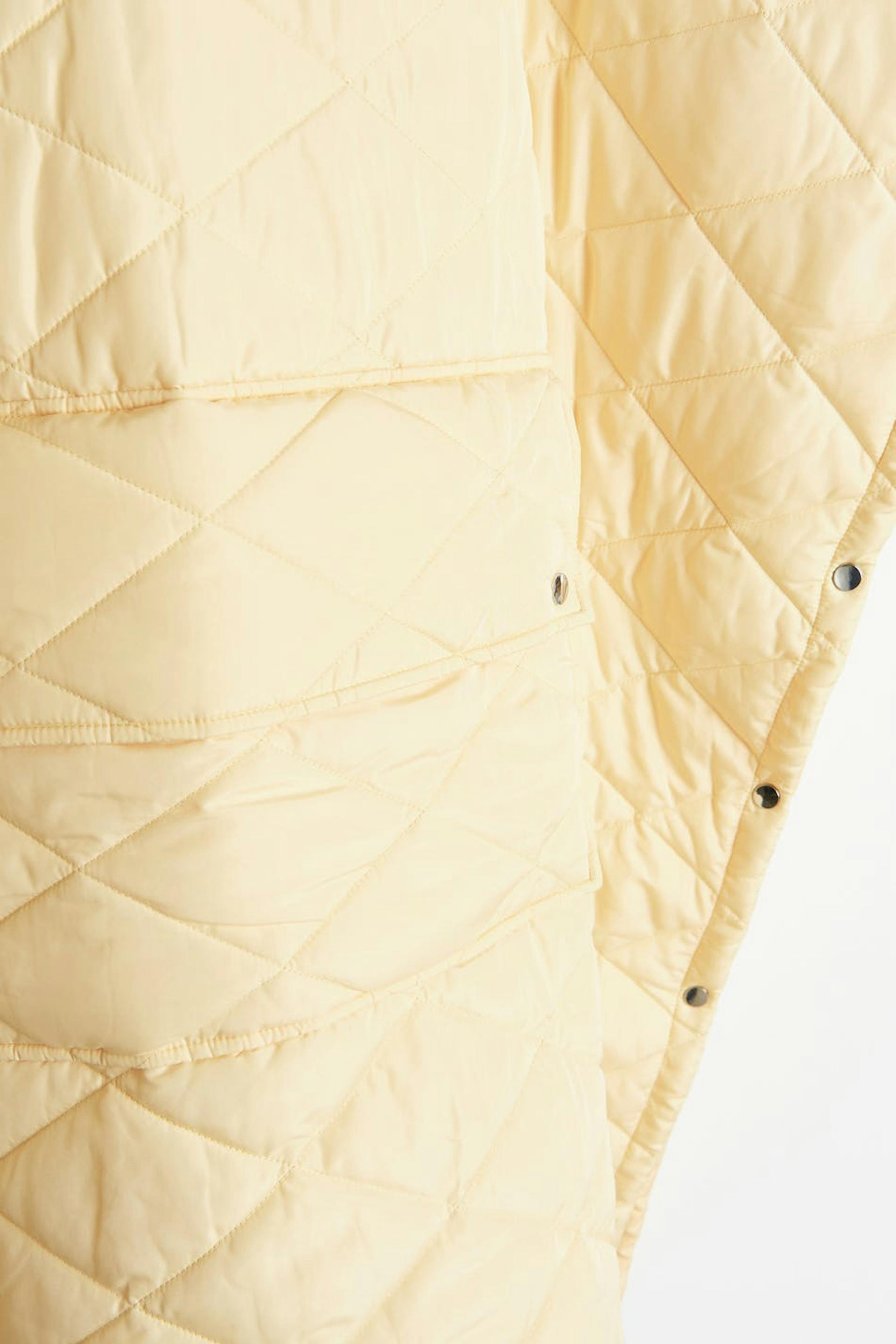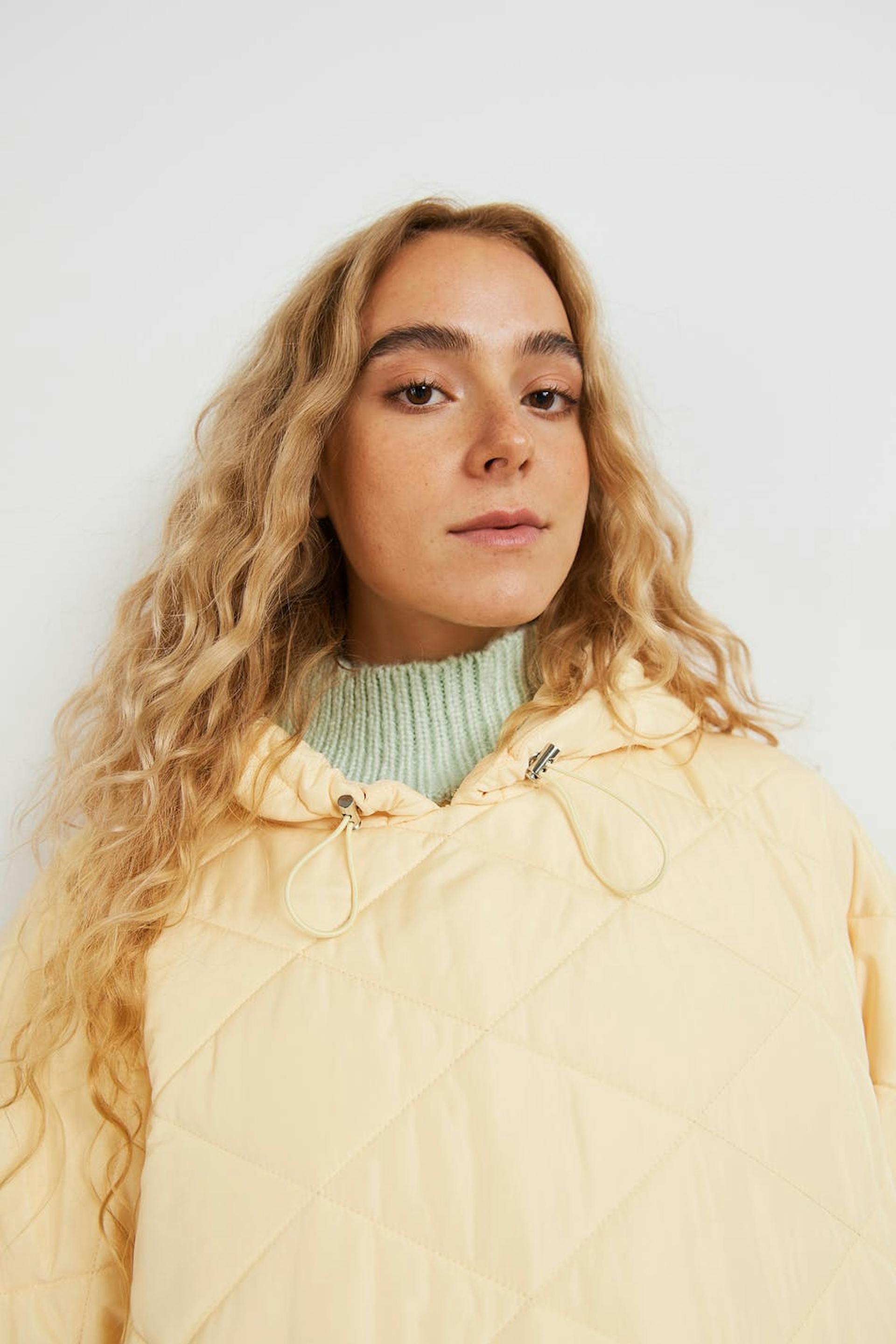 Quilted coat with a woven quality in polyester. The coat is yellow, padded and long. It has an oversize fit, a big pocket at the front, snap buttons on the sides and a hood with adjustable drawstring.