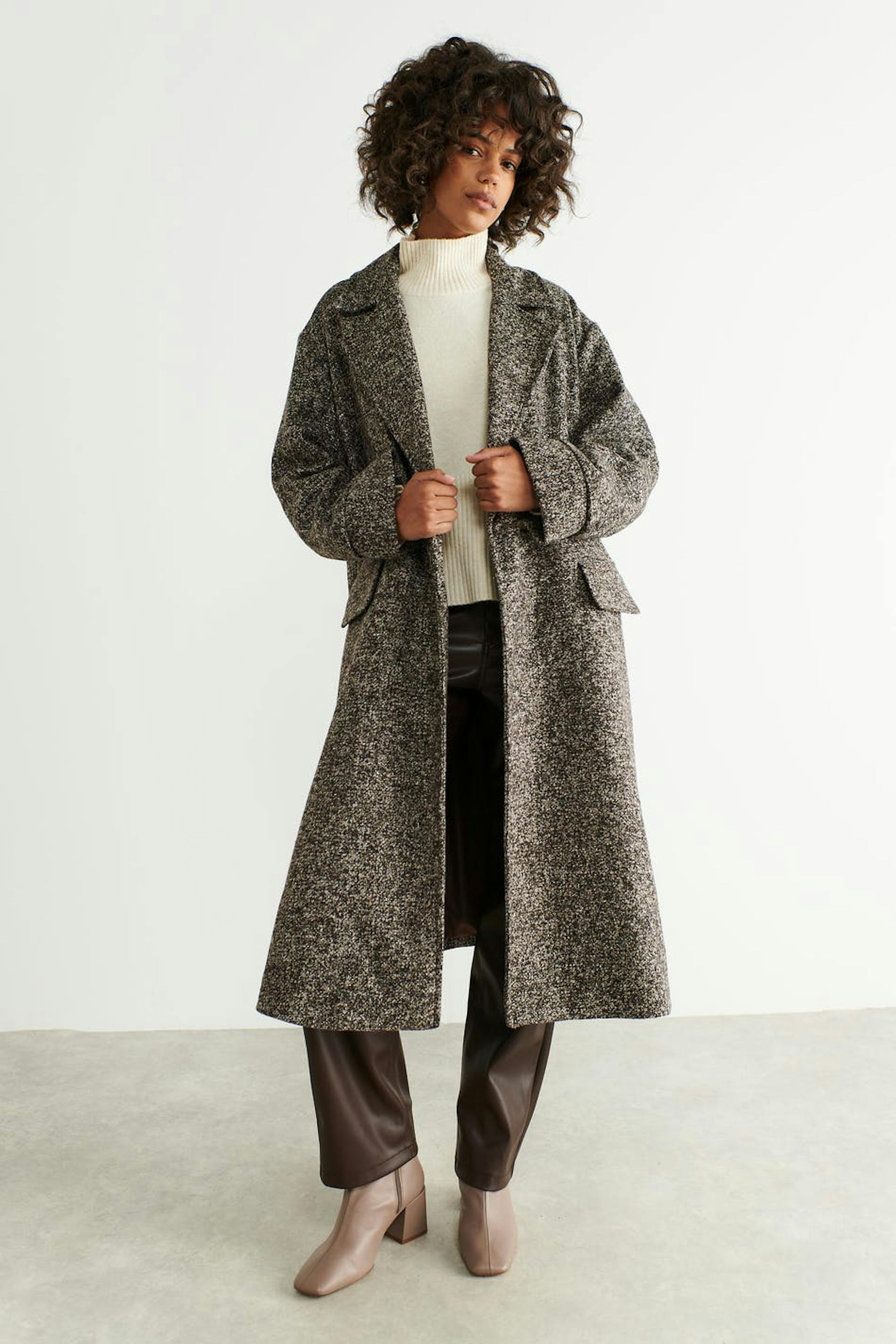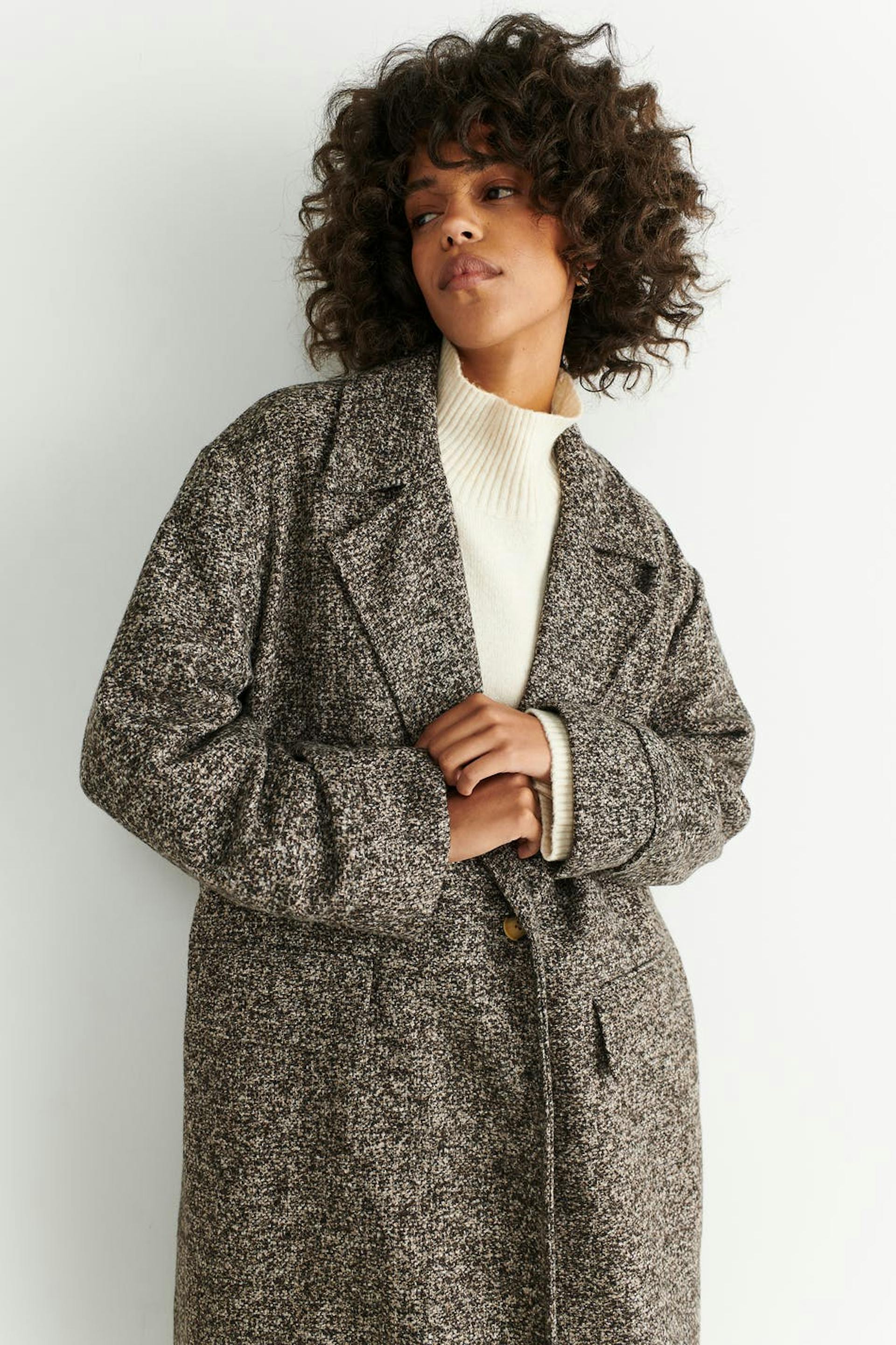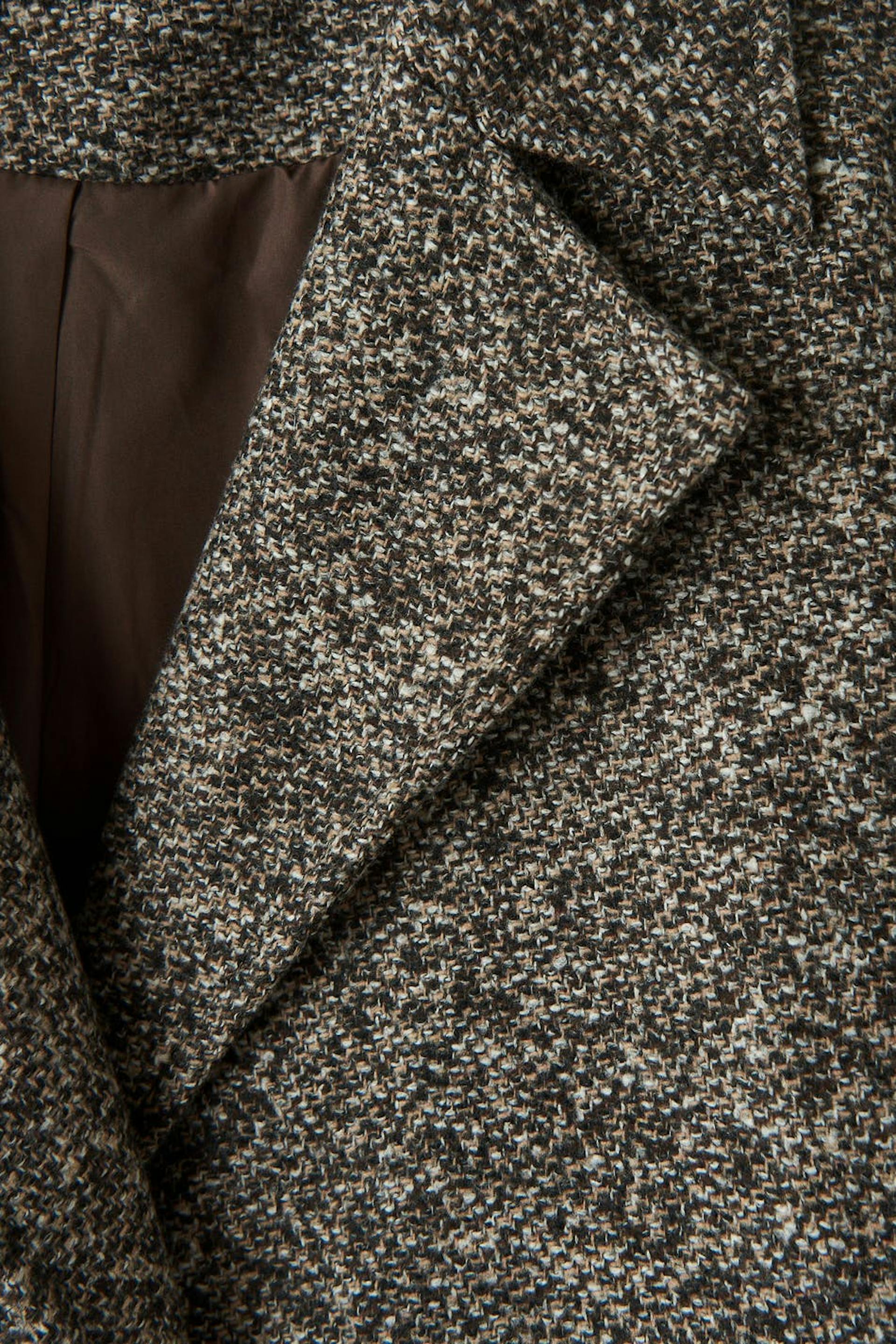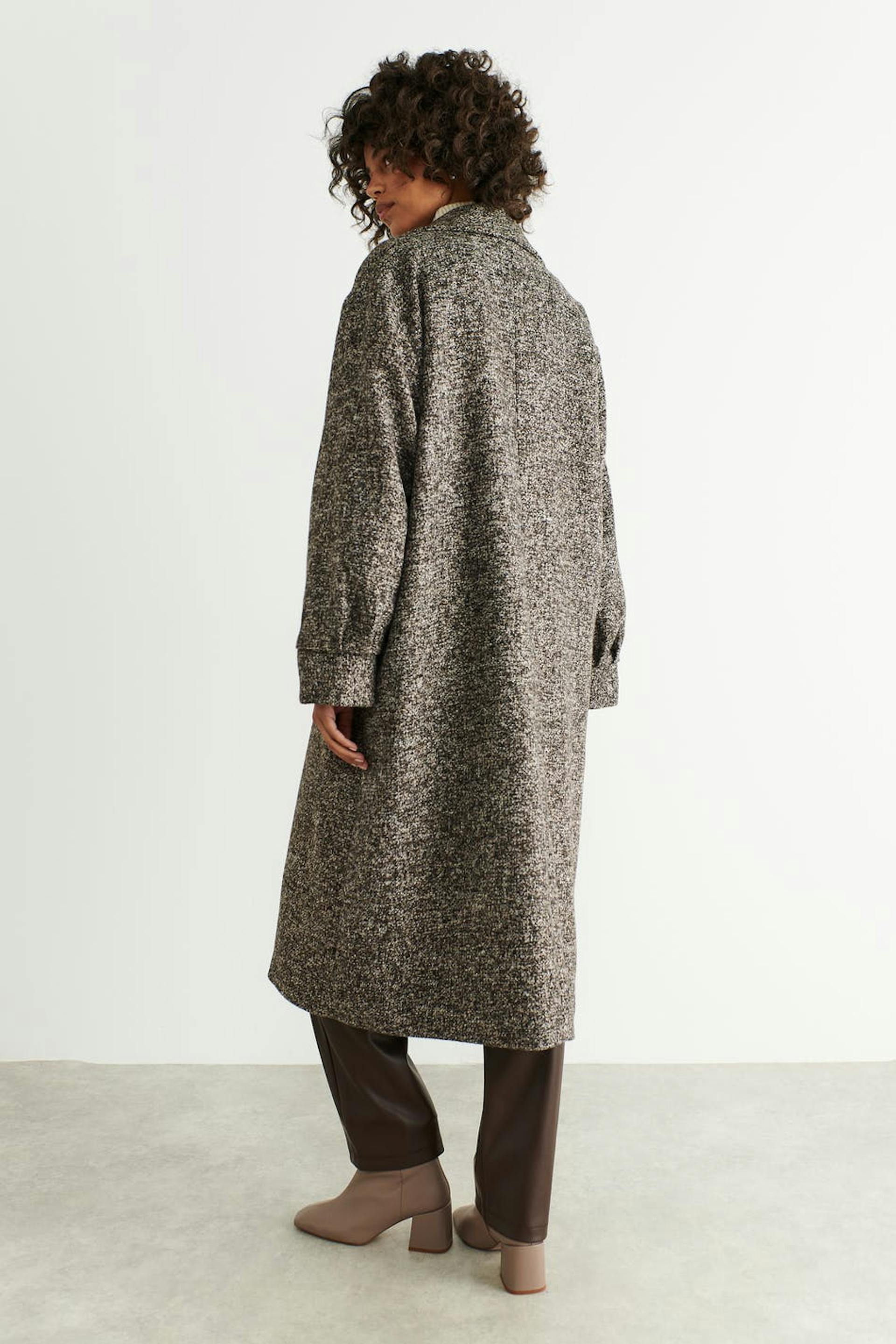 Oversized coat with chunky lapel. The coat is brown, single-breasted and woven. It has one-button fastening, voluminous sleeves with pleats, flap pockets at the front and big cuffs.