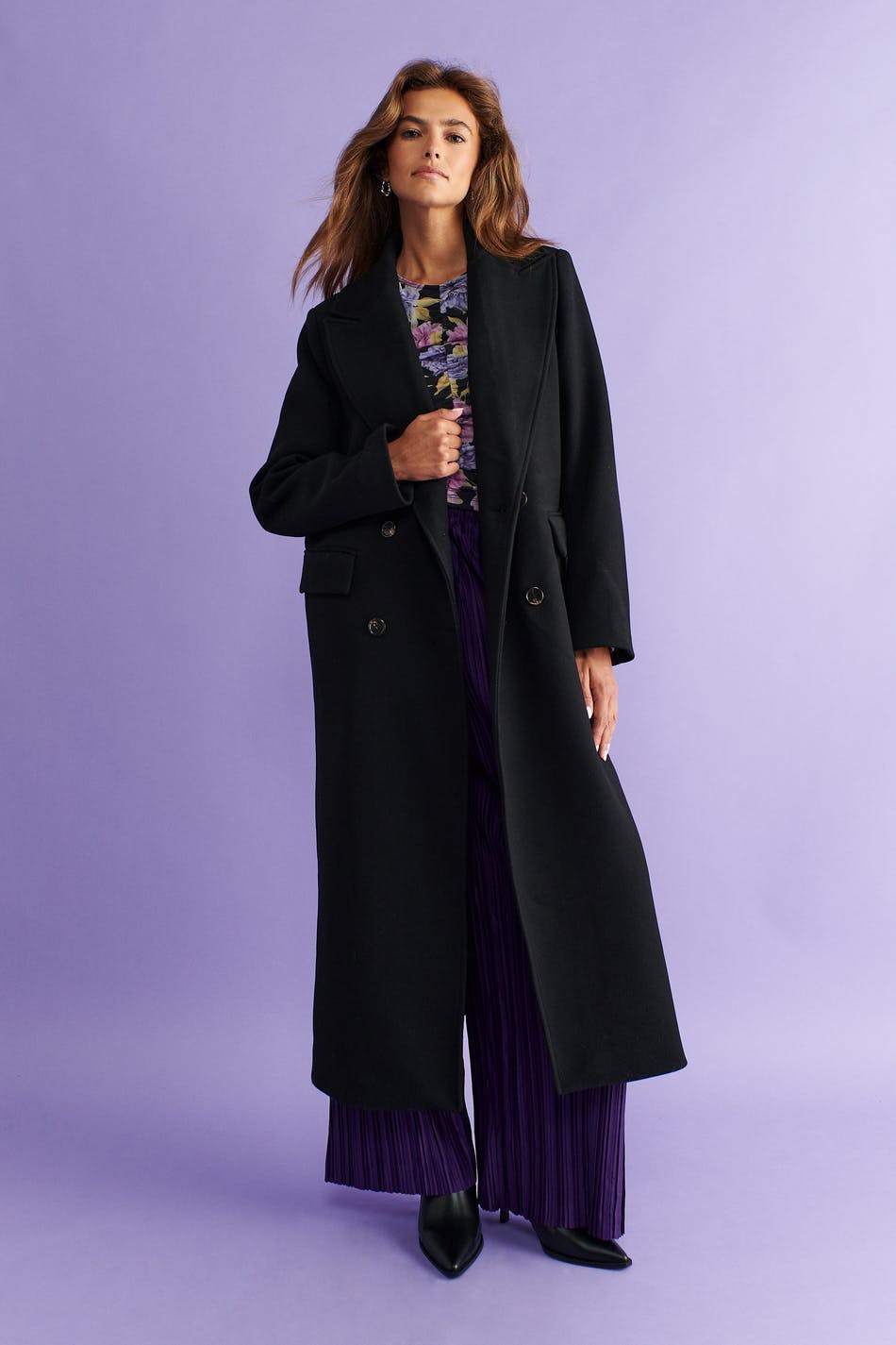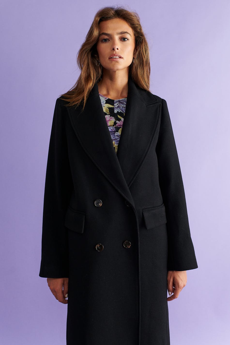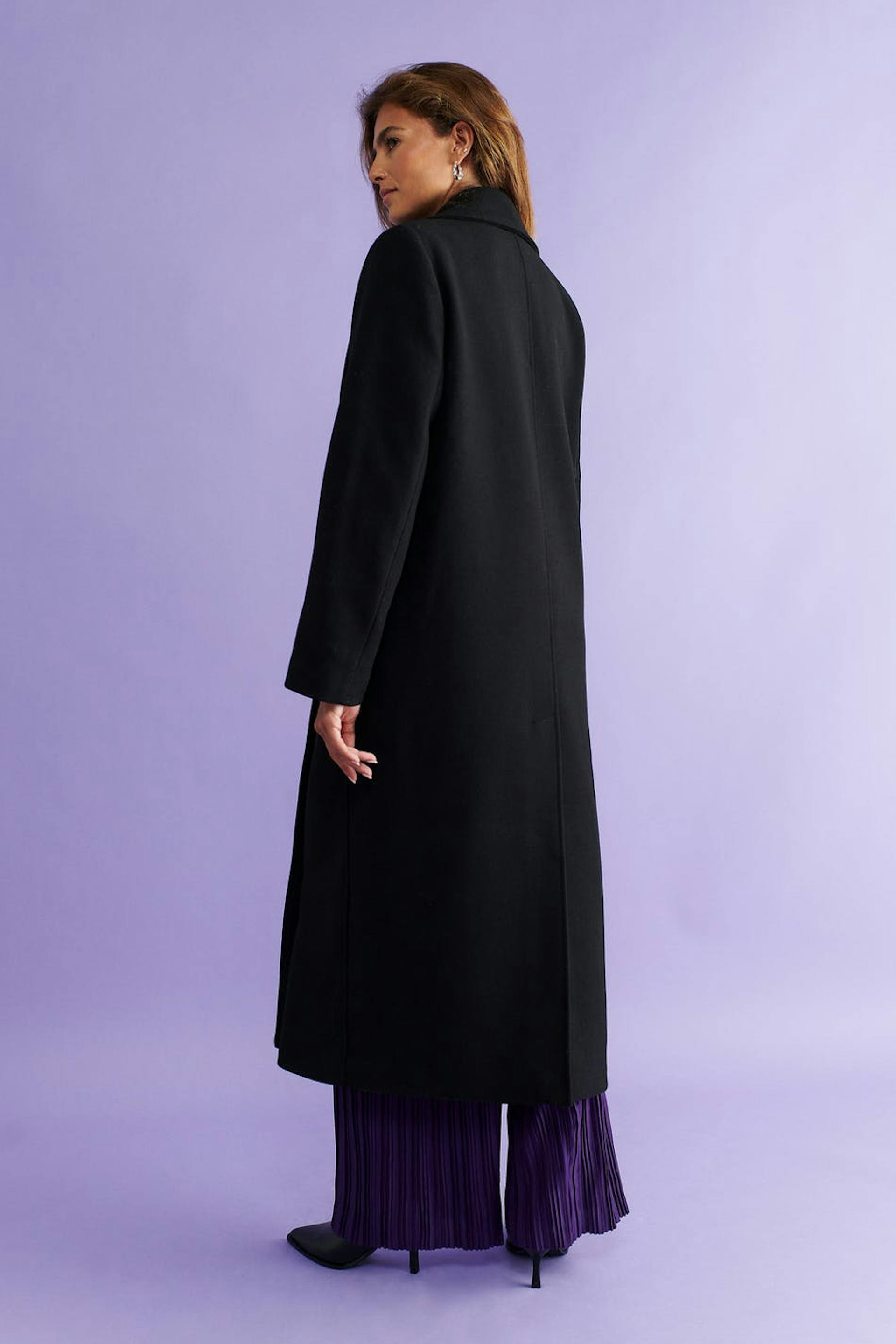 Calf-length coat in men's style with an oversize fit. The coat is double-breasted and black and has a herringbone pattern. It has flap pockets at the front, collar with lapels and straight fit.