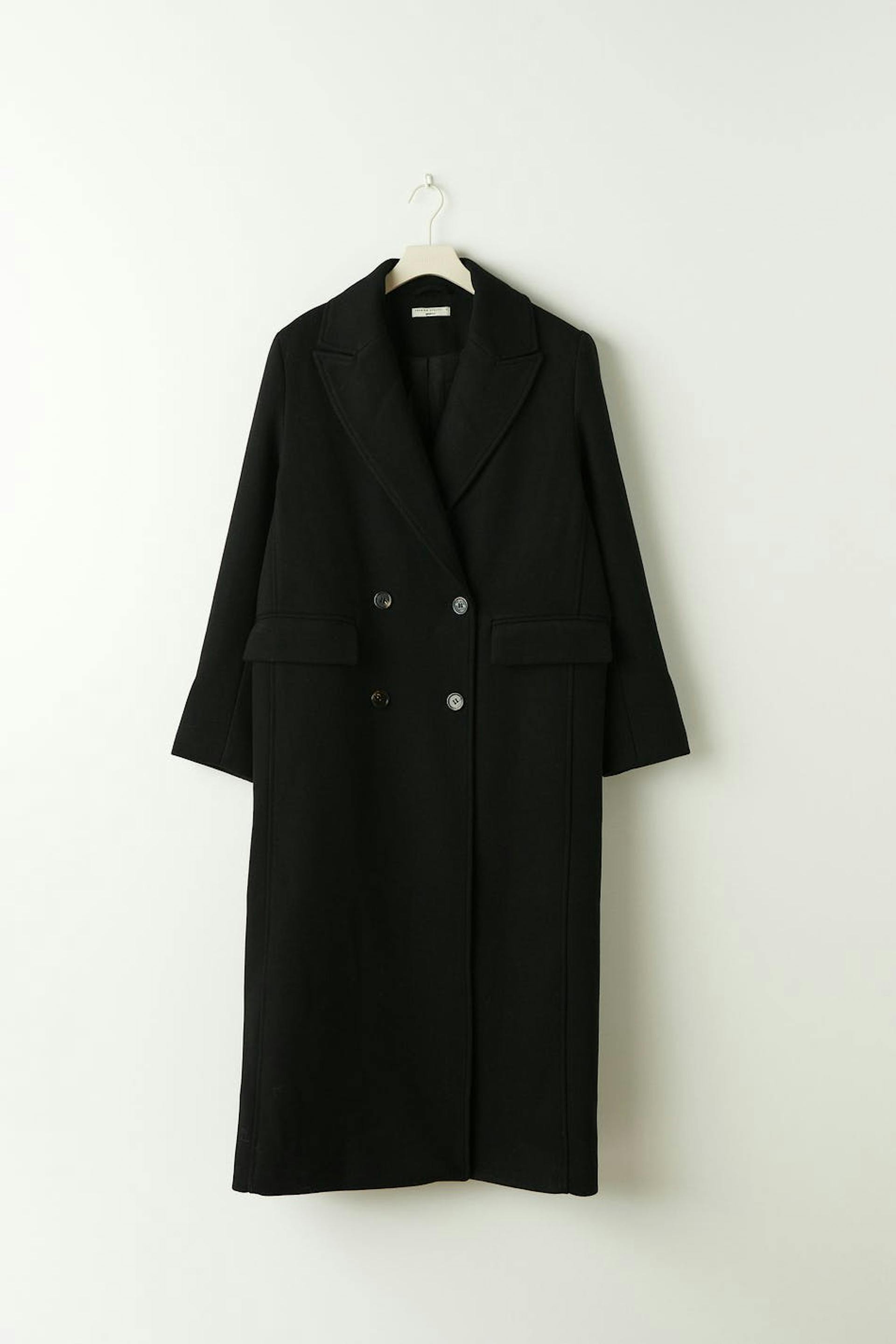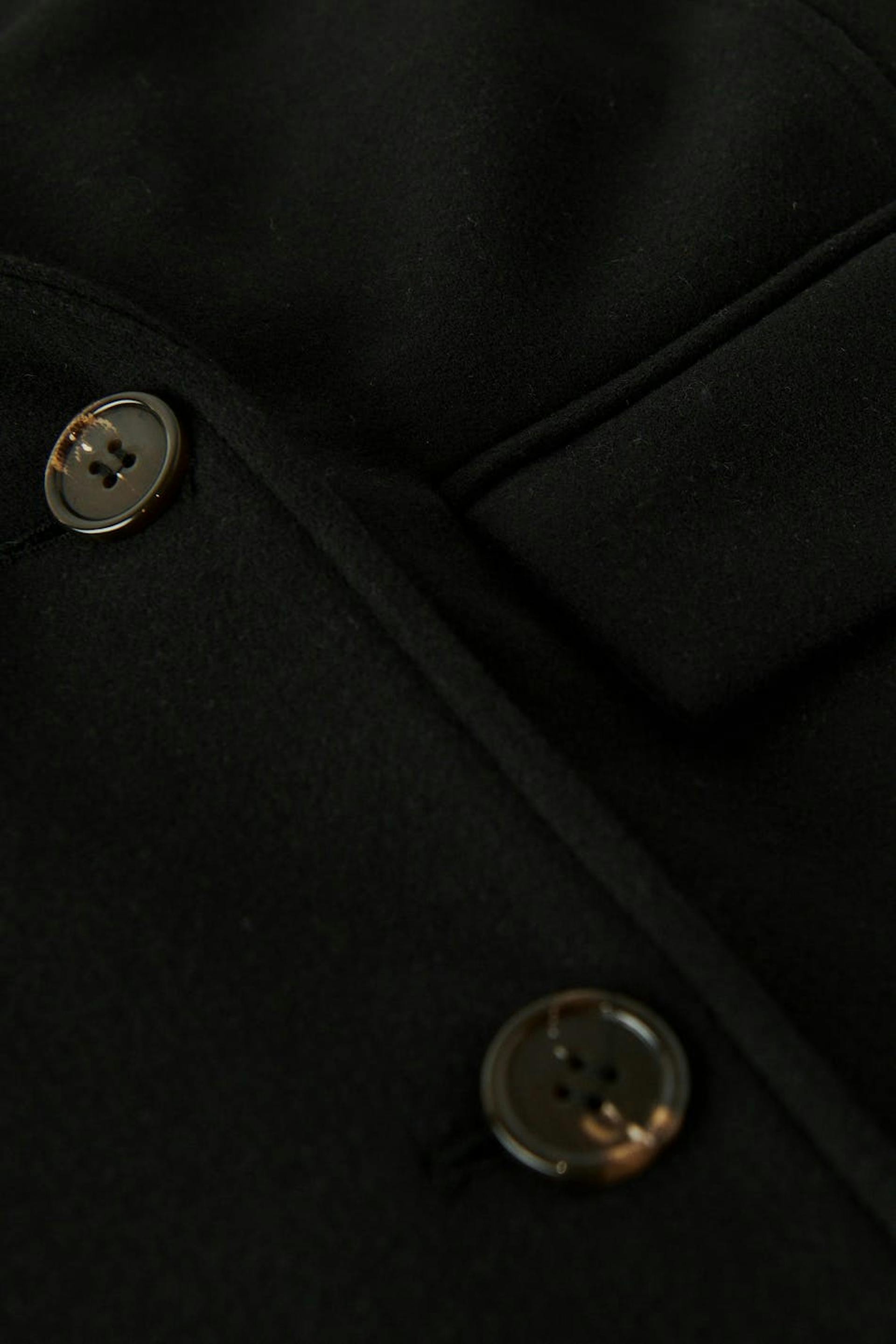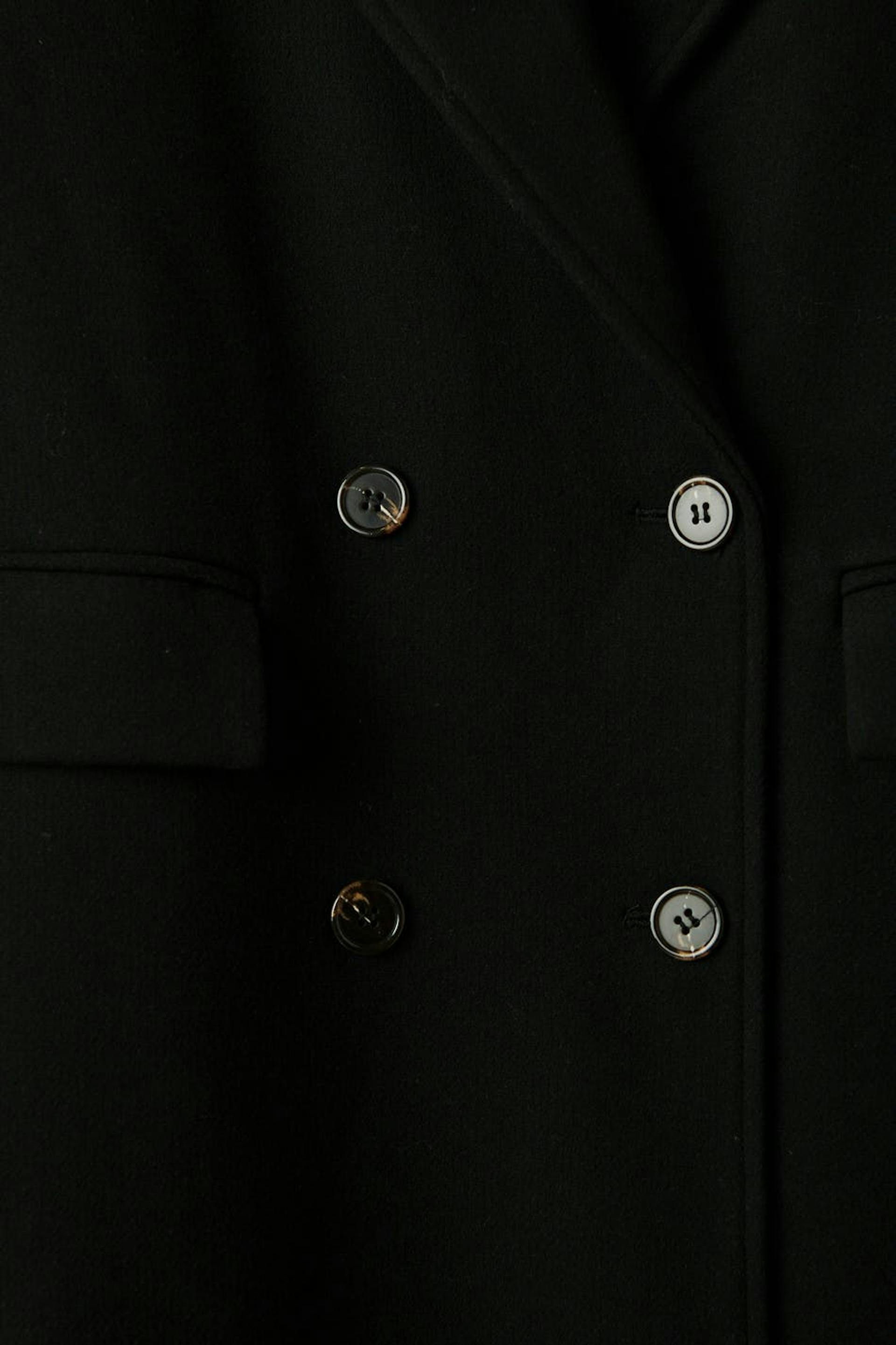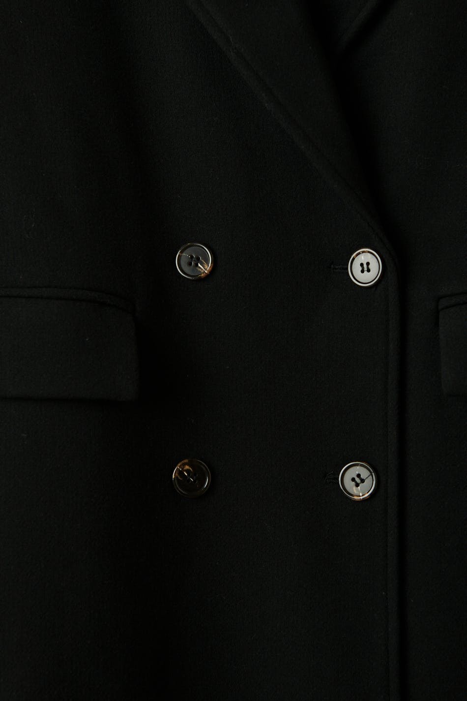 Calf-length coat in men's style with an oversize fit. The coat is double-breasted and black and has a herringbone pattern. It has flap pockets at the front, collar with lapels and straight fit.