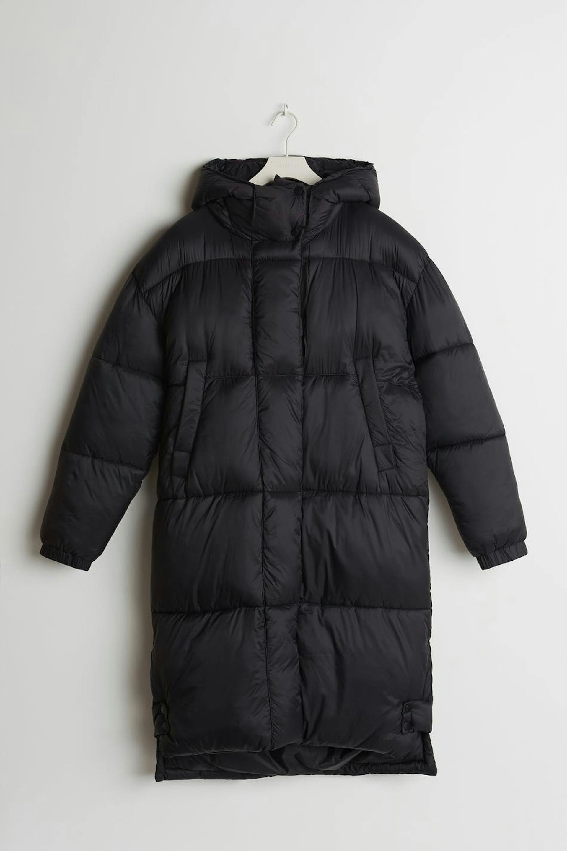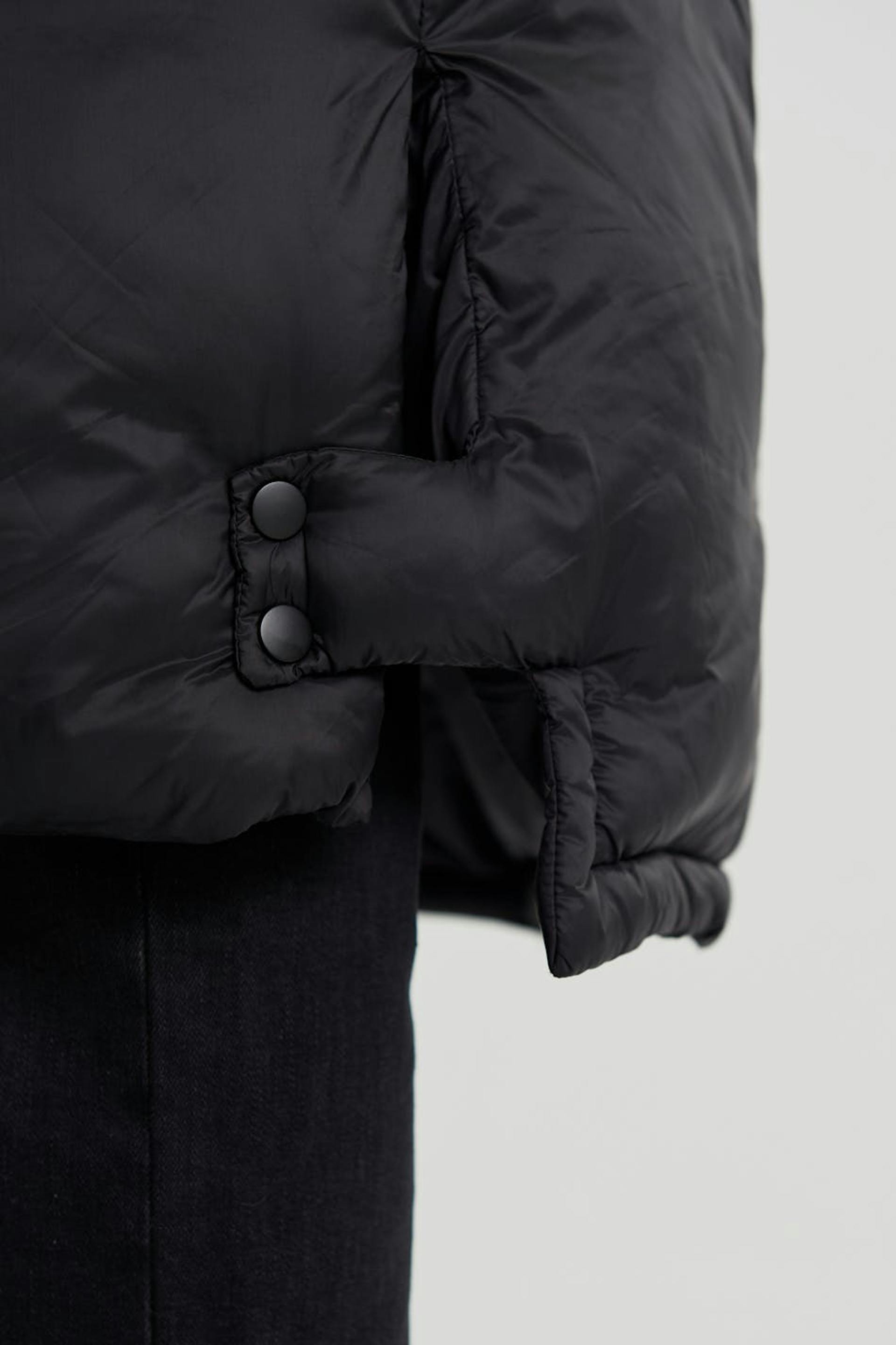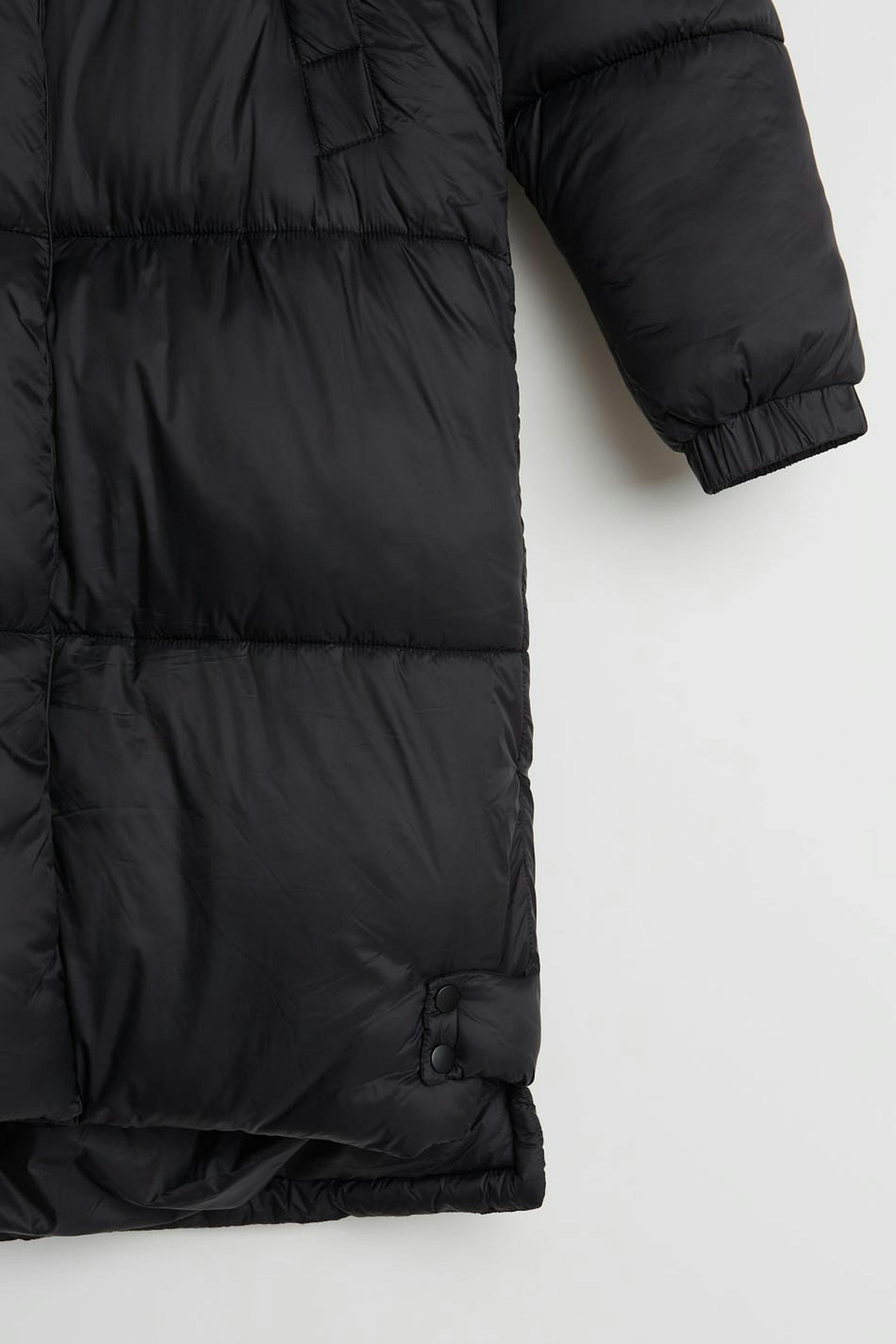 Long coat with a puffer model. The coat is black and has a non removable hood with a drawstring. It has pockets on the sides, an elastic band on the sleeve ends and buttons on the sides and to the neck.